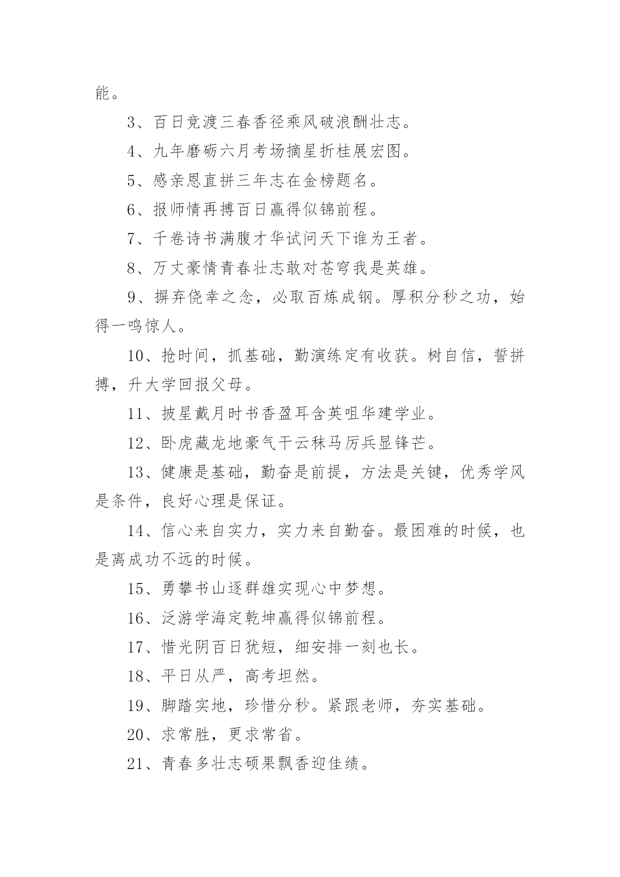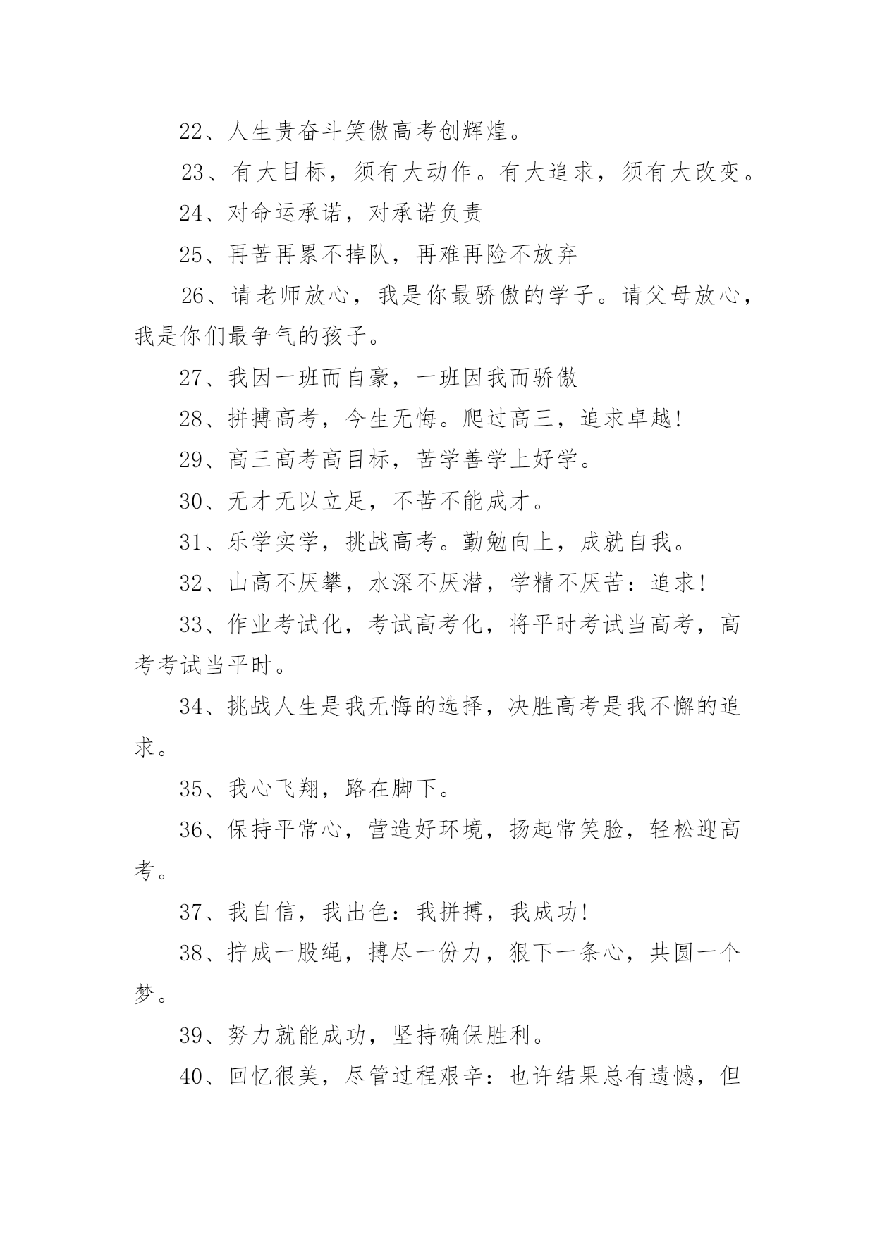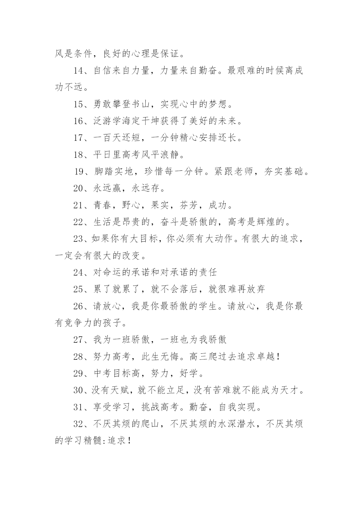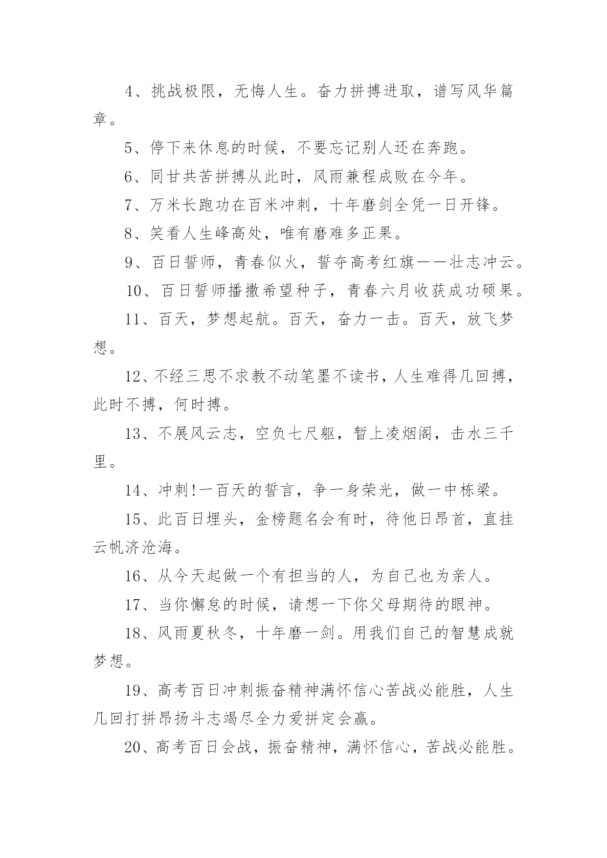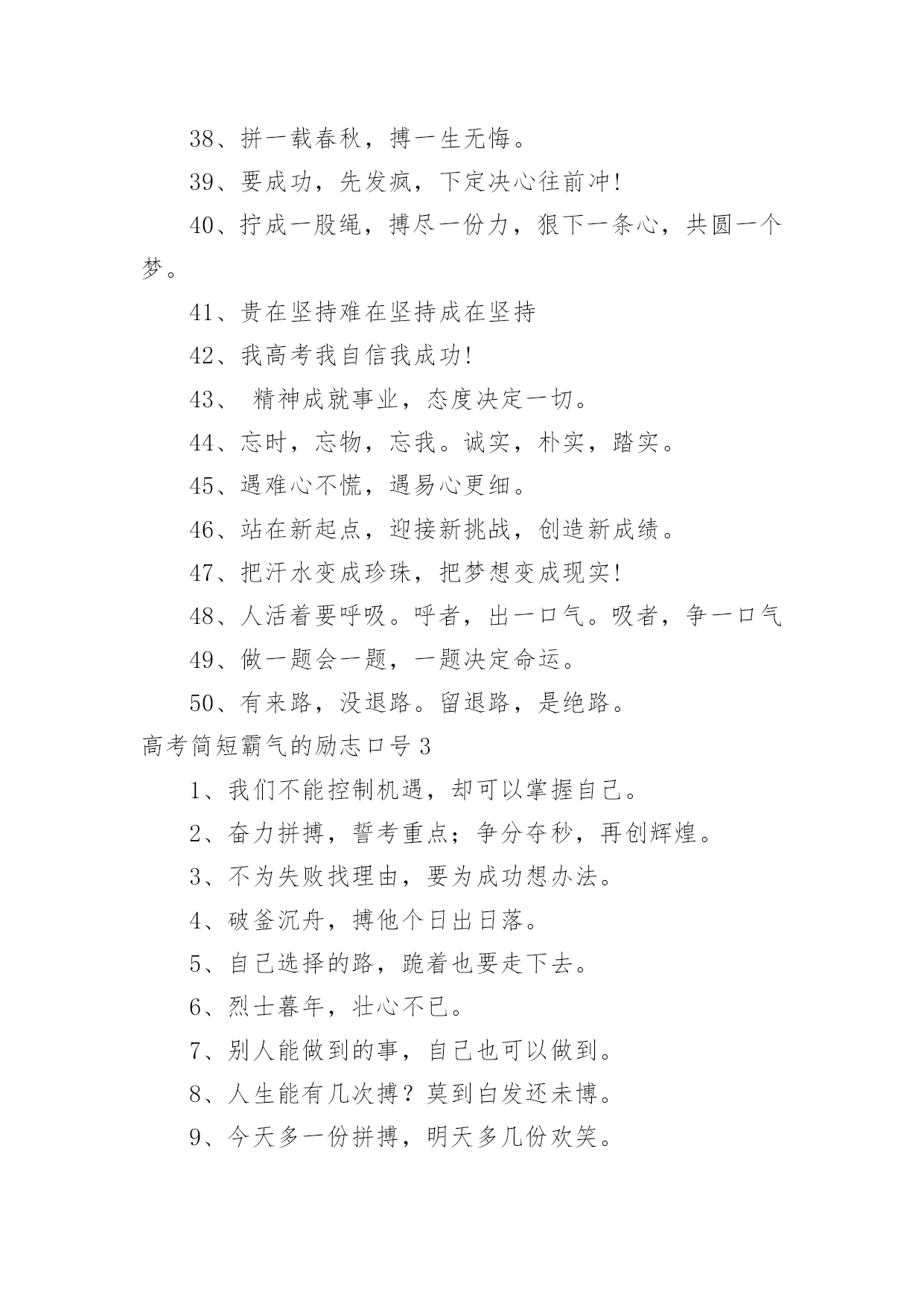 高考简短霸气的励志口号高考简短霸气的励志口号在学习、工作或生活中,说到口号,大家肯定都不陌生吧,口号作为意识的表现形式之一,是对当时社会政治、经济、文化的一种反映,不同性质的口号起着不同的作用。那什么样的口号才算得上是经典呢?下面是小编整理的高考简短霸气的励志口号,仅供参考,欢迎大家阅读。高考简短霸气的励志口号11、努力就能成功,坚持确保胜利。2、读书改变命运,刻苦成就事业,态度决定一切。3、不经风雨怎见彩虹;敢搏则过,爱拼才会赢。4、聚精会神搞学习,一心一意迎高考。5、人之所以能,是相信能。6、拼搏改变命运,虚度毁灭前途。7、立足基础,脚踏实地搏击高考。8、争分夺秒巧复习,勤学苦练创佳绩。9、更快更高更强。领先就是金牌。10、拼搏每一天,充实每一天,快乐每一天。11、对于世界,我微不足道,但对于我自己,我就是全部。12、精神成人,知识成才,态度成全。13、每一个不满意的现在,都有一个不努力的曾经。14、胸怀远志奔理想,脚踏实地迎高考。15、总想赢者必输,不怕输者必赢。16、不学习,如何养活你的众多女人。17、提高一分,干掉千人。18、同甘共苦拼搏从此时;风雨兼程成败在今年。19、决战高考,改变命运。屡挫屡战,笑傲群雄。20、志在峰巅的攀登者,不会陶醉在沿途的某个脚印之中。21、自己选择的路,跪着也要走下去。22、分秒必争,我必成功。23、雄鹰可以飞得晚,但一定要飞得高。24、因为我不能,所以一定要;因为一定要,所以一定能。25、靠山山会倒,靠水水会流,靠自己永远不倒。26、失败的尽头是成功,努力的终点是辉煌。27、人好学,虽死犹存;不学者,虽存犹灭。28、凌风破浪击长空,擎天揽日跃龙门。29、奋勇拼搏,决战高考。30、曾经的苦,现在的痛,都是将来的笑颜。高考简短霸气的励志口号21、对于世界,我微不足道,但对于我自己,我就是全部。2、因为我不能,所以一定要。因为一定要,所以一定能。3、百日竞渡三春香径乘风破浪酬壮志。4、九年磨砺六月考场摘星折桂展宏图。5、感亲恩直拼三年志在金榜题名。6、报师情再搏百日赢得似锦前程。7、千卷诗书满腹才华试问天下谁为王者。8、万丈豪情青春壮志敢对苍穹我是英雄。9、摒弃侥幸之念,必取百炼成钢。厚积分秒之功,始得一鸣惊人。10、抢时间,抓基础,勤演练定有收获。树自信,誓拼搏,升大学回报父母。11、披星戴月时书香盈耳含英咀华建学业。12、卧虎藏龙地豪气干云秣马厉兵显锋芒。13、健康是基础,勤奋是前提,方法是关键,优秀学风是条件,良好心理是保证。14、信心来自实力,实力来自勤奋。最困难的时候,也是离成功不远的时候。15、勇攀书山逐群雄实现心中梦想。16、泛游学海定乾坤赢得似锦前程。17、惜光阴百日犹短,细安排一刻也长。18、平日从严,高考坦然。19、脚踏实地,珍惜分秒。紧跟老师,夯实基础。20、求常胜,更求常省。21、青春多壮志硕果飘香迎佳绩。22、人生贵奋斗笑傲高考创辉煌。23、有大目标,须有大动作。有大追求,须有大改变。24、对命运承诺,对承诺负责25、再苦再累不掉队,再难再险不放弃26、请老师放心,我是你最骄傲的学子。请父母放心,我是你们最争气的孩子。27、我因一班而自豪,一班因我而骄傲28、拼搏高考,今生无悔。爬过高三,追求卓越!29、高三高考高目标,苦学善学上好学。30、无才无以立足,不苦不能成才。31、乐学实学,挑战高考。勤勉向上,成就自我。32、山高不厌攀,水深不厌潜,学精不厌苦:追求!33、作业考试化,考试高考化,将平时考试当高考,高考考试当平时。34、挑战人生是我无悔的选择,决胜高考是我不懈的追求。35、我心飞翔,路在脚下。36、保持平常心,营造好环境,扬起常笑脸,轻松迎高考。37、我自信,我出色:我拼搏,我成功!38、拧成一股绳,搏尽一份力,狠下一条心,共圆一个梦。39、努力就能成功,坚持确保胜利。40、回忆很美,尽管过程艰辛:也许结果总有遗憾,但我们无愧于心。41、遇难心不慌,遇易心更细。42、学练并举,成竹在胸,敢问逐鹿群雄今何在?师生同志,协力攻关,笑看燕赵魁首谁人得。43、花开花落腊梅傲雪盼新春;春去春来长风破浪迎高考。44、贵有恒何必三更起五更睡;最无益只怕一日曝十日寒。45、家中父母吃苦受累盼的是捷报频传;灯下学子呕心沥血想的是金榜题名。46、百日冲刺,苦战三四五,喜看凰墩飞彩凤;一心教学,笑迎六七八,争传瓜井育贤才。47、头悬梁,锥刺骨,巾帼挥毫书奇志;三更灯火,五更鸡,须眉仗笔写华章。48、卧虎藏龙地豪气干云秣马砺兵锋芒尽露;披星戴月时书香盈耳含英咀华学业必成。49、闻鸡起舞成就拼搏劲旅师;天道酬勤再现辉煌王者风。50、十年苦读一朝决胜负换来笑逐颜开;数载艰辛六月定乾坤赢得似锦前程。高考励志口号简短霸气1、人若在,梦就在,只要做,就能行,相信自我,成功自我。2、天道