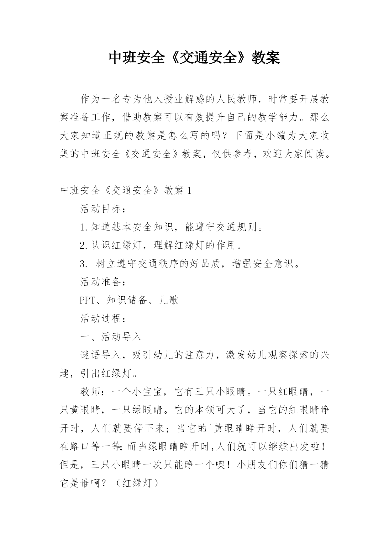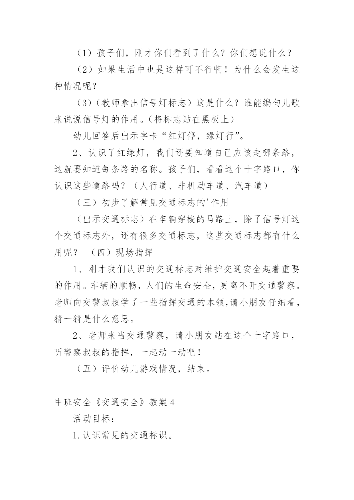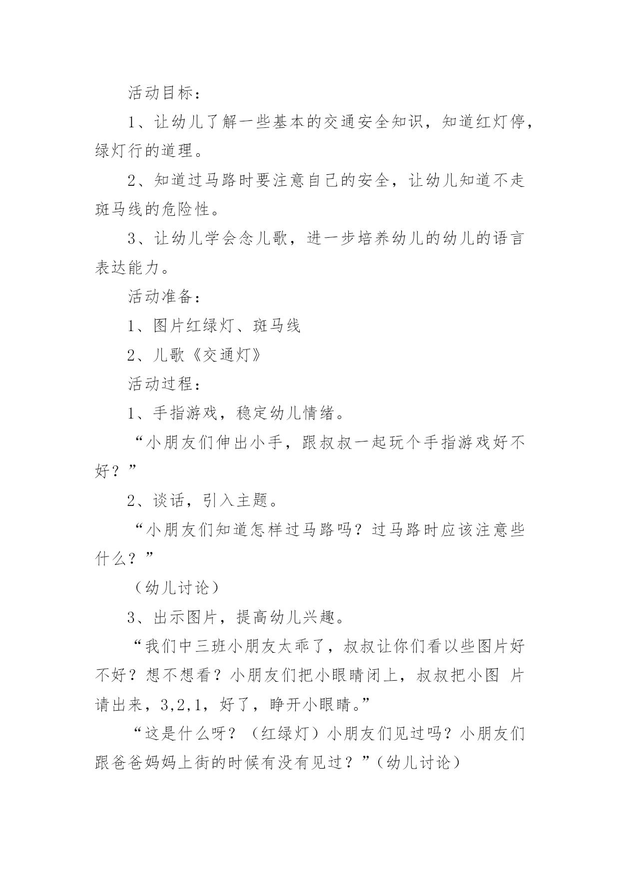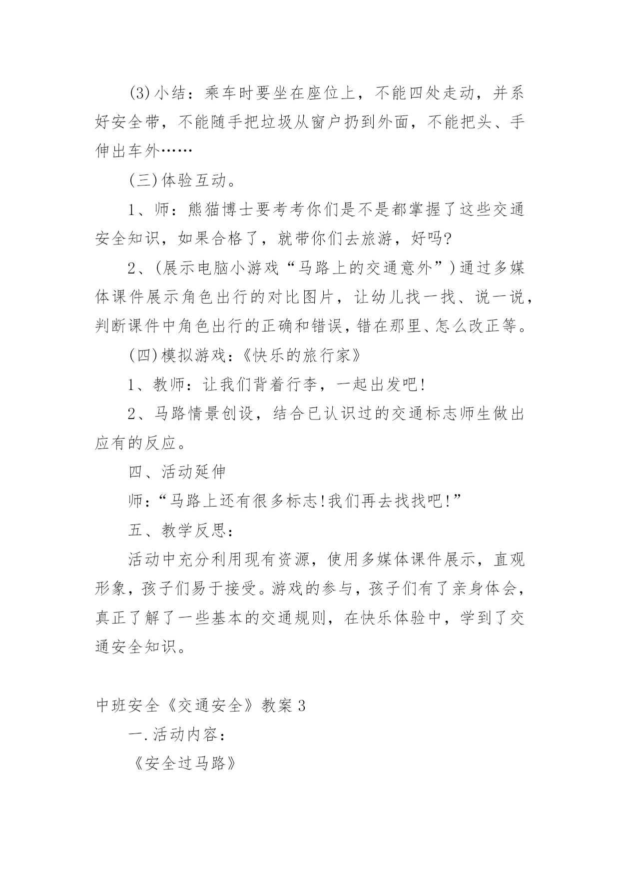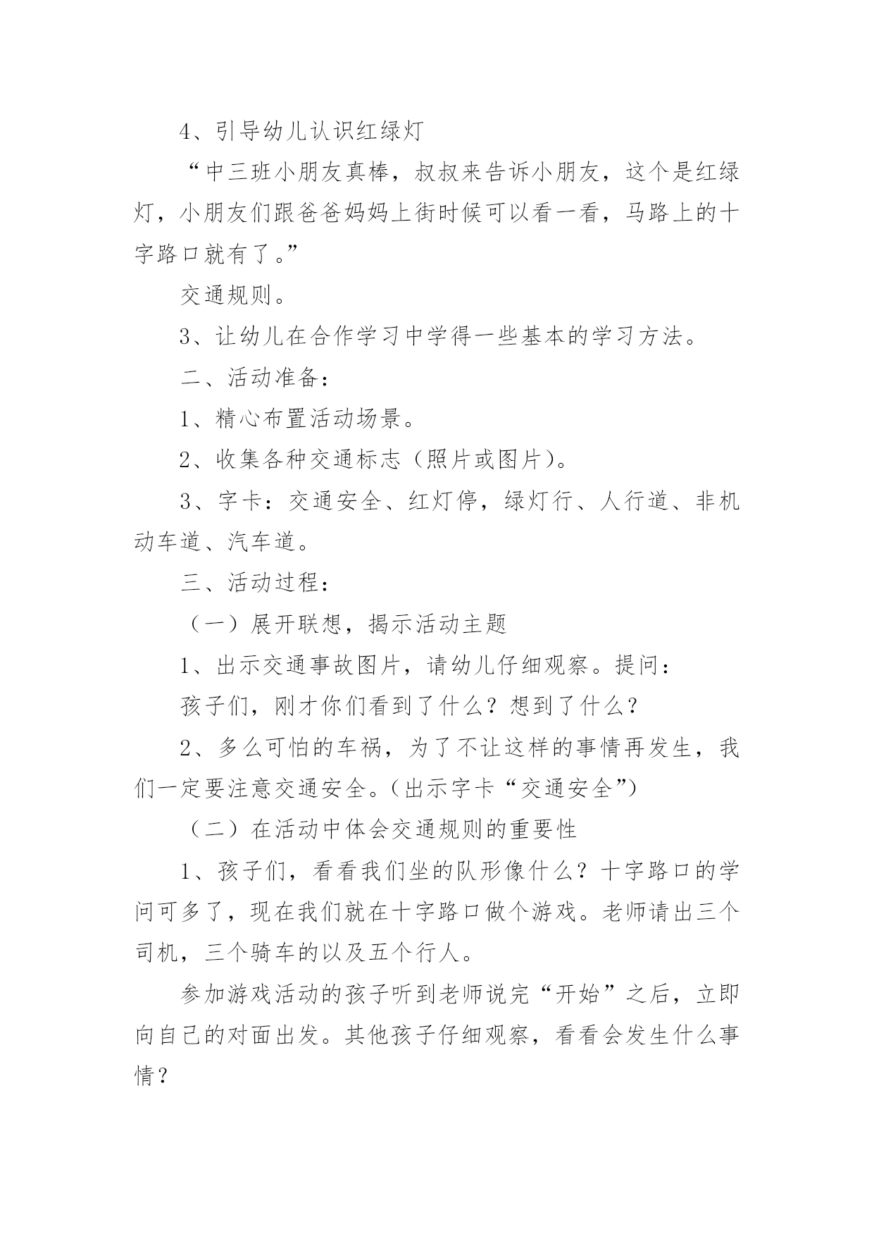 中班安全《交通安全》教案作为一名专为他人授业解惑的人民教师,时常要开展教案准备工作,借助教案可以有效提升自己的教学能力。那么大家知道正规的教案是怎么写的吗?下面是小编为大家收集的中班安全《交通安全》教案,仅供参考,欢迎大家阅读。中班安全《交通安全》教案1活动目标:1.知道基本安全知识,能遵守交通规则。2.认识红绿灯,理解红绿灯的作用。3.树立遵守交通秩序的好品质,增强安全意识。活动准备:PPT、知识储备、儿歌活动过程:一、活动导入谜语导入,吸引幼儿的注意力,激发幼儿观察探索的兴趣,引出红绿灯。教师:一个小宝宝,它有三只小眼睛。一只红眼睛,一只黄眼睛,一只绿眼睛。它的本领可大了,当它的红眼睛睁开时,人们就要停下来;当它的'黄眼睛睁开时,人们就要在路口等一等;而当绿眼睛睁开时,人们就可以继续出发啦!但是,三只小眼睛一次只能睁一个噢!小朋友们你们猜一猜它是谁啊?(红绿灯)教师:现在呢,红绿灯要给小朋友们唱一首好听的歌。请小朋友们竖起小耳朵听一听吧!红灯停绿灯行黄灯亮了等一等二、活动过程讲故事豆豆在星期六的早上,和爸爸妈妈一起开车去爷爷奶奶家里做客。路上碰到了一些不文明的行为,豆豆把自己看到的这些讲给爷爷听。爷爷告诉他,这些行为是不对的,而且很危险。最后豆豆和爷爷学习了正确的交通规则。活动延伸:请小朋友们和爸爸妈妈一起分享交通规则哦!中班安全《交通安全》教案2一、活动目标1、引导幼儿认知三种交通标志,初步了解马路上的基本交通安全知识。2、教育幼儿自觉遵守交通法规,提高自我防护能力。3、培养幼儿动脑思考问题、解决问题的能力。4、知道危险来临时如何保护自己,如何逃生。二、活动准备:1、幼儿已有交通生活经验。2、课件:《交通安全很重要》3、实物:交通安全标志图片、玩具方向盘。三、活动过程:(一)引题激趣。1.教师以带领幼儿外出旅行为话题,引入课件。2.(播放课件)幼儿观察课件内容,初步了解过马路的时的危险状况。3.通过课件,引出“熊猫博士”这一交通出行的专家,带领幼儿学习交通安全知识。(二)观察讨论。1、(播放课件)幼儿观察、认识马路上的红绿灯、人行道。提问:这是什么地方?怎样过去才安全?2、认识常见的三种交通安全标志。出示标志:禁止行人通行、人行横道、步行街三种人行交通标志,让幼儿学习认识并了解它们的`作用。3、危险案例分析(出示课件)(1)组织幼儿观察翻越栏、路边玩耍、横穿马路等危险行为,引导幼儿讨论:这样做对吗?为什么?应该怎样做?(2)教师小结。4.乘车安全要注意(1)幼儿自由讨论有关乘车的安全。(2)请个别幼儿说一说乘车时应做什么?不能做什么?播放课件:小朋友把头伸到窗户外看风景。提问:这样乘车好不好?为什么?他该怎么做?播放课件:小朋友在出租车上随便开门。提问:他这样做对吗?为什么?他该怎么做?(3)小结:乘车时要坐在座位上,不能四处走动,并系好安全带,不能随手把垃圾从窗户扔到外面,不能把头、手伸出车外……(三)体验互动。1、师:熊猫博士要考考你们是不是都掌握了这些交通安全知识,如果合格了,就带你们去旅游,好吗?2、(展示电脑小游戏“马路上的交通意外”)通过多媒体课件展示角色出行的对比图片,让幼儿找一找、说一说,判断课件中角色出行的正确和错误,错在那里、怎么改正等。(四)模拟游戏:《快乐的旅行家》1、教师:让我们背着行李,一起出发吧!2、马路情景创设,结合已认识过的交通标志师生做出应有的反应。四、活动延伸师:“马路上还有很多标志!我们再去找找吧!”五、教学反思:活动中充分利用现有资源,使用多媒体课件展示,直观形象,孩子们易于接受。游戏的参与,孩子们有了亲身体会,真正了解了一些基本的交通规则,在快乐体验中,学到了交通安全知识。中班安全《交通安全》教案3一.活动内容:《安全过马路》活动目标:1、让幼儿了解一些基本的交通安全知识,知道红灯停,绿灯行的道理。2、知道过马路时要注意自己的安全,让幼儿知道不走斑马线的危险性。3、让幼儿学会念儿歌,进一步培养幼儿的幼儿的语言表达能力。活动准备:1、图片红绿灯、斑马线2、儿歌《交通灯》活动过程:1、手指游戏,稳定幼儿情绪。“小朋友们伸出小手,跟叔叔一起玩个手指游戏好不好?”2、谈话,引入主题。“小朋友们知道怎样过马路吗?过马路时应该注意些什么?”(幼儿讨论)3、出示图片,提高幼儿兴趣。“我们中三班小朋友太乖了,叔叔让你们看以些图片好不好?想不想看?小朋友们把小眼睛闭上,叔叔把小图片请出来,3,2,1,好了,睁开小眼睛。”“这是什么呀?(红绿灯)小朋友们见过吗?小朋友们跟爸爸妈妈上街的时候有没有见过?”(幼儿讨论)4、引导幼儿认识红绿灯“中三班小朋友真棒,叔叔来告诉小朋友,这个是红绿灯,小朋友们跟爸爸妈妈上街时候可以看一看,马路上的十字路口就有了。”交通规则。3、让幼儿在合作学习中学得一些基本