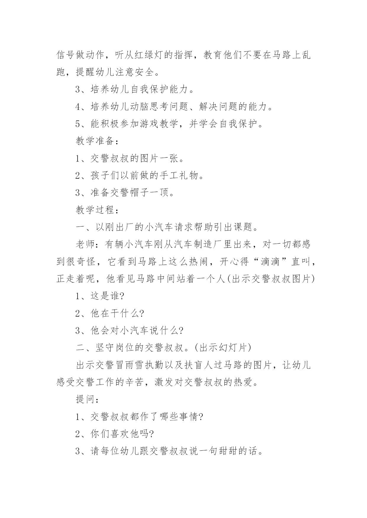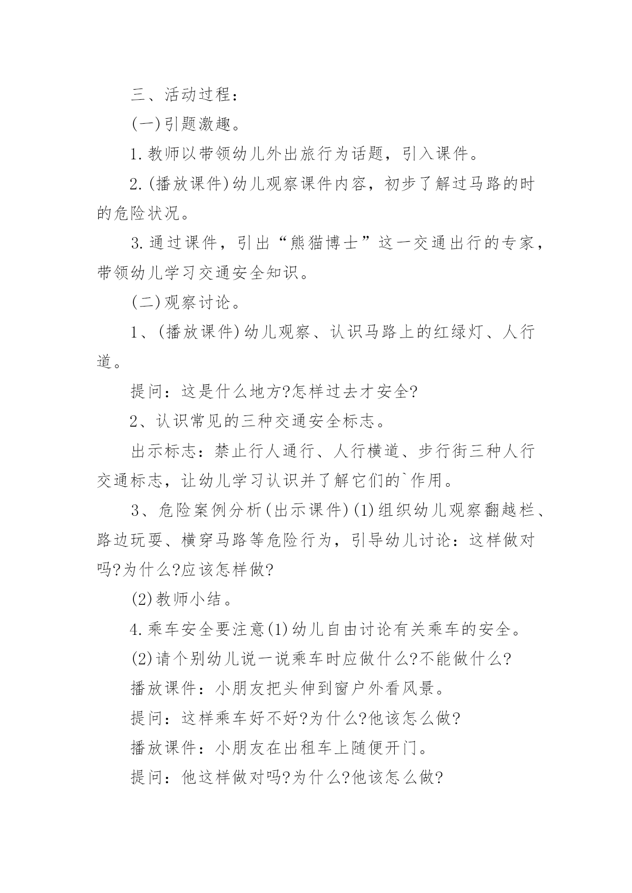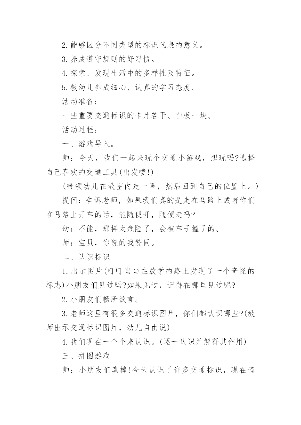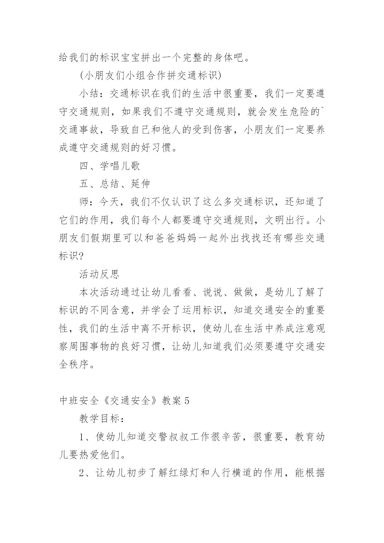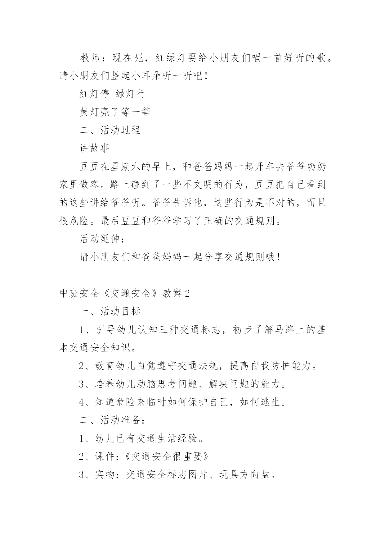 中班安全《交通安全》教案作为一名专为他人授业解惑的人民教师,时常要开展教案准备工作,借助教案可以有效提升自己的教学能力。那么大家知道正规的教案是怎么写的吗?下面是小编为大家收集的中班安全《交通安全》教案,仅供参考,欢迎大家阅读。中班安全《交通安全》教案1活动目标:1.知道基本安全知识,能遵守交通规则。2.认识红绿灯,理解红绿灯的作用。3.树立遵守交通秩序的好品质,增强安全意识。活动准备:PPT、知识储备、儿歌活动过程:一、活动导入谜语导入,吸引幼儿的注意力,激发幼儿观察探索的兴趣,引出红绿灯。教师:一个小宝宝,它有三只小眼睛。一只红眼睛,一只黄眼睛,一只绿眼睛。它的本领可大了,当它的红眼睛睁开时,人们就要停下来;当它的'黄眼睛睁开时,人们就要在路口等一等;而当绿眼睛睁开时,人们就可以继续出发啦!但是,三只小眼睛一次只能睁一个噢!小朋友们你们猜一猜它是谁啊?(红绿灯)教师:现在呢,红绿灯要给小朋友们唱一首好听的歌。请小朋友们竖起小耳朵听一听吧!红灯停绿灯行黄灯亮了等一等二、活动过程讲故事豆豆在星期六的早上,和爸爸妈妈一起开车去爷爷奶奶家里做客。路上碰到了一些不文明的行为,豆豆把自己看到的这些讲给爷爷听。爷爷告诉他,这些行为是不对的,而且很危险。最后豆豆和爷爷学习了正确的交通规则。活动延伸:请小朋友们和爸爸妈妈一起分享交通规则哦!中班安全《交通安全》教案2一、活动目标1、引导幼儿认知三种交通标志,初步了解马路上的基本交通安全知识。2、教育幼儿自觉遵守交通法规,提高自我防护能力。3、培养幼儿动脑思考问题、解决问题的能力。4、知道危险来临时如何保护自己,如何逃生。二、活动准备:1、幼儿已有交通生活经验。2、课件:《交通安全很重要》3、实物:交通安全标志图片、玩具方向盘。三、活动过程:(一)引题激趣。1.教师以带领幼儿外出旅行为话题,引入课件。2.(播放课件)幼儿观察课件内容,初步了解过马路的时的危险状况。3.通过课件,引出“熊猫博士”这一交通出行的专家,带领幼儿学习交通安全知识。(二)观察讨论。1、(播放课件)幼儿观察、认识马路上的红绿灯、人行道。提问:这是什么地方?怎样过去才安全?2、认识常见的三种交通安全标志。出示标志:禁止行人通行、人行横道、步行街三种人行交通标志,让幼儿学习认识并了解它们的`作用。3、危险案例分析(出示课件)(1)组织幼儿观察翻越栏、路边玩耍、横穿马路等危险行为,引导幼儿讨论:这样做对吗?为什么?应该怎样做?(2)教师小结。4.乘车安全要注意(1)幼儿自由讨论有关乘车的安全。(2)请个别幼儿说一说乘车时应做什么?不能做什么?播放课件:小朋友把头伸到窗户外看风景。提问:这样乘车好不好?为什么?他该怎么做?播放课件:小朋友在出租车上随便开门。提问:他这样做对吗?为什么?他该怎么做?(3)小结:乘车时要坐在座位上,不能四处走动,并系好安全带,不能随手把垃圾从窗户扔到外面,不能把头、手伸出车外……(三)体验互动。1、师:熊猫博士要考考你们是不是都掌握了这些交通安全知识,如果合格了,就带你们去旅游,好吗?2、(展示电脑小游戏“马路上的交通意外”)通过多媒体课件展示角色出行的对比图片,让幼儿找一找、说一说,判断课件中角色出行的正确和错误,错在那里、怎么改正等。(四)模拟游戏:《快乐的旅行家》1、教师:让我们背着行李,一起出发吧!2、马路情景创设,结合已认识过的交通标志师生做出应有的反应。四、活动延伸师:“马路上还有很多标志!我们再去找找吧!”五、教学反思:活动中充分利用现有资源,使用多媒体课件展示,直观形象,孩子们易于接受。游戏的参与,孩子们有了亲身体会,真正了解了一些基本的交通规则,在快乐体验中,学到了交通安全知识。中班安全《交通安全》教案3一.活动内容:《安全过马路》活动目标:1、让幼儿了解一些基本的交通安全知识,知道红灯停,绿灯行的道理。2、知道过马路时要注意自己的安全,让幼儿知道不走斑马线的危险性。3、让幼儿学会念儿歌,进一步培养幼儿的幼儿的语言表达能力。活动准备:1、图片红绿灯、斑马线2、儿歌《交通灯》活动过程:1、手指游戏,稳定幼儿情绪。“小朋友们伸出小手,跟叔叔一起玩个手指游戏好不好?”2、谈话,引入主题。“小朋友们知道怎样过马路吗?过马路时应该注意些什么?”(幼儿讨论)3、出示图片,提高幼儿兴趣。“我们中三班小朋友太乖了,叔叔让你们看以些图片好不好?想不想看?小朋友们把小眼睛闭上,叔叔把小图片请出来,3,2,1,好了,睁开小眼睛。”“这是什么呀?(红绿灯)小朋友们见过吗?小朋友们跟爸爸妈妈上街的时候有没有见过?”(幼儿讨论)4、引导幼儿认识红绿灯“中三班小朋友真棒,叔叔来告诉小朋友,这个是红绿灯,小朋友们跟爸爸妈妈上街时候可以看一看,马路上的十字路口就有了。”交通规则。3、让幼儿在合作学习中学得一些基本