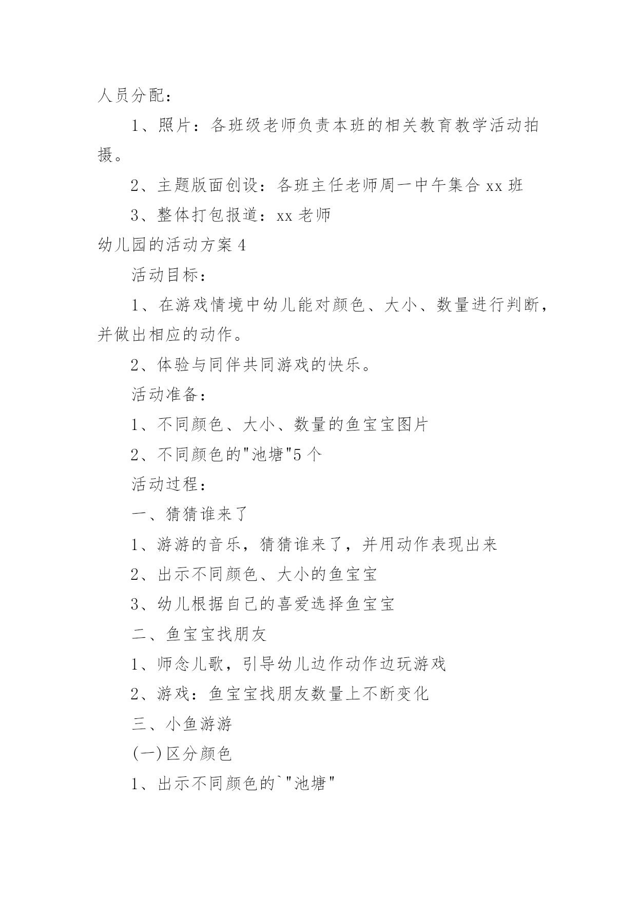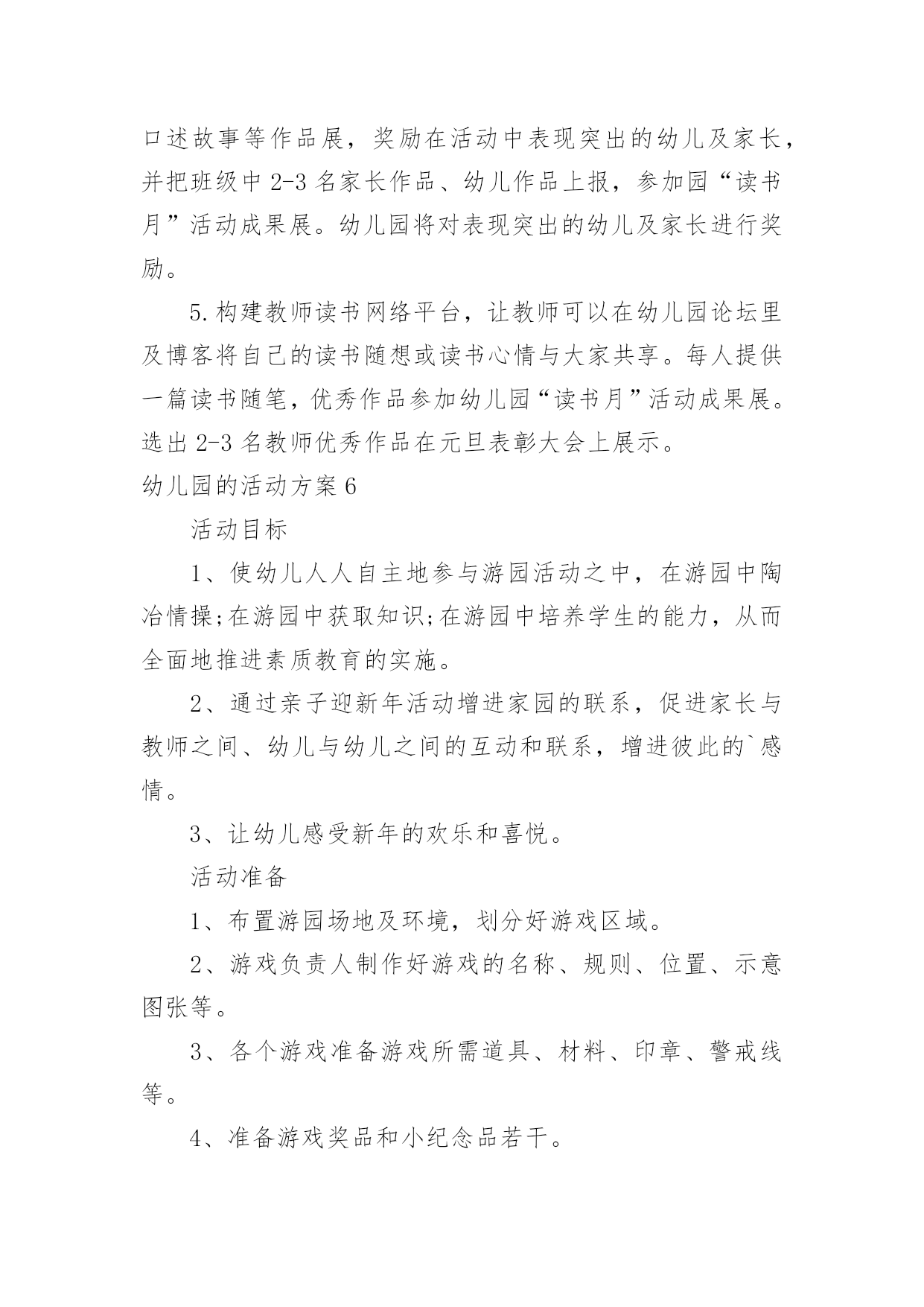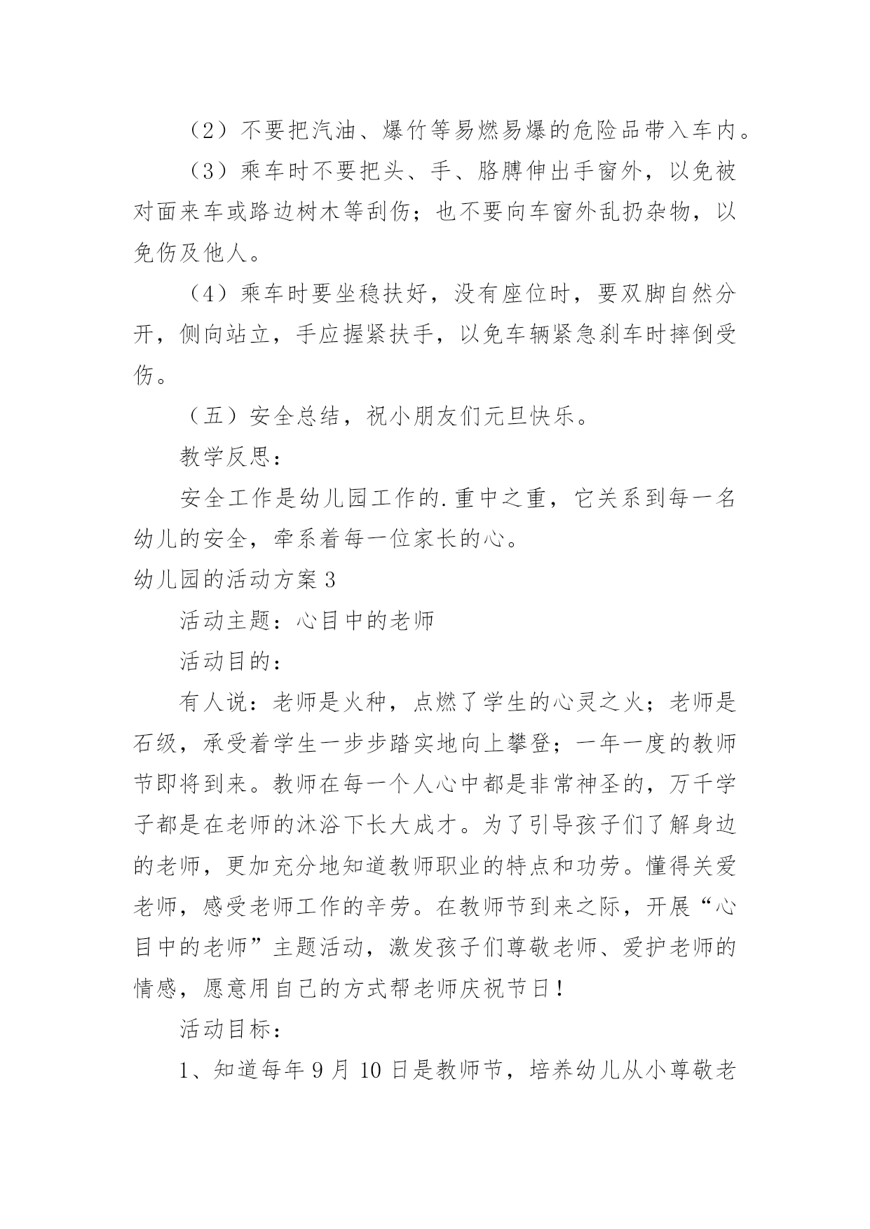 幼儿园的活动方案幼儿园的活动方案(15篇)为了保障事情或工作顺利、圆满进行,就需要我们事先制定方案,方案的内容多是上级对下级或涉及面比较大的工作,一般都用带“文件头”形式下发。优秀的方案都具备一些什么特点呢?以下是小编为大家整理的幼儿园的活动方案,欢迎大家分享。幼儿园的活动方案1活动设计意图:为增强幼儿的社会实践能力,让幼儿体验生活,在生活中快乐成长。特组织全体小班幼儿怀揣10元钱走出幼儿园小教室,高兴地走进了社会大课堂——苏果超市,开展“逛超市”的社会实践活动。活动名称:小鬼当家活动地点:苏果超市活动时间:20xx。04。22活动准备:穿着统一园服活动目标:1、认识超市的服务人员,了解他们的工作特点,并懂得尊重别人的劳动成果。2、学习购物,并能够在超市的工作人员提醒下,尝试独立进行购物,提高幼儿自主能力以及解决问题的能力,并且能够处理好陌生人用礼物诱惑,提高自己独立性与社会实践技能。活动过程:一、提前认识各种常见的'蔬菜、肉食和水果1、了解相关的蔬菜名称和外形特征。2、引导幼儿通过认识蔬菜、肉食和水果,激发幼儿爱吃蔬菜的欲望二、社会实践活动“小鬼当家”1、提前给幼儿提出要求,注意活动安全。2、认识超市的服务人员,了解他们的工作特点,并懂得尊重别人的劳动成果认识售货员、保安、收银员,并了解他们的工作特点。并且能够按照他们要求进行活动,懂得遵守超市的公共秩序。3、组织幼儿参加购物活动,要求幼儿在老师的提醒下,进行购物前统计表,购物活动(将幼儿按照每组5~6人进行分组活动,最后集中在收银台进行结账)4、谈话活动:我喜欢的蔬菜、水果、食品等。5、引导幼儿说出自己喜欢蔬菜的理由,通过讨论使幼儿能够养成正确、饮食观念。xx20xx年4月幼儿园的活动方案2活动目标:1、切实加强元旦期间幼儿安全教育,增强幼儿安全防范意识。2、向幼儿进行防冻、防烫、防交通事故、食品安全、预防传染病等安全防范教育,增强幼儿的自我保护和安全防范意识。3、了解节日的来历,知道节日的日子及习俗,乐于参与节日的活动。4、了解节日中应注意的安全和卫生,增强自我保护的意识。活动准备:元旦假期安全PPT课件活动过程:(一)介绍元旦知识。(二)防冻疮。1、冻疮最常张在哪?常发生在身体末端,暴漏部位。2、冻疮防护。(1)室内保暖:尽量保持室内温度不低子10℃;(2)外出保暖:外出时带好手套、帽子,穿棉鞋棉袜;(3)裸露皮肤擦护肤品;(4)合理饮食:适当多食用年羊肉等防寒保暖的食物;(5)适当运动:促进血液循环,提高皮服对寒冷的适应力。(三)交通安全。1、步行安全:(1)行人须走人行道,没有人行道的要靠路边行走。(2)行走时必须要看红绿灯,红灯停,绿灯行。(3)行人不准在车道上追逐,或车辆临近时猛拐横穿。(4)不准在道路上扒车、追车或强行拦车或抛物击车。(5)不准在公路上玩耍、嬉闹。(6)学龄前儿童在街道或公路上行走,须有成年人带领。2、乘坐公共汽车安全知识:(1)乘坐公共汽车,要排队候车,按先后顺序上车,不要拥挤。上下车均应等车停稳以后,先下后上,不要争抢。(2)不要把汽油、爆竹等易燃易爆的危险品带入车内。(3)乘车时不要把头、手、胳膊伸出手窗外,以免被对面来车或路边树木等刮伤;也不要向车窗外乱扔杂物,以免伤及他人。(4)乘车时要坐稳扶好,没有座位时,要双脚自然分开,侧向站立,手应握紧扶手,以免车辆紧急刹车时摔倒受伤。(五)安全总结,祝小朋友们元旦快乐。教学反思:安全工作是幼儿园工作的.重中之重,它关系到每一名幼儿的安全,牵系着每一位家长的心。幼儿园的活动方案3活动主题:心目中的老师活动目的:有人说:老师是火种,点燃了学生的心灵之火;老师是石级,承受着学生一步步踏实地向上攀登;一年一度的教师节即将到来。教师在每一个人心中都是非常神圣的,万千学子都是在老师的沐浴下长大成才。为了引导孩子们了解身边的老师,更加充分地知道教师职业的特点和功劳。懂得关爱老师,感受老师工作的辛劳。在教师节到来之际,开展“心目中的老师”主题活动,激发孩子们尊敬老师、爱护老师的情感,愿意用自己的方式帮老师庆祝节日!活动目标:1、知道每年9月10日是教师节,培养幼儿从小尊敬老师的美德。2、能够运用诗歌、调查、手工、角色互换等不同形式,感受老师的.辛劳,向老师表达感激之情。3、培养幼儿的大胆表现力、语言表达和动手操作能力。活动内容:一、各班活动详情:1、语言:我的好老师,主要以诗歌形式,引导幼儿了解自己的老师,感受老师的辛劳。2、综合:老师大发现,以调查表的形式,记录自己喜爱老师的各种信息。3、音乐:每当我走到老师的窗前,通过音乐,感受老师的辛劳,向老师表达感激之情。4、综合:我爱我的老师,引导幼儿了解教师节的由来,运用自己的方式庆祝老师节日快乐。5、手工:感谢老师,开动脑筋运用折纸、绘画等方式制作礼物送给自