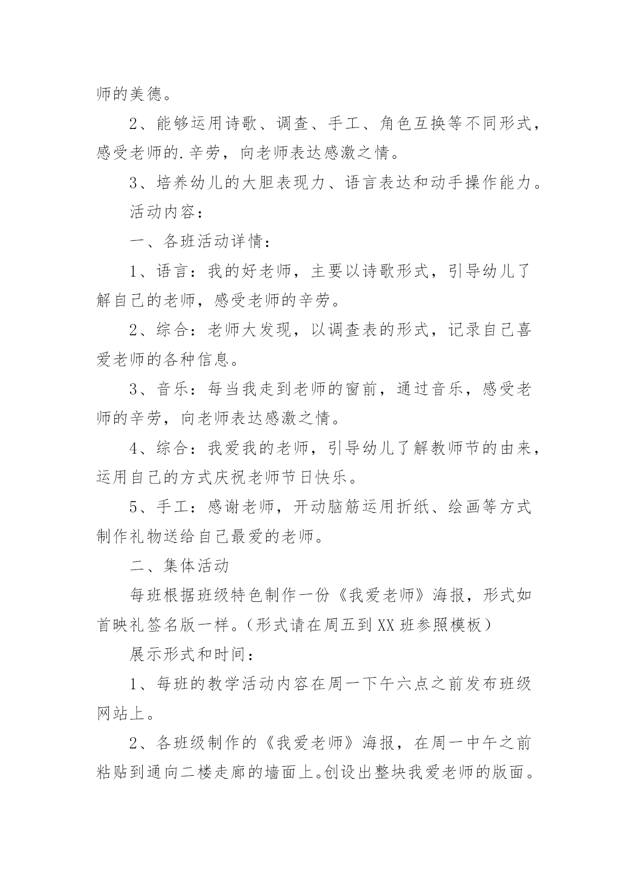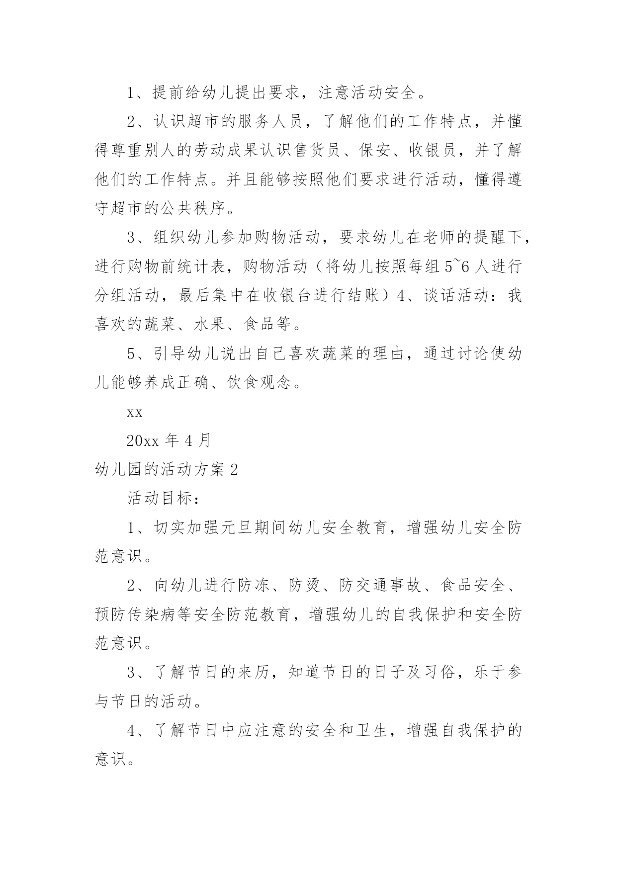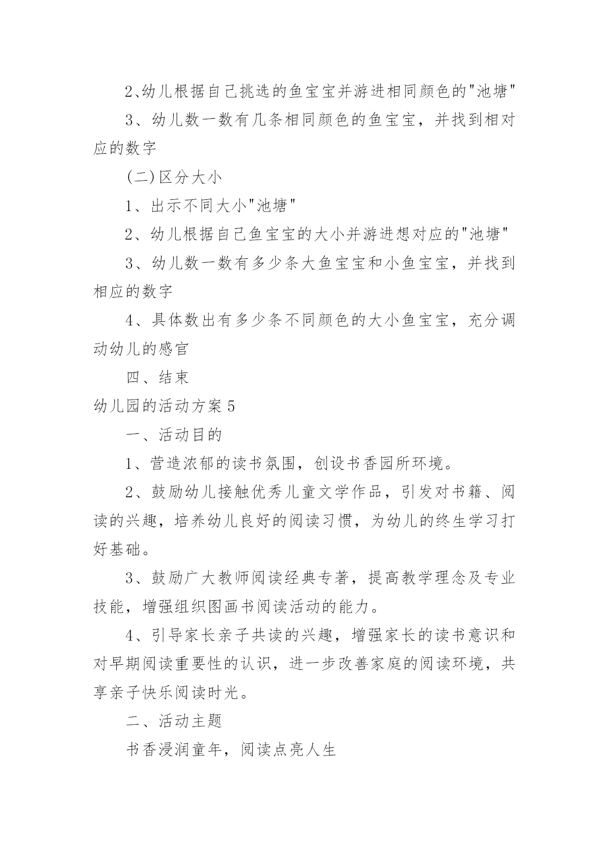 幼儿园的活动方案幼儿园的活动方案(15篇)为了保障事情或工作顺利、圆满进行,就需要我们事先制定方案,方案的内容多是上级对下级或涉及面比较大的工作,一般都用带“文件头”形式下发。优秀的方案都具备一些什么特点呢?以下是小编为大家整理的幼儿园的活动方案,欢迎大家分享。幼儿园的活动方案1活动设计意图:为增强幼儿的社会实践能力,让幼儿体验生活,在生活中快乐成长。特组织全体小班幼儿怀揣10元钱走出幼儿园小教室,高兴地走进了社会大课堂——苏果超市,开展“逛超市”的社会实践活动。活动名称:小鬼当家活动地点:苏果超市活动时间:20xx。04。22活动准备:穿着统一园服活动目标:1、认识超市的服务人员,了解他们的工作特点,并懂得尊重别人的劳动成果。2、学习购物,并能够在超市的工作人员提醒下,尝试独立进行购物,提高幼儿自主能力以及解决问题的能力,并且能够处理好陌生人用礼物诱惑,提高自己独立性与社会实践技能。活动过程:一、提前认识各种常见的'蔬菜、肉食和水果1、了解相关的蔬菜名称和外形特征。2、引导幼儿通过认识蔬菜、肉食和水果,激发幼儿爱吃蔬菜的欲望二、社会实践活动“小鬼当家”1、提前给幼儿提出要求,注意活动安全。2、认识超市的服务人员,了解他们的工作特点,并懂得尊重别人的劳动成果认识售货员、保安、收银员,并了解他们的工作特点。并且能够按照他们要求进行活动,懂得遵守超市的公共秩序。3、组织幼儿参加购物活动,要求幼儿在老师的提醒下,进行购物前统计表,购物活动(将幼儿按照每组5~6人进行分组活动,最后集中在收银台进行结账)4、谈话活动:我喜欢的蔬菜、水果、食品等。5、引导幼儿说出自己喜欢蔬菜的理由,通过讨论使幼儿能够养成正确、饮食观念。xx20xx年4月幼儿园的活动方案2活动目标:1、切实加强元旦期间幼儿安全教育,增强幼儿安全防范意识。2、向幼儿进行防冻、防烫、防交通事故、食品安全、预防传染病等安全防范教育,增强幼儿的自我保护和安全防范意识。3、了解节日的来历,知道节日的日子及习俗,乐于参与节日的活动。4、了解节日中应注意的安全和卫生,增强自我保护的意识。活动准备:元旦假期安全PPT课件活动过程:(一)介绍元旦知识。(二)防冻疮。1、冻疮最常张在哪?常发生在身体末端,暴漏部位。2、冻疮防护。(1)室内保暖:尽量保持室内温度不低子10℃;(2)外出保暖:外出时带好手套、帽子,穿棉鞋棉袜;(3)裸露皮肤擦护肤品;(4)合理饮食:适当多食用年羊肉等防寒保暖的食物;(5)适当运动:促进血液循环,提高皮服对寒冷的适应力。(三)交通安全。1、步行安全:(1)行人须走人行道,没有人行道的要靠路边行走。(2)行走时必须要看红绿灯,红灯停,绿灯行。(3)行人不准在车道上追逐,或车辆临近时猛拐横穿。(4)不准在道路上扒车、追车或强行拦车或抛物击车。(5)不准在公路上玩耍、嬉闹。(6)学龄前儿童在街道或公路上行走,须有成年人带领。2、乘坐公共汽车安全知识:(1)乘坐公共汽车,要排队候车,按先后顺序上车,不要拥挤。上下车均应等车停稳以后,先下后上,不要争抢。(2)不要把汽油、爆竹等易燃易爆的危险品带入车内。(3)乘车时不要把头、手、胳膊伸出手窗外,以免被对面来车或路边树木等刮伤;也不要向车窗外乱扔杂物,以免伤及他人。(4)乘车时要坐稳扶好,没有座位时,要双脚自然分开,侧向站立,手应握紧扶手,以免车辆紧急刹车时摔倒受伤。(五)安全总结,祝小朋友们元旦快乐。教学反思:安全工作是幼儿园工作的.重中之重,它关系到每一名幼儿的安全,牵系着每一位家长的心。幼儿园的活动方案3活动主题:心目中的老师活动目的:有人说:老师是火种,点燃了学生的心灵之火;老师是石级,承受着学生一步步踏实地向上攀登;一年一度的教师节即将到来。教师在每一个人心中都是非常神圣的,万千学子都是在老师的沐浴下长大成才。为了引导孩子们了解身边的老师,更加充分地知道教师职业的特点和功劳。懂得关爱老师,感受老师工作的辛劳。在教师节到来之际,开展“心目中的老师”主题活动,激发孩子们尊敬老师、爱护老师的情感,愿意用自己的方式帮老师庆祝节日!活动目标:1、知道每年9月10日是教师节,培养幼儿从小尊敬老师的美德。2、能够运用诗歌、调查、手工、角色互换等不同形式,感受老师的.辛劳,向老师表达感激之情。3、培养幼儿的大胆表现力、语言表达和动手操作能力。活动内容:一、各班活动详情:1、语言:我的好老师,主要以诗歌形式,引导幼儿了解自己的老师,感受老师的辛劳。2、综合:老师大发现,以调查表的形式,记录自己喜爱老师的各种信息。3、音乐:每当我走到老师的窗前,通过音乐,感受老师的辛劳,向老师表达感激之情。4、综合:我爱我的老师,引导幼儿了解教师节的由来,运用自己的方式庆祝老师节日快乐。5、手工:感谢老师,开动脑筋运用折纸、绘画等方式制作礼物送给自