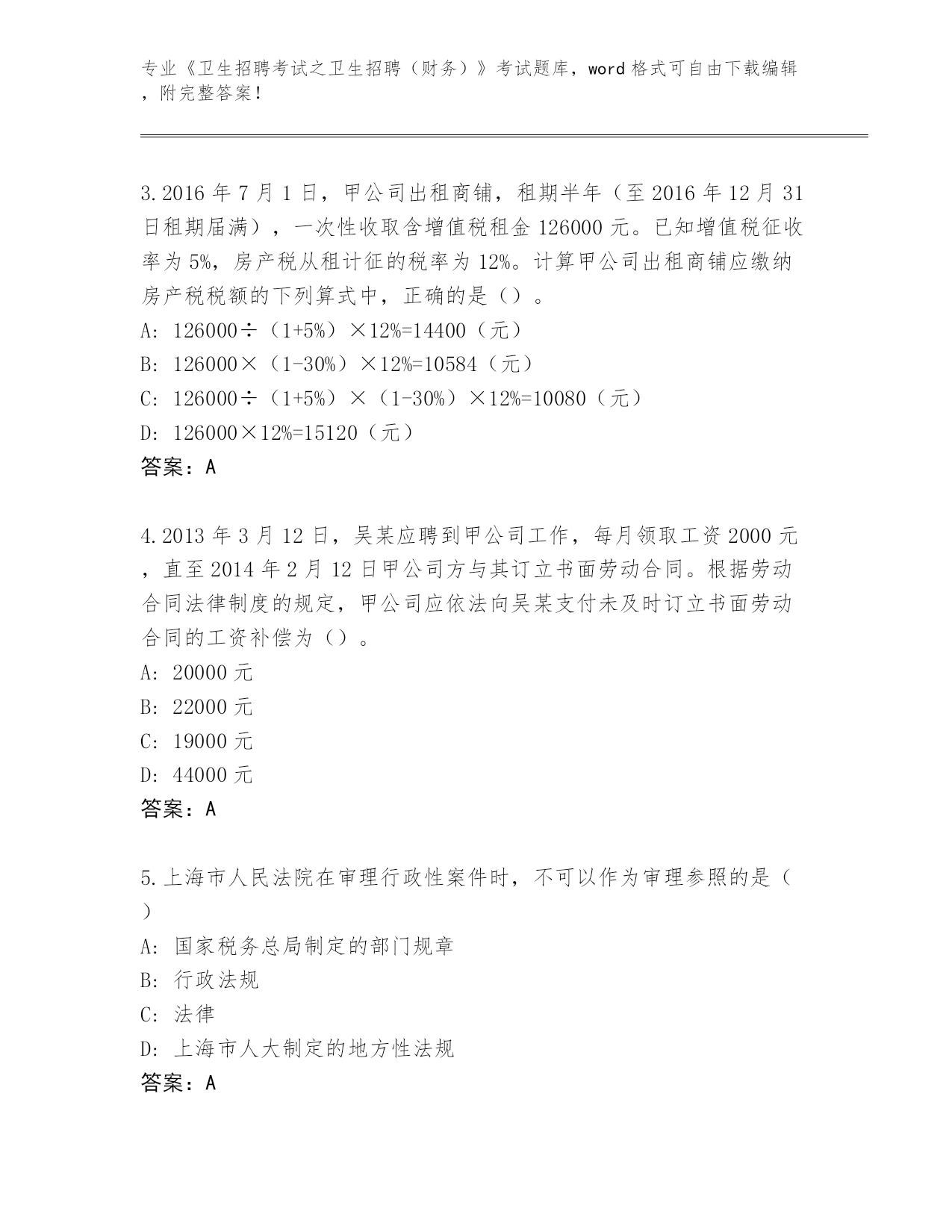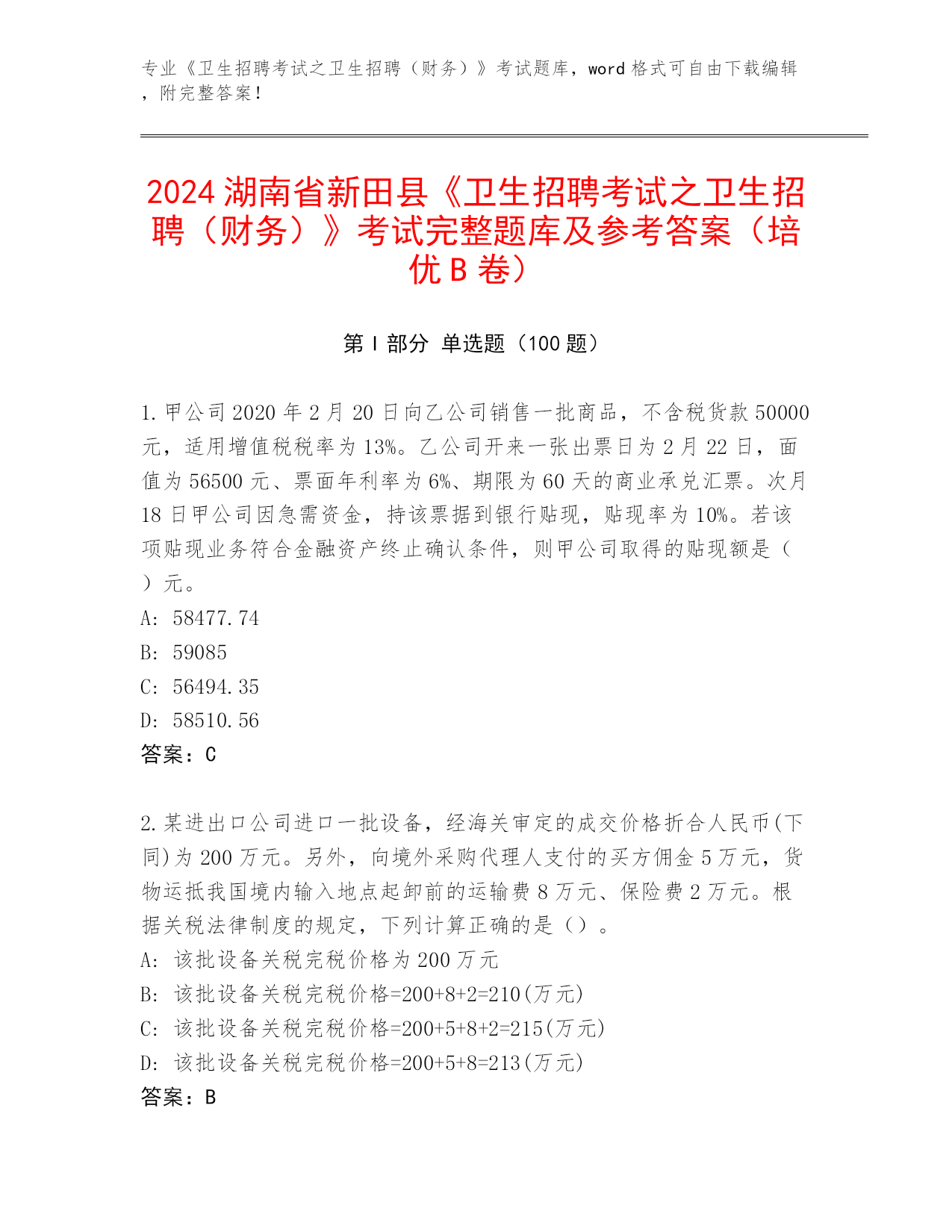 2024湖南省新田县《卫生招聘考试之卫生招聘(财务)》考试完整题库及参考答案(培优B卷)