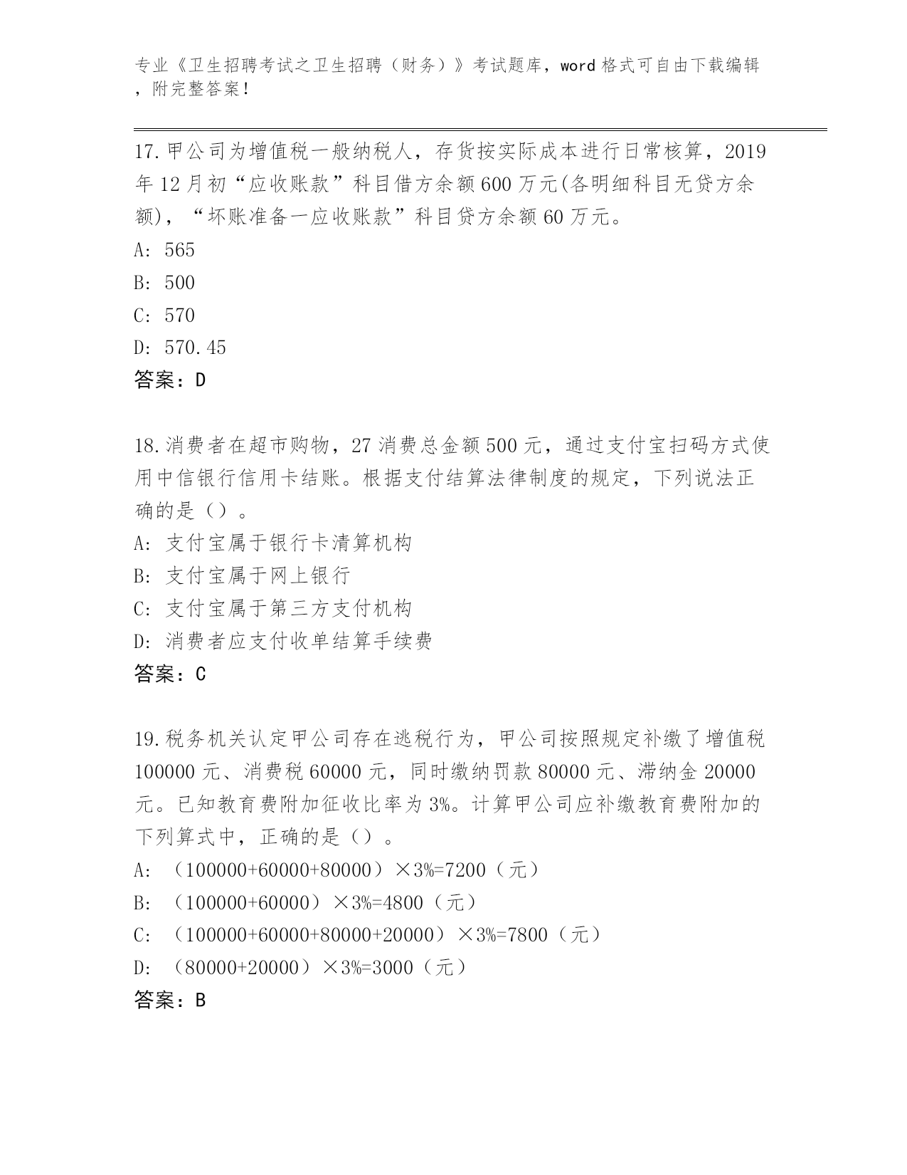 2024年湖南省《卫生招聘考试之卫生招聘(财务)》考试大全及参考答案(培优B卷)