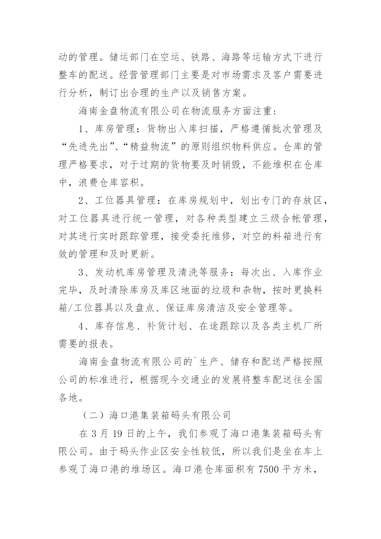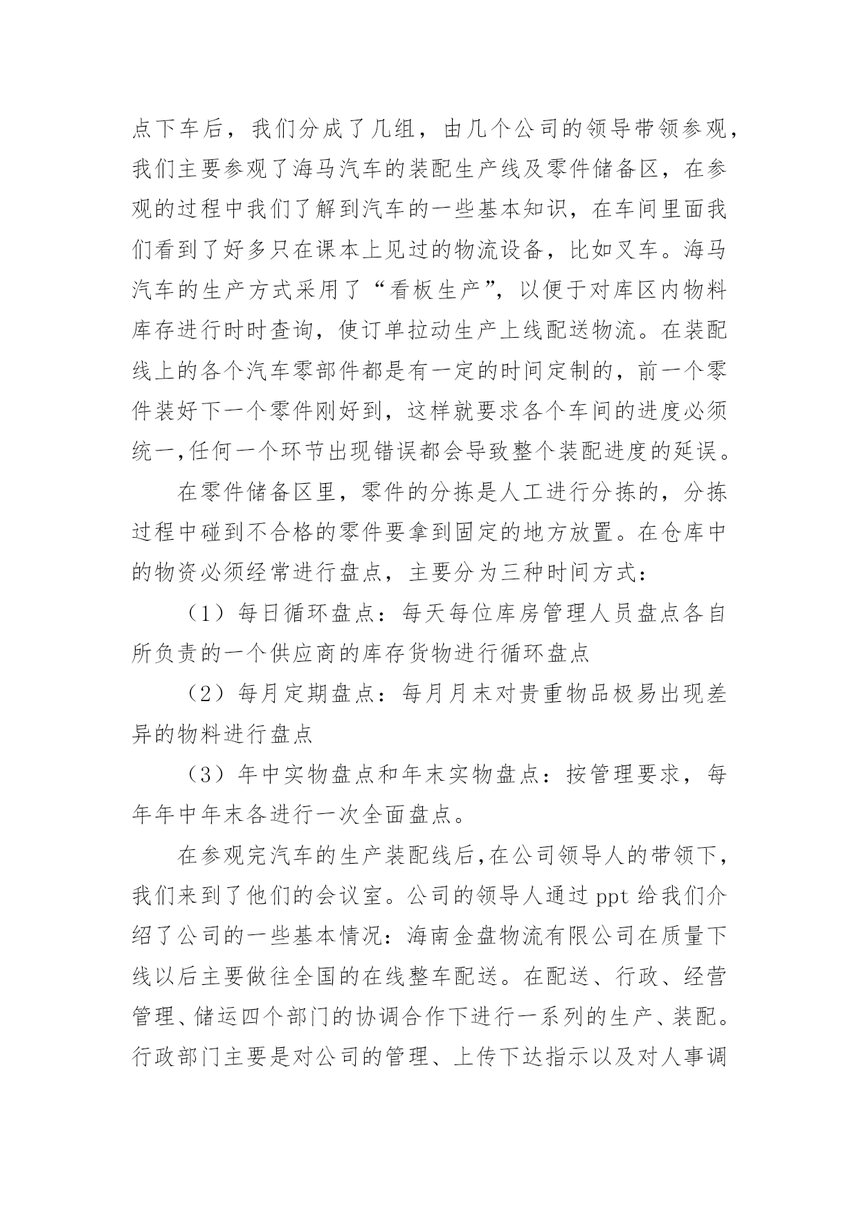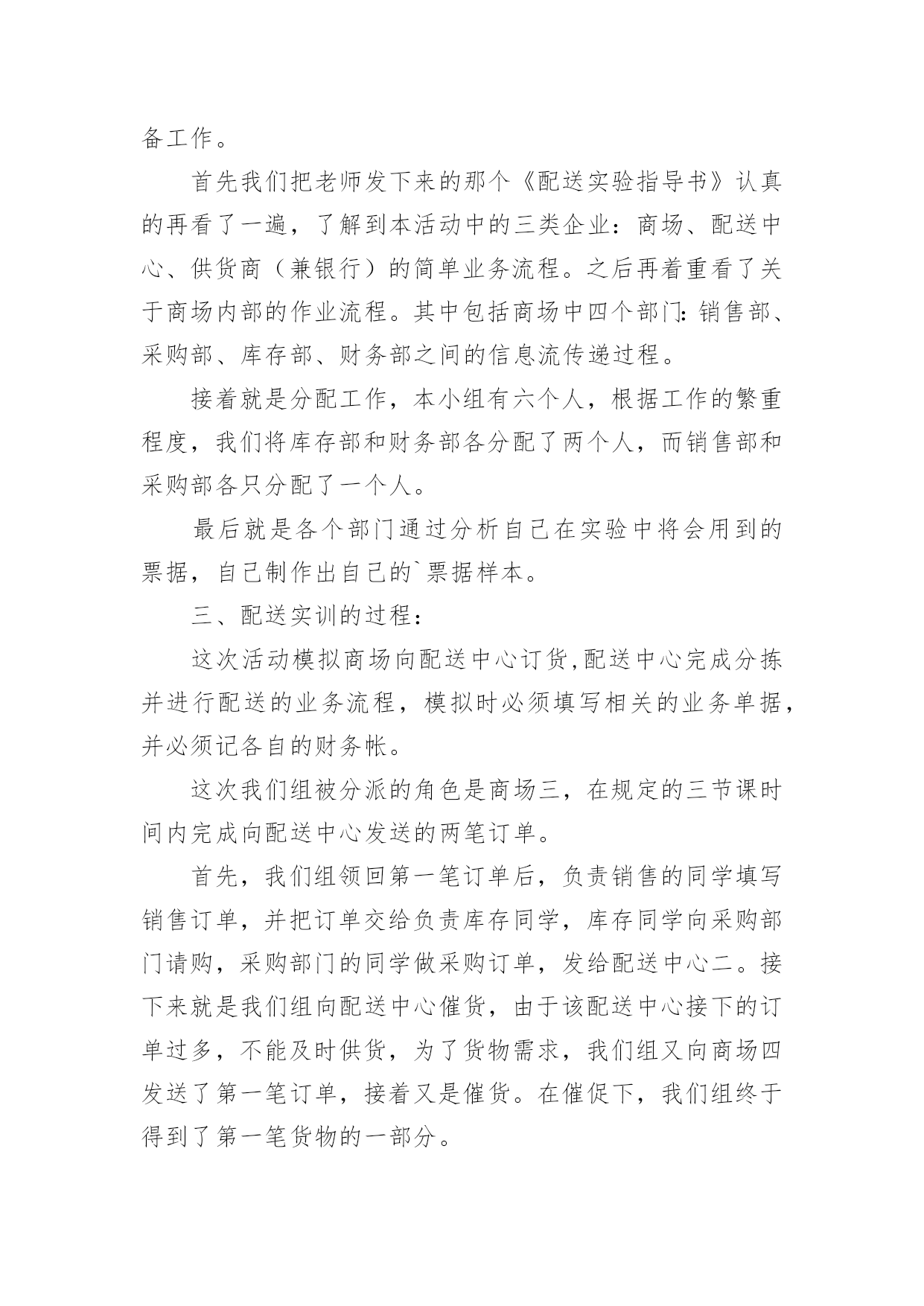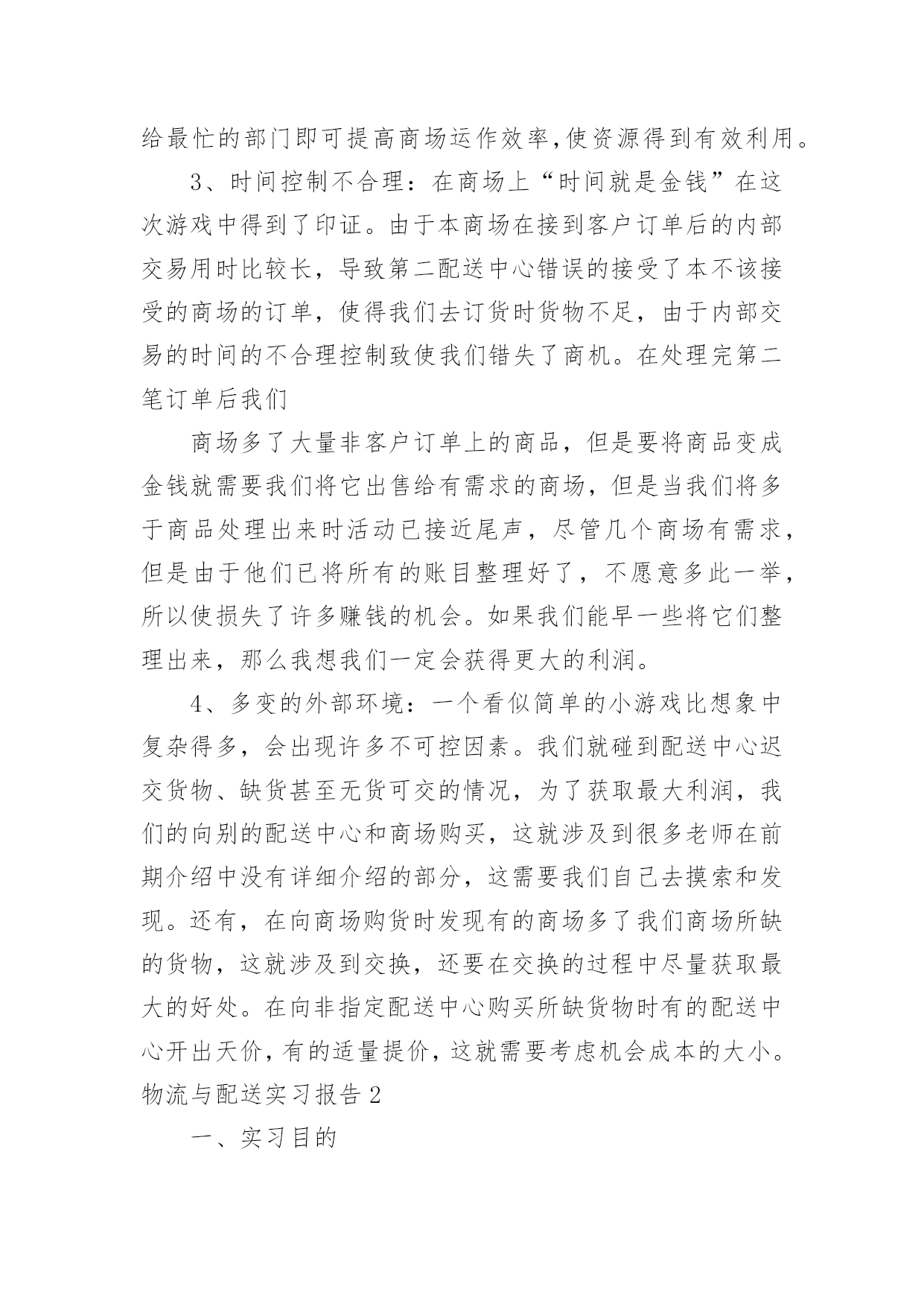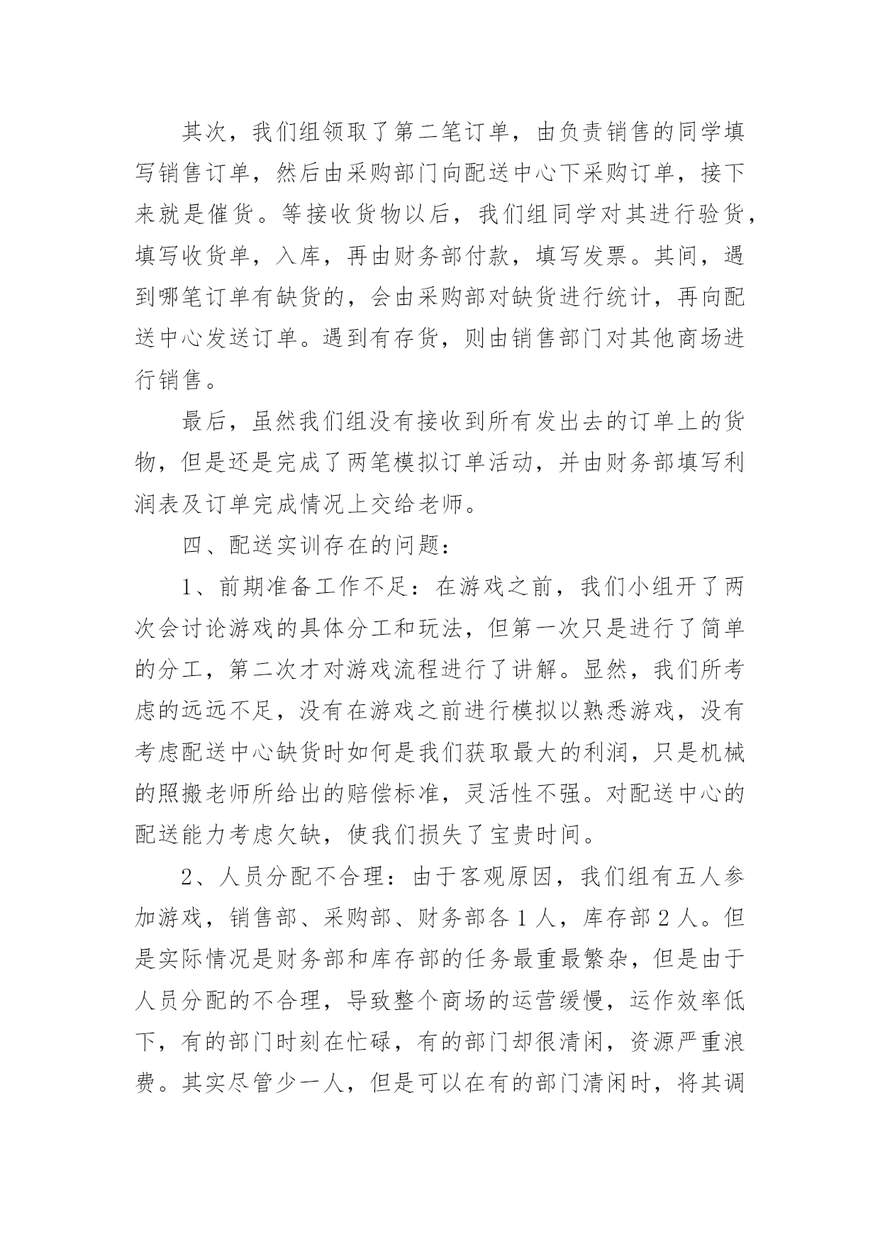 物流与配送实习报告物流与配送实习报告我们眼下的社会,报告与我们的生活紧密相连,我们在写报告的时候要注意涵盖报告的基本要素。写起报告来就毫无头绪?下面是小编整理的物流与配送实习报告,希望对大家有所帮助。物流与配送实习报告1一、配送实训目的和意义:1、通过参加配送实验,可以将我们课本的东西得到落实,并且巩固我们学到的学科知识2、通过参加配送实验,使得同学了解配送中心的简单业务流程,各个部门之间的业务关系,对配送中心的物流、信息流、资金流的运作方式有感性认识。3、通过参加配送实验,可以使我们能够切身的了解到商场内部工作的一些操作流程。4、通过参加配送实验,可以锻炼我们对于突发事件的应对能力,更能够深切的体会到实际工作的艰辛。5、通过参加配送适应,不但可以增加课堂的趣味性,还可以调动同学们的学习热情,并且体会到学习的乐趣。二、配送实训的准备工作:在老师的任务公布下来后,我们就开始着手于实验的准备工作。首先我们把老师发下来的那个《配送实验指导书》认真的再看了一遍,了解到本活动中的三类企业:商场、配送中心、供货商(兼银行)的简单业务流程。之后再着重看了关于商场内部的作业流程。其中包括商场中四个部门:销售部、采购部、库存部、财务部之间的信息流传递过程。接着就是分配工作,本小组有六个人,根据工作的繁重程度,我们将库存部和财务部各分配了两个人,而销售部和采购部各只分配了一个人。最后就是各个部门通过分析自己在实验中将会用到的票据,自己制作出自己的`票据样本。三、配送实训的过程:这次活动模拟商场向配送中心订货,配送中心完成分拣并进行配送的业务流程,模拟时必须填写相关的业务单据,并必须记各自的财务帐。这次我们组被分派的角色是商场三,在规定的三节课时间内完成向配送中心发送的两笔订单。首先,我们组领回第一笔订单后,负责销售的同学填写销售订单,并把订单交给负责库存同学,库存同学向采购部门请购,采购部门的同学做采购订单,发给配送中心二。接下来就是我们组向配送中心催货,由于该配送中心接下的订单过多,不能及时供货,为了货物需求,我们组又向商场四发送了第一笔订单,接着又是催货。在催促下,我们组终于得到了第一笔货物的一部分。其次,我们组领取了第二笔订单,由负责销售的同学填写销售订单,然后由采购部门向配送中心下采购订单,接下来就是催货。等接收货物以后,我们组同学对其进行验货,填写收货单,入库,再由财务部付款,填写发票。其间,遇到哪笔订单有缺货的,会由采购部对缺货进行统计,再向配送中心发送订单。遇到有存货,则由销售部门对其他商场进行销售。最后,虽然我们组没有接收到所有发出去的订单上的货物,但是还是完成了两笔模拟订单活动,并由财务部填写利润表及订单完成情况上交给老师。四、配送实训存在的问题:1、前期准备工作不足:在游戏之前,我们小组开了两次会讨论游戏的具体分工和玩法,但第一次只是进行了简单的分工,第二次才对游戏流程进行了讲解。显然,我们所考虑的远远不足,没有在游戏之前进行模拟以熟悉游戏,没有考虑配送中心缺货时如何是我们获取最大的利润,只是机械的照搬老师所给出的赔偿标准,灵活性不强。对配送中心的配送能力考虑欠缺,使我们损失了宝贵时间。2、人员分配不合理:由于客观原因,我们组有五人参加游戏,销售部、采购部、财务部各1人,库存部2人。但是实际情况是财务部和库存部的任务最重最繁杂,但是由于人员分配的不合理,导致整个商场的运营缓慢,运作效率低下,有的部门时刻在忙碌,有的部门却很清闲,资源严重浪费。其实尽管少一人,但是可以在有的部门清闲时,将其调给最忙的部门即可提高商场运作效率,使资源得到有效利用。3、时间控制不合理:在商场上“时间就是金钱”在这次游戏中得到了印证。由于本商场在接到客户订单后的内部交易用时比较长,导致第二配送中心错误的接受了本不该接受的商场的订单,使得我们去订货时货物不足,由于内部交易的时间的不合理控制致使我们错失了商机。在处理完第二笔订单后我们商场多了大量非客户订单上的商品,但是要将商品变成金钱就需要我们将它出售给有需求的商场,但是当我们将多于商品处理出来时活动已接近尾声,尽管几个商场有需求,但是由于他们已将所有的账目整理好了,不愿意多此一举,所以使损失了许多赚钱的机会。如果我们能早一些将它们整理出来,那么我想我们一定会获得更大的利润。4、多变的外部环境:一个看似简单的小游戏比想象中复杂得多,会出现许多不可控因素。我们就碰到配送中心迟交货物、缺货甚至无货可交的情况,为了获取最大利润,我们的向别的配送中心和商场购买,这就涉及到很多老师在前期介绍中没有详细介绍的部分,这需要我们自己去摸索和发现。还有,在向商场购货时发现有的商场多了我们商场所缺的货物,这就涉及到交换,还要在交换的过程中尽量获取最大的好处。在向非指定配送中心购买所缺货物时有的配送中心开出天价,有的适量提