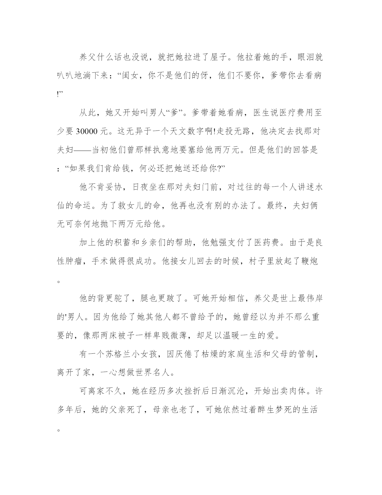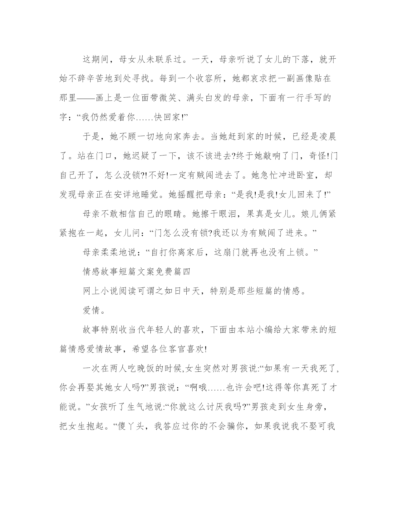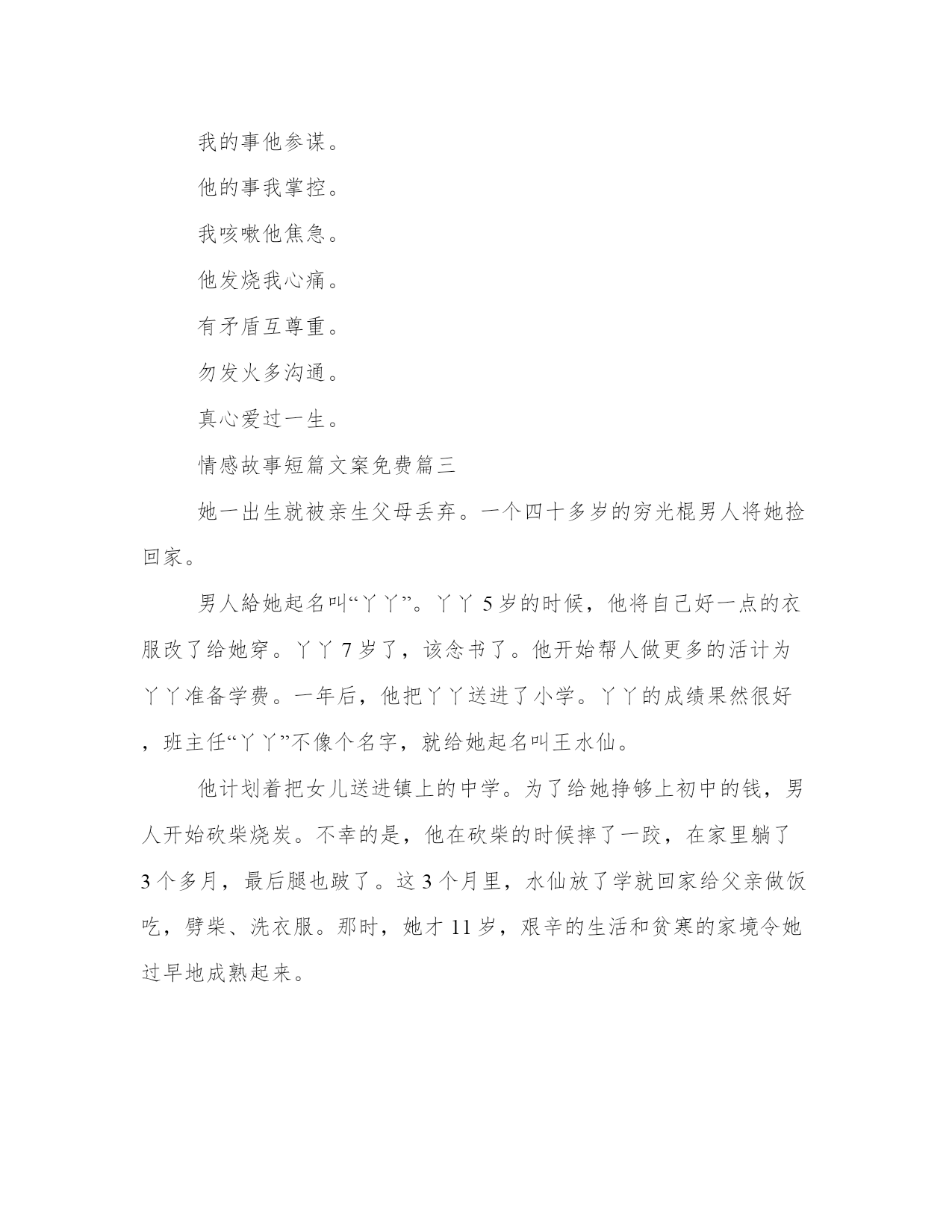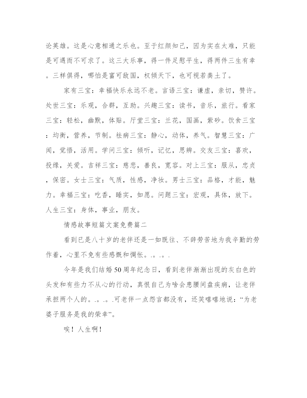 情感故事短篇文案免费(精选15篇)范文为教学中作为模范的文章,也常常用来指写作的模板。常常用于文秘写作的参考,也可以作为演讲材料编写前的参考。相信许多人会觉得范文很难写?下面是小编为大家收集的优秀范文,供大家参考借鉴,希望可以帮助到有需要的朋友。情感故事短篇文案免费篇一只有自己善良,才能感知这个世界的善良,只有自己丰富,才能感知这个世界的丰富,只有自己高贵,才能感知这个世界的高贵。“生活”的真谛就是“改变”,如果事情无法改变,那就改变自己;如果无法说服他人,那就说服自己;如果好景总是等不来,那就自己主动过去。世界上沒有两片完全相同的叶子,凡是存在的皆是合理的,凡是合理的皆存在。人生最大的乐趣是探索与创造,最大的幸福是助人与献身,最大的财富是知识与时间,最大的苦恼是无知与空虚,最大的安慰是友谊与信任,最大的美德是纯洁与忠诚。人生关键的课题是选择,但人生最难的,却是要不停地选择。有时候刚完成一个选择,又得进行另一个选择。多一点快乐,少一点烦恼;累了就睡觉,醒了就微笑。生活是什么滋味,自己放调料;闲时歇歇别太累,注意开心笑一笑!星星多的地方,黑暗就少;笑容多的地方,烦恼就少;知己在的地方,寂寞就少;寂寞少的时候,心情就好;心情好的时候,一切自然就好!当我们舍弃过盛的欲望,拨开眼前重重迷雾,回到生活正常轨迹的时候,就会发现幸福花儿就在伸手可及的地方,随手一采就是一朵,深情一嗅,芬芳扑鼻。采得多了,心中便四季如春,花开不败。生活中没有旁观者的席位,我们总能找到自己的位置、自己的光源、自己的声音。幸福是什么,思想轻松,生活自在,家人安逸,朋友真诚,性情阳光,这就是我理解的幸福。有些事情需要无声无息地忘记,经过一次,就长一次智慧;有些苦痛和烦恼需要默默地去承受,历炼一次,丰富一次。当你不能够再拥有的时候,你唯一可以做的就是令自己不要忘记。以锻炼为本,学会健康;以修进为本,学会求知;以道德为本,学会做人;以适应为本,学会生存。每个人都有潜在的能量,只是很容易被习惯所掩盖,被时间所迷离,被惰性所消磨。窃以为,人生在世有三大乐事:一是夫唱妇随,老小和谐,同享天伦之乐;二是衣食无忧,广结善缘,无欲无求,顶天立地。此谓人生无憾之乐也;三是能得一二知己,对月临风,纵论古今,青梅煮酒论英雄。这是心意相通之乐也。至于红颜知己,因为实在太难,只能是可遇而不可求了。这三大乐事,得一件足慰平生,得两件三生有幸。三样俱得,哪怕是富可敌国,权倾天下,也可视若粪土了。家有三宝:幸福快乐永远不老。言语三宝:谦虚,亲切,赞许。处世三宝:乐观,合群,互助。兴趣三宝:读书,音乐,旅行。看家三宝:轻松,幽默,体贴。厅堂三宝:兰花,国画,紫砂。饮食三宝:均衡,营养,节制。祛病三宝:静心,动体,养气。智慧三宝:广闻,觉悟,活用。学问三宝:倾听,记忆,思辨。交友三宝:喜欢,投缘,关爱。吉祥三宝:慈悲,善良,宽容。对上三宝:服从,忠贞,保密。女士三宝:气质,性感,净妆。男士三宝:品格,才能,魅力。幸福三宝:吃香,睡实,如愿。问题三宝:宏观,具体,放下。人生三宝:身体,事业,朋友。情感故事短篇文案免费篇二看到已是八十岁的老伴还是一如既往、不辞劳苦地为我辛勤的劳作着,心里不免有些感慨和惆怅。.。.。.今年是我们结婚50周年纪念日,看到老伴渐渐出现的灰白色的头发和有些力不从心的行动,真恨自己为啥会患腰间盘疾病,让老伴承担两个人的。.。.。.可老伴一点怨言都没有,还笑嘻嘻地说:“为老婆子服务是我的荣幸”。唉!人生啊!很多人都羡慕我们这对天南地北{老伴是广东人,而我是辽宁大连人}的搭档怎么这么恩爱?北方和南方的生活习俗是截然不同的,是怎样相处的呢?其实很简单,那就是“包容、商量、敬重”六个字至始至终都贯穿在我们的生活中,比如在吃的方面,我爱吃生大蒜,但老伴闻到大蒜味就恶心呕吐,怎么办呢。我就尽量不吃生大蒜,我常常自己调侃自己“别人是胃溃疡而我是胃亏蒜”。.。.。.后来我们就泡糖醋蒜,老伴就喜欢吃了。不过当我生病不想吃饭的时候,老伴就会主动地为我拿来生大蒜泱求我吃点饭吧,看他那种筋鼻子夹眼又呲牙咧嘴的样子,真是令人哭笑不得啊。.。.。.老伴不仅是我的丈夫也是我的父亲、诤友、闺蜜。他对我的真诚、疼爱、关心是世界上无可挑剔的老伴。我从小就想“等我长大一定要找一个老实忠厚的人做我的丈夫,我也一定做一个贤惠、勤快、不让自己的丈夫有后顾之忧的人”,我们都做到了。所以我们很幸福。我们已步入金婚,时间的流逝让我们更加珍惜眼前的一切,更加疼爱、关心老夫老妻的一切的一切。.。.。.如果有人问我:“你一生最大的幸福是什吗?”的时候,我一定会毫不犹豫地回。答:“有一个好爸爸,有一个好老公!”,我在老公面前,总是一个长也长不大的要。百倍呵护、千倍关爱的小