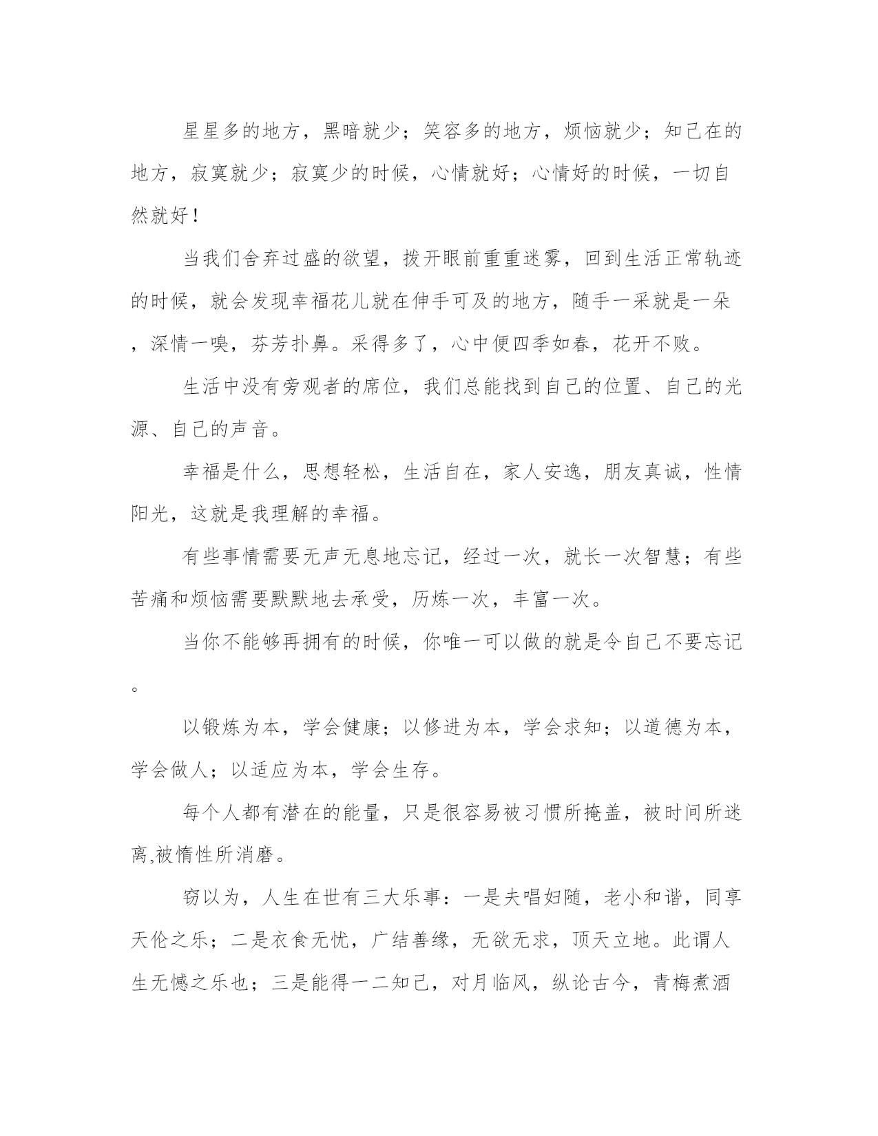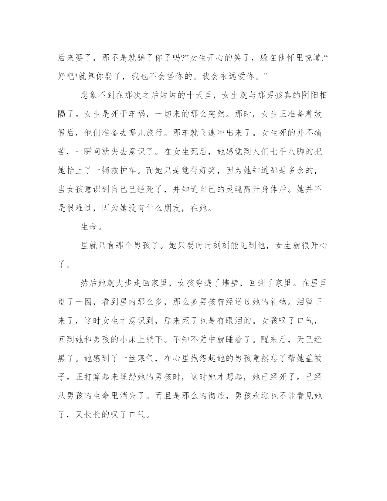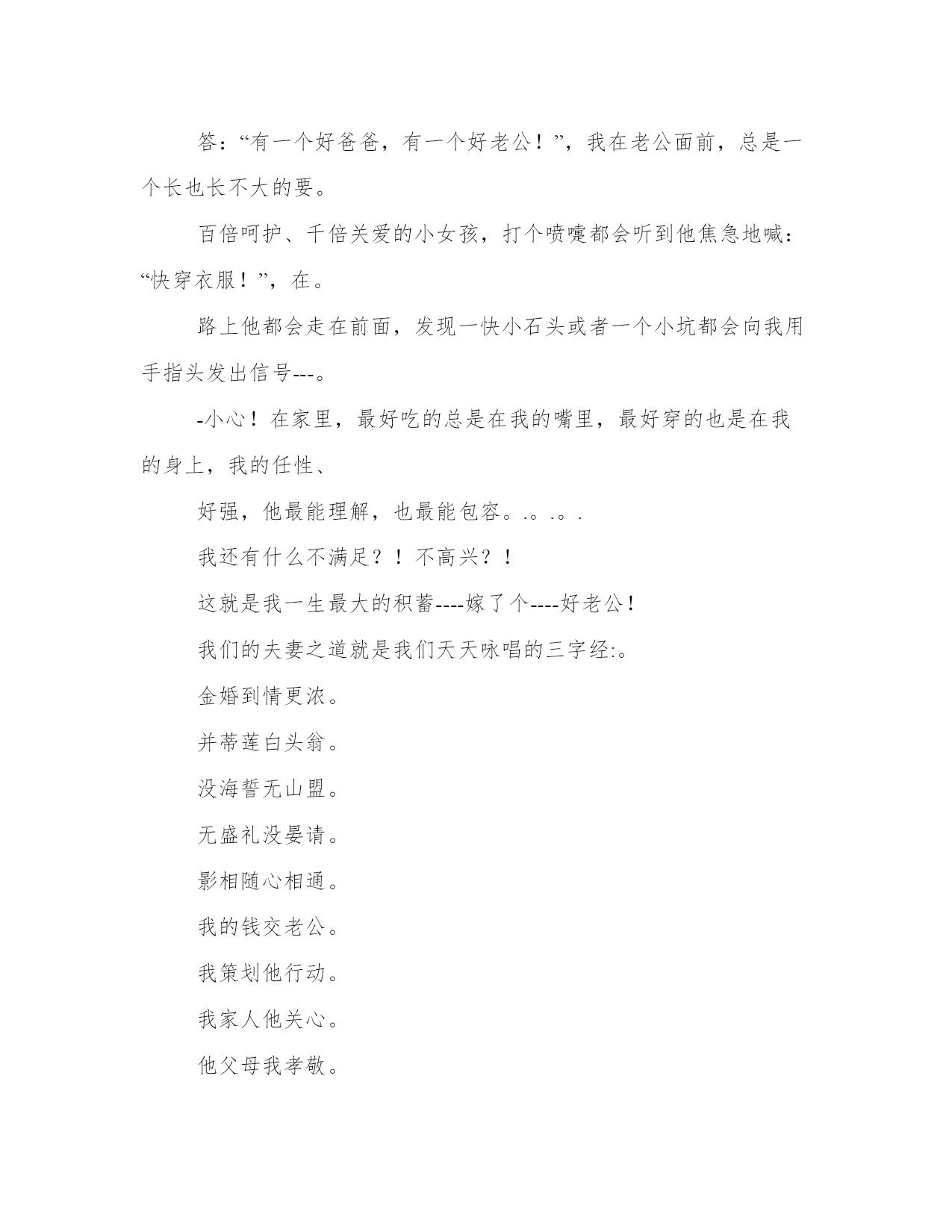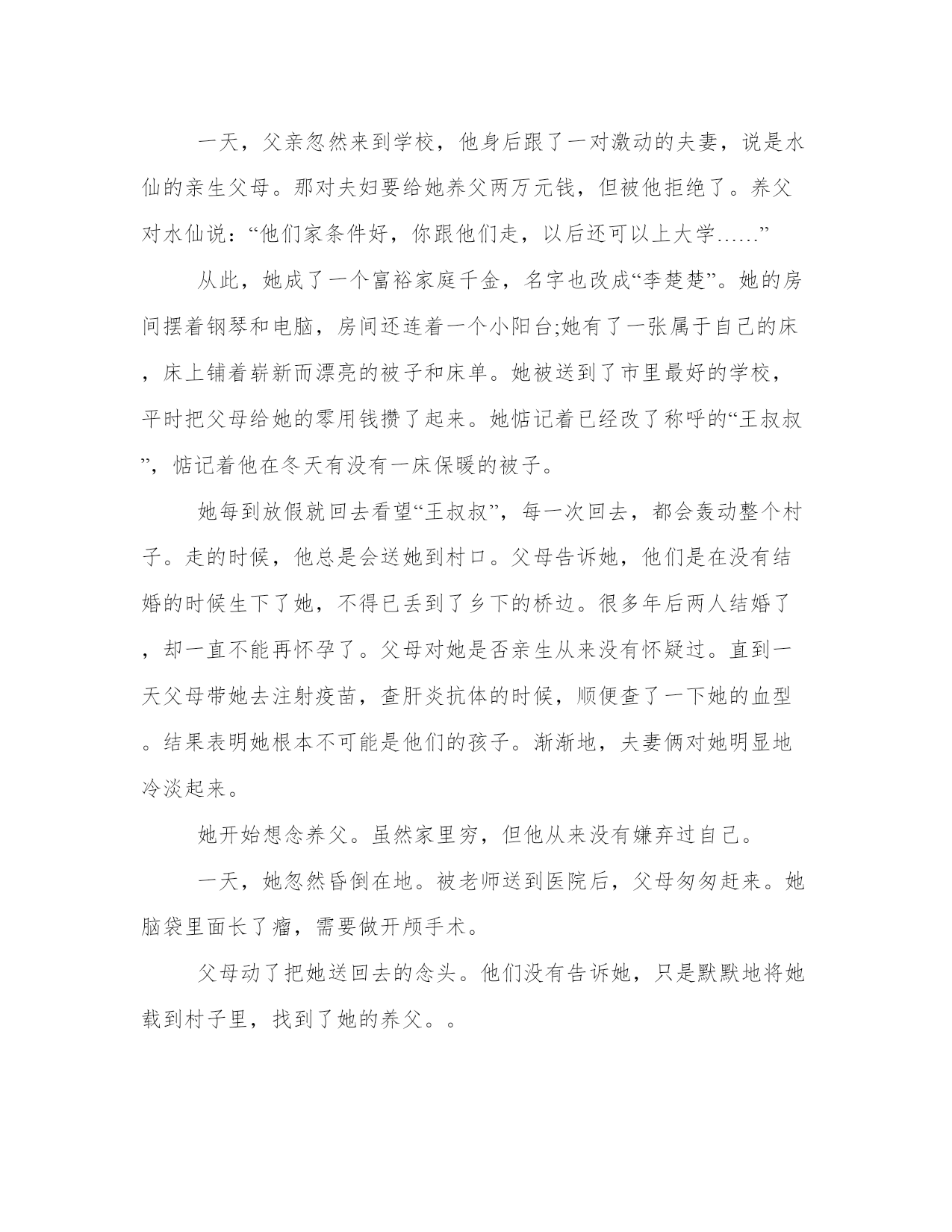 情感故事短篇文案免费(精选15篇)范文为教学中作为模范的文章,也常常用来指写作的模板。常常用于文秘写作的参考,也可以作为演讲材料编写前的参考。相信许多人会觉得范文很难写?下面是小编为大家收集的优秀范文,供大家参考借鉴,希望可以帮助到有需要的朋友。情感故事短篇文案免费篇一只有自己善良,才能感知这个世界的善良,只有自己丰富,才能感知这个世界的丰富,只有自己高贵,才能感知这个世界的高贵。“生活”的真谛就是“改变”,如果事情无法改变,那就改变自己;如果无法说服他人,那就说服自己;如果好景总是等不来,那就自己主动过去。世界上沒有两片完全相同的叶子,凡是存在的皆是合理的,凡是合理的皆存在。人生最大的乐趣是探索与创造,最大的幸福是助人与献身,最大的财富是知识与时间,最大的苦恼是无知与空虚,最大的安慰是友谊与信任,最大的美德是纯洁与忠诚。人生关键的课题是选择,但人生最难的,却是要不停地选择。有时候刚完成一个选择,又得进行另一个选择。多一点快乐,少一点烦恼;累了就睡觉,醒了就微笑。生活是什么滋味,自己放调料;闲时歇歇别太累,注意开心笑一笑!星星多的地方,黑暗就少;笑容多的地方,烦恼就少;知己在的地方,寂寞就少;寂寞少的时候,心情就好;心情好的时候,一切自然就好!当我们舍弃过盛的欲望,拨开眼前重重迷雾,回到生活正常轨迹的时候,就会发现幸福花儿就在伸手可及的地方,随手一采就是一朵,深情一嗅,芬芳扑鼻。采得多了,心中便四季如春,花开不败。生活中没有旁观者的席位,我们总能找到自己的位置、自己的光源、自己的声音。幸福是什么,思想轻松,生活自在,家人安逸,朋友真诚,性情阳光,这就是我理解的幸福。有些事情需要无声无息地忘记,经过一次,就长一次智慧;有些苦痛和烦恼需要默默地去承受,历炼一次,丰富一次。当你不能够再拥有的时候,你唯一可以做的就是令自己不要忘记。以锻炼为本,学会健康;以修进为本,学会求知;以道德为本,学会做人;以适应为本,学会生存。每个人都有潜在的能量,只是很容易被习惯所掩盖,被时间所迷离,被惰性所消磨。窃以为,人生在世有三大乐事:一是夫唱妇随,老小和谐,同享天伦之乐;二是衣食无忧,广结善缘,无欲无求,顶天立地。此谓人生无憾之乐也;三是能得一二知己,对月临风,纵论古今,青梅煮酒论英雄。这是心意相通之乐也。至于红颜知己,因为实在太难,只能是可遇而不可求了。这三大乐事,得一件足慰平生,得两件三生有幸。三样俱得,哪怕是富可敌国,权倾天下,也可视若粪土了。家有三宝:幸福快乐永远不老。言语三宝:谦虚,亲切,赞许。处世三宝:乐观,合群,互助。兴趣三宝:读书,音乐,旅行。看家三宝:轻松,幽默,体贴。厅堂三宝:兰花,国画,紫砂。饮食三宝:均衡,营养,节制。祛病三宝:静心,动体,养气。智慧三宝:广闻,觉悟,活用。学问三宝:倾听,记忆,思辨。交友三宝:喜欢,投缘,关爱。吉祥三宝:慈悲,善良,宽容。对上三宝:服从,忠贞,保密。女士三宝:气质,性感,净妆。男士三宝:品格,才能,魅力。幸福三宝:吃香,睡实,如愿。问题三宝:宏观,具体,放下。人生三宝:身体,事业,朋友。情感故事短篇文案免费篇二看到已是八十岁的老伴还是一如既往、不辞劳苦地为我辛勤的劳作着,心里不免有些感慨和惆怅。.。.。.今年是我们结婚50周年纪念日,看到老伴渐渐出现的灰白色的头发和有些力不从心的行动,真恨自己为啥会患腰间盘疾病,让老伴承担两个人的。.。.。.可老伴一点怨言都没有,还笑嘻嘻地说:“为老婆子服务是我的荣幸”。唉!人生啊!很多人都羡慕我们这对天南地北{老伴是广东人,而我是辽宁大连人}的搭档怎么这么恩爱?北方和南方的生活习俗是截然不同的,是怎样相处的呢?其实很简单,那就是“包容、商量、敬重”六个字至始至终都贯穿在我们的生活中,比如在吃的方面,我爱吃生大蒜,但老伴闻到大蒜味就恶心呕吐,怎么办呢。我就尽量不吃生大蒜,我常常自己调侃自己“别人是胃溃疡而我是胃亏蒜”。.。.。.后来我们就泡糖醋蒜,老伴就喜欢吃了。不过当我生病不想吃饭的时候,老伴就会主动地为我拿来生大蒜泱求我吃点饭吧,看他那种筋鼻子夹眼又呲牙咧嘴的样子,真是令人哭笑不得啊。.。.。.老伴不仅是我的丈夫也是我的父亲、诤友、闺蜜。他对我的真诚、疼爱、关心是世界上无可挑剔的老伴。我从小就想“等我长大一定要找一个老实忠厚的人做我的丈夫,我也一定做一个贤惠、勤快、不让自己的丈夫有后顾之忧的人”,我们都做到了。所以我们很幸福。我们已步入金婚,时间的流逝让我们更加珍惜眼前的一切,更加疼爱、关心老夫老妻的一切的一切。.。.。.如果有人问我:“你一生最大的幸福是什吗?”的时候,我一定会毫不犹豫地回。答:“有一个好爸爸,有一个好老公!”,我在老公面前,总是一个长也长不大的要。百倍呵护、千倍关爱的小