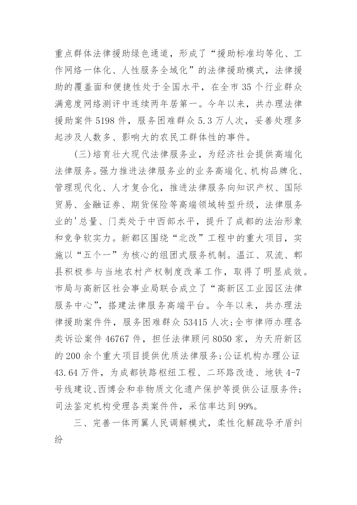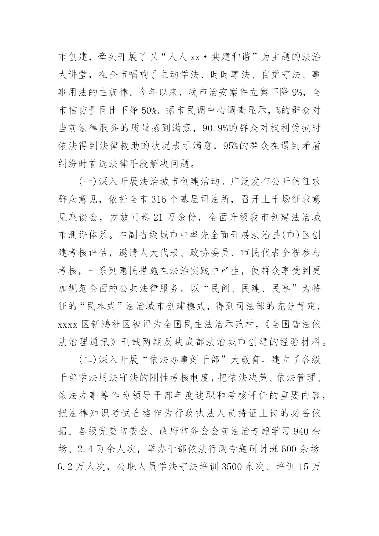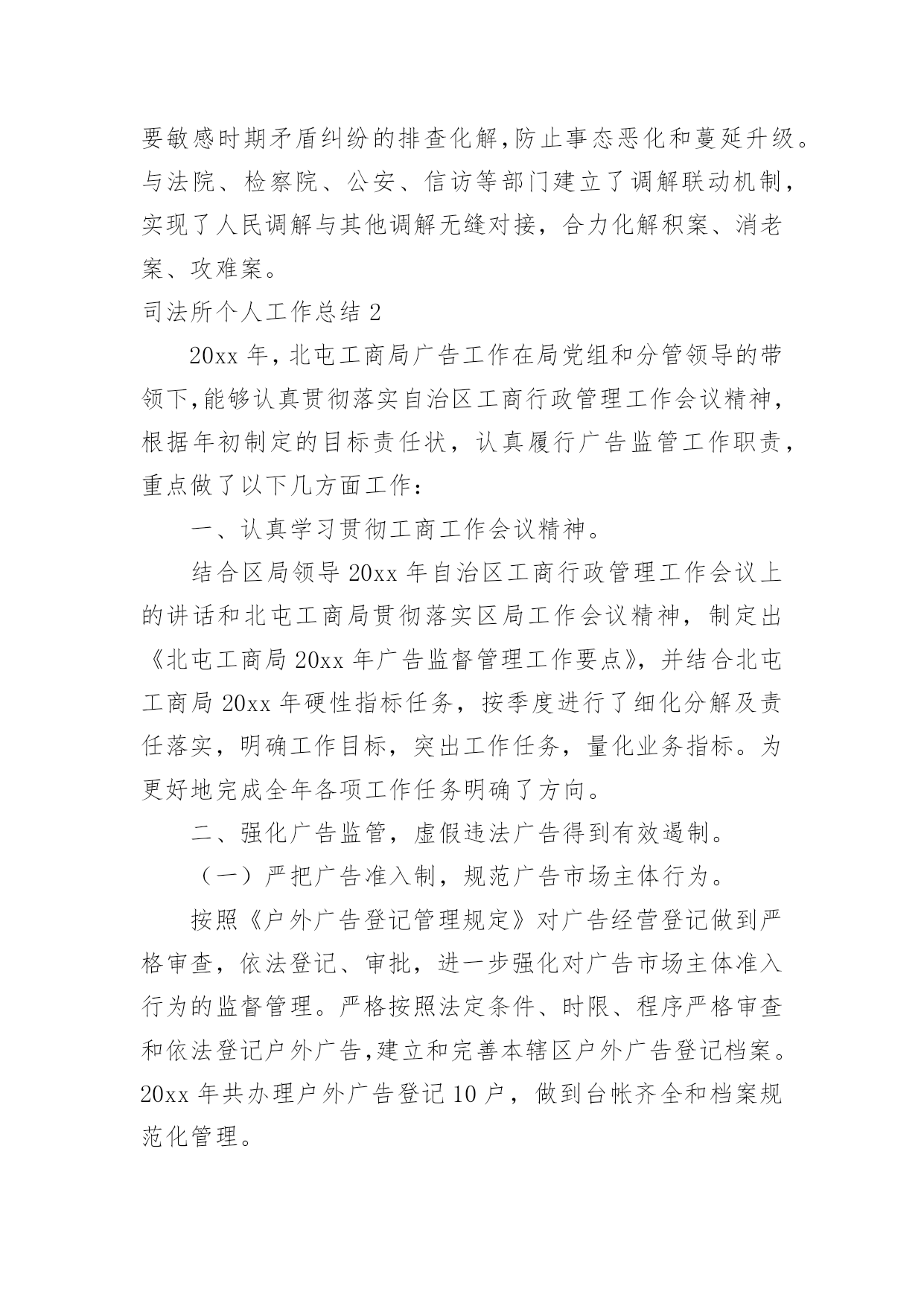 司法所个人工作总结司法所个人工作总结总结是在一段时间内对学习和工作生活等表现加以总结和概括的一种书面材料,它是增长才干的一种好办法,让我们抽出时间写写总结吧。我们该怎么写总结呢?以下是小编收集整理的司法所个人工作总结,仅供参考,大家一起来看看吧。司法所个人工作总结1xx年,市司法局按照市委、市政府总体部署,突出“法律服务促发展·法治文化润民心”工作主题,以打造中西部地区“法治环境、法律服务、法治文化最浓”的法治成都为奋斗目标,深入开展法治大讲堂,着力推进法律服务提档升级、矛盾纠纷预防化解和特殊人群管理服务,有力保障了“五大兴市战略”的有序有效推进,书记和司法部副部长两次批示给予肯定,人民日报、法制日报等多次报道成都的经验做法。一、法治大讲堂深入开展,法治城市创建走在全国前列以市委1号文件印发了市“六五”普法规划,发动全市人民参与制定了法治城市创建考核评估指标体系,法制宣传教育进入了法制化、常态化和刚性化的轨道20xx年司法工作总结工作总结。按照市委主要领导要求,结合全国法治城市创建,牵头开展了以“人人xx·共建和谐”为主题的法治大讲堂,在全市唱响了主动学法、时时尊法、自觉守法、事事用法的主旋律。今年以来,我市治安案件立案下降9%,全市信访量同比下降50%。据市民调中心调查显示,%的群众对当前法律服务的质量感到满意,90.9%的群众对权利受损时依法得到法律救助的状况表示满意,95%的群众在遇到矛盾纠纷时首选法律手段解决问题。(一)深入开展法治城市创建活动。广泛发布公开信征求群众意见,依托全市316个基层司法所,召开上千场征求意见座谈会,发放问卷21万余份,全面升级我市创建法治城市测评体系。在副省级城市中率先全面开展法治县(市)区创建考核评估,邀请人大代表、政协委员、市民代表全程参与考核,一系列惠民措施在法治实践中产生,使群众享受到更加规范全面的公共法律服务。以“民创、民建、民享”为特征的“民本式”法治城市创建模式,得到司法部的充分肯定,xxxx区新鸿社区被评为全国民主法治示范村,《全国普法依法治理通讯》刊载两期反映成都法治城市创建的经验材料。(二)深入开展“依法办事好干部”大教育。建立了各级干部学法用法守法的刚性考核制度,把依法决策、依法管理、依法办事等作为领导干部年度述职和考核评价的重要内容,把法律知识考试合格作为行政执法人员持证上岗的必备依据。各级党委常委会、政府常务会会前法治专题学习940余场、2.4万余人次,举办干部依法行政专题研讨班600余场6.2万人次,公职人员学法守法培训3500余次、培训15万余人次,提高各级干部运用法治思维和法治方式深化改革、推动发展、化解矛盾、维护稳定能力。切实加强基层干部法治教育培训,“两委”干部和议事会、监事会主任法制培训2240场7.8万人次,提高了基层干部自觉运用法律手段管理基层事务的能力,保障了基层民主在法治轨道中有序运行。(三)深入开展“文明守法好市民”大讨论。把群众作为法治大讲堂的推动主力、宣讲主角、受众主体,发动群众讲述法治故事、表演法治节目、调解矛盾纠纷,组织群众通过法治龙门阵、法治坝坝会等形式,广泛开展“我爱我家·依法自治”等专题讨论,形成人人来、人人来传法、人人来说法的新格局20xx年司法工作总结20xx年司法工作总结。围绕文明交通、城乡环境综合治理等热点开展专项法制宣传教育10.3万场366.4万人次,开展“市民旁听庭审”9.2万余次,在金沙讲坛开展法治专题讲座56次,在电视台、广播电台开设普法专题节目742期,成都日报刊载法治成都专刊50期,提高了群众的法律知识水平。举办了首届“我最喜爱的普法员”和“诚信守法先进企业”评选活动,营造了学法守法光荣的良好氛围。(四)深入开展“法治文化聚民心”大行动。坚持多用视频少用板报、多讲故事少xx条、多发用品少发资料,打造群众看得见、听得懂、摸得着的法治文化传播载体,切实发挥法治文化引导社会思潮、凝聚社会共识的积极作用。开辟各类媒体普法专栏,xx县在公众信息网上开辟全民法制教育专栏,xxxx区在《今日武侯》报上开设“法治在线”和“法治大讲堂”专栏。组建群众性法治文艺团队20xx个,自编法治文艺节目xx个,举行群众性法治文艺活动6000多次,惠及106万余人次,举办了首届全市法治书画大赛,在寓教于乐中传播法治文化。投放法治公益广告9.6万个(次),发送法治短信(彩信)2.4万条229万人次,发放法治文化用品30万余个,建成法治文化广场、公园、走廊万平方米,使群众在潜移默化中感受法治文化熏陶。(五)深入开展“送法惠民进万家”大走访。把送法惠民列入市委市政府十大民生工程的内容,组织开展了“走基层进万家·法治成都惠民行”活动,形成了各级各部门上门xx、以案释法、包村援法的能动型普法模式。组建了1760多人的普法讲师团和送法小分队,培育兼