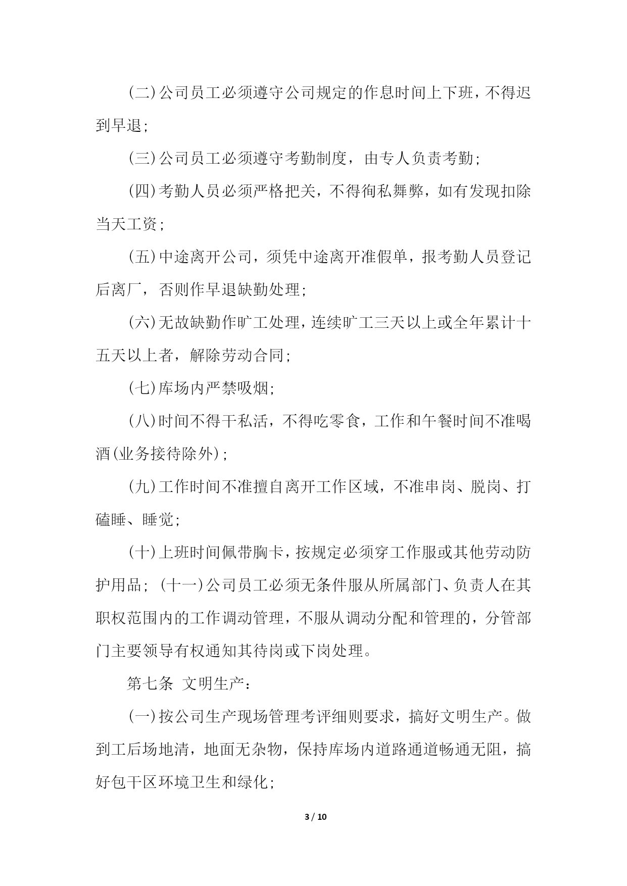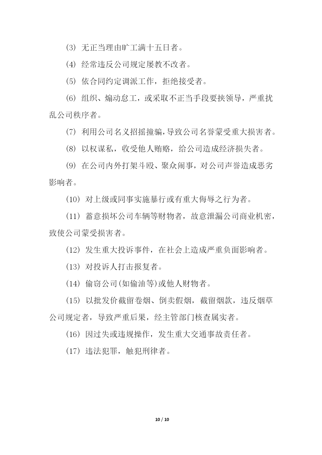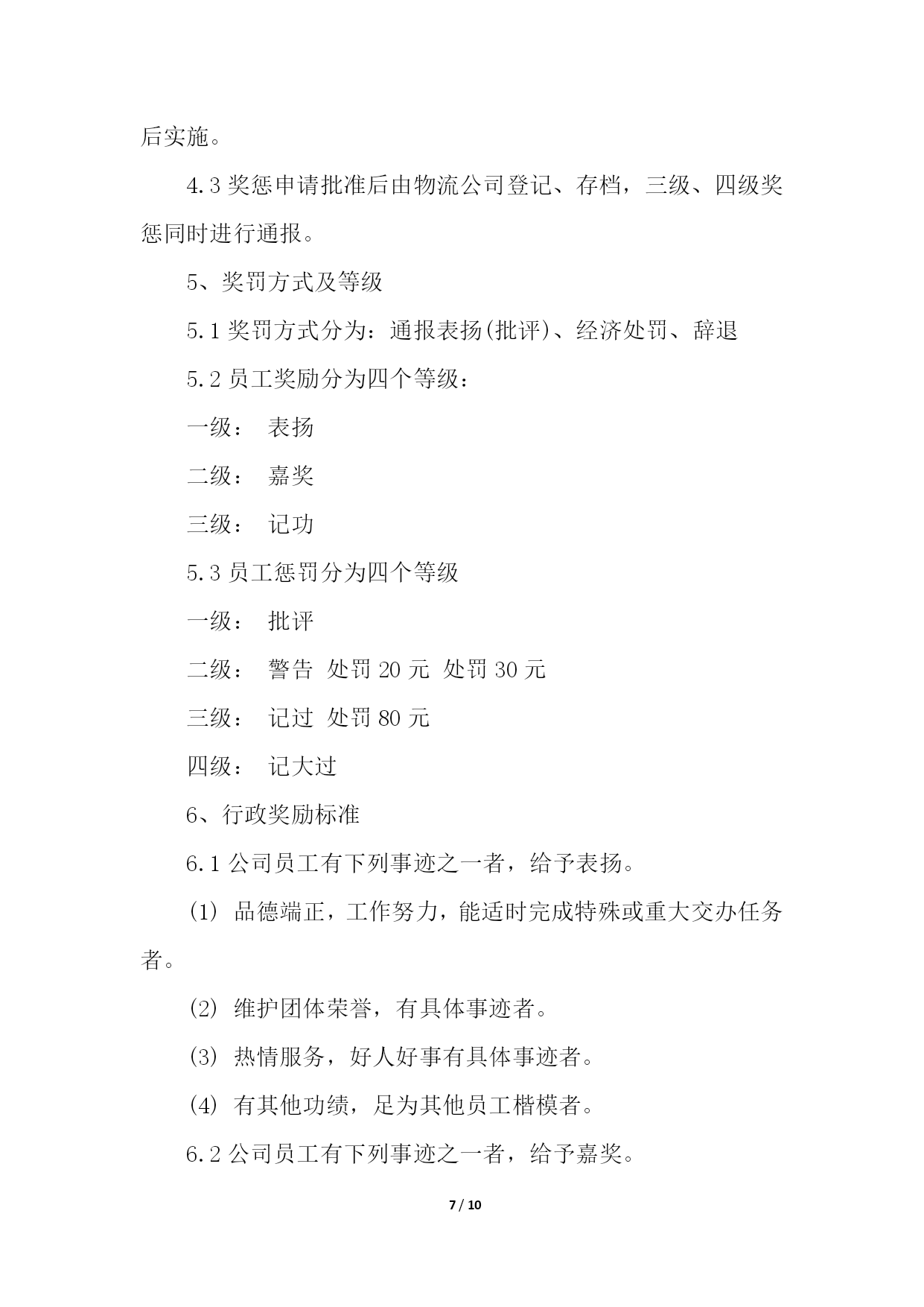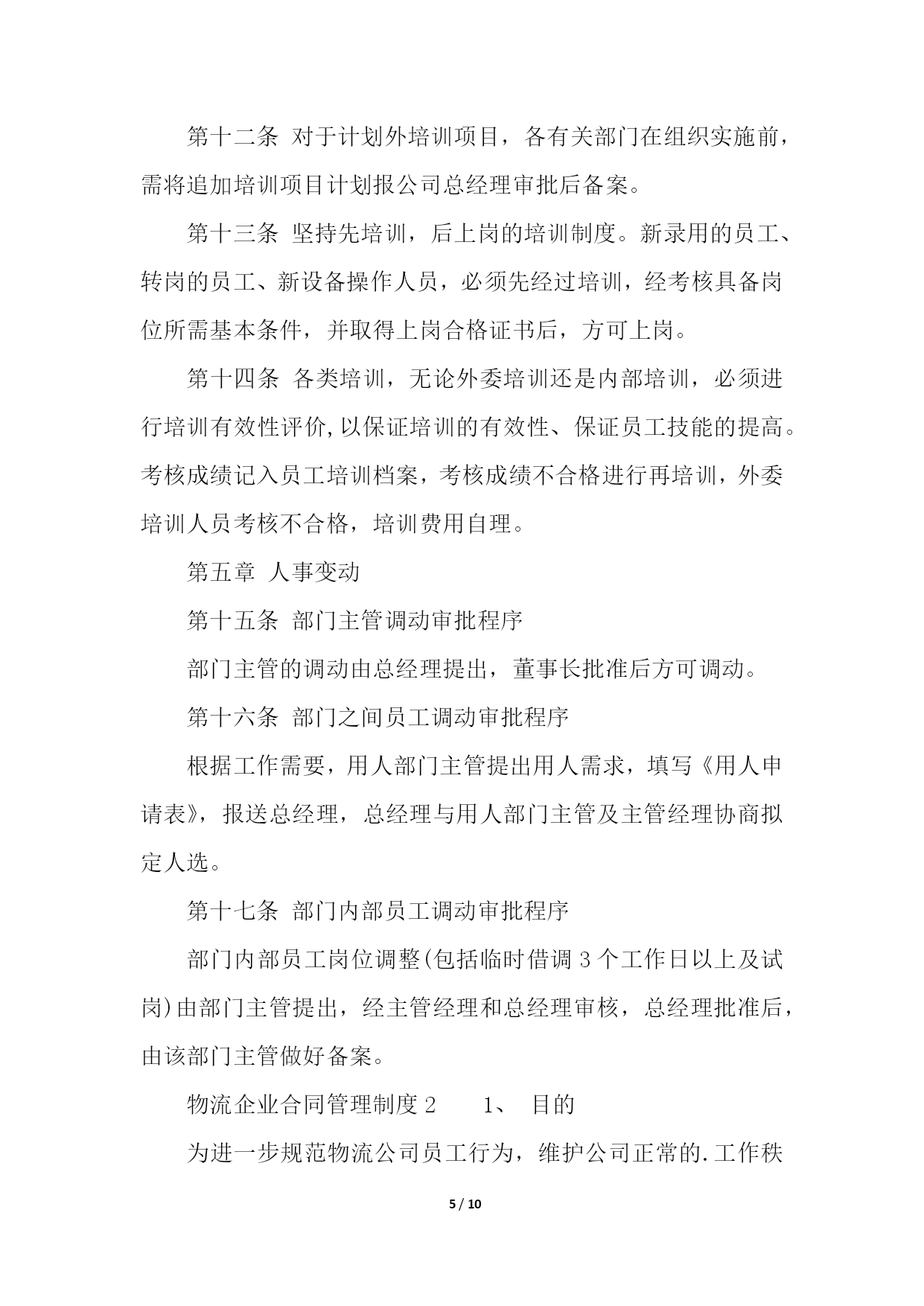 PAGE10/NUMPAGES10物流企业合同管理制度物流企业合同管理制度1第一章总则第一条为树立公司整体形象,加强和规范企业管理行为,造就和培养一支纪律严明、素质过硬的员工队伍,促进企业持续、稳定、健康发展,依据国家有关规定,结合本公司实际,特制定本管理制度。第二条本规章制度包括行为规范、招聘、培训、奖惩、人事变动等一系列有关人事活动和程序。第二章行为规范第三条员工的权利;(一)享受法律赋予的公民权利;(二)享受公司规定的工资、福利等待遇的权利;(三)对违法乱纪的人或事进行制止和举报的权利。第四条员工的义务(一)自觉遵守国家法律、法规和公司的各项规章制度;(二)自觉地维护公司的形象、信誉和利益。遵守职业道德、爱岗敬业、忠诚企业形成相互尊重、互勉共进的良好氛围与企业同发展共命运;(三)自觉遵守保密规定,不准泄露公司的机密和公司的信息;(四)以公司利益为重,办任何事情,都要牢记章约,杜绝浪费;(五)员工之间应团结友爱、和睦相处、相互帮助、相互配合、求同存异、顾全大局,正确处理好集体与个人的关系。第五条请假:(一)事假、病假:员工因事请假,须事前向所在部门办理书面请假手续,一天以下(含一天)由部门批准;二天以上(含二天)由主管部门领导批准,报人力资源部备案。事假期间扣除本人工资、不得搞第二职业和损害公司的利益活动,一经发现均作旷工处理或解除劳动合同。(二)员工因病不能上班,应及时通知公司,二天以下(含二天)由部门批准;三天以上(含三天)由主管部门领导核准,并做好备案。上班后应出示医院证明,连续病假超过三个月以上,依据《劳动合同法》第四章、四十条、第一款规定办理。员工病假期间,不得搞第二职业和损害公司的利益活动,一经发现,均作旷工处理或解除劳动合同;(三)工伤假:因公致伤、致残者,凭医院证明消假。员工工伤,须经所在部门证明,公司安全生产领导小组调查核实,方可作工伤处理,并逐级填写工伤事故报告单及证明,工伤期间发给本人与公司签订的劳动合同的工资。工伤疗养期间,不得从事第二职业,一经发现取消工伤待遇。第六条劳动纪律:(一)公司执行每周四十小时工作制,日工作时间为八小时;(二)公司员工必须遵守公司规定的作息时间上下班,不得迟到早退;(三)公司员工必须遵守考勤制度,由专人负责考勤;(四)考勤人员必须严格把关,不得徇私舞弊,如有发现扣除当天工资;(五)中途离开公司,须凭中途离开准假单,报考勤人员登记后离厂,否则作早退缺勤处理;(六)无故缺勤作旷工处理,连续旷工三天以上或全年累计十五天以上者,解除劳动合同;(七)库场内严禁吸烟;(八)时间不得干私活,不得吃零食,工作和午餐时间不准喝酒(业务接待除外);(九)工作时间不准擅自离开工作区域,不准串岗、脱岗、打磕睡、睡觉;(十)上班时间佩带胸卡,按规定必须穿工作服或其他劳动防护用品;(十一)公司员工必须无条件服从所属部门、负责人在其职权范围内的工作调动管理,不服从调动分配和管理的,分管部门主要领导有权通知其待岗或下岗处理。第七条文明生产:(一)按公司生产现场管理考评细则要求,搞好文明生产。做到工后场地清,地面无杂物,保持库场内道路通道畅通无阻,搞好包干区环境卫生和绿化;(二)爱护公司财物,不准任意将公司的财物占为已有,严禁偷盗、有意损坏和浪费公司财物;(三)员工之间要团结友爱、相互尊重、相互帮助、文明礼貌;(四)严格遵守劳动纪律、遵守职业道德;(五)严禁惹事生非,无理取闹,起哄,散布谣言、消极怠工,扰乱正常工作秩序,严禁在厂区内赌博、斗殴等违纪违法行为。第三章招聘第八条公司聘用人员,是公司根据生产、经营以及对相关专业人员的需要,而对外进行一种招聘的用工行为,聘用人员,应按聘用程序审核、审查、核定,合格后方可聘用。应办理求职登记手续,并交齐如下资料:1、身份证复印件;2、学历证明和职称证明;3、一寸免冠照。第四章培训第九条公司员工培训工作,由公司统一归口管理,各职能部门密切配合下进行。第十条根据企业生产、经营、管理的需要,提出主管专业技术、管理人员的培训计划和要求,报公司总经理审定后组织实施。第十一条各部门根据公司生产、经营、管理的需要,制定年度员工培训需求计划,并报公司总经理审批、备案。第十二条对于计划外培训项目,各有关部门在组织实施前,需将追加培训项目计划报公司总经理审批后备案。第十三条坚持先培训,后上岗的培训制度。新录用的员工、转岗的员工、新设备操作人员,必须先经过培训,经考核具备岗位所需基本条件,并取得上岗合格证书后,方可上岗。第十四条各类培训,无论外委培训还是内部培训,必须进行培训有效性评价,以保证培训的有效性、保证员工技能的提高。考核成绩记入员工培训档案,考核成绩不合格进行再培训,外委培训人员考核不合格,培训费用自理。第五章人事变动第十五条部门主管调动审批程序部门主管的调