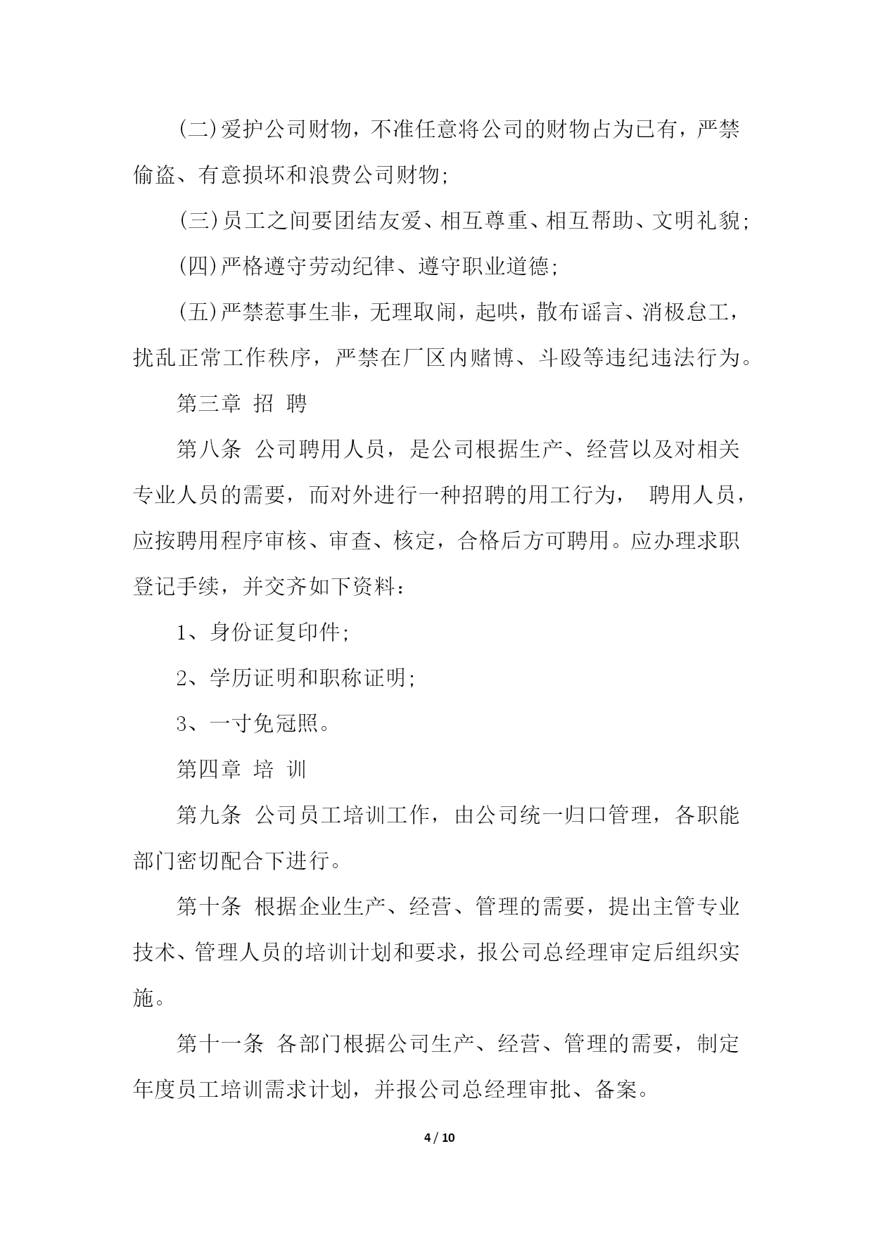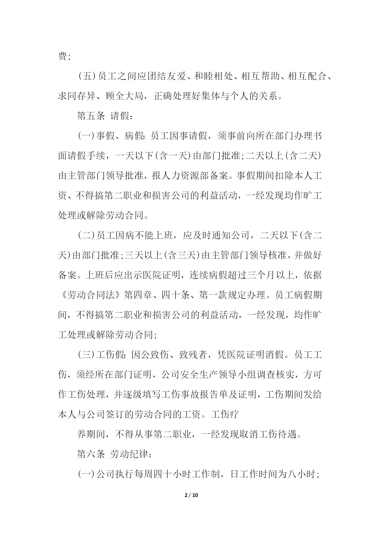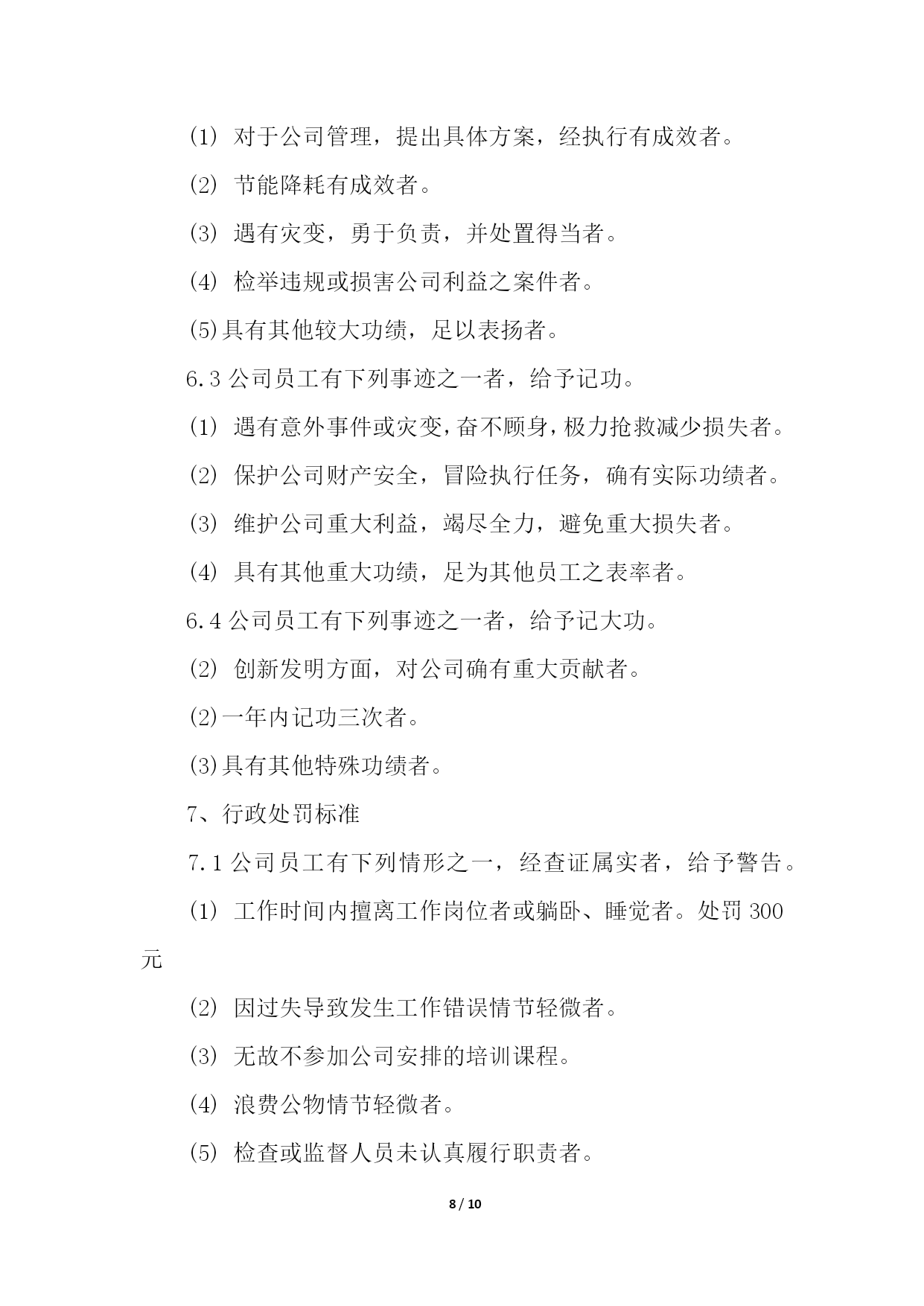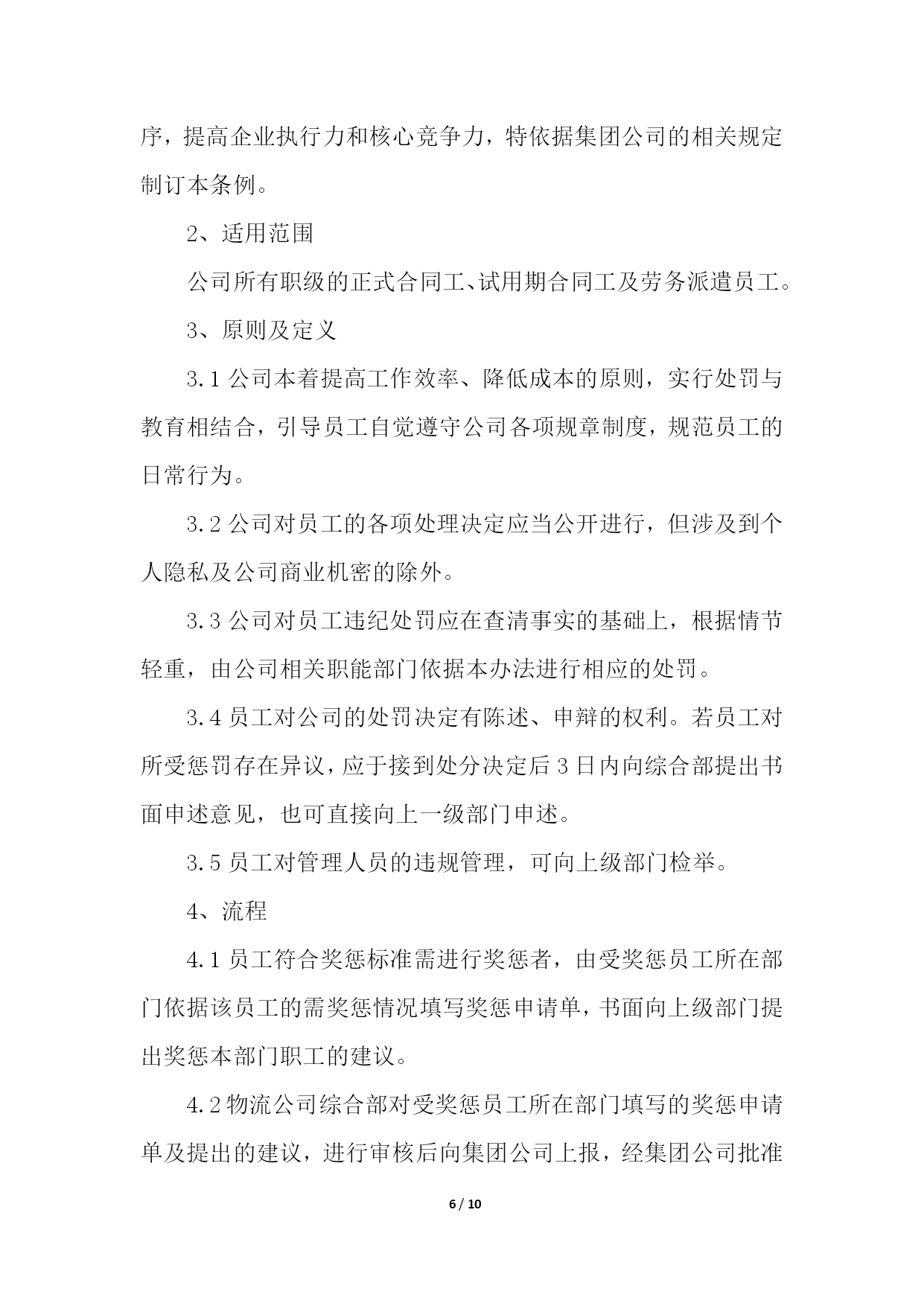 PAGE10/NUMPAGES10物流企业合同管理制度物流企业合同管理制度1第一章总则第一条为树立公司整体形象,加强和规范企业管理行为,造就和培养一支纪律严明、素质过硬的员工队伍,促进企业持续、稳定、健康发展,依据国家有关规定,结合本公司实际,特制定本管理制度。第二条本规章制度包括行为规范、招聘、培训、奖惩、人事变动等一系列有关人事活动和程序。第二章行为规范第三条员工的权利;(一)享受法律赋予的公民权利;(二)享受公司规定的工资、福利等待遇的权利;(三)对违法乱纪的人或事进行制止和举报的权利。第四条员工的义务(一)自觉遵守国家法律、法规和公司的各项规章制度;(二)自觉地维护公司的形象、信誉和利益。遵守职业道德、爱岗敬业、忠诚企业形成相互尊重、互勉共进的良好氛围与企业同发展共命运;(三)自觉遵守保密规定,不准泄露公司的机密和公司的信息;(四)以公司利益为重,办任何事情,都要牢记章约,杜绝浪费;(五)员工之间应团结友爱、和睦相处、相互帮助、相互配合、求同存异、顾全大局,正确处理好集体与个人的关系。第五条请假:(一)事假、病假:员工因事请假,须事前向所在部门办理书面请假手续,一天以下(含一天)由部门批准;二天以上(含二天)由主管部门领导批准,报人力资源部备案。事假期间扣除本人工资、不得搞第二职业和损害公司的利益活动,一经发现均作旷工处理或解除劳动合同。(二)员工因病不能上班,应及时通知公司,二天以下(含二天)由部门批准;三天以上(含三天)由主管部门领导核准,并做好备案。上班后应出示医院证明,连续病假超过三个月以上,依据《劳动合同法》第四章、四十条、第一款规定办理。员工病假期间,不得搞第二职业和损害公司的利益活动,一经发现,均作旷工处理或解除劳动合同;(三)工伤假:因公致伤、致残者,凭医院证明消假。员工工伤,须经所在部门证明,公司安全生产领导小组调查核实,方可作工伤处理,并逐级填写工伤事故报告单及证明,工伤期间发给本人与公司签订的劳动合同的工资。工伤疗养期间,不得从事第二职业,一经发现取消工伤待遇。第六条劳动纪律:(一)公司执行每周四十小时工作制,日工作时间为八小时;(二)公司员工必须遵守公司规定的作息时间上下班,不得迟到早退;(三)公司员工必须遵守考勤制度,由专人负责考勤;(四)考勤人员必须严格把关,不得徇私舞弊,如有发现扣除当天工资;(五)中途离开公司,须凭中途离开准假单,报考勤人员登记后离厂,否则作早退缺勤处理;(六)无故缺勤作旷工处理,连续旷工三天以上或全年累计十五天以上者,解除劳动合同;(七)库场内严禁吸烟;(八)时间不得干私活,不得吃零食,工作和午餐时间不准喝酒(业务接待除外);(九)工作时间不准擅自离开工作区域,不准串岗、脱岗、打磕睡、睡觉;(十)上班时间佩带胸卡,按规定必须穿工作服或其他劳动防护用品;(十一)公司员工必须无条件服从所属部门、负责人在其职权范围内的工作调动管理,不服从调动分配和管理的,分管部门主要领导有权通知其待岗或下岗处理。第七条文明生产:(一)按公司生产现场管理考评细则要求,搞好文明生产。做到工后场地清,地面无杂物,保持库场内道路通道畅通无阻,搞好包干区环境卫生和绿化;(二)爱护公司财物,不准任意将公司的财物占为已有,严禁偷盗、有意损坏和浪费公司财物;(三)员工之间要团结友爱、相互尊重、相互帮助、文明礼貌;(四)严格遵守劳动纪律、遵守职业道德;(五)严禁惹事生非,无理取闹,起哄,散布谣言、消极怠工,扰乱正常工作秩序,严禁在厂区内赌博、斗殴等违纪违法行为。第三章招聘第八条公司聘用人员,是公司根据生产、经营以及对相关专业人员的需要,而对外进行一种招聘的用工行为,聘用人员,应按聘用程序审核、审查、核定,合格后方可聘用。应办理求职登记手续,并交齐如下资料:1、身份证复印件;2、学历证明和职称证明;3、一寸免冠照。第四章培训第九条公司员工培训工作,由公司统一归口管理,各职能部门密切配合下进行。第十条根据企业生产、经营、管理的需要,提出主管专业技术、管理人员的培训计划和要求,报公司总经理审定后组织实施。第十一条各部门根据公司生产、经营、管理的需要,制定年度员工培训需求计划,并报公司总经理审批、备案。第十二条对于计划外培训项目,各有关部门在组织实施前,需将追加培训项目计划报公司总经理审批后备案。第十三条坚持先培训,后上岗的培训制度。新录用的员工、转岗的员工、新设备操作人员,必须先经过培训,经考核具备岗位所需基本条件,并取得上岗合格证书后,方可上岗。第十四条各类培训,无论外委培训还是内部培训,必须进行培训有效性评价,以保证培训的有效性、保证员工技能的提高。考核成绩记入员工培训档案,考核成绩不合格进行再培训,外委培训人员考核不合格,培训费用自理。第五章人事变动第十五条部门主管调动审批程序部门主管的调