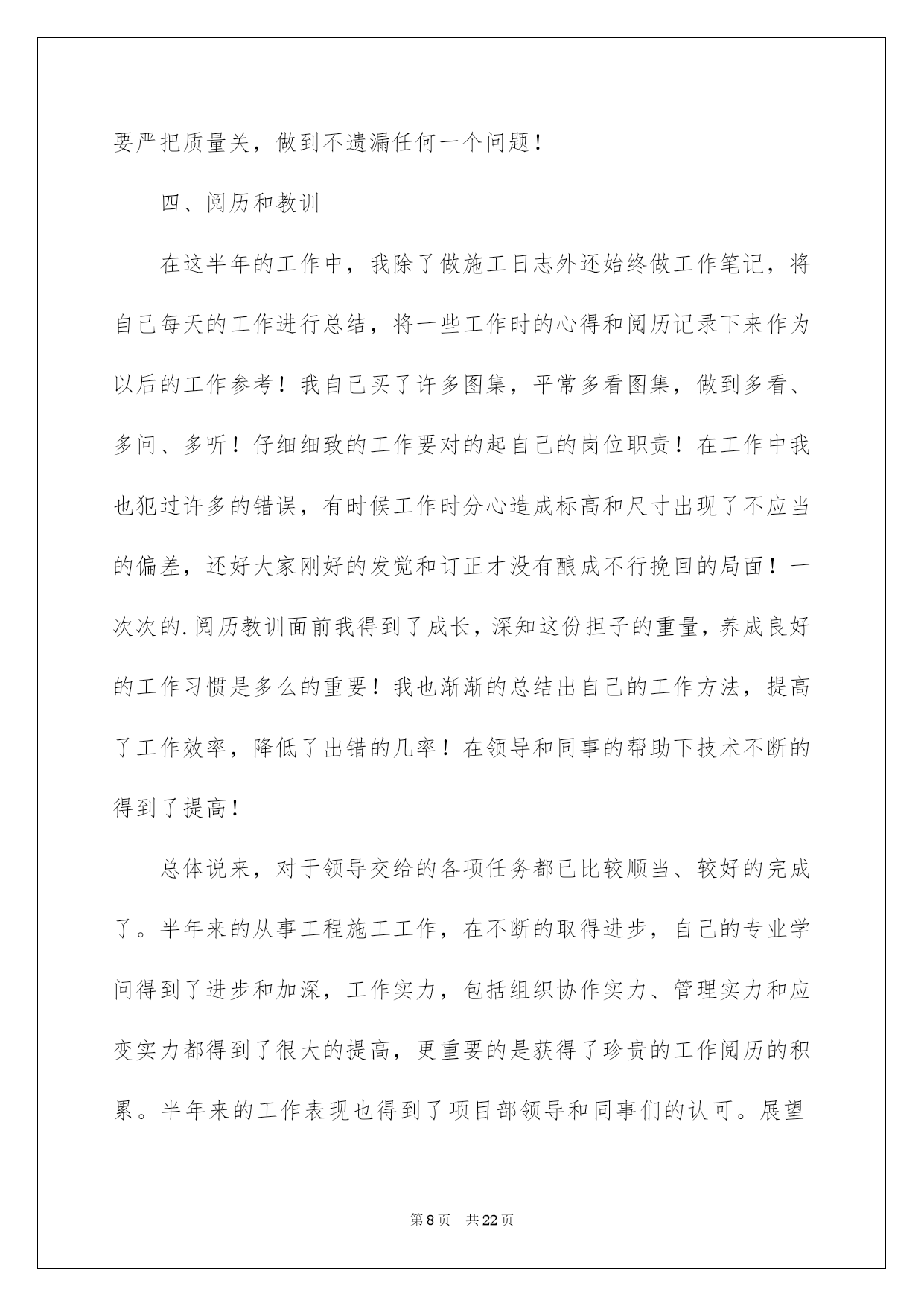 第PAGE\*Arabic\*MERGEFORMAT22页共NUMPAGES\*Arabic\*MERGEFORMAT22页第PAGE\*MERGEFORMAT22页共NUMPAGES\*MERGEFORMAT22页第PAGE\*MERGEFORMAT22页共NUMPAGES\*MERGEFORMAT22页第PAGE\*MERGEFORMAT22页共NUMPAGES\*MERGEFORMAT22页第PAGE\*MERGEFORMAT22页共NUMPAGES\*MERGEFORMAT22页第PAGE\*MERGEFORMAT22页共NUMPAGES\*MERGEFORMAT22页第PAGE\*MERGEFORMAT22页共NUMPAGES\*MERGEFORMAT22页第PAGE\*MERGEFORMAT22页共NUMPAGES\*MERGEFORMAT22页第PAGE\*MERGEFORMAT22页共NUMPAGES\*MERGEFORMAT22页第PAGE\*MERGEFORMAT22页共NUMPAGES\*MERGEFORMAT22页第PAGE\*MERGEFORMAT22页共NUMPAGES\*MERGEFORMAT22页2022土建技术员个人工作总结土建技术员个人工作总结总结是在某一时期、某一项目或某些工作告一段落或者全部完成后进行回顾检查、分析评价,从而得出教训和一些规律性相识的一种书面材料,写总结有利于我们学习和工作实力的提高,让我们一起来学习写总结吧。那么你真的懂得怎么写总结吗?以下是我帮大家整理的土建技术员个人工作总结,欢迎大家借鉴与参考,希望对大家有所帮助。土建技术员个人工作总结120xx年立刻过去了,太多纠结、太多苦痛、太多收获。假如你认为我立刻要阐述我过去一年如何纠结和苦痛的,那不用接着看了,请翻阅其他同事的总结吧。终归人总是要向着希望的方向看,过去的都是一段无法取代和抹去的经验,是每个人的一笔财宝,不管是好事,还是坏事,总会有收获。20xx年8月2号之前,我始终在xxxx项目,工程刚完工始终处于后期修理阶段。别瞧不起修理工作,许多人以为很悠闲,真正做了才知道,后期修理工作相较于正式工程有过之而无不及,它是对你和你的团队过去努力的一个总结,就像小时候考试交卷后老师公布答案并告知你什么地方错了一样。也是在这段时间里,我起先思索工作看法和回顾整个施工过程中的不足,这是今年我思索的第一件事。“出来混总是要还的”,不管做任何事,都要认仔细真做好每一步,肯定肯定要尽自己最大努力。20xx年8月2号之后,我来到新的城市、新项目,见到了许多新面孔,终归大家专业相同、年龄相仿立刻成了挚友。每个人都是一个故事,都有许多经验,有许多丰富的工作阅历,我可以像吸血鬼一样,不断在大家身上吸取我要的东西,那么贪欲。以前那个不参考别人,以自我为中心的想法消逝了。无论工作还是生活,参考不是复制,是一种进步,甚至是一种进化。就像物理学里的名词“参照物”,有了它你才能知道你什么地方不足,什么地方要做的更好,现在到了什么位置,你应当到什么位置。要想得到你没有得到过的东西,就要做你从没做过的事,不是吗?好了,说点将来吧,要充溢希望的展望一下那么遥远却站在你面前而你却感觉不到的将来。先说惊慌刺激的工作,把去年的懒散随着现场的静力压桩深深的埋在土里,用上百吨的压力死死的压下去,让它永世不得翻身,这辈子我再也不想见它。把对将来的迷茫和悲观随着地质勘钻机不停的洗出我的大脑,深深的从我大脑里抽离出去,随着地下水流向大海,和它的店员懒散一样再也不要回来,说再见的时候我手都不会挥一下。让执着、坚持、忍耐、敏捷像工程桩一样深深的刺入我的大脑和身体,刺进心里,一根接一根,恒久也不要拔出来。再难的路再困难的工作,爬也要爬完。最终说点生活作风问题吧。别想歪了,我作风很正的,在远处你甚至能看到我背后若隐若现淡淡的光环。我要说的是做一些想做但始终没做的事,例如乐观、例如攒钱、例如该长大该担当责任了。过去的一年确定了许多事,也做了许多事,但总有许多事情是要做也必需做的,终归去年没做今年给你个机会从新来过,为什么不把握呢。就像一个死刑犯立刻要行刑,突然说给你一次机会,无罪释放了。这就是我的感受,有种起死回生,有种对将来的希望。公司给了我学习机会,给了我看清自己的机会,给了我相识社会的机会。自己的快速成长和完善就意味着给公司带来更多效益,小小的一步或许作用不明显,但团队的进步就意味着整个公司在新的挑战面前充溢战斗力,让我们怀着激情和希望向将来努力。土建技术员个人工作总结2自XX年6月来到xx项目部参与工作,至今已一年有余