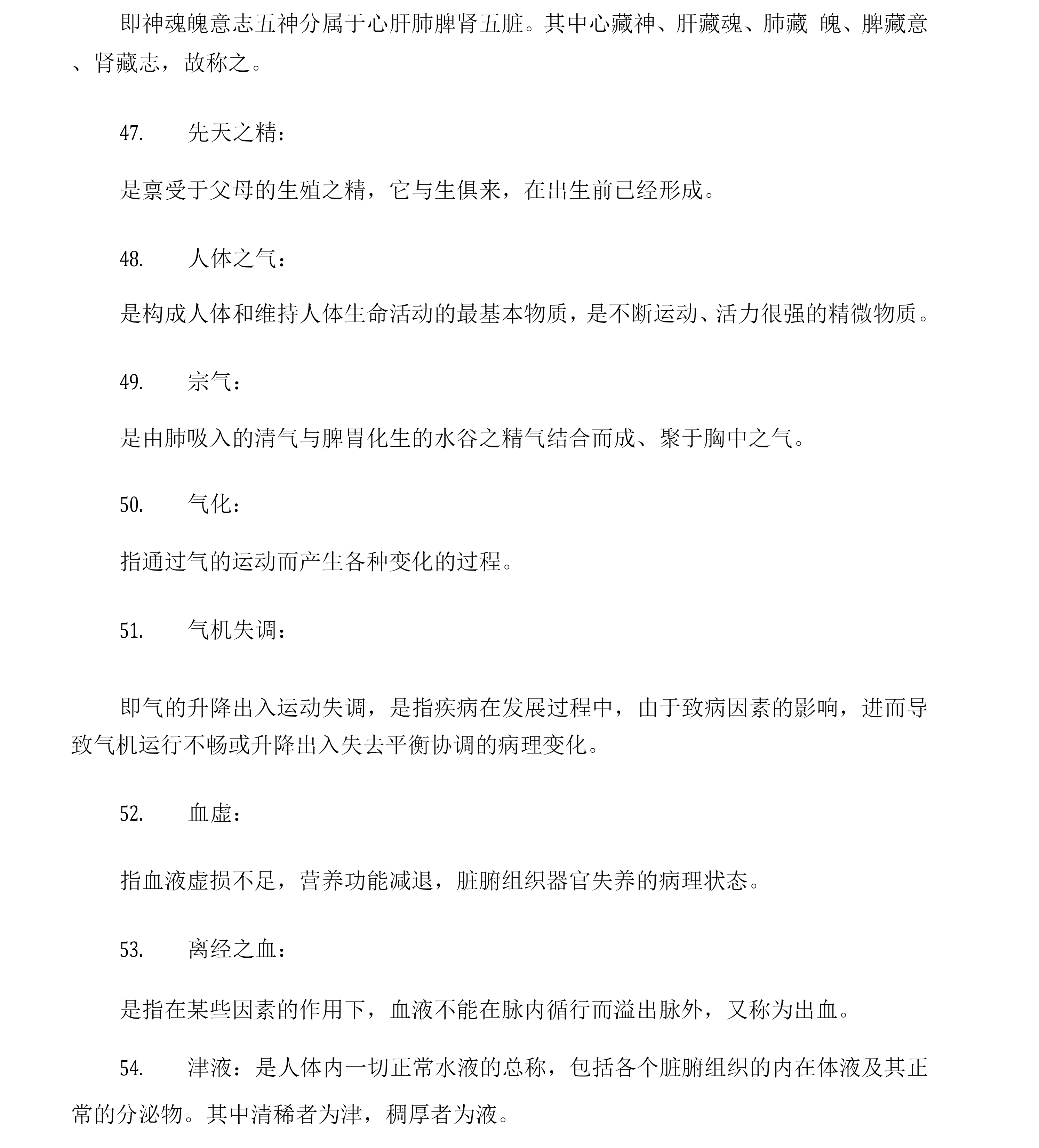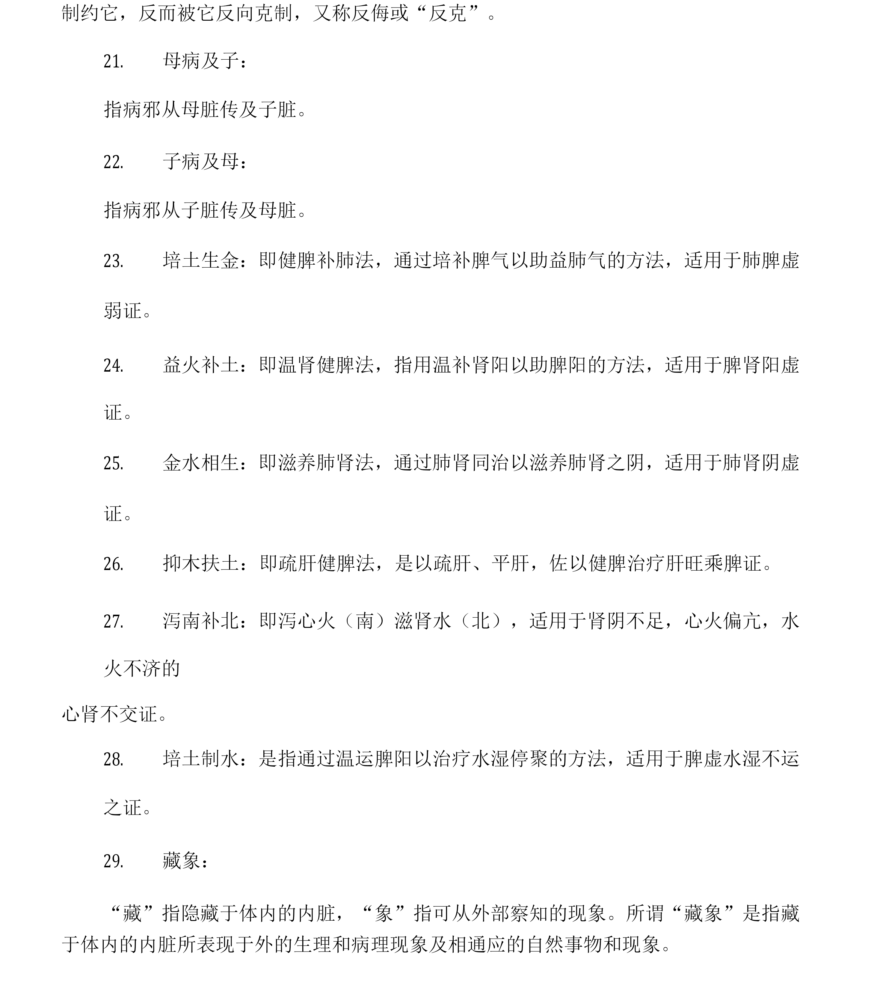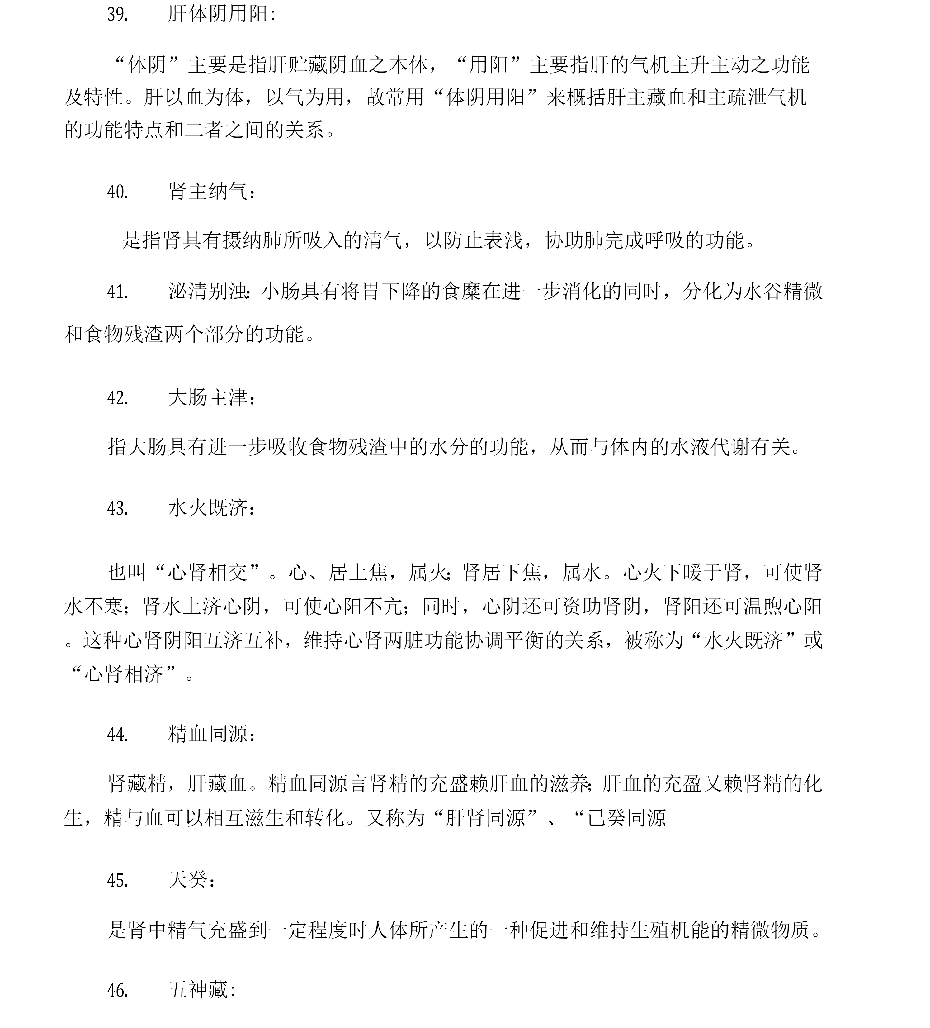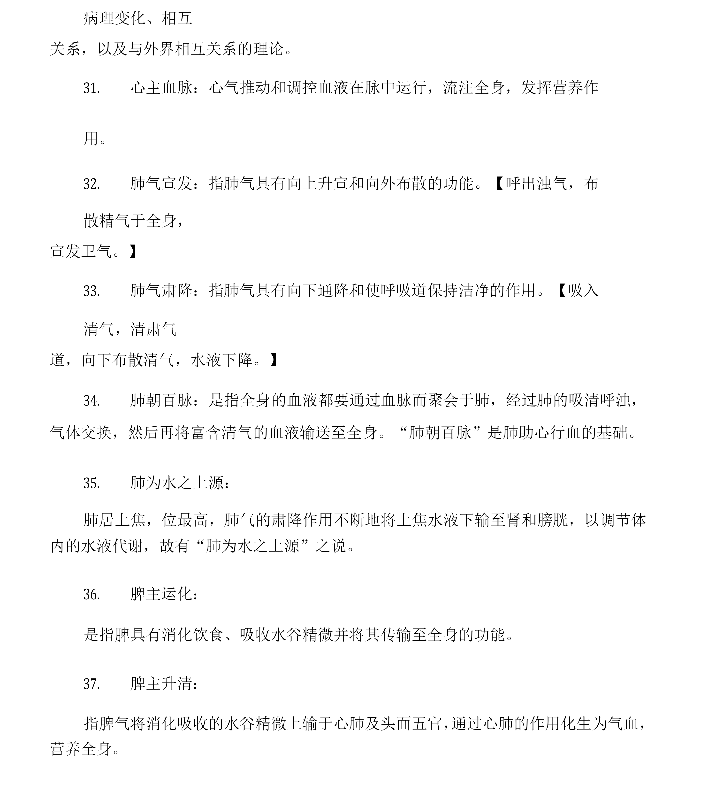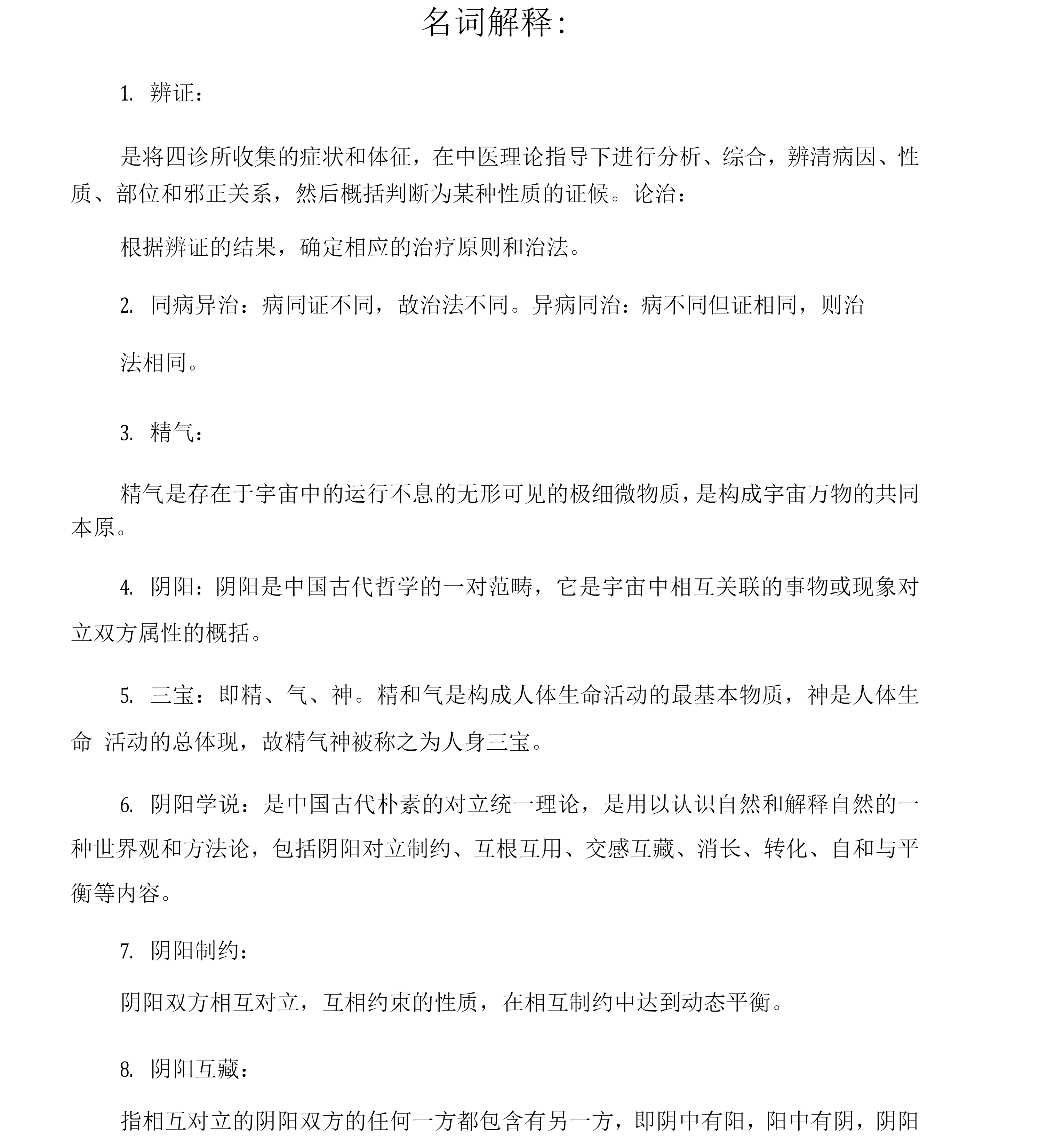 名词解释:辨证:是将四诊所收集的症状和体征,在中医理论指导下进行分析、综合,辨清病因、性质、部位和邪正关系,然后概括判断为某种性质的证候。论治:根据辨证的结果,确定相应的治疗原则和治法。同病异治:病同证不同,故治法不同。异病同治:病不同但证相同,则治法相同。精气:精气是存在于宇宙中的运行不息的无形可见的极细微物质,是构成宇宙万物的共同本原。阴阳:阴阳是中国古代哲学的一对范畴,它是宇宙中相互关联的事物或现象对立双方属性的概括。三宝:即精、气、神。精和气是构成人体生命活动的最基本物质,神是人体生命活动的总体现,故精气神被称之为人身三宝。阴阳学说:是中国古代朴素的对立统一理论,是用以认识自然和解释自然的一种世界观和方法论,包括阴阳对立制约、互根互用、交感互藏、消长、转化、自和与平衡等内容。阴阳制约:阴阳双方相互对立,互相约束的性质,在相互制约中达到动态平衡。阴阳互藏:指相互对立的阴阳双方的任何一方都包含有另一方,即阴中有阳,阳中有阴,阴阳当中复有阴阳。阴阳消长:是指阴阳在不断地消长运动中维持着相对的平衡状态。阴阳互根:指阴阳之间相互依存,相互为用的关系。阴阳转化:是指阴阳在一定的条件下可以相互转化,即阴可转化为阳,阳可转化为阴,转化的条件是“极”和“重”。阴阳交感:是指阴阳二气在运动中相互感应而交合的过程。五行:是指木、火、土、金、水五种物质及其运动变化。五行学说:是以木、火、土、金、水五种物质的特性及其生克制化规律来认识世界、解释世界和探索宇宙内在运动规律的一种方法论。五行相生:指五行之间存在着有序的递相滋生、促进的关系。五行相克:指五行之间存在着有序的递相克制、制约的关系。五行制化:指五行之间相互化生、相互制约以维持系统平衡协调的关系五行胜复:指五行中一行亢盛(即胜气),则引起其所不胜(即复气)的报复性制约,从而使五行之间复归于协调与平衡。五行相乘:指五行之间相克太过,超出正常制约的程度,使事物之间失去正常的协调关系,又叫“倍克”。五行相侮:指五行中的某一行本身太过,使原来克它的一行不仅不能制约它,反而被它反向克制,又称反侮或“反克”。母病及子:指病邪从母脏传及子脏。子病及母:指病邪从子脏传及母脏。培土生金:即健脾补肺法,通过培补脾气以助益肺气的方法,适用于肺脾虚弱证。益火补土:即温肾健脾法,指用温补肾阳以助脾阳的方法,适用于脾肾阳虚证。金水相生:即滋养肺肾法,通过肺肾同治以滋养肺肾之阴,适用于肺肾阴虚证。抑木扶土:即疏肝健脾法,是以疏肝、平肝,佐以健脾治疗肝旺乘脾证。泻南补北:即泻心火(南)滋肾水(北),适用于肾阴不足,心火偏亢,水火不济的心肾不交证。培土制水:是指通过温运脾阳以治疗水湿停聚的方法,适用于脾虚水湿不运之证。藏象:“藏”指隐藏于体内的内脏,“象”指可从外部察知的现象。所谓“藏象”是指藏于体内的内脏所表现于外的生理和病理现象及相通应的自然事物和现象。藏象学说:是研究人体脏腑器官的形态结构、物质基础、生理功能、病理变化、相互关系,以及与外界相互关系的理论。心主血脉:心气推动和调控血液在脉中运行,流注全身,发挥营养作用。肺气宣发:指肺气具有向上升宣和向外布散的功能。【呼出浊气,布散精气于全身,宣发卫气。】肺气肃降:指肺气具有向下通降和使呼吸道保持洁净的作用。【吸入清气,清肃气道,向下布散清气,水液下降。】肺朝百脉:是指全身的血液都要通过血脉而聚会于肺,经过肺的吸清呼浊,气体交换,然后再将富含清气的血液输送至全身。“肺朝百脉”是肺助心行血的基础。肺为水之上源:肺居上焦,位最高,肺气的肃降作用不断地将上焦水液下输至肾和膀胱,以调节体内的水液代谢,故有“肺为水之上源”之说。脾主运化:是指脾具有消化饮食、吸收水谷精微并将其传输至全身的功能。脾主升清:指脾气将消化吸收的水谷精微上输于心肺及头面五官,通过心肺的作用化生为气血,营养全身。肝主疏泄:是指肝具有疏通调畅全身气机的生理功能。肝体阴用阳:“体阴”主要是指肝贮藏阴血之本体,“用阳”主要指肝的气机主升主动之功能及特性。肝以血为体,以气为用,故常用“体阴用阳”来概括肝主藏血和主疏泄气机的功能特点和二者之间的关系。肾主纳气:是指肾具有摄纳肺所吸入的清气,以防止表浅,协助肺完成呼吸的功能。泌清别浊:小肠具有将胃下降的食糜在进一步消化的同时,分化为水谷精微和食物残渣两个部分的功能。大肠主津:指大肠具有进一步吸收食物残渣中的水分的功能,从而与体内的水液代谢有关。水火既济:也叫“心肾相交”。心、居上焦,属火;肾居下焦,属水。心火下暖于肾,可使肾水不寒;肾水上济心阴,可使心阳不亢;同时,心阴还可资助肾阴,肾阳还可温煦心阳。这种心肾阴阳互济互补,维持心肾两