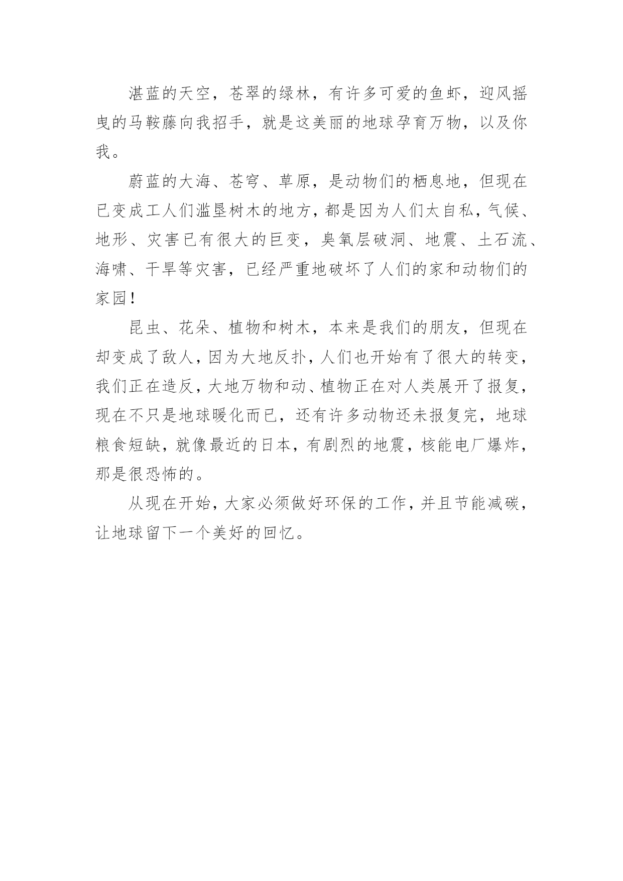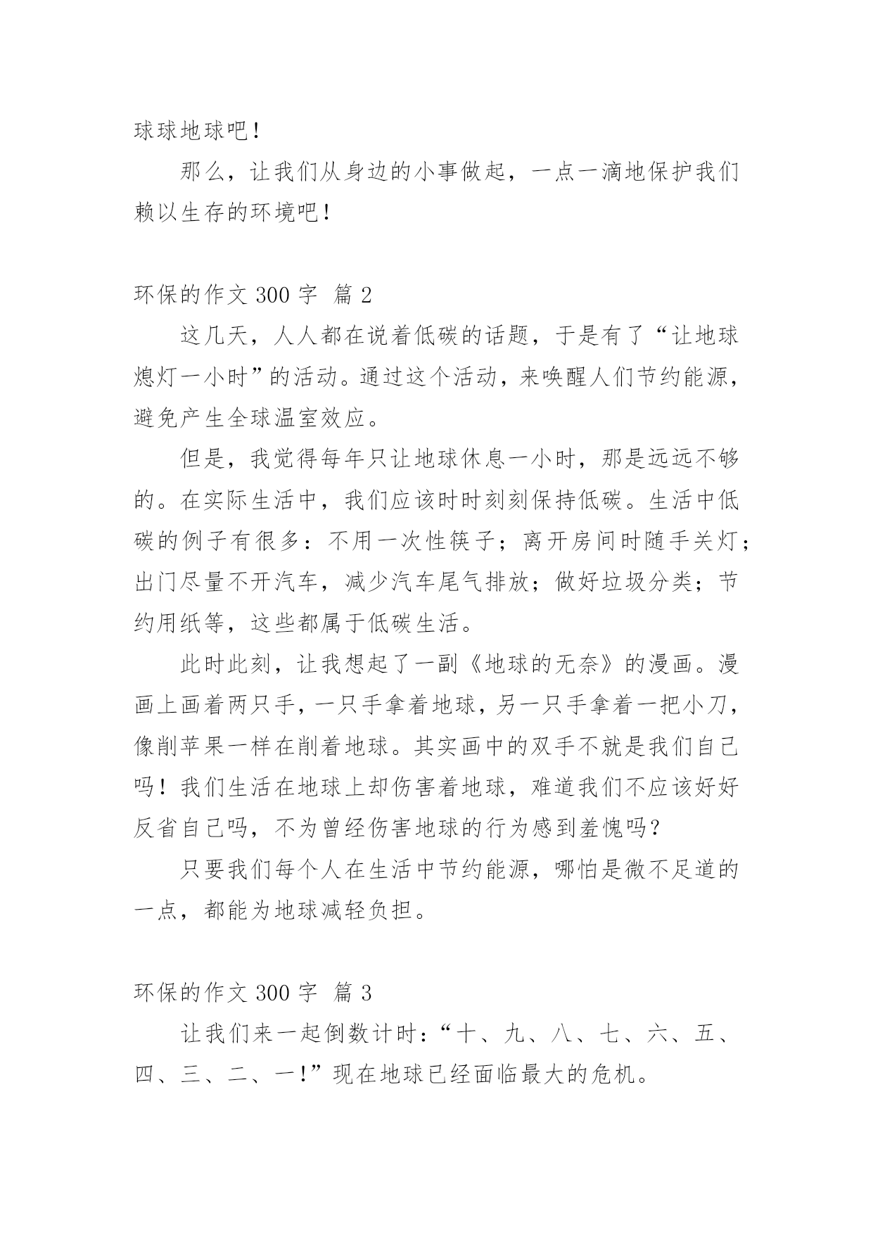 环保的作文300字实用的环保的作文300字三篇在学习、工作乃至生活中,大家都尝试过写作文吧,作文是人们把记忆中所存储的有关知识、经验和思想用书面形式表达出来的记叙方式。那么,怎么去写作文呢?以下是小编为大家收集的环保的作文300字3篇,仅供参考,希望能够帮助到大家。环保的作文300字篇1今天爸爸带我去到附近的一间书店,里面有很多各种各样的书,我很想把它们全部都买下来,可是这是不可能的,我只好挑几本我喜欢的来买。回到家我拿起一本书来看,里面写着很多有关保护环境、保护地球的问题。看完这本书后我有着有很深很深的体会。自然环境是人类栖息之地,也是人类生活的.物质之源,环境在多种方面使我们的生活更加美好,而我们又是怎样对待环境呢?要砍伐树木,满足各种各样的需要;要采油挖煤,恨不得掏干地壳里的一切资源。更让我知道地球上的生物(动植物)正以每天灭绝一种的速度消失,生存问题从人类已扩展到地球上相互依存的所有物种。假如某一天,树木没了,水没了,动物也没了,那么人又将怎么生存呢?所以让我们记住保护环境、接约能源是多么重要。热爱我们的地球就快来球球地球吧!那么,让我们从身边的小事做起,一点一滴地保护我们赖以生存的环境吧!环保的作文300字篇2这几天,人人都在说着低碳的话题,于是有了“让地球熄灯一小时”的活动。通过这个活动,来唤醒人们节约能源,避免产生全球温室效应。但是,我觉得每年只让地球休息一小时,那是远远不够的。在实际生活中,我们应该时时刻刻保持低碳。生活中低碳的例子有很多:不用一次性筷子;离开房间时随手关灯;出门尽量不开汽车,减少汽车尾气排放;做好垃圾分类;节约用纸等,这些都属于低碳生活。此时此刻,让我想起了一副《地球的无奈》的漫画。漫画上画着两只手,一只手拿着地球,另一只手拿着一把小刀,像削苹果一样在削着地球。其实画中的双手不就是我们自己吗!我们生活在地球上却伤害着地球,难道我们不应该好好反省自己吗,不为曾经伤害地球的行为感到羞愧吗?只要我们每个人在生活中节约能源,哪怕是微不足道的一点,都能为地球减轻负担。环保的作文300字篇3让我们来一起倒数计时:“十、九、八、七、六、五、四、三、二、一!”现在地球已经面临最大的危机。湛蓝的天空,苍翠的绿林,有许多可爱的鱼虾,迎风摇曳的马鞍藤向我招手,就是这美丽的地球孕育万物,以及你我。蔚蓝的大海、苍穹、草原,是动物们的栖息地,但现在已变成工人们滥垦树木的地方,都是因为人们太自私,气候、地形、灾害已有很大的巨变,臭氧层破洞、地震、土石流、海啸、干旱等灾害,已经严重地破坏了人们的家和动物们的家园!昆虫、花朵、植物和树木,本来是我们的朋友,但现在却变成了敌人,因为大地反扑,人们也开始有了很大的转变,我们正在造反,大地万物和动、植物正在对人类展开了报复,现在不只是地球暖化而已,还有许多动物还未报复完,地球粮食短缺,就像最近的日本,有剧烈的地震,核能电厂爆炸,那是很恐怖的。从现在开始,大家必须做好环保的工作,并且节能减碳,让地球留下一个美好的回忆。