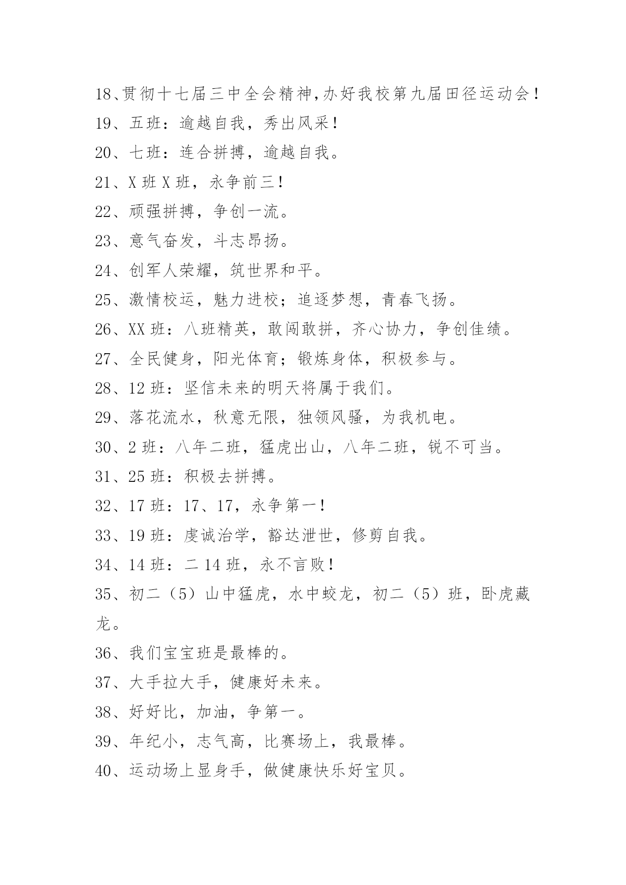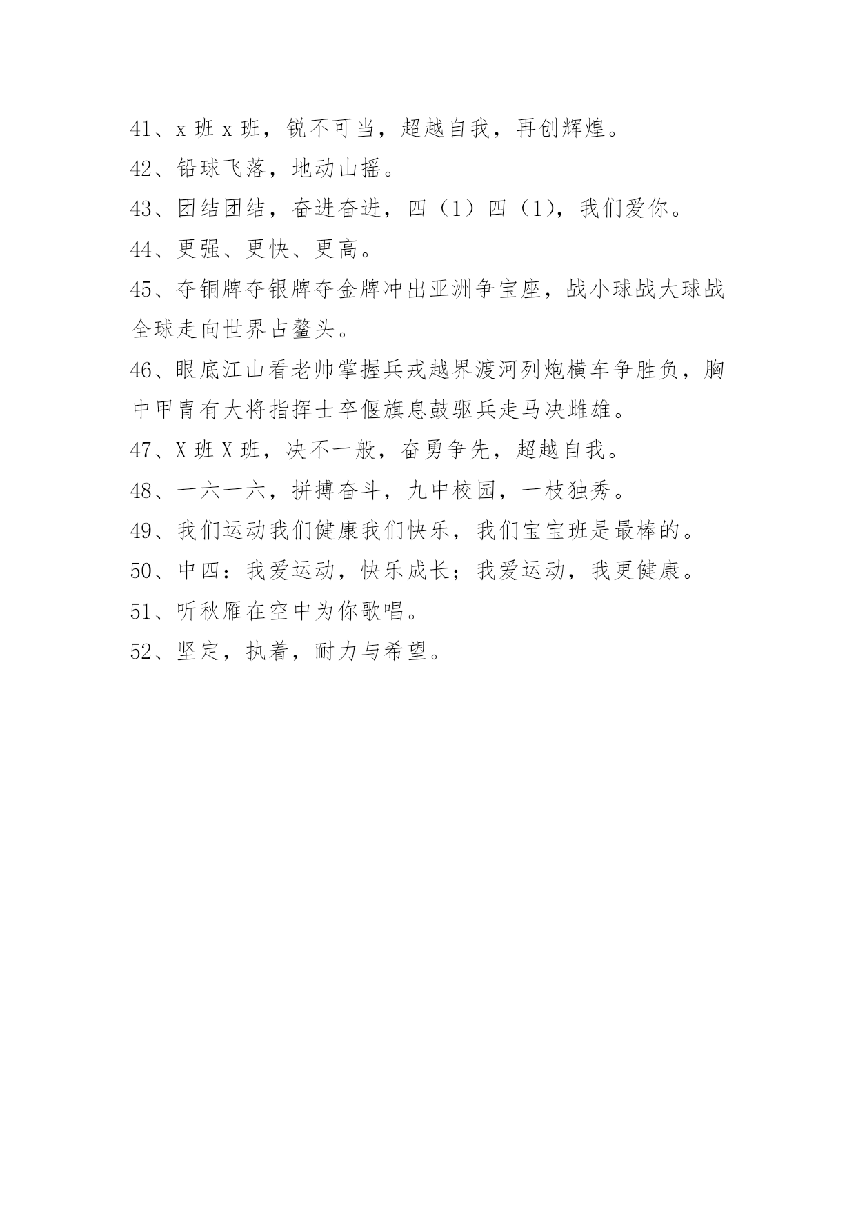 增强士气的运动会口号2021年增强士气的运动会口号汇编52条高三()班,猛虎出山,锐不可当。以下是小编为大家整理推荐的'增强士气的运动会口号52条,欢迎大家借鉴与参考,希望对大家有所帮助。1、看我8班,锐不可当初一(8)班,猛虎出山,锐不可当。2、二年三班,非同一般。三班三班,超越第三。3、奥运精神,指引三班。三班三班,必夺桂冠。4、中二中二,用力拼搏,中二中二,争创第一。5、小一班,不一般,争第一,不用质疑。6、放飞抱负,勇于攀登。热爱运动,走向成功。7、青春如火,超越自我,励精图治,奋勇拼搏。8、山有猛虎,水有蛟龙,高一十班,藏龙卧虎。9、班十班十班,扬起风帆;拼搏一番,绝不一般。10、文能称霸,武能称雄,比赛场上,七班最强。11、友谊第一,比赛第二,振臂山呼,似锦前程。12、奥运精神,永驻我心,赛出风格,赛出水平。13、小二小二,真不一般,五项全能,遥遥领先。14、加油必胜我们是最好的。预祝大会圆满成功。15、×班:我们的第一,我们来赢。16、顽强拼搏,超越自我。17、山中猛虎,水中蛟龙,初一八班,卧虎藏龙。18、贯彻十七届三中全会精神,办好我校第九届田径运动会!19、五班:逾越自我,秀出风采!20、七班:连合拼搏,逾越自我。21、X班X班,永争前三!22、顽强拼搏,争创一流。23、意气奋发,斗志昂扬。24、创军人荣耀,筑世界和平。25、激情校运,魅力进校;追逐梦想,青春飞扬。26、XX班:八班精英,敢闯敢拼,齐心协力,争创佳绩。27、全民健身,阳光体育;锻炼身体,积极参与。28、12班:坚信未来的明天将属于我们。29、落花流水,秋意无限,独领风骚,为我机电。30、2班:八年二班,猛虎出山,八年二班,锐不可当。31、25班:积极去拼搏。32、17班:17、17,永争第一!33、19班:虔诚治学,豁达泄世,修剪自我。34、14班:二14班,永不言败!35、初二(5)山中猛虎,水中蛟龙,初二(5)班,卧虎藏龙。36、我们宝宝班是最棒的。37、大手拉大手,健康好未来。38、好好比,加油,争第一。39、年纪小,志气高,比赛场上,我最棒。40、运动场上显身手,做健康快乐好宝贝。41、x班x班,锐不可当,超越自我,再创辉煌。42、铅球飞落,地动山摇。43、团结团结,奋进奋进,四(1)四(1),我们爱你。44、更强、更快、更高。45、夺铜牌夺银牌夺金牌冲出亚洲争宝座,战小球战大球战全球走向世界占鳌头。46、眼底江山看老帅掌握兵戎越界渡河列炮横车争胜负,胸中甲胄有大将指挥士卒偃旗息鼓驱兵走马决雌雄。47、X班X班,决不一般,奋勇争先,超越自我。48、一六一六,拼搏奋斗,九中校园,一枝独秀。49、我们运动我们健康我们快乐,我们宝宝班是最棒的。50、中四:我爱运动,快乐成长;我爱运动,我更健康。51、听秋雁在空中为你歌唱。52、坚定,执着,耐力与希望。