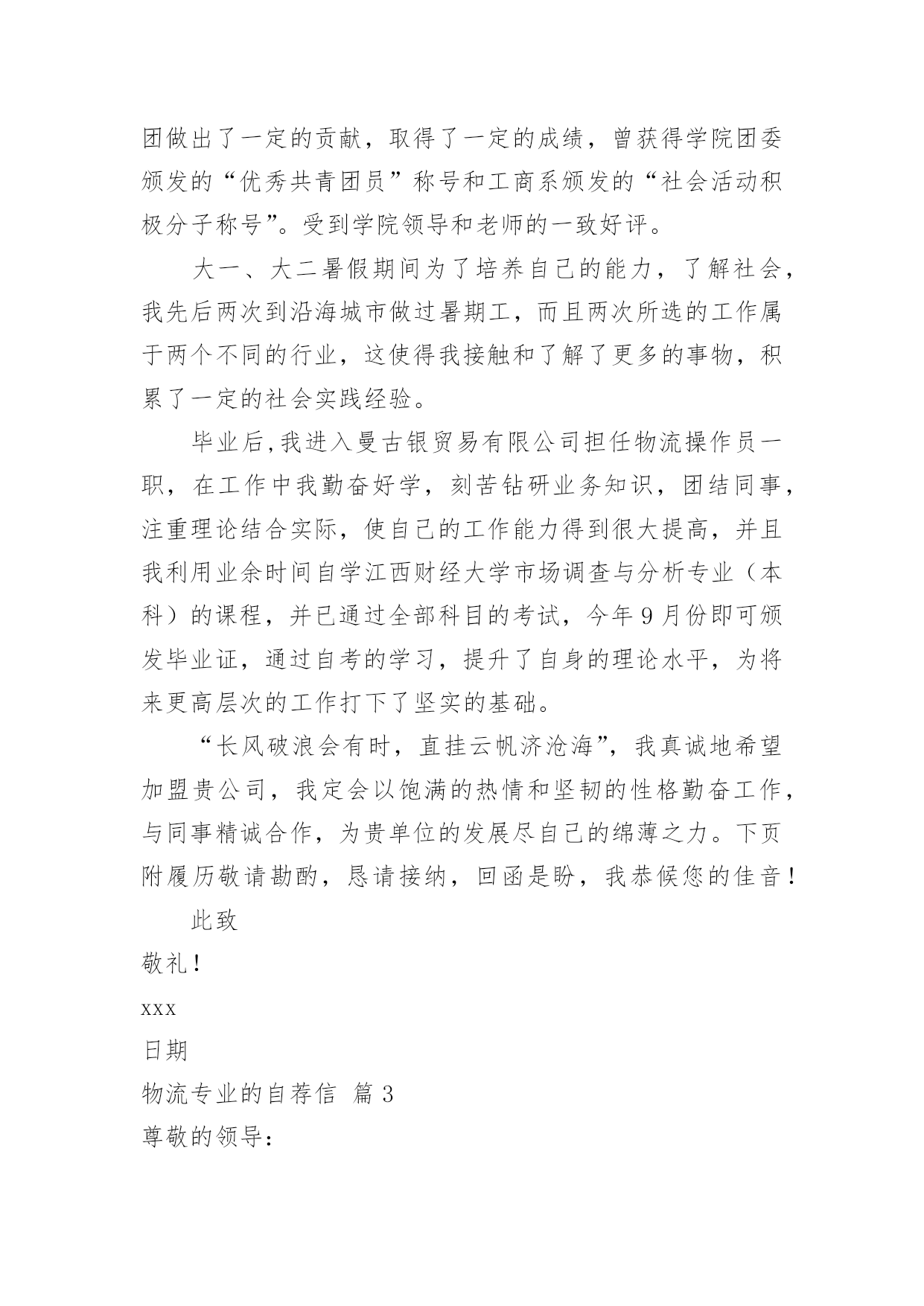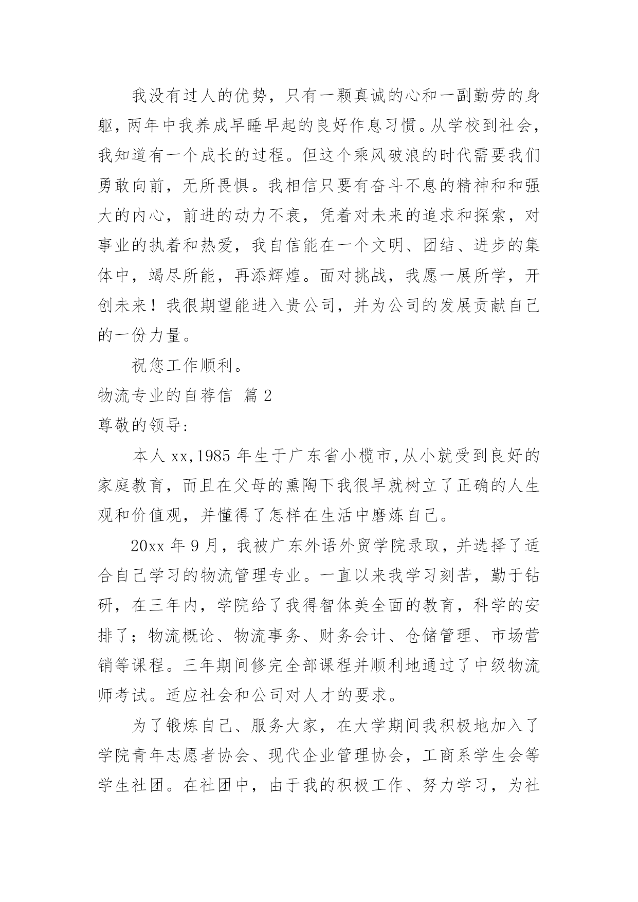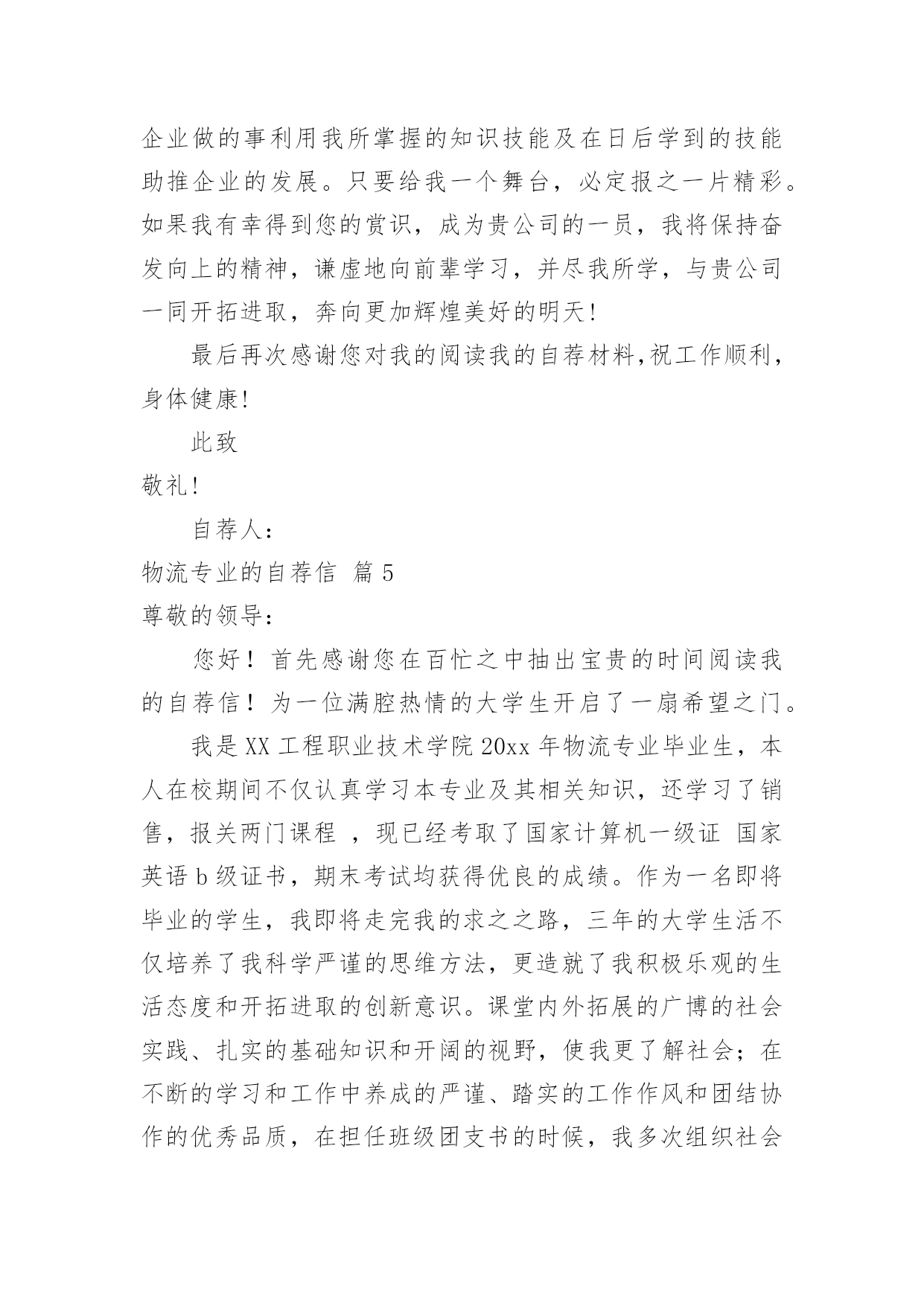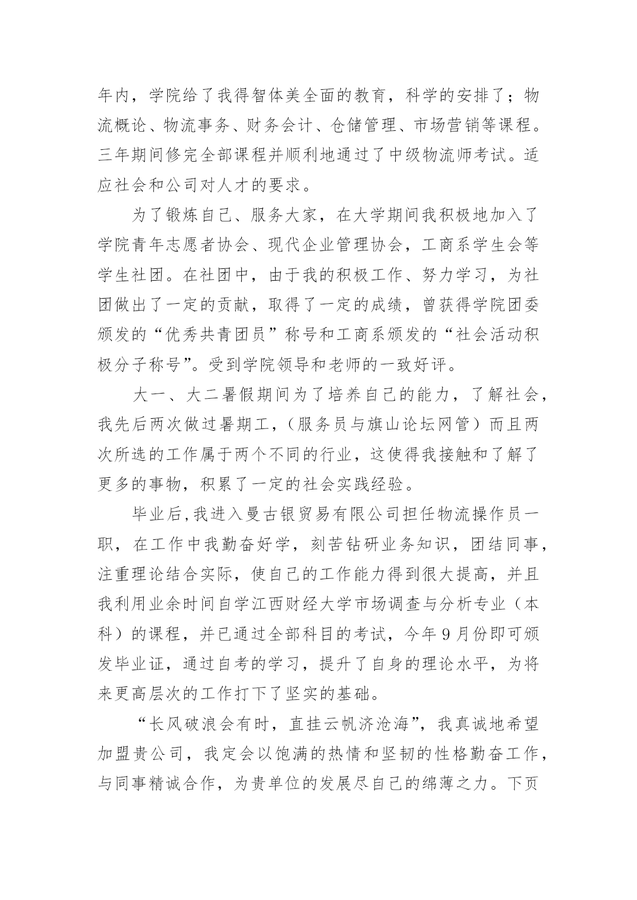 物流专业的自荐信物流专业的自荐信汇总8篇在当今社会生活中,自荐信在现实生活中使用广泛,通过自荐信,我们可以展示自己的长处。如何编写一份恰当的自荐信呢?以下是小编精心整理的物流专业的自荐信8篇,欢迎大家借鉴与参考,希望对大家有所帮助。物流专业的自荐信篇1尊敬的领导:您好!新世纪,风云际会,机会与挑战,两相并存。我是一名即将毕业的大二学生,现需要一份工作来完善我的大学生涯。大学两年,在学习上我全身心投入到本专业物流管理的学习中外,还学习了感兴趣的心理知识,课余时间基本都在图书馆阅读喜欢的书籍,从中找寻读书的乐趣。此外,我还积极地参加各种社会活动,加入院学生会学习部、校文学社、校英文广播电台等社团,结交了许多值得相互学习的同学,赢得了人生又一笔宝贵的财富。此外,在服务他人的同时积极培养了自己的社交能力,抓住每一个机会,锻炼自己。大学两年,我深深地感受到,与优秀学生共事,能使我在竞争中获益;向实际困难挑战,让我在挫折中成长。祖辈们教我勤奋、尽责、善良、正直;黄冈职业技术学院培养了我崇德、强能、务实、创新的的良好信念。我没有过人的优势,只有一颗真诚的心和一副勤劳的身躯,两年中我养成早睡早起的良好作息习惯。从学校到社会,我知道有一个成长的过程。但这个乘风破浪的时代需要我们勇敢向前,无所畏惧。我相信只要有奋斗不息的精神和和强大的内心,前进的动力不衰,凭着对未来的追求和探索,对事业的执着和热爱,我自信能在一个文明、团结、进步的集体中,竭尽所能,再添辉煌。面对挑战,我愿一展所学,开创未来!我很期望能进入贵公司,并为公司的发展贡献自己的一份力量。祝您工作顺利。物流专业的自荐信篇2尊敬的领导:本人xx,1985年生于广东省小榄市,从小就受到良好的家庭教育,而且在父母的熏陶下我很早就树立了正确的人生观和价值观,并懂得了怎样在生活中磨炼自己。20xx年9月,我被广东外语外贸学院录取,并选择了适合自己学习的物流管理专业。一直以来我学习刻苦,勤于钻研,在三年内,学院给了我得智体美全面的教育,科学的安排了;物流概论、物流事务、财务会计、仓储管理、市场营销等课程。三年期间修完全部课程并顺利地通过了中级物流师考试。适应社会和公司对人才的要求。为了锻炼自己、服务大家,在大学期间我积极地加入了学院青年志愿者协会、现代企业管理协会,工商系学生会等学生社团。在社团中,由于我的积极工作、努力学习,为社团做出了一定的贡献,取得了一定的成绩,曾获得学院团委颁发的“优秀共青团员”称号和工商系颁发的“社会活动积极分子称号”。受到学院领导和老师的一致好评。大一、大二暑假期间为了培养自己的能力,了解社会,我先后两次到沿海城市做过暑期工,而且两次所选的工作属于两个不同的行业,这使得我接触和了解了更多的事物,积累了一定的社会实践经验。毕业后,我进入曼古银贸易有限公司担任物流操作员一职,在工作中我勤奋好学,刻苦钻研业务知识,团结同事,注重理论结合实际,使自己的工作能力得到很大提高,并且我利用业余时间自学江西财经大学市场调查与分析专业(本科)的课程,并已通过全部科目的考试,今年9月份即可颁发毕业证,通过自考的学习,提升了自身的理论水平,为将来更高层次的工作打下了坚实的基础。“长风破浪会有时,直挂云帆济沧海”,我真诚地希望加盟贵公司,我定会以饱满的热情和坚韧的性格勤奋工作,与同事精诚合作,为贵单位的发展尽自己的绵薄之力。下页附履历敬请勘酌,恳请接纳,回函是盼,我恭候您的佳音!此致敬礼!xxx日期物流专业的自荐信篇3尊敬的领导:您好!我的名字叫hbrc,我陕西工业职业技术学院物流管理专业的一名hbrc。近期获知贵公司正在招聘人才,我自信能胜任这一职位,所以特意写了这封信。感谢您能在百忙中翻阅我的求职信。经过三年物流专业的学习。我熟练掌握与现代物流相关的知识。三年的大学校园和社会实践生活使我不断地挑战自我、开拓创新,为实现自身价值打下了坚实的基础。在校期间得到了老师和同学们的一致肯定。作为一名物流管理专业hbrc,我期望从一线职位做起,把所学到的专业知识,与实际工作情况相结合,快速积累最基础的工作经验。本人在校成绩最好的是物流市场营销,这是由于本人的爱好所决定的,物流管理与市场营销都是我最喜欢的专业,所以我期望从事二者的结合体----物流市场营销。在大学期间,我参加过多次社会实践活动,并曾在西安咸阳国际机场蔚蓝书店做过兼职工作。正因为此,使我积累了丰富的实践经验,而且更加注重团队合作精神和集体观念,更加明确了我的人生目标。我坚信,生活需要自己来勾画,不一样的方式就有不一样的人生。未来的事业更要靠自己去探索和拼搏。请您相信我对工作认真负责的态度,如果能得到您的欣赏,我将会用实际行动来回报您的信任。谢谢。我很期望能进入贵公司,并为公司的发展贡献自己的一份力量。祝您工作顺利。身体健康。此致敬礼!物流