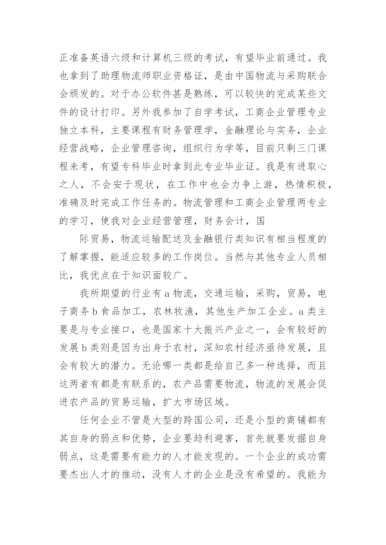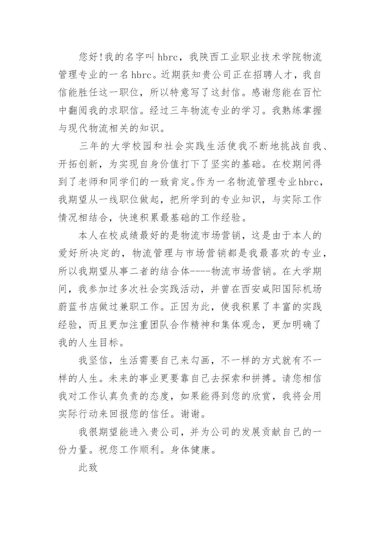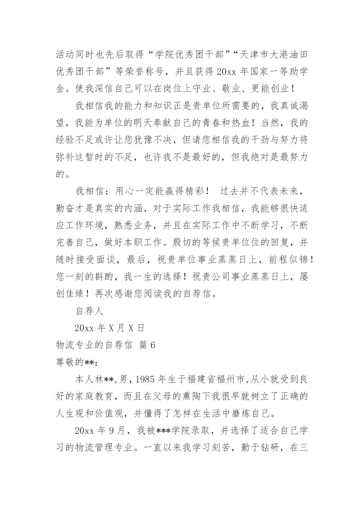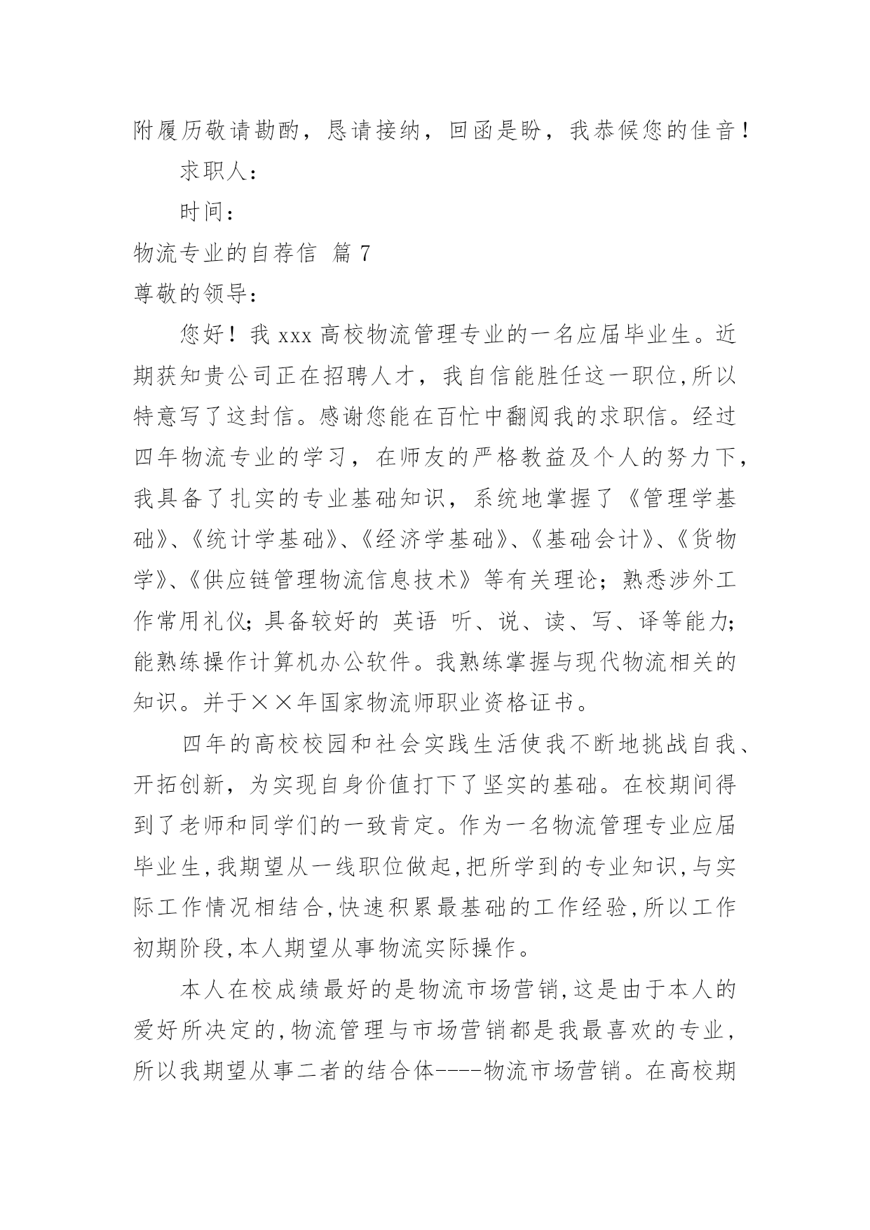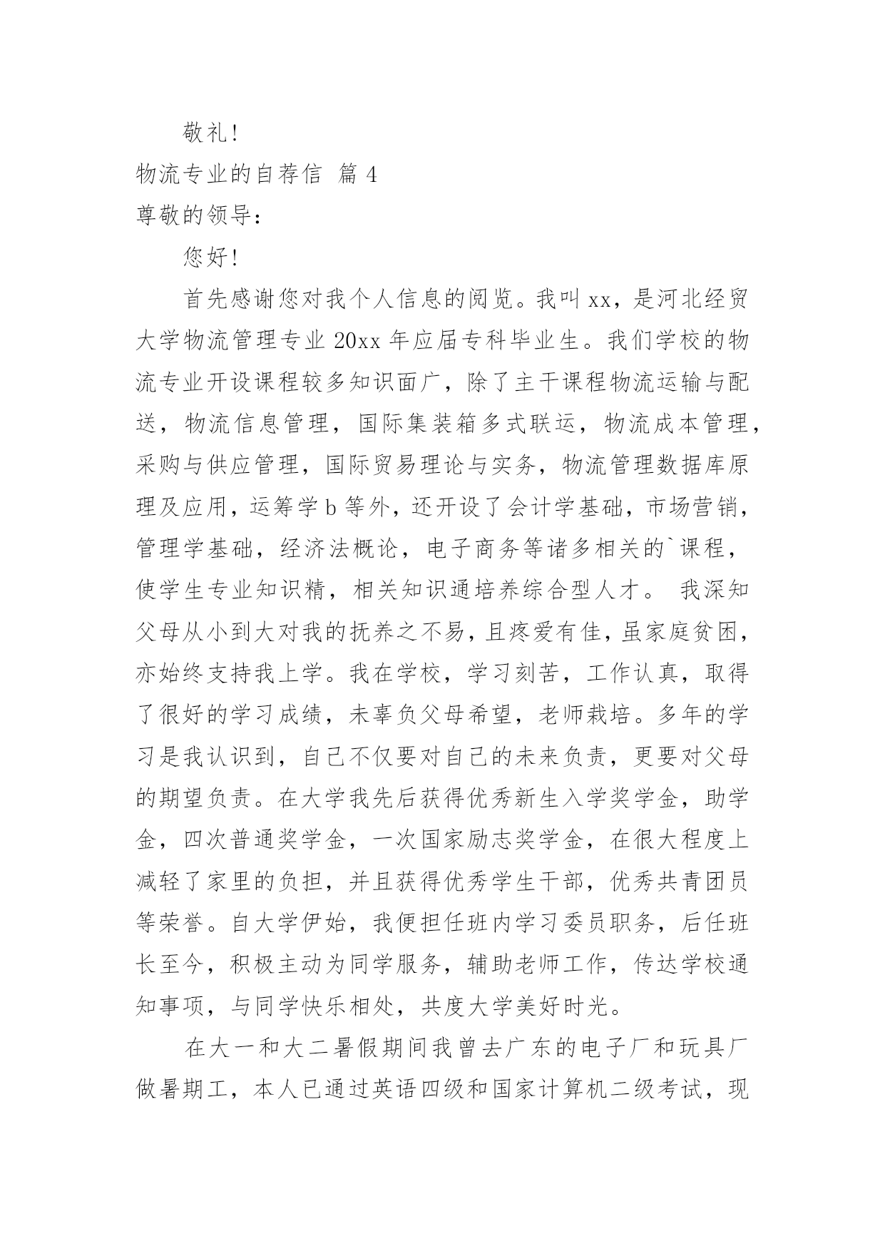 物流专业的自荐信物流专业的自荐信汇总8篇在当今社会生活中,自荐信在现实生活中使用广泛,通过自荐信,我们可以展示自己的长处。如何编写一份恰当的自荐信呢?以下是小编精心整理的物流专业的自荐信8篇,欢迎大家借鉴与参考,希望对大家有所帮助。物流专业的自荐信篇1尊敬的领导:您好!新世纪,风云际会,机会与挑战,两相并存。我是一名即将毕业的大二学生,现需要一份工作来完善我的大学生涯。大学两年,在学习上我全身心投入到本专业物流管理的学习中外,还学习了感兴趣的心理知识,课余时间基本都在图书馆阅读喜欢的书籍,从中找寻读书的乐趣。此外,我还积极地参加各种社会活动,加入院学生会学习部、校文学社、校英文广播电台等社团,结交了许多值得相互学习的同学,赢得了人生又一笔宝贵的财富。此外,在服务他人的同时积极培养了自己的社交能力,抓住每一个机会,锻炼自己。大学两年,我深深地感受到,与优秀学生共事,能使我在竞争中获益;向实际困难挑战,让我在挫折中成长。祖辈们教我勤奋、尽责、善良、正直;黄冈职业技术学院培养了我崇德、强能、务实、创新的的良好信念。我没有过人的优势,只有一颗真诚的心和一副勤劳的身躯,两年中我养成早睡早起的良好作息习惯。从学校到社会,我知道有一个成长的过程。但这个乘风破浪的时代需要我们勇敢向前,无所畏惧。我相信只要有奋斗不息的精神和和强大的内心,前进的动力不衰,凭着对未来的追求和探索,对事业的执着和热爱,我自信能在一个文明、团结、进步的集体中,竭尽所能,再添辉煌。面对挑战,我愿一展所学,开创未来!我很期望能进入贵公司,并为公司的发展贡献自己的一份力量。祝您工作顺利。物流专业的自荐信篇2尊敬的领导:本人xx,1985年生于广东省小榄市,从小就受到良好的家庭教育,而且在父母的熏陶下我很早就树立了正确的人生观和价值观,并懂得了怎样在生活中磨炼自己。20xx年9月,我被广东外语外贸学院录取,并选择了适合自己学习的物流管理专业。一直以来我学习刻苦,勤于钻研,在三年内,学院给了我得智体美全面的教育,科学的安排了;物流概论、物流事务、财务会计、仓储管理、市场营销等课程。三年期间修完全部课程并顺利地通过了中级物流师考试。适应社会和公司对人才的要求。为了锻炼自己、服务大家,在大学期间我积极地加入了学院青年志愿者协会、现代企业管理协会,工商系学生会等学生社团。在社团中,由于我的积极工作、努力学习,为社团做出了一定的贡献,取得了一定的成绩,曾获得学院团委颁发的“优秀共青团员”称号和工商系颁发的“社会活动积极分子称号”。受到学院领导和老师的一致好评。大一、大二暑假期间为了培养自己的能力,了解社会,我先后两次到沿海城市做过暑期工,而且两次所选的工作属于两个不同的行业,这使得我接触和了解了更多的事物,积累了一定的社会实践经验。毕业后,我进入曼古银贸易有限公司担任物流操作员一职,在工作中我勤奋好学,刻苦钻研业务知识,团结同事,注重理论结合实际,使自己的工作能力得到很大提高,并且我利用业余时间自学江西财经大学市场调查与分析专业(本科)的课程,并已通过全部科目的考试,今年9月份即可颁发毕业证,通过自考的学习,提升了自身的理论水平,为将来更高层次的工作打下了坚实的基础。“长风破浪会有时,直挂云帆济沧海”,我真诚地希望加盟贵公司,我定会以饱满的热情和坚韧的性格勤奋工作,与同事精诚合作,为贵单位的发展尽自己的绵薄之力。下页附履历敬请勘酌,恳请接纳,回函是盼,我恭候您的佳音!此致敬礼!xxx日期物流专业的自荐信篇3尊敬的领导:您好!我的名字叫hbrc,我陕西工业职业技术学院物流管理专业的一名hbrc。近期获知贵公司正在招聘人才,我自信能胜任这一职位,所以特意写了这封信。感谢您能在百忙中翻阅我的求职信。经过三年物流专业的学习。我熟练掌握与现代物流相关的知识。三年的大学校园和社会实践生活使我不断地挑战自我、开拓创新,为实现自身价值打下了坚实的基础。在校期间得到了老师和同学们的一致肯定。作为一名物流管理专业hbrc,我期望从一线职位做起,把所学到的专业知识,与实际工作情况相结合,快速积累最基础的工作经验。本人在校成绩最好的是物流市场营销,这是由于本人的爱好所决定的,物流管理与市场营销都是我最喜欢的专业,所以我期望从事二者的结合体----物流市场营销。在大学期间,我参加过多次社会实践活动,并曾在西安咸阳国际机场蔚蓝书店做过兼职工作。正因为此,使我积累了丰富的实践经验,而且更加注重团队合作精神和集体观念,更加明确了我的人生目标。我坚信,生活需要自己来勾画,不一样的方式就有不一样的人生。未来的事业更要靠自己去探索和拼搏。请您相信我对工作认真负责的态度,如果能得到您的欣赏,我将会用实际行动来回报您的信任。谢谢。我很期望能进入贵公司,并为公司的发展贡献自己的一份力量。祝您工作顺利。身体健康。此致敬礼!物流