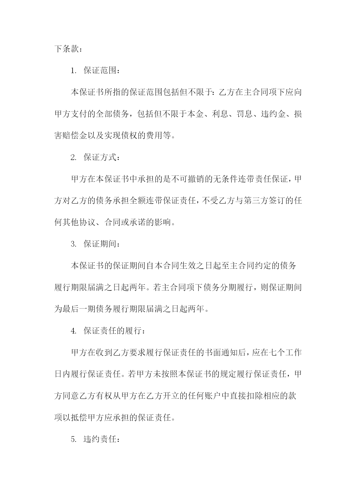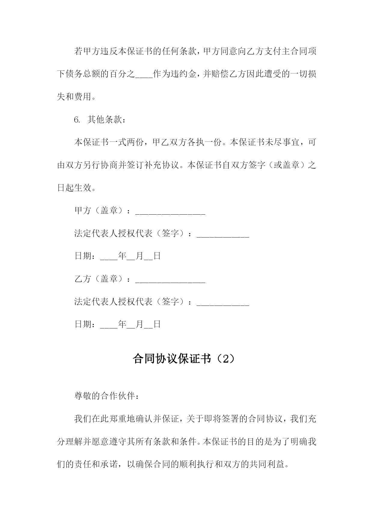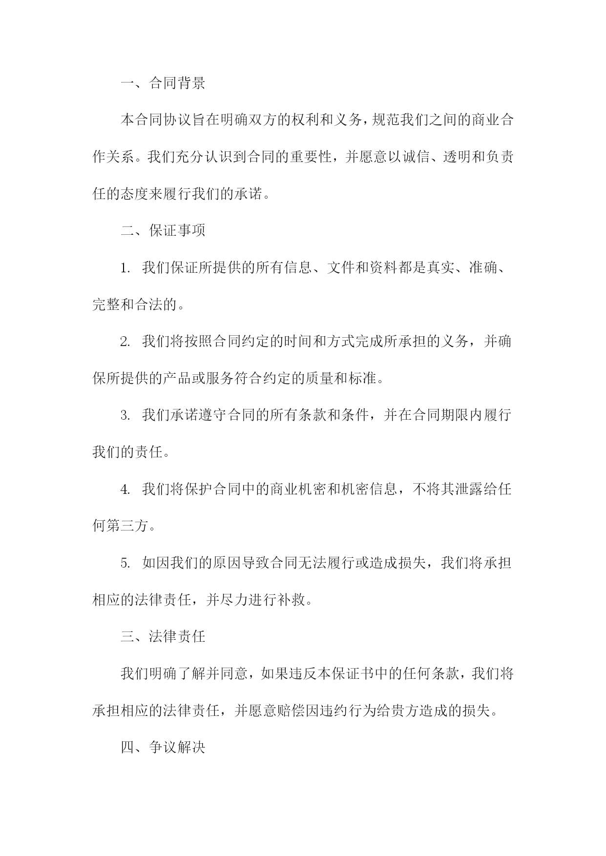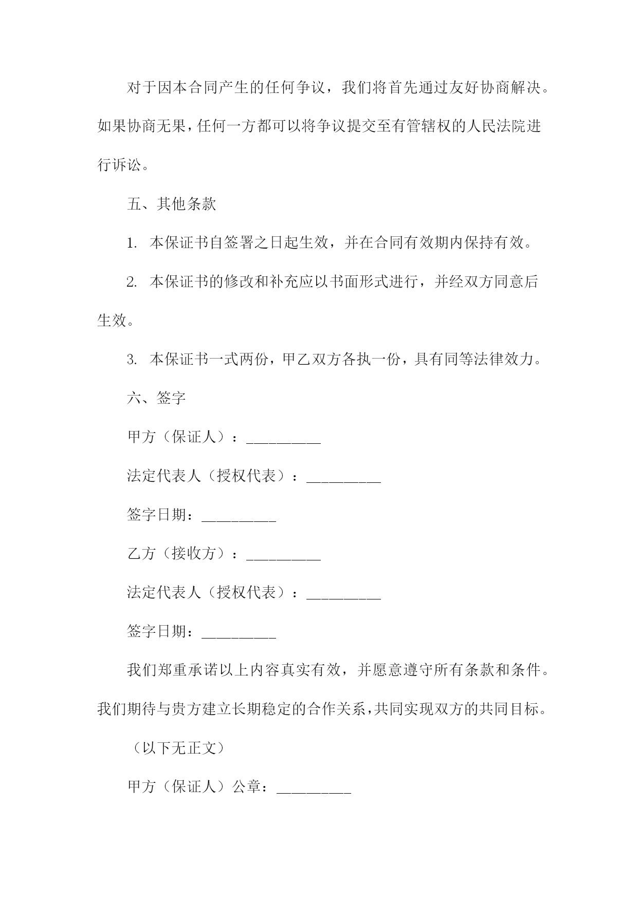合同协议保证书丙方(受益人):______________(以下简称“受益人”)根据《中华人民共和国合同法》及相关法律法规的规定,为明确各方的权利义务,保障被担保方的合法权益,担保方、被担保方和受益人经友好协商,达成如下协议:一、担保范围1.担保方在本合同项下对被担保方承担以下责任:(具体列出担保方式及期限)2.本合同项下的担保范围仅限于以下事项:(具体列出担保事项)二、担保期限1.本合同自双方签字盖章之日起生效,有效期至______年______月______日。2.本合同期满后,如被担保方未提出续签或解除担保的要求,本合同自动延长至被担保方提出要求之日止。三、担保责任1.担保方在担保期限内对被担保方履行担保责任,包括但不限于提供保证金、提供抵押物等。2.若被担保方未能按照约定履行债务,担保方应在收到被担保方通知后的______小时内采取相应措施,以维护其债权人的权益。四、违约责任1.一方违反本合同约定的,应承担违约责任,赔偿对方因此造成的损失。2.一方提前终止本合同的,应向对方支付违约金,违约金的数额为未履行部分的____。五、争议解决本合同在履行过程中,如发生争议,双方应首先友好协商解决;协商不成的,可以向有管辖权的人民法院提起诉讼。六、其他条款1.本合同一式两份,担保方、被担保方和受益人各执一份。2.本合同自双方签字盖章之日起生效。本合同未尽事宜,可由双方另行签订补充协议。补充协议与本合同具有同等法律效力。3.本合同用中文书写,如有外文版本,应为双方共同认可的版本。两种文本如有不一致之处,以中文版为准。4.本合同的附件和补充协议均为本合同不可分割的一部分。附件和补充协议与本合同具有同等法律效力。5.本合同在履行过程中所产生的一切费用均由各方承担。甲方(担保方):_____________(盖章)法定代表人(或授权代理人):_____________(签字)日期:_____________(年月日)乙方(被担保方):_____________(盖章)法定代表人(或授权代理人):_____________(签字)日期:_____________(年月日)丙方(受益人):_____________(盖章)法定代表人(或授权代理人):_____________(签字)合同协议保证书(1)保证人(以下简称“甲方”):________________地址:________________联系人:________________电话:________________被保证人(以下简称“乙方”):________________地址:________________联系人:________________电话:________________鉴于甲方同意向乙方提供贷款担保服务,乙方愿意接受甲方的贷款担保,双方本着平等自愿、诚实信用的原则,经协商一致,达成以下条款:1.保证范围:本保证书所指的保证范围包括但不限于:乙方在主合同项下应向甲方支付的全部债务,包括但不限于本金、利息、罚息、违约金、损害赔偿金以及实现债权的费用等。2.保证方式:甲方在本保证书中承担的是不可撤销的无条件连带责任保证,甲方对乙方的债务承担全额连带保证责任,不受乙方与第三方签订的任何其他协议、合同或承诺的影响。3.保证期间:本保证书的保证期间自本合同生效之日起至主合同约定的债务履行期限届满之日起两年。若主合同项下债务分期履行,则保证期间为最后一期债务履行期限届满之日起两年。4.保证责任的履行:甲方在收到乙方要求履行保证责任的书面通知后,应在七个工作日内履行保证责任。若甲方未按照本保证书的规定履行保证责任,甲方同意乙方有权从甲方在乙方开立的任何账户中直接扣除相应的款项以抵偿甲方应承担的保证责任。5.违约责任:若甲方违反本保证书的任何条款,甲方同意向乙方支付主合同项下债务总额的百分之____作为违约金,并赔偿乙方因此遭受的一切损失和费用。6.其他条款:本保证书一式两份,甲乙双方各执一份。本保证书未尽事宜,可由双方另行协商并签订补充协议。本保证书自双方签字(或盖章)之日起生效。甲方(盖章):________________法定代表人授权代表(签字):____________日期:____年__月__日乙方(盖章):________________法定代表人授权代表(签字):____________日期:____年__月__日合同协议保证书(2)尊敬的合作伙伴:我们在此郑重地确认并保证,关于即将签署的合同协议,我们充分理解并愿意遵守其所有条款和条件。本保证书的目的是为了明确我们的责任和承诺,以确保合同的顺利执行和双方的共同利益。一、合同背景本合同协议旨