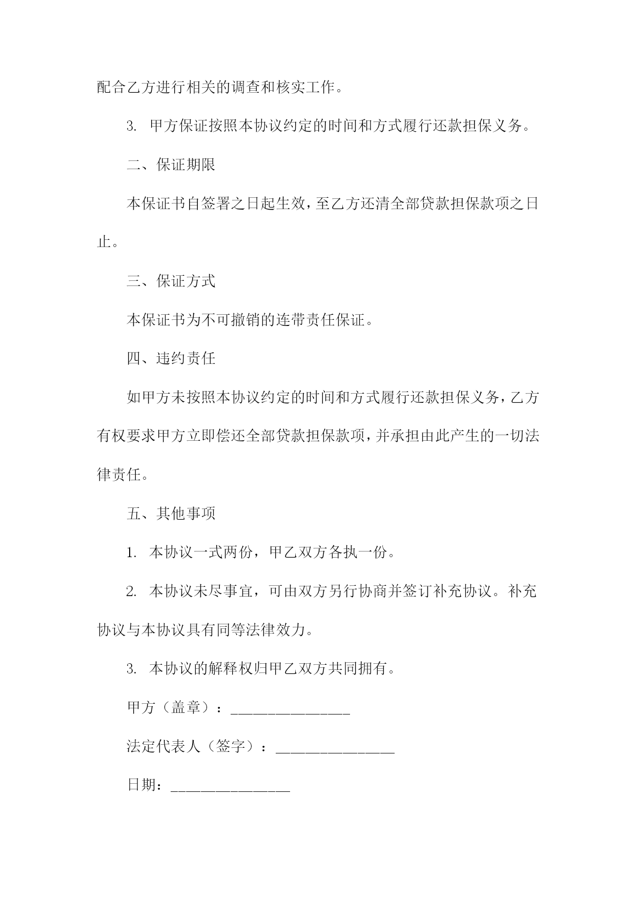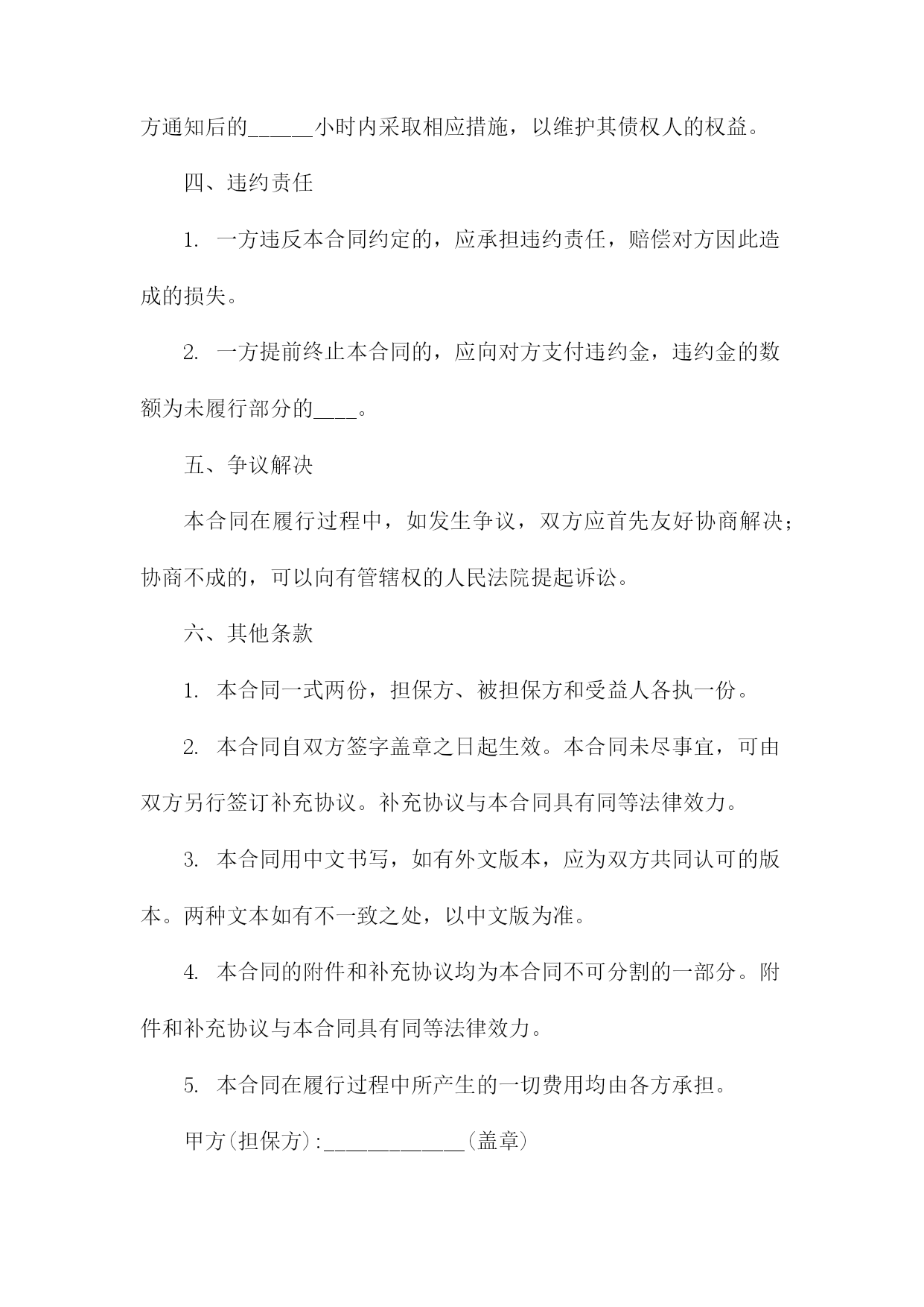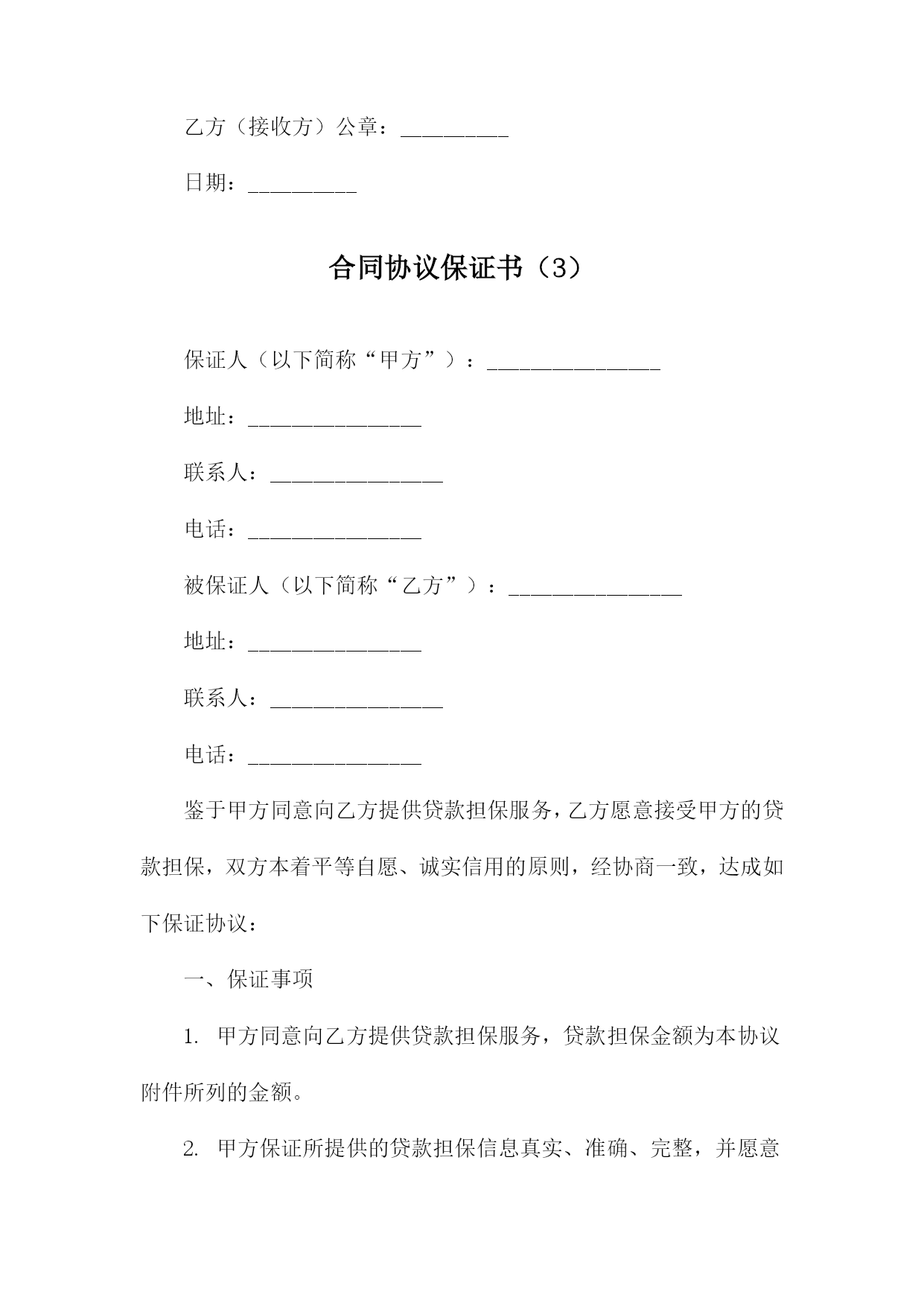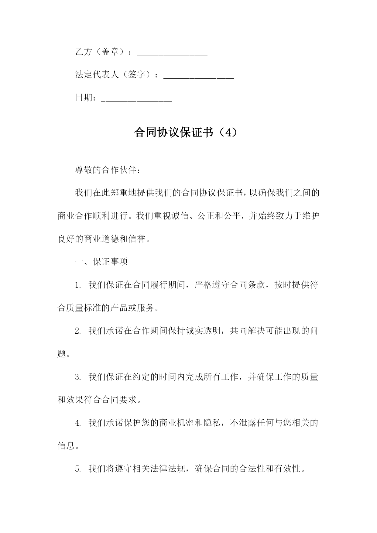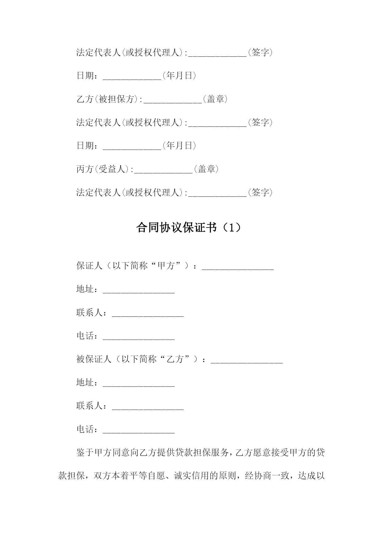 合同协议保证书丙方(受益人):______________(以下简称“受益人”)根据《中华人民共和国合同法》及相关法律法规的规定,为明确各方的权利义务,保障被担保方的合法权益,担保方、被担保方和受益人经友好协商,达成如下协议:一、担保范围1.担保方在本合同项下对被担保方承担以下责任:(具体列出担保方式及期限)2.本合同项下的担保范围仅限于以下事项:(具体列出担保事项)二、担保期限1.本合同自双方签字盖章之日起生效,有效期至______年______月______日。2.本合同期满后,如被担保方未提出续签或解除担保的要求,本合同自动延长至被担保方提出要求之日止。三、担保责任1.担保方在担保期限内对被担保方履行担保责任,包括但不限于提供保证金、提供抵押物等。2.若被担保方未能按照约定履行债务,担保方应在收到被担保方通知后的______小时内采取相应措施,以维护其债权人的权益。四、违约责任1.一方违反本合同约定的,应承担违约责任,赔偿对方因此造成的损失。2.一方提前终止本合同的,应向对方支付违约金,违约金的数额为未履行部分的____。五、争议解决本合同在履行过程中,如发生争议,双方应首先友好协商解决;协商不成的,可以向有管辖权的人民法院提起诉讼。六、其他条款1.本合同一式两份,担保方、被担保方和受益人各执一份。2.本合同自双方签字盖章之日起生效。本合同未尽事宜,可由双方另行签订补充协议。补充协议与本合同具有同等法律效力。3.本合同用中文书写,如有外文版本,应为双方共同认可的版本。两种文本如有不一致之处,以中文版为准。4.本合同的附件和补充协议均为本合同不可分割的一部分。附件和补充协议与本合同具有同等法律效力。5.本合同在履行过程中所产生的一切费用均由各方承担。甲方(担保方):_____________(盖章)法定代表人(或授权代理人):_____________(签字)日期:_____________(年月日)乙方(被担保方):_____________(盖章)法定代表人(或授权代理人):_____________(签字)日期:_____________(年月日)丙方(受益人):_____________(盖章)法定代表人(或授权代理人):_____________(签字)合同协议保证书(1)保证人(以下简称“甲方”):________________地址:________________联系人:________________电话:________________被保证人(以下简称“乙方”):________________地址:________________联系人:________________电话:________________鉴于甲方同意向乙方提供贷款担保服务,乙方愿意接受甲方的贷款担保,双方本着平等自愿、诚实信用的原则,经协商一致,达成以下条款:1.保证范围:本保证书所指的保证范围包括但不限于:乙方在主合同项下应向甲方支付的全部债务,包括但不限于本金、利息、罚息、违约金、损害赔偿金以及实现债权的费用等。2.保证方式:甲方在本保证书中承担的是不可撤销的无条件连带责任保证,甲方对乙方的债务承担全额连带保证责任,不受乙方与第三方签订的任何其他协议、合同或承诺的影响。3.保证期间:本保证书的保证期间自本合同生效之日起至主合同约定的债务履行期限届满之日起两年。若主合同项下债务分期履行,则保证期间为最后一期债务履行期限届满之日起两年。4.保证责任的履行:甲方在收到乙方要求履行保证责任的书面通知后,应在七个工作日内履行保证责任。若甲方未按照本保证书的规定履行保证责任,甲方同意乙方有权从甲方在乙方开立的任何账户中直接扣除相应的款项以抵偿甲方应承担的保证责任。5.违约责任:若甲方违反本保证书的任何条款,甲方同意向乙方支付主合同项下债务总额的百分之____作为违约金,并赔偿乙方因此遭受的一切损失和费用。6.其他条款:本保证书一式两份,甲乙双方各执一份。本保证书未尽事宜,可由双方另行协商并签订补充协议。本保证书自双方签字(或盖章)之日起生效。甲方(盖章):________________法定代表人授权代表(签字):____________日期:____年__月__日乙方(盖章):________________法定代表人授权代表(签字):____________日期:____年__月__日合同协议保证书(2)尊敬的合作伙伴:我们在此郑重地确认并保证,关于即将签署的合同协议,我们充分理解并愿意遵守其所有条款和条件。本保证书的目的是为了明确我们的责任和承诺,以确保合同的顺利执行和双方的共同利益。一、合同背景本合同协议旨