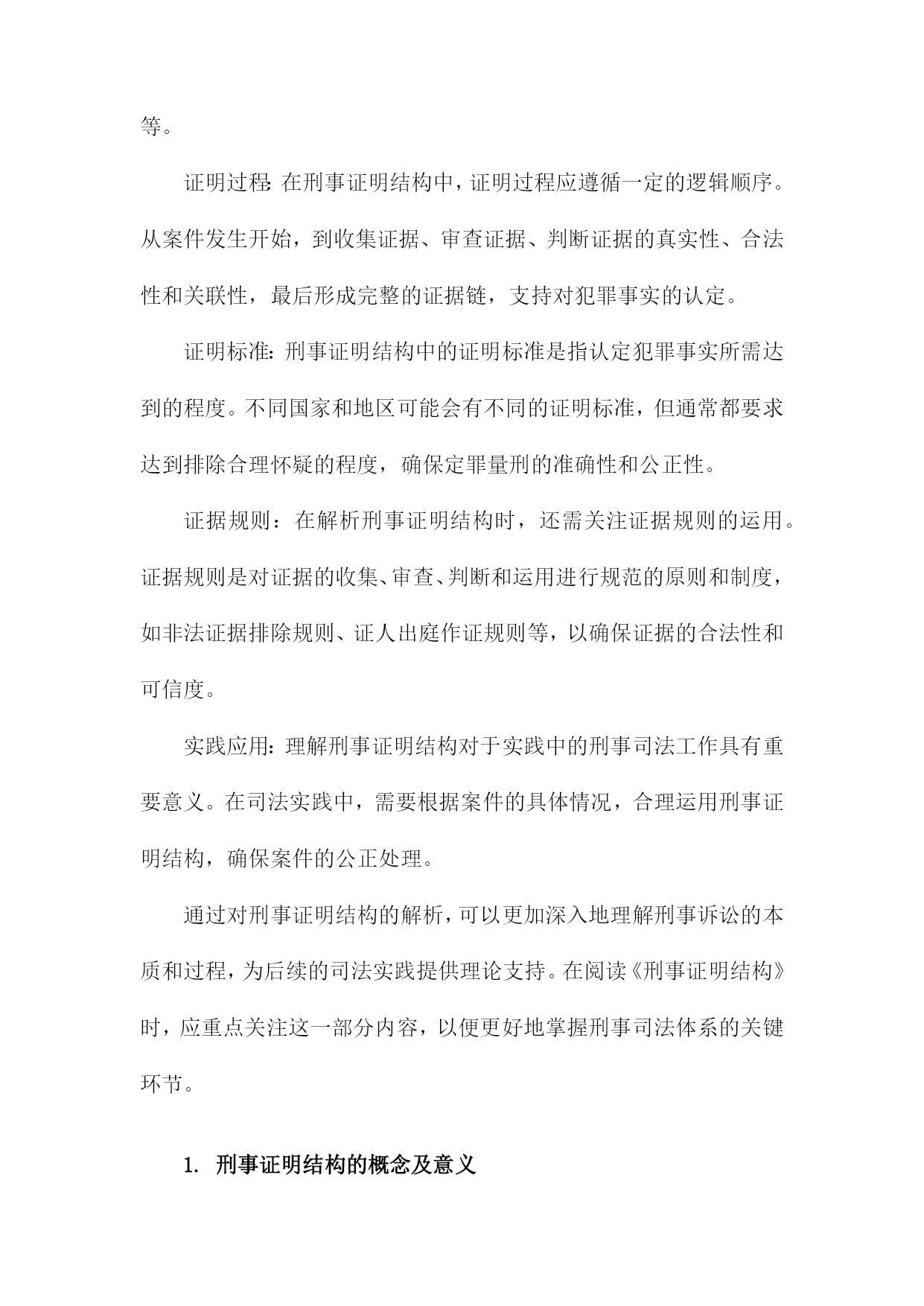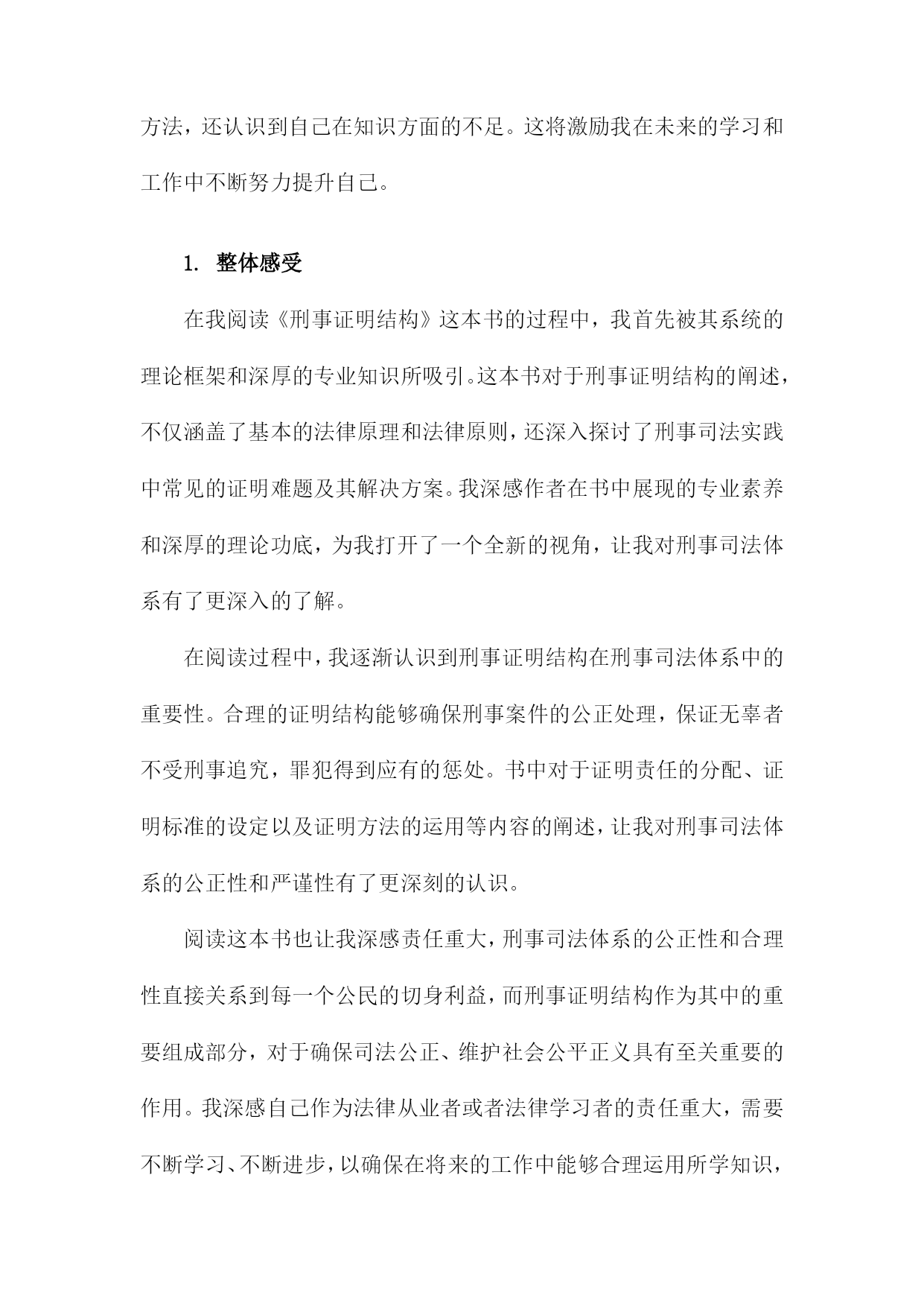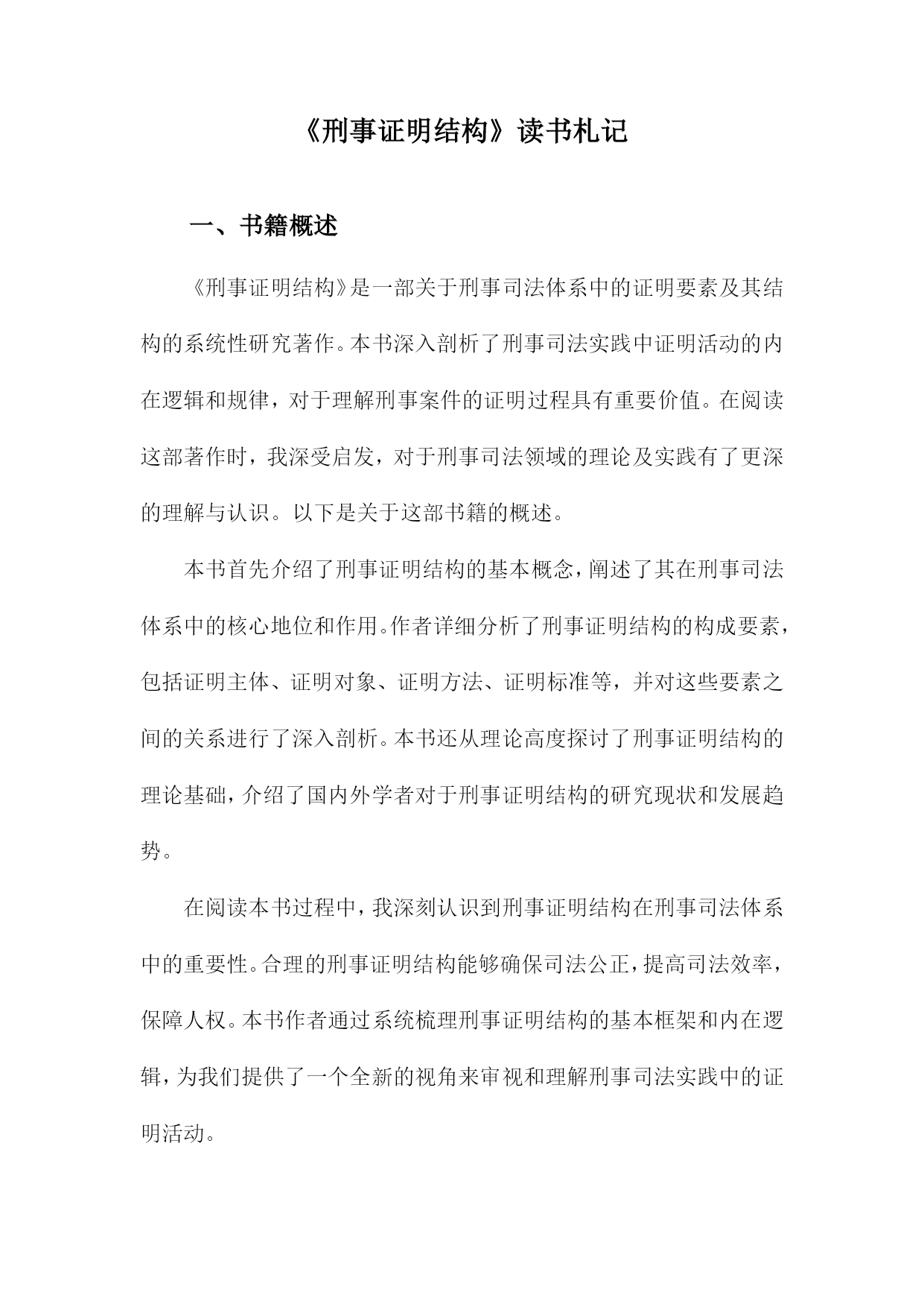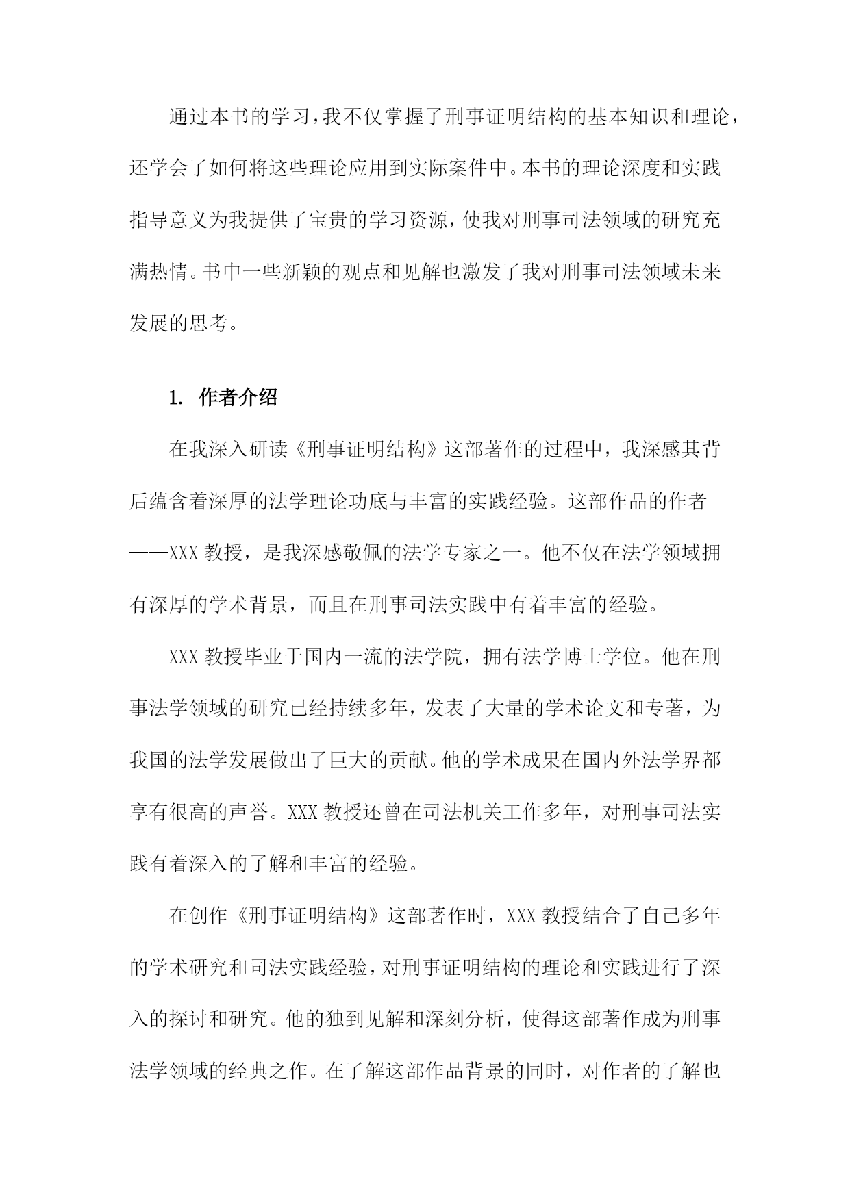 《刑事证明结构》读书札记一、书籍概述《刑事证明结构》是一部关于刑事司法体系中的证明要素及其结构的系统性研究著作。本书深入剖析了刑事司法实践中证明活动的内在逻辑和规律,对于理解刑事案件的证明过程具有重要价值。在阅读这部著作时,我深受启发,对于刑事司法领域的理论及实践有了更深的理解与认识。以下是关于这部书籍的概述。本书首先介绍了刑事证明结构的基本概念,阐述了其在刑事司法体系中的核心地位和作用。作者详细分析了刑事证明结构的构成要素,包括证明主体、证明对象、证明方法、证明标准等,并对这些要素之间的关系进行了深入剖析。本书还从理论高度探讨了刑事证明结构的理论基础,介绍了国内外学者对于刑事证明结构的研究现状和发展趋势。在阅读本书过程中,我深刻认识到刑事证明结构在刑事司法体系中的重要性。合理的刑事证明结构能够确保司法公正,提高司法效率,保障人权。本书作者通过系统梳理刑事证明结构的基本框架和内在逻辑,为我们提供了一个全新的视角来审视和理解刑事司法实践中的证明活动。通过本书的学习,我不仅掌握了刑事证明结构的基本知识和理论,还学会了如何将这些理论应用到实际案件中。本书的理论深度和实践指导意义为我提供了宝贵的学习资源,使我对刑事司法领域的研究充满热情。书中一些新颖的观点和见解也激发了我对刑事司法领域未来发展的思考。1.作者介绍在我深入研读《刑事证明结构》这部著作的过程中,我深感其背后蕴含着深厚的法学理论功底与丰富的实践经验。这部作品的作者——XXX教授,是我深感敬佩的法学专家之一。他不仅在法学领域拥有深厚的学术背景,而且在刑事司法实践中有着丰富的经验。XXX教授毕业于国内一流的法学院,拥有法学博士学位。他在刑事法学领域的研究已经持续多年,发表了大量的学术论文和专著,为我国的法学发展做出了巨大的贡献。他的学术成果在国内外法学界都享有很高的声誉。XXX教授还曾在司法机关工作多年,对刑事司法实践有着深入的了解和丰富的经验。在创作《刑事证明结构》这部著作时,XXX教授结合了自己多年的学术研究和司法实践经验,对刑事证明结构的理论和实践进行了深入的探讨和研究。他的独到见解和深刻分析,使得这部著作成为刑事法学领域的经典之作。在了解这部作品背景的同时,对作者的了解也是不可或缺的。通过深入了解作者,我们可以更好地理解这部著作的深层含义和价值,从而更深入地掌握刑事证明结构的理论和实践。2.书籍背景在阅读《刑事证明结构》了解书籍的背景是至关重要的。该书作为一本专注于刑事司法领域的学术著作,其背景与当前的法治建设紧密相连。随着社会的进步和法治的完善,刑事司法体系逐渐受到越来越多的关注,刑事证明结构作为其中的重要组成部分,更是引起了学者和法律实务工作者的重视。在此背景下,《刑事证明结构》旨在深入探讨刑事证明的结构、原理及其在司法实践中的应用。作者作为长期研究刑事司法领域的专家,通过对国内外相关理论和实践的深入研究,撰写了这本著作。该书的内容涵盖了刑事证明结构的基本理论、发展历程、现实应用以及存在的问题等方面,为读者提供了一个全面、系统的认识框架。该书的出版也反映了当前学术界对于刑事司法领域的关注和研究热点,对于推动中国法治建设具有重要的参考价值。在阅读该书之前,了解这些背景信息有助于读者更好地理解和把握书中的内容,深入领会作者的观点和论述。这些背景信息也有助于读者将书中的理论知识与司法实践相结合,从而更好地应用于实际工作中。在阅读《刑事证明结构》时,对书籍背景的掌握是必不可少的。3.书籍内容概述《刑事证明结构》一书深入探讨了刑事证明的基本结构和要素,以及刑事司法实践中证明活动的实际操作。本书首先对刑事证明的基本概念进行了界定,明确了刑事证明的目的、主体和对象等基本要素,为后续的深入分析打下了坚实的基础。围绕刑事证明的结构展开详细论述,从证据收集、审查、判断到证明过程的逻辑构建,全面揭示了刑事证明结构的内在逻辑和规律。本书还深入剖析了刑事司法实践中常见的证明难题及其成因,提出了针对性的解决方案,对于提高刑事司法实践中的证明质量和效率具有重要意义。本书内容丰富、逻辑清晰、论证充分,是一部系统研究刑事证明结构的佳作。该段落内容概述了书籍的核心内容,包括刑事证明的基本概念、刑事证明结构的详细论述、以及刑事司法实践中证明活动的实际操作和常见问题解决方案等。通过对这些内容的介绍,读者可以初步了解书籍的主要观点和论证逻辑。二、阅读体会在阅读《刑事证明结构》我深受启发。这本书系统而深入地探讨了刑事证明结构的各个方面,让我对刑事司法体系有了更为清晰的认识。我对刑事证明结构的重要性有了更深的理解,在司法实践中,刑事证明结构是确保案件公正处理的关键环节。它涉及到证据的收集、审查、评估以及呈现,直接影响到案件事实的认定和判决结果的公正性。对刑事证明结构的研究,