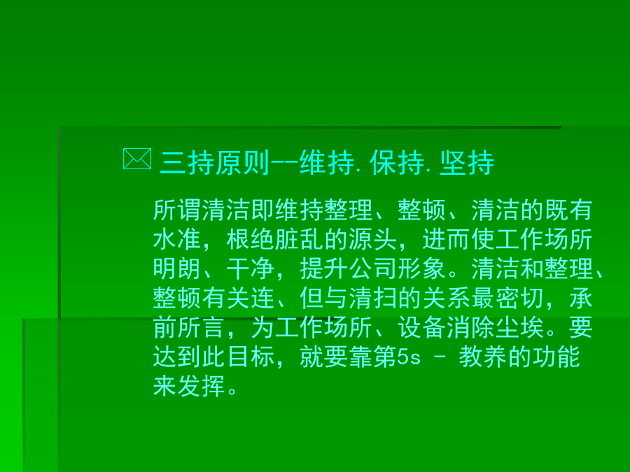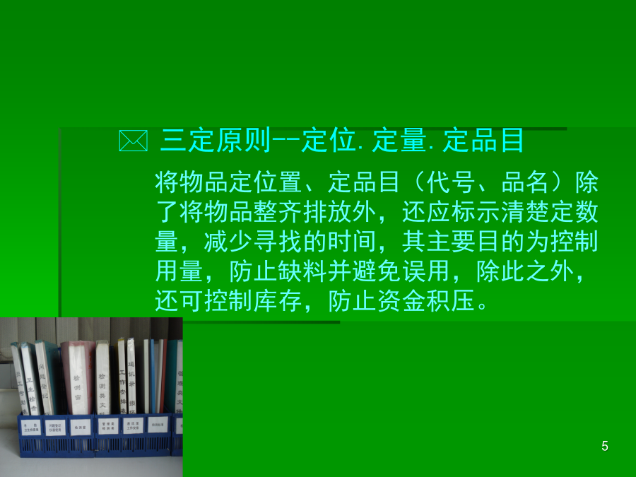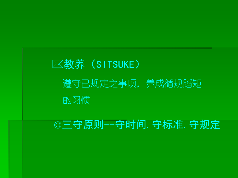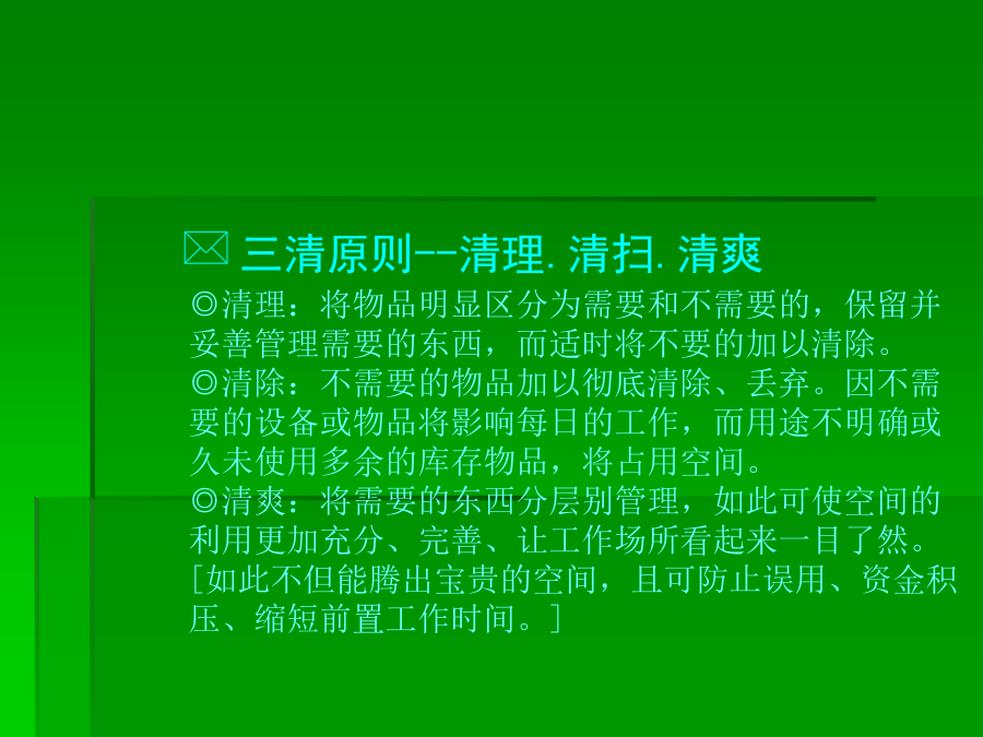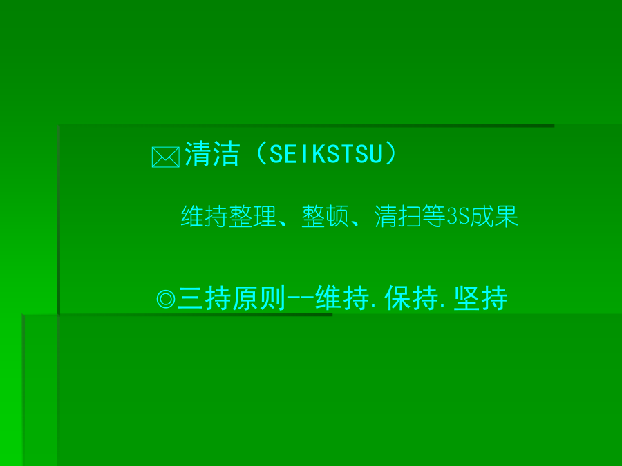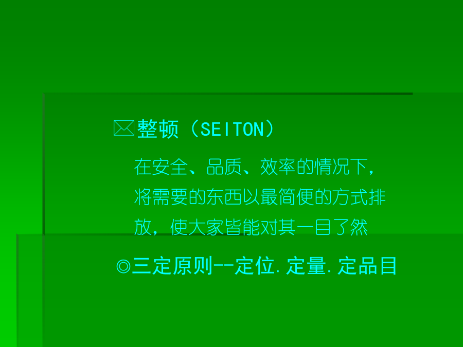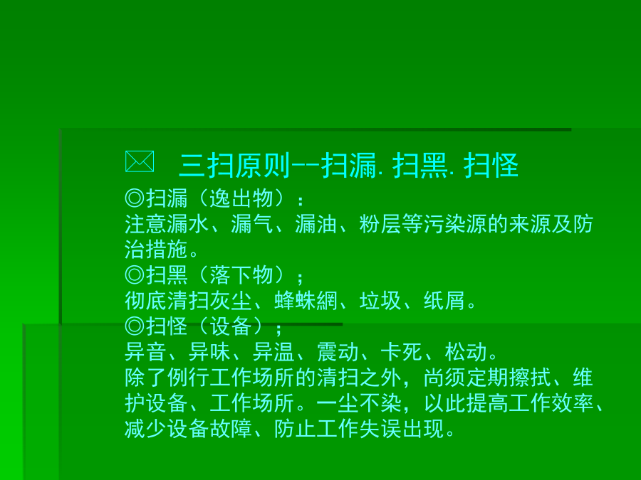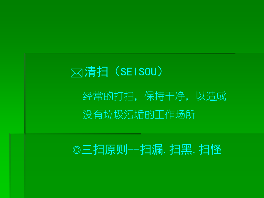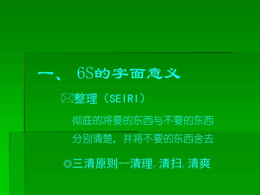 6S培训知识一、******二、推行6S工作的必要性三、推行6S工作实施要领(一)**★红牌张贴对象的决定张贴何处可贴对象涵盖:“库存品”包含样品、器皿、记录、配件等。“现用品”包含记录、设备等★现场检视与红牌张贴坚守客观立场的评判跨部门的纠察小组*三、推行6S工作实施要领(二)第四步:看板(或定位图)管理目的:让需要的物品容易回归原位,使大家都知道在何处、有什么、有多少该项物品★看板(定位图)作战(目视管理)步骤:1、决定物品排放地点2、排放地点的整顿3、排放地点的位置标示4、排放物品的品名、数量标示5、整顿的习惯化(教养)第五步:“3定”是整顿关键★东西的放置方法以3定为原则三、推行6S工作实施要领(三)第三步:决定清扫方法:规定每天5-15分钟之清扫阶段,使清扫习惯化。由清扫顺序中找出必要的清扫用具。注意工具使用方法和使用顺序。第四步:准备清扫用具:准备在清扫所需的用具。用具的放法要好拿、好归位。第五步:实施清扫:方法:★扫除地板缝隙、墙角、柱子、周围的垃圾及灰尘。★擦拭墙、门、窗等灰尘、污垢。★彻底清除垃圾、纸屑、面杂、油污、油迹、锈、尘、沙、涂料等的污染物。★使表面恢复原状。★污垢不容易清洗时,可用去污剂清洗。★由全员一起清扫。三、推行6S工作实施要领(四)三、推行6S工作实施要领(五)四、6S的重要性五、执行中的可能阻碍第一阶段:首先把工作场所清理干净●(行动的5S)第二阶段:5S的习惯化●(有效果的5S)第三阶段:成为一流的5S部门●(预防性的5S)***※结语※结语