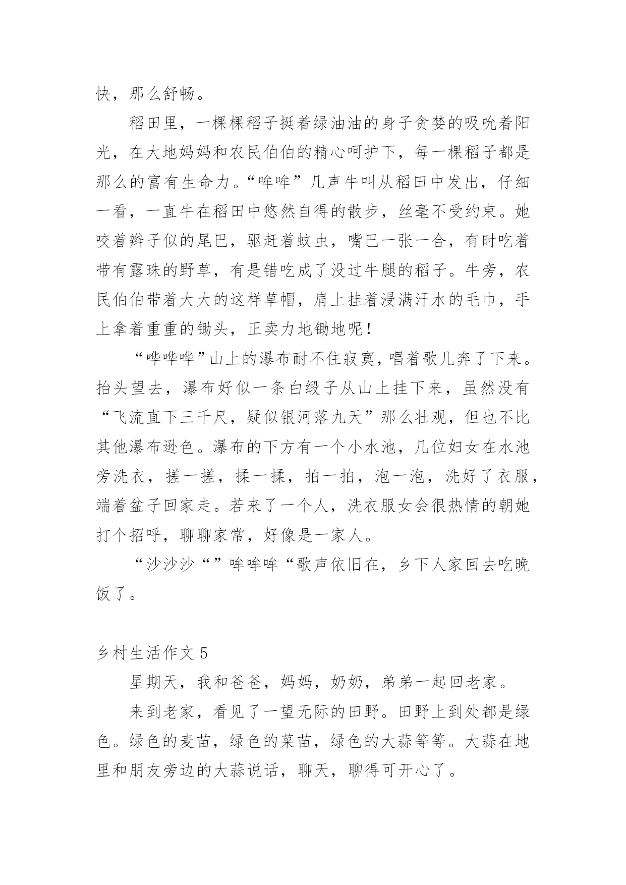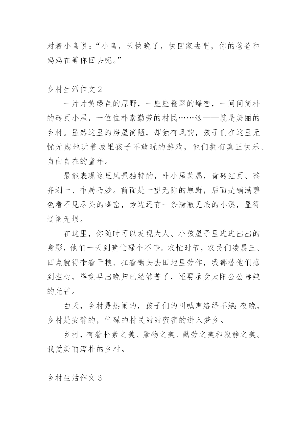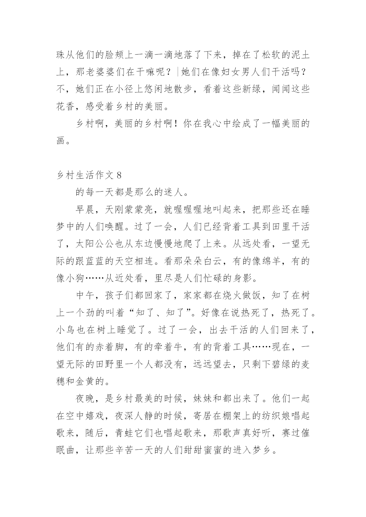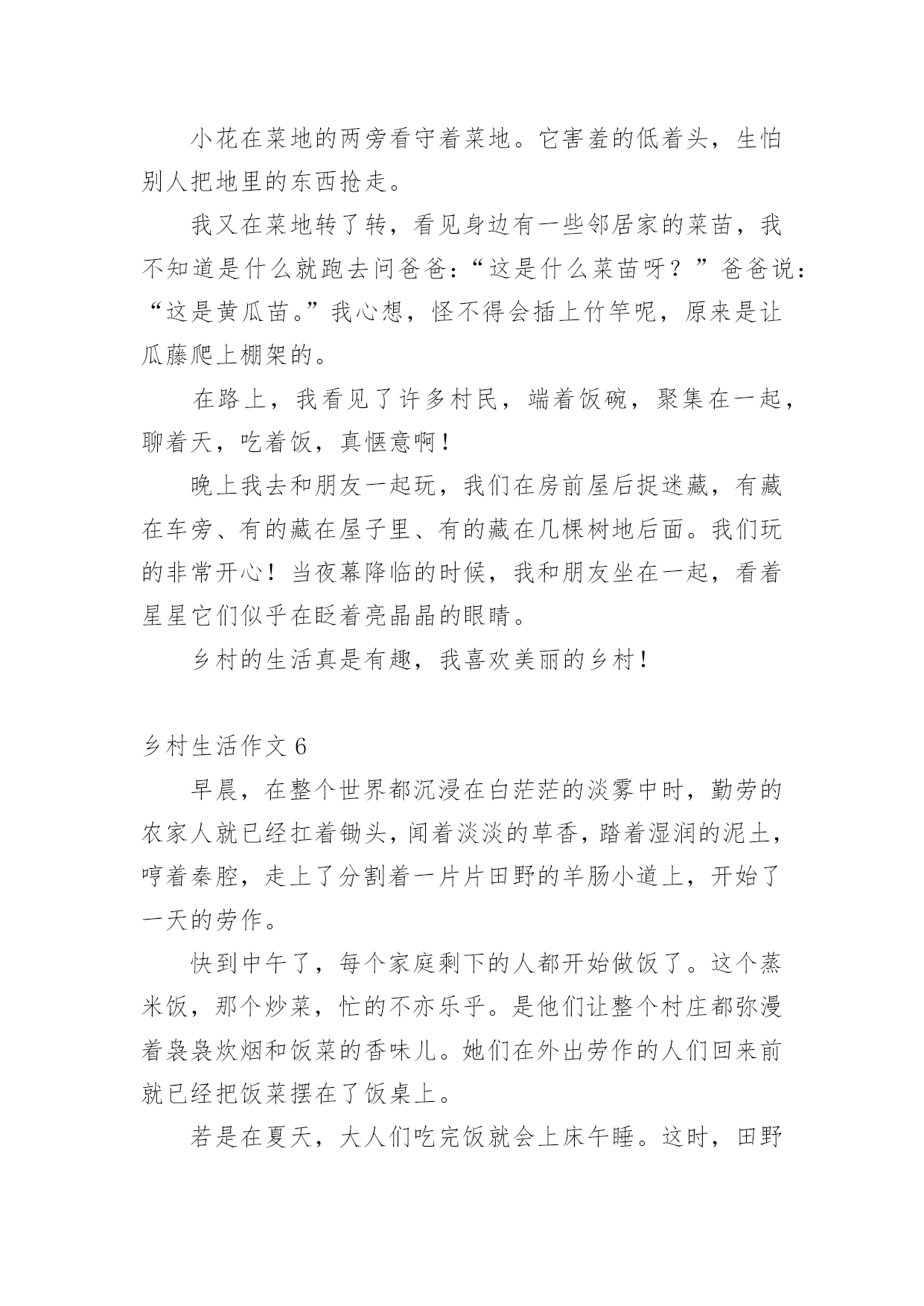 乡村生活作文乡村生活作文15篇在平时的学习、工作或生活中,大家总少不了接触作文吧,作文是从内部言语向外部言语的过渡,即从经过压缩的简要的、自己能明白的语言,向开展的、具有规范语法结构的、能为他人所理解的外部语言形式的转化。那么,怎么去写作文呢?下面是小编精心整理的乡村生活作文,欢迎大家分享。乡村生活作文1小明是一个留守儿童,他的家住在农村。他家有一座漂亮的房子,房子周围有一片草地,附近还有许许多多的树林。房前有一株苹果树,沉甸甸的苹果挂在树枝上,压得树枝弯下了腰;还有一株红枣树,高大的树上结满了红彤彤的枣子。小明放学回到家里,园子里的小黄牛看见后,高兴地发出“哞、哞”的叫声,小明连忙放下书包,赶紧来到院子里。他顾不上吃一口桃子和杏子,就首先给它喂草。旁边一只小花猫懒洋洋地躺在树底下,还眯着眼睛睡懒觉。小明又拉开一扇小门,将七只鸭子赶出门外,鸭子高高兴兴地拍着翅膀,飞快地朝河边跑去,一边跑,一边发出“嘠、嘠”的声音,惊动了树丛中的一只小鸟,敏捷的飞到屋顶上。小明看到后,对着小鸟说:“小鸟,天快晚了,快回家去吧,你的爸爸和妈妈在等你回去呢。”乡村生活作文2一片片黄绿色的原野,一座座叠翠的峰峦,一间间简朴的砖瓦小屋,一位位朴素勤劳的村民……这——就是美丽的乡村。虽然这里的房屋简陋,却独有风韵,孩子们在这里无忧无虑地玩着城里孩子不敢玩的游戏,他们拥有真正快乐、自由自在的童年。最能表现这里风景独特的,非小屋莫属,青砖红瓦、整齐划一、布局巧妙。前面是一望无际的原野,后面是铺满碧色看不见尽头的峰峦,旁边还有一条清澈见底的小溪,显得辽阔无垠。在这里,你随时可以发现大人、小孩屋子里进进出出的身影,他们一天到晚忙碌个不停。农忙时节,农民们凌晨三、四点就得带着干粮、扛着锄头去田地里劳作,我都替他们感到担心,毕竟早出晚归已经够苦了,还要承受太阳公公毒辣的光芒。白天,乡村是热闹的,孩子们的叫喊声络绎不绝;夜晚,乡村是安静的,忙碌的村民甜甜蜜蜜的进入梦乡。乡村,有着朴素之美、景物之美、勤劳之美和寂静之美。我爱美丽淳朴的乡村。乡村生活作文3我喜欢繁华的城市,但我也喜欢恬静的乡村。清晨,东方刚刚泛白,一切都灰蒙蒙的,大地好像穿了一件白衬衫。“喔——喔——喔——”随着这几声鸡叫,太阳公公探出了头,美丽的乡村顿时热闹了起来。鸟儿们欢乐地唱起歌来,小溪叮叮咚咚地弹着琴,精神饱满的人们开始了一天的劳动。中午,阳光变得强烈了,天气也开始炎热了。大树无精打采地站着,知了一个劲地叫着。小鸟也没像早晨那样欢快。可勤劳的农民却在田野里干活,他们一个个专心致志,有的在除草,有的在耕地,哪怕在这么炎热的天气里也不喊一声累。到了傍晚,这时夕阳红红的,微风柔柔的。田间的小路上,劳作了一天的农民伯伯带着满身的泥土和汗水,扛着农具,携着霞辉,哼着走调的小曲儿往村走。落日余辉,也染红了半边天宇。黄昏像一位贵妇人,更加丰腴华美了。傍晚,月亮姐姐来站岗了,温柔的月光如同水一般平静地洒在我们的脸上。那一颗颗小星星眨着闪闪亮亮的眼睛,美极了。柔和的月光,闪亮的星星伴随着人们进入甜美的梦乡。乡村似一幅连绵不断的画卷,让人流连忘返。乡村生活作文4“沙沙沙”“哗哗哗”,什么声响和着农民的鼻音,洗衣妇女的话声,在乡村中飘荡?忽快忽慢,忽急忽缓,那么欢快,那么舒畅。稻田里,一棵棵稻子挺着绿油油的身子贪婪的吸吮着阳光,在大地妈妈和农民伯伯的精心呵护下,每一棵稻子都是那么的富有生命力。“哞哞”几声牛叫从稻田中发出,仔细一看,一直牛在稻田中悠然自得的散步,丝毫不受约束。她咬着辫子似的尾巴,驱赶着蚊虫,嘴巴一张一合,有时吃着带有露珠的野草,有是错吃成了没过牛腿的稻子。牛旁,农民伯伯带着大大的这样草帽,肩上挂着浸满汗水的毛巾,手上拿着重重的锄头,正卖力地锄地呢!“哗哗哗”山上的瀑布耐不住寂寞,唱着歌儿奔了下来。抬头望去,瀑布好似一条白缎子从山上挂下来,虽然没有“飞流直下三千尺,疑似银河落九天”那么壮观,但也不比其他瀑布逊色。瀑布的下方有一个小水池,几位妇女在水池旁洗衣,搓一搓,揉一揉,拍一拍,泡一泡,洗好了衣服,端着盆子回家走。若来了一个人,洗衣服女会很热情的朝她打个招呼,聊聊家常,好像是一家人。“沙沙沙“”哞哞哞“歌声依旧在,乡下人家回去吃晚饭了。乡村生活作文5星期天,我和爸爸,妈妈,奶奶,弟弟一起回老家。来到老家,看见了一望无际的田野。田野上到处都是绿色。绿色的麦苗,绿色的菜苗,绿色的大蒜等等。大蒜在地里和朋友旁边的大蒜说话,聊天,聊得可开心了。小花在菜地的两旁看守着菜地。它害羞的低着头,生怕别人把地里的东西抢走。我又在菜地转了转,看见身边有一些邻居家的菜苗,我不知道是什么就跑去问爸爸:“这是什么菜苗呀?”爸爸说:“这是黄瓜苗。”我心想,怪不得会插上竹竿呢,原来是让瓜藤爬上棚架的。在路上,我看见了许多村民,端