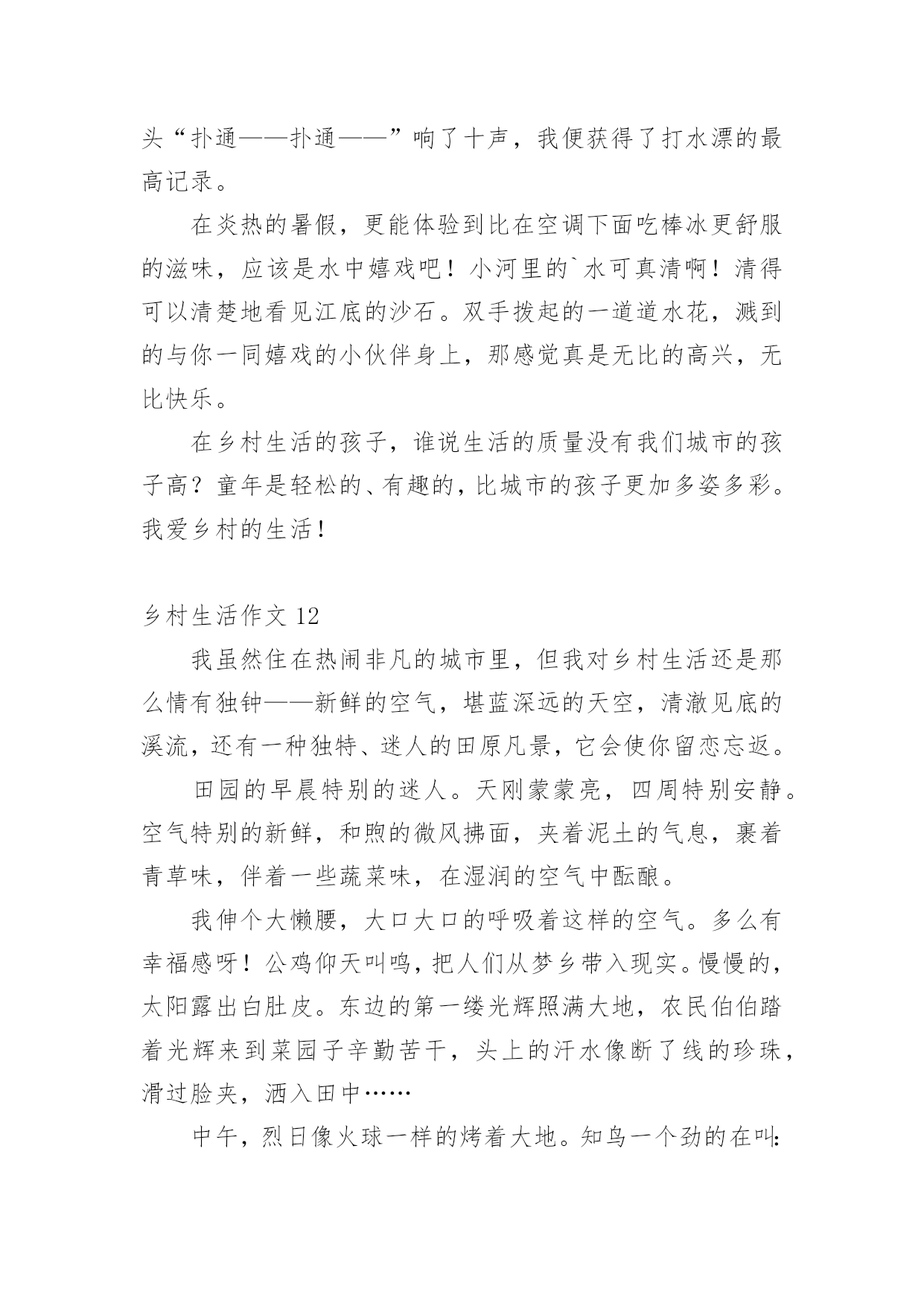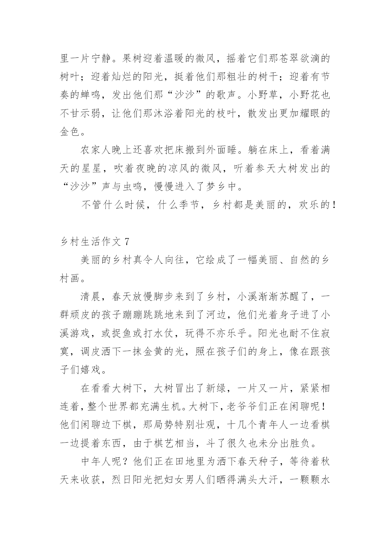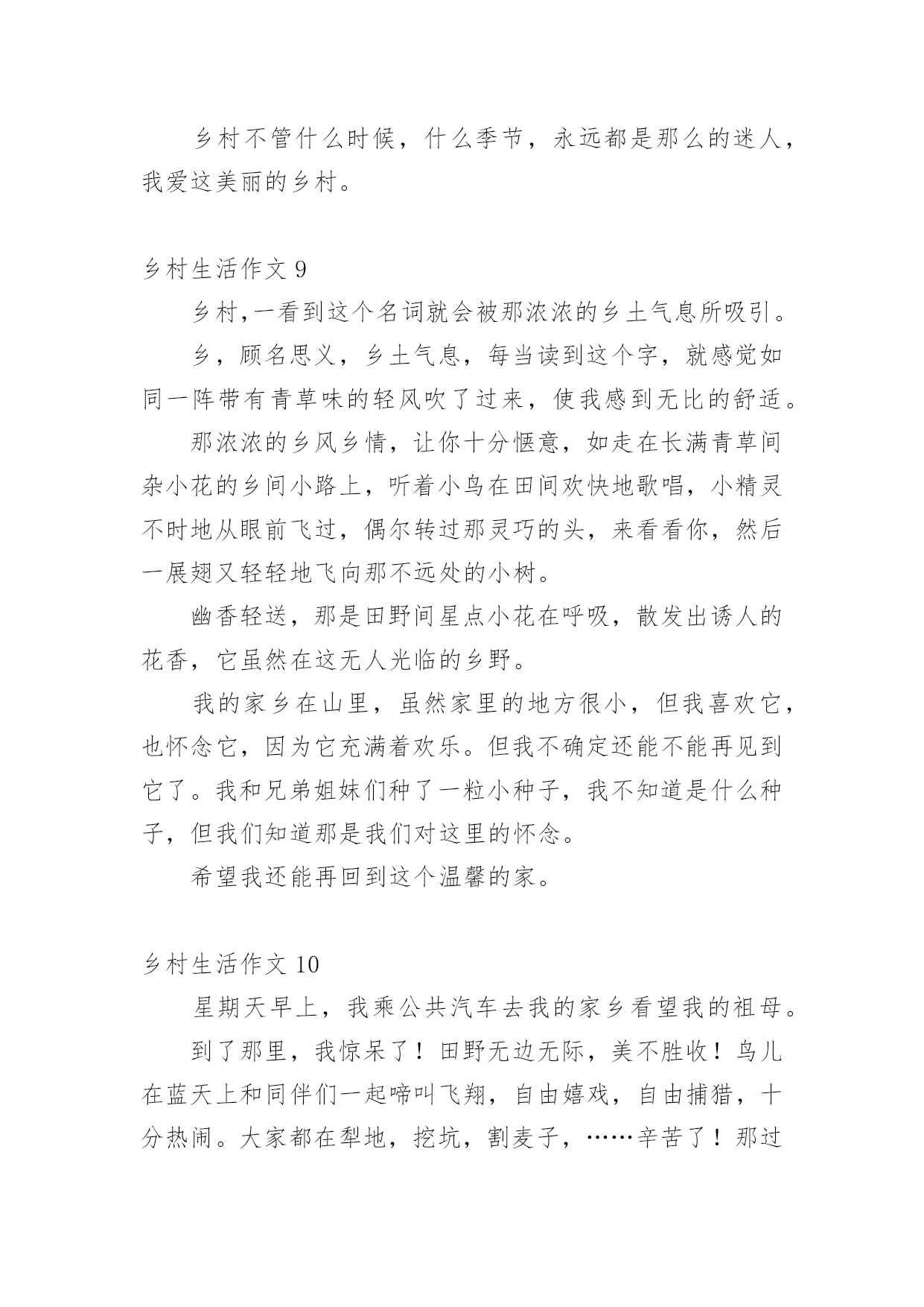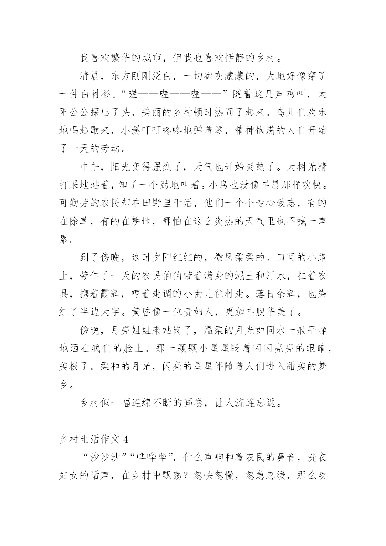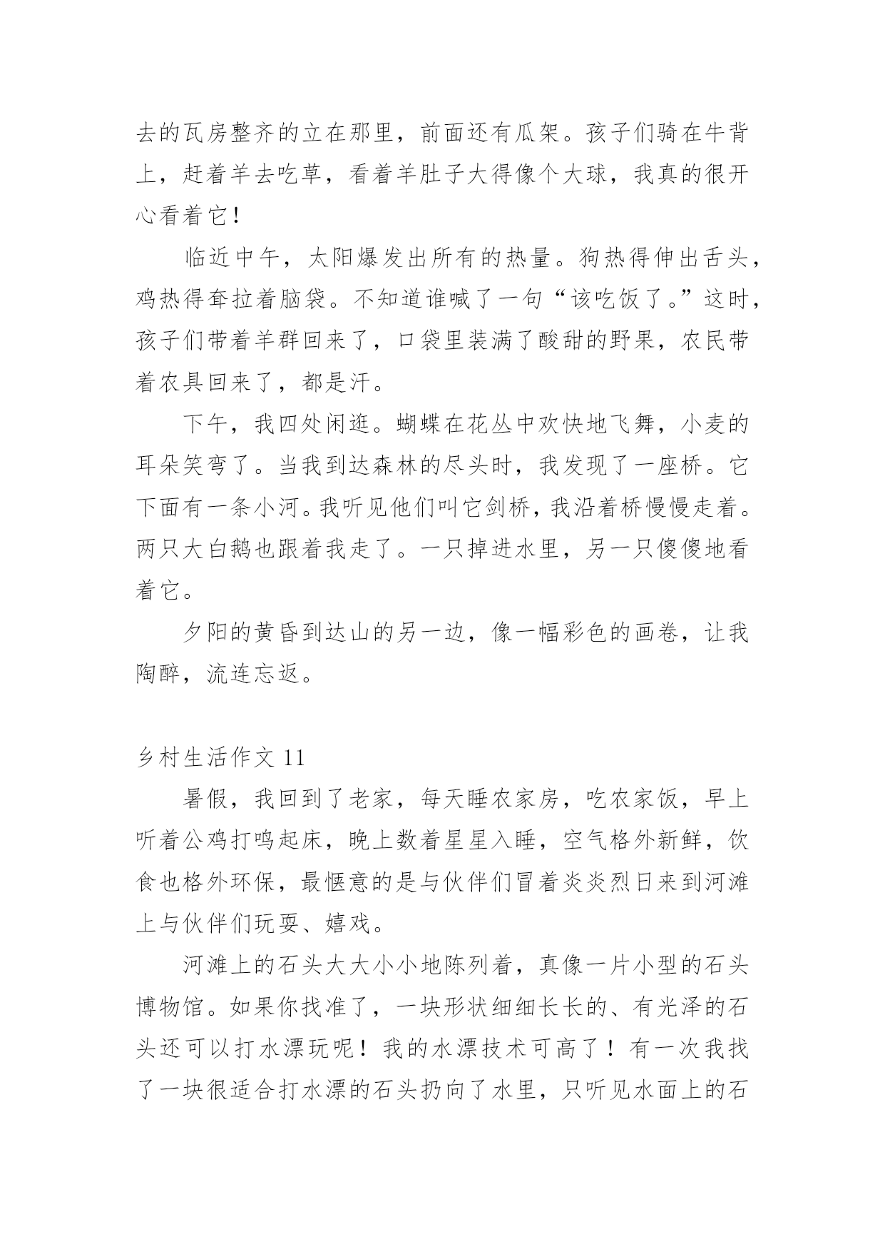 乡村生活作文乡村生活作文15篇在平时的学习、工作或生活中,大家总少不了接触作文吧,作文是从内部言语向外部言语的过渡,即从经过压缩的简要的、自己能明白的语言,向开展的、具有规范语法结构的、能为他人所理解的外部语言形式的转化。那么,怎么去写作文呢?下面是小编精心整理的乡村生活作文,欢迎大家分享。乡村生活作文1小明是一个留守儿童,他的家住在农村。他家有一座漂亮的房子,房子周围有一片草地,附近还有许许多多的树林。房前有一株苹果树,沉甸甸的苹果挂在树枝上,压得树枝弯下了腰;还有一株红枣树,高大的树上结满了红彤彤的枣子。小明放学回到家里,园子里的小黄牛看见后,高兴地发出“哞、哞”的叫声,小明连忙放下书包,赶紧来到院子里。他顾不上吃一口桃子和杏子,就首先给它喂草。旁边一只小花猫懒洋洋地躺在树底下,还眯着眼睛睡懒觉。小明又拉开一扇小门,将七只鸭子赶出门外,鸭子高高兴兴地拍着翅膀,飞快地朝河边跑去,一边跑,一边发出“嘠、嘠”的声音,惊动了树丛中的一只小鸟,敏捷的飞到屋顶上。小明看到后,对着小鸟说:“小鸟,天快晚了,快回家去吧,你的爸爸和妈妈在等你回去呢。”乡村生活作文2一片片黄绿色的原野,一座座叠翠的峰峦,一间间简朴的砖瓦小屋,一位位朴素勤劳的村民……这——就是美丽的乡村。虽然这里的房屋简陋,却独有风韵,孩子们在这里无忧无虑地玩着城里孩子不敢玩的游戏,他们拥有真正快乐、自由自在的童年。最能表现这里风景独特的,非小屋莫属,青砖红瓦、整齐划一、布局巧妙。前面是一望无际的原野,后面是铺满碧色看不见尽头的峰峦,旁边还有一条清澈见底的小溪,显得辽阔无垠。在这里,你随时可以发现大人、小孩屋子里进进出出的身影,他们一天到晚忙碌个不停。农忙时节,农民们凌晨三、四点就得带着干粮、扛着锄头去田地里劳作,我都替他们感到担心,毕竟早出晚归已经够苦了,还要承受太阳公公毒辣的光芒。白天,乡村是热闹的,孩子们的叫喊声络绎不绝;夜晚,乡村是安静的,忙碌的村民甜甜蜜蜜的进入梦乡。乡村,有着朴素之美、景物之美、勤劳之美和寂静之美。我爱美丽淳朴的乡村。乡村生活作文3我喜欢繁华的城市,但我也喜欢恬静的乡村。清晨,东方刚刚泛白,一切都灰蒙蒙的,大地好像穿了一件白衬衫。“喔——喔——喔——”随着这几声鸡叫,太阳公公探出了头,美丽的乡村顿时热闹了起来。鸟儿们欢乐地唱起歌来,小溪叮叮咚咚地弹着琴,精神饱满的人们开始了一天的劳动。中午,阳光变得强烈了,天气也开始炎热了。大树无精打采地站着,知了一个劲地叫着。小鸟也没像早晨那样欢快。可勤劳的农民却在田野里干活,他们一个个专心致志,有的在除草,有的在耕地,哪怕在这么炎热的天气里也不喊一声累。到了傍晚,这时夕阳红红的,微风柔柔的。田间的小路上,劳作了一天的农民伯伯带着满身的泥土和汗水,扛着农具,携着霞辉,哼着走调的小曲儿往村走。落日余辉,也染红了半边天宇。黄昏像一位贵妇人,更加丰腴华美了。傍晚,月亮姐姐来站岗了,温柔的月光如同水一般平静地洒在我们的脸上。那一颗颗小星星眨着闪闪亮亮的眼睛,美极了。柔和的月光,闪亮的星星伴随着人们进入甜美的梦乡。乡村似一幅连绵不断的画卷,让人流连忘返。乡村生活作文4“沙沙沙”“哗哗哗”,什么声响和着农民的鼻音,洗衣妇女的话声,在乡村中飘荡?忽快忽慢,忽急忽缓,那么欢快,那么舒畅。稻田里,一棵棵稻子挺着绿油油的身子贪婪的吸吮着阳光,在大地妈妈和农民伯伯的精心呵护下,每一棵稻子都是那么的富有生命力。“哞哞”几声牛叫从稻田中发出,仔细一看,一直牛在稻田中悠然自得的散步,丝毫不受约束。她咬着辫子似的尾巴,驱赶着蚊虫,嘴巴一张一合,有时吃着带有露珠的野草,有是错吃成了没过牛腿的稻子。牛旁,农民伯伯带着大大的这样草帽,肩上挂着浸满汗水的毛巾,手上拿着重重的锄头,正卖力地锄地呢!“哗哗哗”山上的瀑布耐不住寂寞,唱着歌儿奔了下来。抬头望去,瀑布好似一条白缎子从山上挂下来,虽然没有“飞流直下三千尺,疑似银河落九天”那么壮观,但也不比其他瀑布逊色。瀑布的下方有一个小水池,几位妇女在水池旁洗衣,搓一搓,揉一揉,拍一拍,泡一泡,洗好了衣服,端着盆子回家走。若来了一个人,洗衣服女会很热情的朝她打个招呼,聊聊家常,好像是一家人。“沙沙沙“”哞哞哞“歌声依旧在,乡下人家回去吃晚饭了。乡村生活作文5星期天,我和爸爸,妈妈,奶奶,弟弟一起回老家。来到老家,看见了一望无际的田野。田野上到处都是绿色。绿色的麦苗,绿色的菜苗,绿色的大蒜等等。大蒜在地里和朋友旁边的大蒜说话,聊天,聊得可开心了。小花在菜地的两旁看守着菜地。它害羞的低着头,生怕别人把地里的东西抢走。我又在菜地转了转,看见身边有一些邻居家的菜苗,我不知道是什么就跑去问爸爸:“这是什么菜苗呀?”爸爸说:“这是黄瓜苗。”我心想,怪不得会插上竹竿呢,原来是让瓜藤爬上棚架的。在路上,我看见了许多村民,端