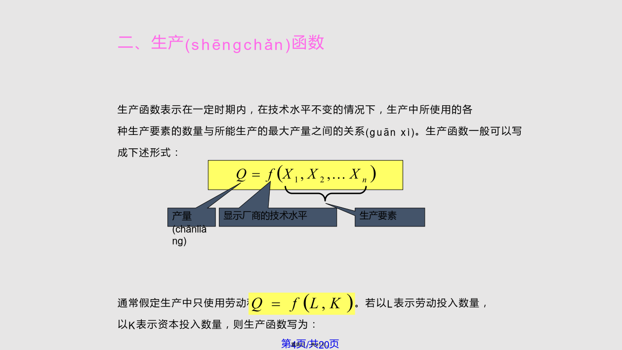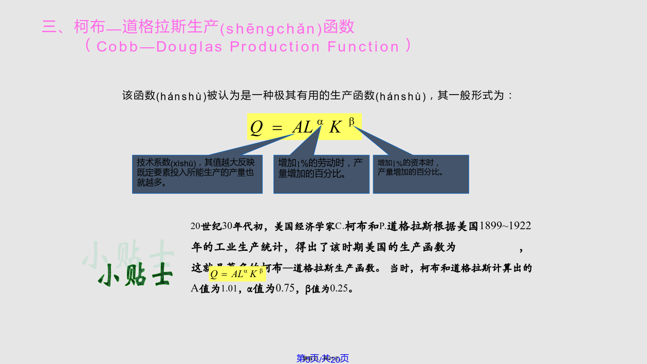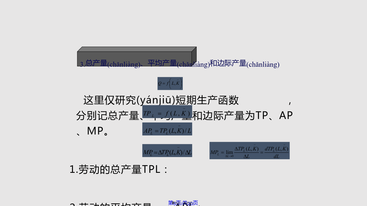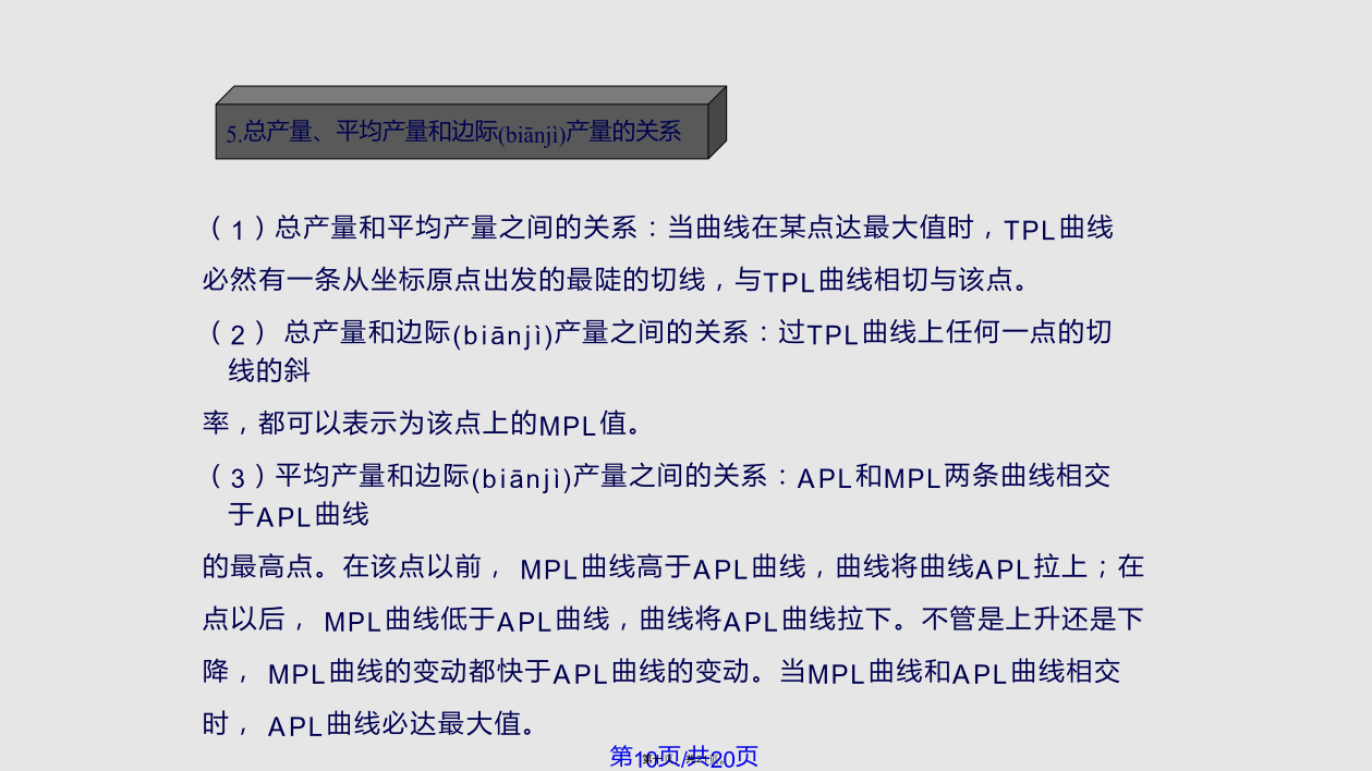 任务一了解厂商(chǎngshāng)的本质与类型二、厂商的本质(běnzhì)和目标任务(rènwu)二短期生产函数二、生产(shēngchǎn)函数三、柯布—道格拉斯生产(shēngchǎn)函数(Cobb—DouglasProductionFunction)四、一种可变要素的生产(shēngchǎn)函数(短期生产(shēngchǎn)函数)在生产函数Q=f(L,K)中,假定资本投入量是固定的,用K表示,劳动投入量是可变的,用L表示,则生产函数可以写成:这就是通常采用的一种(yīzhǒnꞬ)可变生产要素的生产函数的形式,它也被称为短期生产函数。这里仅研究(yánjiū)短期生产函数,分别记总产量、平均产量和边际产量为TP、AP、MP。1.劳动的总产量TPL:2.劳动的平均产量APL:3.劳动的边际产量MPL:或(1)边际报酬递减规律的内容:在技术水平不变的条件下,在连续地、等量地把某一种可变生产要素增加到其它一种或几种数量不变的生产要素上去的过程中,当这种可变生产要素的投入量小于某一特定值时,增加一单位该要素的投入量所带来的边际产量是递增的;当这种可变要素的投入量连续增加并超过这个特定值时,增加一单位的要素的投入量所带来的边际产量是递减的。(2)边际报酬递减规律的成立原因:在任何产品的生产过程中,可变生产要素投入量和固定生产要素投入量之间都存在着一个最佳的组合比例。开始时,由于可变要素的投入量为零,而不变要素的投入量总是存在的(并存在剩余),生产要素的组合比例远远没有达到最佳状态。随着可变要素投入量的逐渐增加,生产要素的组合越来越接近最佳组合比例。在这一过程中,可变要素的边际产量必然呈递增的趋势(qūshì)。一旦生产要素的组合达到最佳组合比例时,可变要素的边际产量达最大值。在这之后,随着可变要素投入量的继续增加,生产要素的组合将越来越偏离最佳组合比例,可变要素的边际产量便呈递减的趋势(qūshì)了。(1)总产量和平均产量之间的关系:当曲线在某点达最大值时,TPL曲线必然有一条从坐标原点出发的最陡的切线,与TPL曲线相切与该点。(2)总产量和边际(biānjì)产量之间的关系:过TPL曲线上任何一点的切线的斜率,都可以表示为该点上的MPL值。(3)平均产量和边际(biānjì)产量之间的关系:APL和MPL两条曲线相交于APL曲线的最高点。在该点以前,MPL曲线高于APL曲线,曲线将曲线APL拉上;在点以后,MPL曲线低于APL曲线,曲线将APL曲线拉下。不管是上升还是下降,MPL曲线的变动都快于APL曲线的变动。当MPL曲线和APL曲线相交时,APL曲线必达最大值。任务(rènwu)三了解两种可变生产要素投入的最佳组合——长期生产函数边际替代率在维持产量水平不变的条件下,增加一单位某种生产要素(yàosù)投入量时所减少的另一种要素(yàosù)的投入数量,被称为边际技术替代率。劳动对资本的边际技术替代率的定义公式为:等成本线是在既定的成本和既定生产要素价格条件下生产者可以购买到的两种生产要素的各种不同数量(shùliàng)组合的轨迹。假定要素市场上既定的劳动的价格即工资率为w,既定的资本的价格即利息率为r,厂商既定的成本支出为C,则等成本线的方程可写为:C=wL+rK4.最优生产要素投入(tóurù)组合两种要素最优投入组合的条件:该条件表明:为了实现既定成本条件下的最大产量,厂商必须选择最优的生产要素组合,使得两要素的边际技术替代(tìdài)率等于两要素价格比值,而且此时两种要素价格之比恰好与两种要素的边际产量之比相等。六、规模(guīmó)报酬谢谢(xièxie)大家!感谢您的观看(guānkàn)!内容(nèiróng)总结