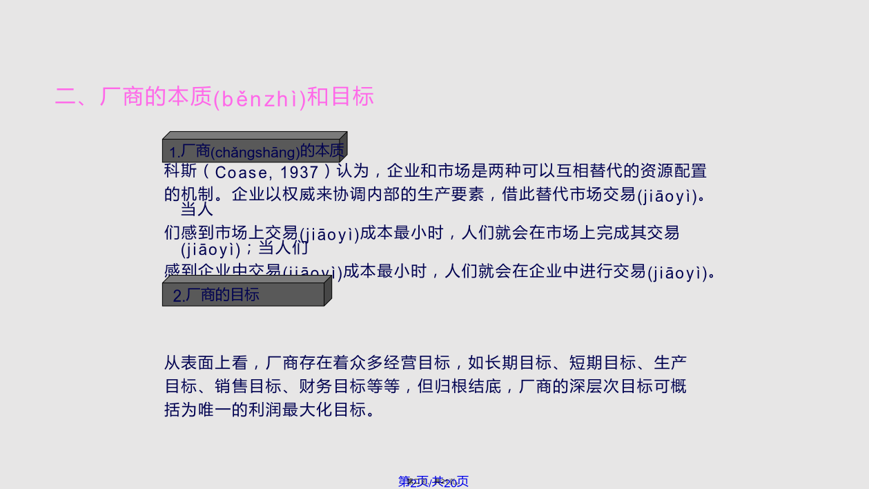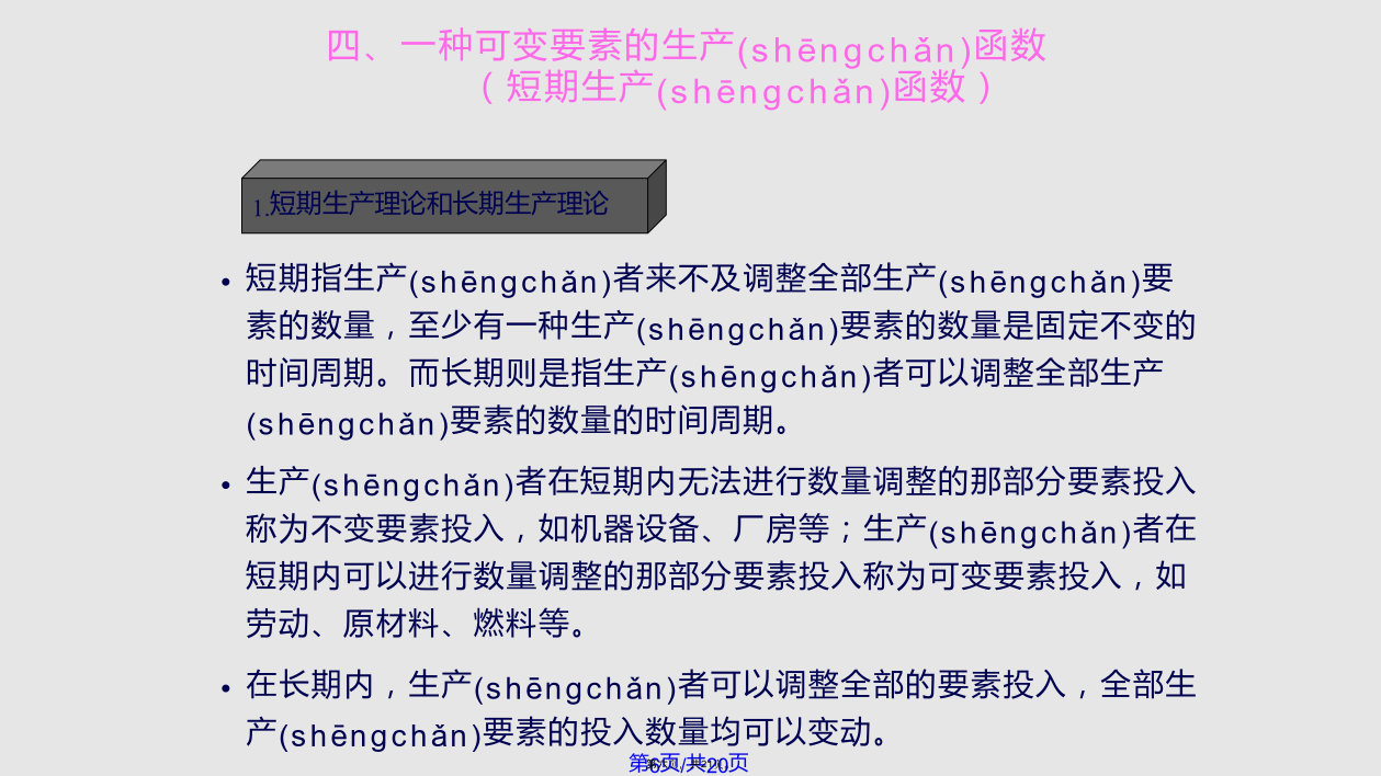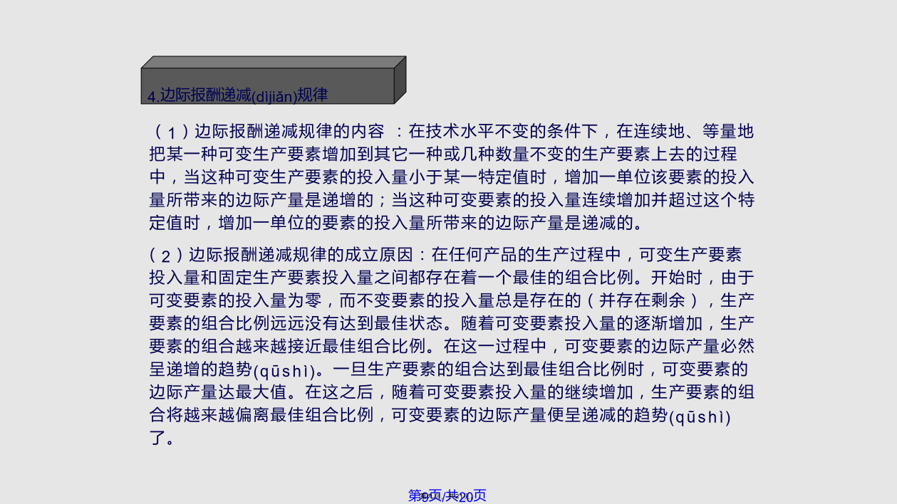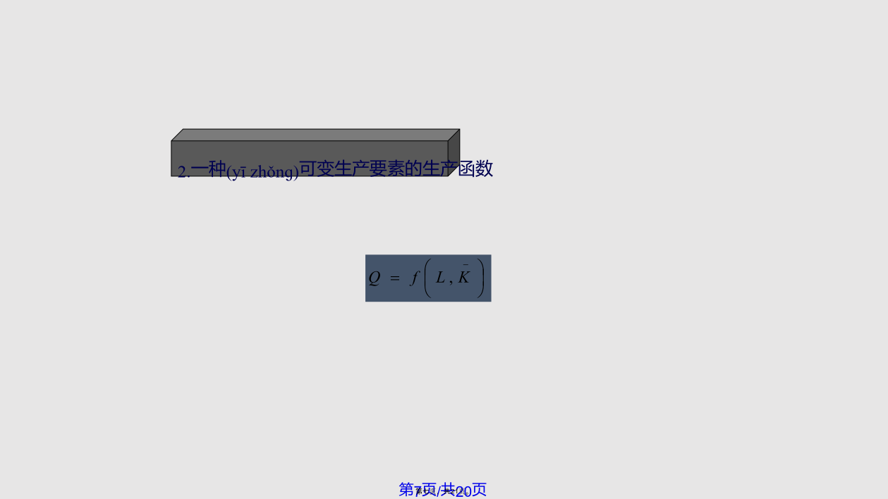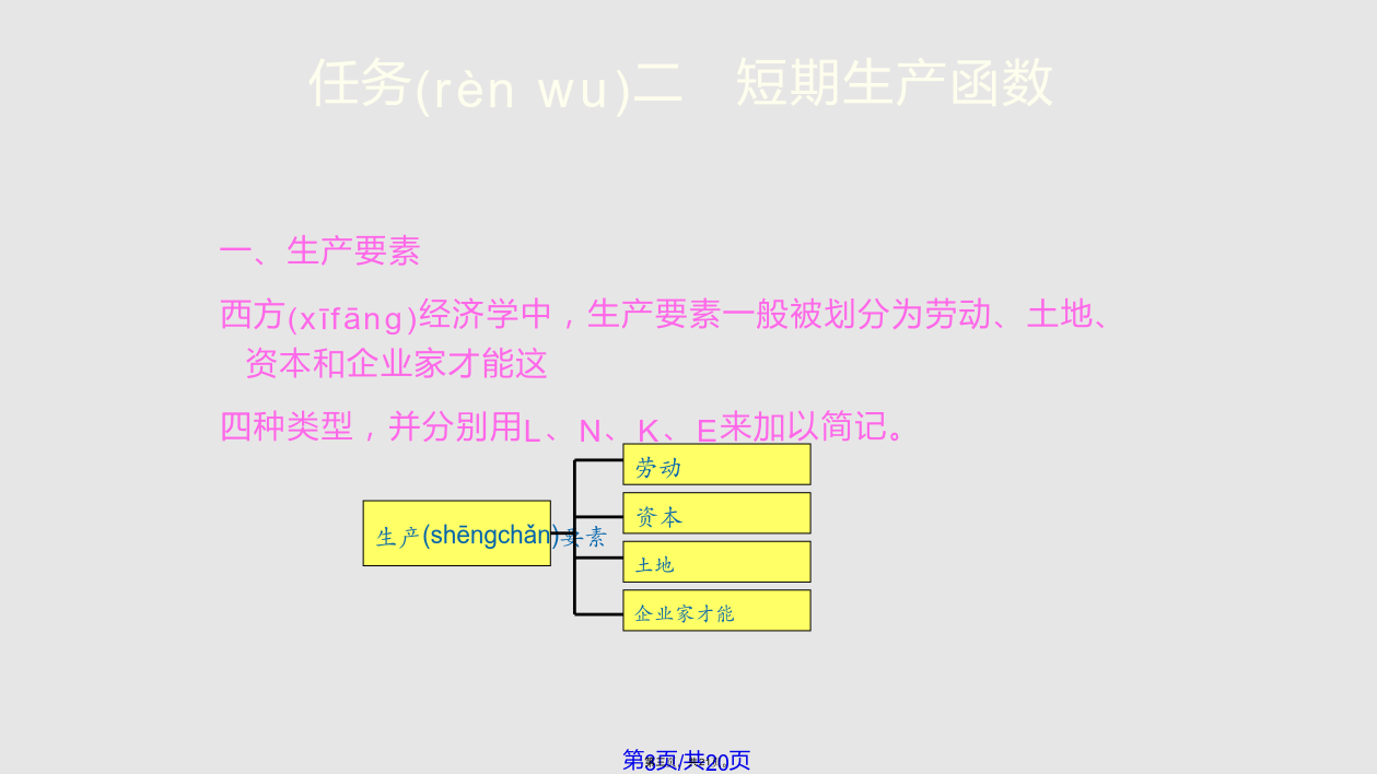 任务一了解厂商(chǎngshāng)的本质与类型二、厂商的本质(běnzhì)和目标任务(rènwu)二短期生产函数二、生产(shēngchǎn)函数三、柯布—道格拉斯生产(shēngchǎn)函数(Cobb—DouglasProductionFunction)四、一种可变要素的生产(shēngchǎn)函数(短期生产(shēngchǎn)函数)在生产函数Q=f(L,K)中,假定资本投入量是固定的,用K表示,劳动投入量是可变的,用L表示,则生产函数可以写成:这就是通常采用的一种(yīzhǒnꞬ)可变生产要素的生产函数的形式,它也被称为短期生产函数。这里仅研究(yánjiū)短期生产函数,分别记总产量、平均产量和边际产量为TP、AP、MP。1.劳动的总产量TPL:2.劳动的平均产量APL:3.劳动的边际产量MPL:或(1)边际报酬递减规律的内容:在技术水平不变的条件下,在连续地、等量地把某一种可变生产要素增加到其它一种或几种数量不变的生产要素上去的过程中,当这种可变生产要素的投入量小于某一特定值时,增加一单位该要素的投入量所带来的边际产量是递增的;当这种可变要素的投入量连续增加并超过这个特定值时,增加一单位的要素的投入量所带来的边际产量是递减的。(2)边际报酬递减规律的成立原因:在任何产品的生产过程中,可变生产要素投入量和固定生产要素投入量之间都存在着一个最佳的组合比例。开始时,由于可变要素的投入量为零,而不变要素的投入量总是存在的(并存在剩余),生产要素的组合比例远远没有达到最佳状态。随着可变要素投入量的逐渐增加,生产要素的组合越来越接近最佳组合比例。在这一过程中,可变要素的边际产量必然呈递增的趋势(qūshì)。一旦生产要素的组合达到最佳组合比例时,可变要素的边际产量达最大值。在这之后,随着可变要素投入量的继续增加,生产要素的组合将越来越偏离最佳组合比例,可变要素的边际产量便呈递减的趋势(qūshì)了。(1)总产量和平均产量之间的关系:当曲线在某点达最大值时,TPL曲线必然有一条从坐标原点出发的最陡的切线,与TPL曲线相切与该点。(2)总产量和边际(biānjì)产量之间的关系:过TPL曲线上任何一点的切线的斜率,都可以表示为该点上的MPL值。(3)平均产量和边际(biānjì)产量之间的关系:APL和MPL两条曲线相交于APL曲线的最高点。在该点以前,MPL曲线高于APL曲线,曲线将曲线APL拉上;在点以后,MPL曲线低于APL曲线,曲线将APL曲线拉下。不管是上升还是下降,MPL曲线的变动都快于APL曲线的变动。当MPL曲线和APL曲线相交时,APL曲线必达最大值。任务(rènwu)三了解两种可变生产要素投入的最佳组合——长期生产函数边际替代率在维持产量水平不变的条件下,增加一单位某种生产要素(yàosù)投入量时所减少的另一种要素(yàosù)的投入数量,被称为边际技术替代率。劳动对资本的边际技术替代率的定义公式为:等成本线是在既定的成本和既定生产要素价格条件下生产者可以购买到的两种生产要素的各种不同数量(shùliàng)组合的轨迹。假定要素市场上既定的劳动的价格即工资率为w,既定的资本的价格即利息率为r,厂商既定的成本支出为C,则等成本线的方程可写为:C=wL+rK4.最优生产要素投入(tóurù)组合两种要素最优投入组合的条件:该条件表明:为了实现既定成本条件下的最大产量,厂商必须选择最优的生产要素组合,使得两要素的边际技术替代(tìdài)率等于两要素价格比值,而且此时两种要素价格之比恰好与两种要素的边际产量之比相等。六、规模(guīmó)报酬谢谢(xièxie)大家!感谢您的观看(guānkàn)!内容(nèiróng)总结