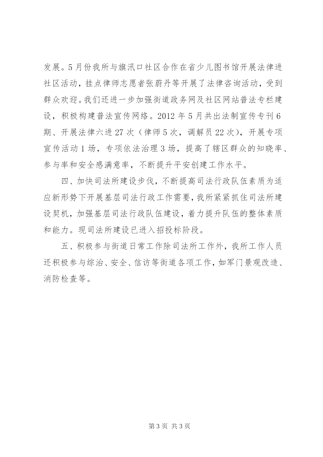 第PAGE\*Arabic\*MERGEFORMAT3页共NUMPAGES\*MERGEFORMAT3页司法所年度工作汇报材料一、落实排查调处机制,扎实做好人民调解工作一是完善矛盾纠纷排查调处分析例会制度。司法所不断完善月工作例会制度,要求社区调解员对当月发生的纠纷、累积未调解成功的纠纷、潜在纠纷及可能引起激化、涉法涉讼、群体性上访的纠纷进行排查,研究对策,并及时上报紧急情况。二是是加强调解业务工作培训,采取以会代训的形式对调委会主任进行培训,提高业务技能,增强调解能力。主要有加强调解文书、档案制作的培训。三是加强矛盾纠纷案件登记工作,确保调解的疑难案件做好卷宗,口头案件及时登记,并配合区司法局做好调解案件的奖励工作,按照调解的数量、难易对调解员进行奖励,提高了调解员的积极性。四是深入开展矛盾纠纷排查活动,及时发现倾向性、苗头性问题,摸清底数,确保对矛盾纠纷做到底数清、情况明,调处及时。结合军门社区景观改造,组织调解员深入社区做好宣传及纠纷调处工作。五、协助信访做好接访工作。六、5月份,街道及社区调委会共调解民间纠纷28起,调解成功数28起(其中有卷宗记录的3起,口头登记25起),辖区没有出现矛盾纠纷激化事件及因矛盾纠纷激化引发的非正常死亡和民转刑案件。二、加强重点对象管理,全面落实安置帮教和社区矫正工作(一)安置帮教工作认真开展“两劳”释解人员安置帮教工作,积极做好司法所、社区、家庭无缝衔接机制,全面落实刑释解教人员接回机制。认真做好司法部刑释解教管理平台上户籍在我辖区的服刑在押人员的信息摸底工作,五月份核实成功0人。开展辖区刑释解教人员核查工作,与社区核对底数,现辖区衔接刑释解教人员28人,新增已衔接人员4人,全部落实了帮教措施。(二)社区矫正工作加强对社区服刑人员的监管工作,加强对社区矫正工作者的培训,提高社区矫正工作者的政治业务素质。我们按照省市区相关文件规定认真细致的开展社区矫正工作,健全相关管理教育制度,规范档案材料,提升管理教育水平。强化社区服刑人员的电子监管工作,每天开展手机定位,定期实行人机合一,严防脱管漏管和重新违法犯罪现象发生。在册社区服刑人员11名,其中缓刑2名、假释3名、暂予监外执行3名,剥夺政治权利3名。三、加大法制宣传力度,扎实推进普法依法治理工作继续坚持开展“法律进社区”活动,深入推进普法及依法治理工作。通过简报、专栏、标语、宣传手册、图片展览、动员会、座谈会、法制讲座、法律咨询、移动手机短信等丰富多彩、行之有效的宣传手段开展以建设“平安东街、和谐社会”为主题的宣传活动,提高辖区干群法律意识和法律素质,推进辖区依法治理工作深入发展。5月份我所与旗汛口社区合作在省少儿图书馆开展法律进社区活动,挂点律师志愿者张蔚丹等开展了法律咨询活动,受到群众欢迎。我们还进一步加强街道政务网及社区网站普法专栏建设,积极构建普法宣传网络。2012年5月共出法制宣传专刊6期、开展法律六进27次(律师5次,调解员22次),开展专项宣传活动1场,专项依法治理3场,提高了辖区群众的知晓率、参与率和安全感满意率,不断提升平安创建工作水平。四、加快司法所建设步伐,不断提高司法行政队伍素质为适应新形势下开展基层司法行政工作需要,我所紧紧抓住司法所建设契机,加强基层司法行政队伍建设,着力提升队伍的整体素质和能力。现司法所建设已进入招投标阶段。五、积极参与街道日常工作除司法所工作外,我所工作人员还积极参与综治、安全、信访等街道各项工作,如军门景观改造、消防检查等。