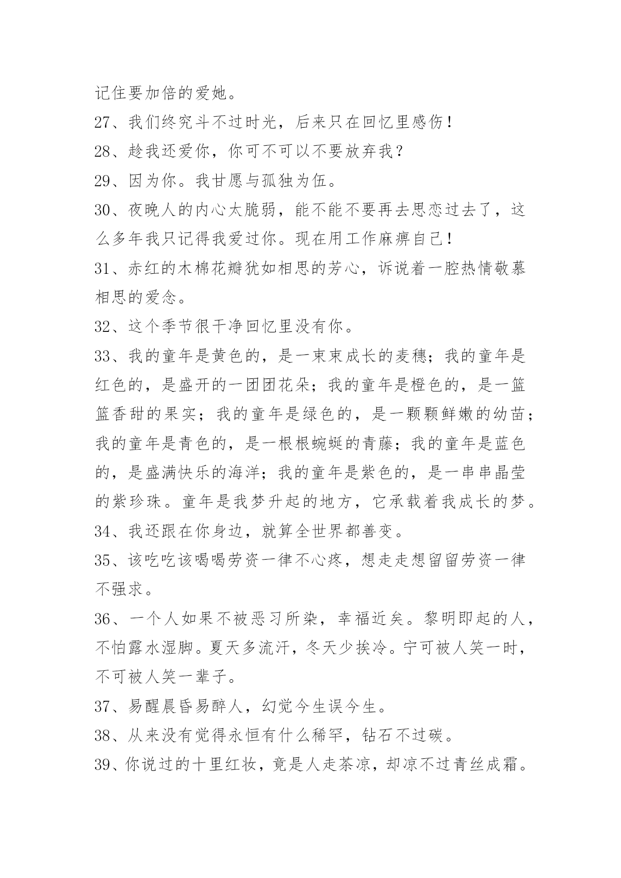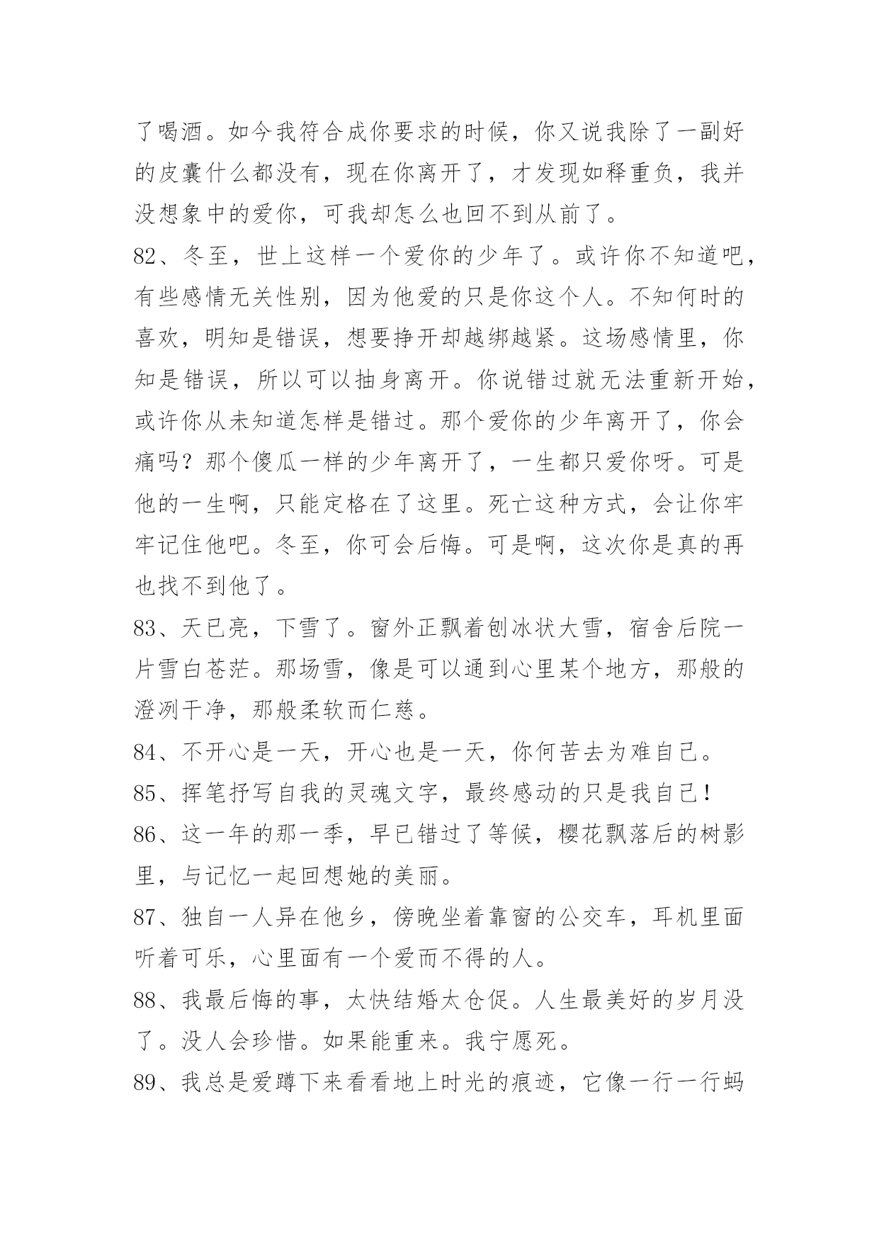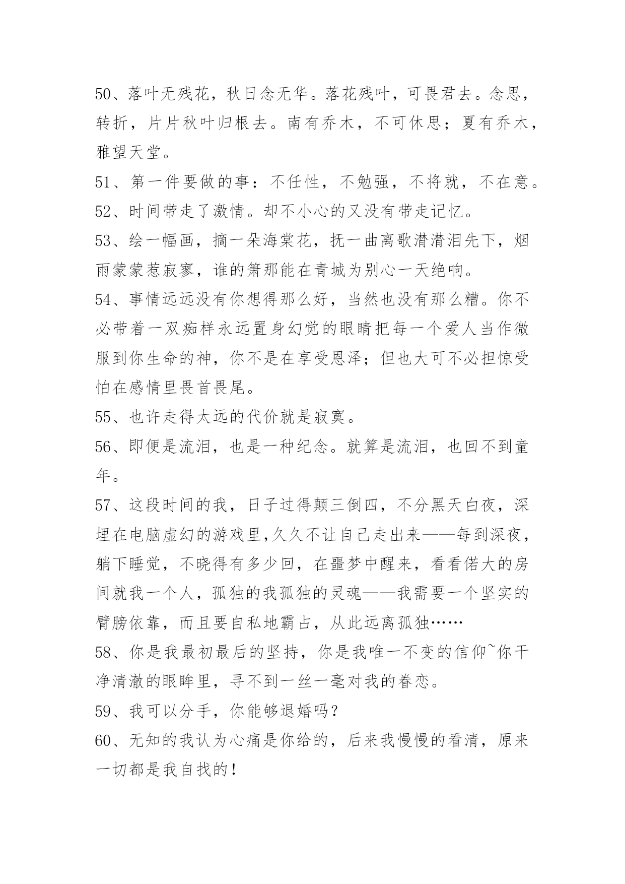 文艺伤感句子90条精选文艺伤感句子集合90条时间是庸医却自称包治百病。下面是小编精心整理的文艺伤感句子90条,供各位参考。1、青烟弥漫了眼角的朦胧,寂廖的墨香,不经意落在风里,偶然的阡陌躅行,竟成了一梦的叹息。2、所谓坚强只不过是比谁更能装得无所谓而已。3、世间最美的距离,不是把你拥在我怀里,而是在你身旁,感受你;时间最美的距离,不是望尽天涯无踪影,而是在你身旁,注目你。4、我一直都很乖,因为,我在期盼着你回过头静静的看着我。5、海霞春潮涌,扬帆万里行。无题沙白秋风送我酒乡行,美人泉边醉流云。6、我们的青春中亦有那摔倒的痛楚与无奈,亦有那失望与伤心。但是,青春中经伤痛洗礼的我们更学会了坚强,风雨中,我们毅然而起。7、生活在爱情的谎言和欺骗中的人们,虽然大家在互相提防,可是群总是走进自己挖下的陷阱,相爱,并不是为了欺骗。8、终于知道什么是撕心裂肺的疼痛。9、曾经的刻骨铭心,如今的撕心裂肺。10、你只知道她让你多心疼,却忘了我也怕冷。11、你不要不开心,这样我很心疼,我知道我帮不了你,但是我会一直陪在你身边。12、微笑着,无声无息的流出眼泪。13、寂寞,借居在人心中的嗔魔。14、我很悲伤,很寂寞,我想得到脱俗红尘的清净,要么出家,要么隐居。15、有了心里太过重要的那个人,你就会终日忧患伤感的句子。不是害怕不够爱,只怕他突然离开。16、我被我的心牵着走。我的心被你牵着走。我不得不想你。17、有时候你想证明给一个人看却不小心让一万个人看到了。但若那一个人不在乎这一万个人便没有意义。18、午后。暖暖,等待邂逅路人甲。19、多想你主动找我一次,可是事不如愿。20、偶尔我也会在别人脸上看到你的笑容21、至始至终我活得都不像是一个忧伤的孩子。22、本不属于同一个世界,我们却偏要跨世纪相伴。23、过去的不再回来,回来的不再完整。24、那是从来不曾悲伤地坐在我身边的你,那是从来不曾快乐地坐在你身边的我——可悲的是,在曲终人散之后,我才恍悟,原来再也不能有你再坐在身边,才是真正的不快乐。25、十年,从童年到成年,从纯真到沉重,从天真到务实。26、没人值得你这样付出,值得你付出的人不会让你伤心难过更不会让你失望。如果有一个人那么那么的相信你…请,记住要加倍的爱她。27、我们终究斗不过时光,后来只在回忆里感伤!28、趁我还爱你,你可不可以不要放弃我?29、因为你。我甘愿与孤独为伍。30、夜晚人的内心太脆弱,能不能不要再去思恋过去了,这么多年我只记得我爱过你。现在用工作麻痹自己!31、赤红的木棉花瓣犹如相思的芳心,诉说着一腔热情敬慕相思的爱念。32、这个季节很干净回忆里没有你。33、我的童年是黄色的,是一束束成长的麦穗;我的童年是红色的,是盛开的一团团花朵;我的童年是橙色的,是一篮篮香甜的果实;我的童年是绿色的,是一颗颗鲜嫩的幼苗;我的童年是青色的,是一根根蜿蜒的青藤;我的童年是蓝色的,是盛满快乐的海洋;我的童年是紫色的,是一串串晶莹的紫珍珠。童年是我梦升起的地方,它承载着我成长的梦。34、我还跟在你身边,就算全世界都善变。35、该吃吃该喝喝劳资一律不心疼,想走走想留留劳资一律不强求。36、一个人如果不被恶习所染,幸福近矣。黎明即起的人,不怕露水湿脚。夏天多流汗,冬天少挨冷。宁可被人笑一时,不可被人笑一辈子。37、易醒晨昏易醉人,幻觉今生误今生。38、从来没有觉得永恒有什么稀罕,钻石不过碳。39、你说过的十里红妆,竟是人走茶凉,却凉不过青丝成霜。40、你说我会遇上更好的,却不知我只要你在我身边,你才是我全世界。41、就像我喜欢太阳,而且却是星星。42、深交后的陌生里,最痛苦的是,两个人都不想陌生,只是因为经历的不同了,思想不同了,然后在两条相反的路上,渐行渐远。43、短信传祝福,问候来相送,愿你早脱单,不再醉于酒;点点情谊浓,片片落叶黄,祝福传好友,早日去脱单。愿你好友11位,获得幸福更长久!44、其实有时候得到了,也不一定是最好的'结果。45、他对我热烈的问候和眼光,只用点头回答,他脸上的神情既不热情,也不冷淡,倒有些像路人般的漠然无情。46、我们带到何方,友谊的纽带总会把我们紧紧相连。47、放下是一种人生幸福的选择。更学会放下才能有快乐和幸福,因为人不快乐、不幸福的原因,就在于对抱在怀中、抗在肩上或装进心里的东西不知道如何放下,就会常常出现莫名的烦恼,带着烦恼,背着包袱去忙碌,必然会因为分心和压力而影响人生的幸福。事实上,人们无论怎么烦恼都无济于事,反而会带来更多的不利结果。既然如此,又何不放下那些困扰自己的东西,全身心地投入到生活中去,才会让生活更加幸福呢。48、[xx]岁的我们,我问你"我们最久多久没见面啊?你答"[xx]年"。49、黄昏再美,不过是结束前的征兆,就像你和我的爱情。50、落叶无残花,秋日念无华。落花残叶,可畏君去。念思,转折,