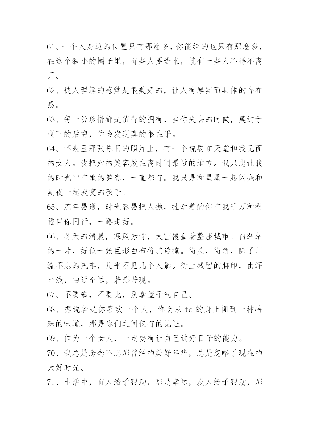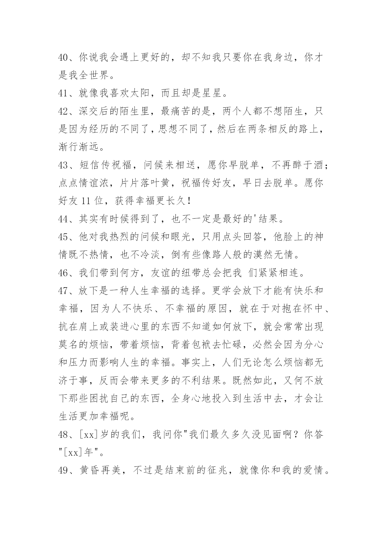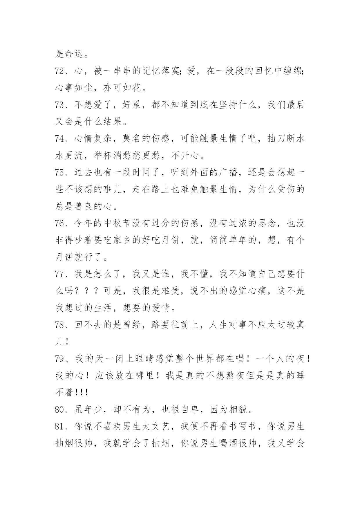 文艺伤感句子90条精选文艺伤感句子集合90条时间是庸医却自称包治百病。下面是小编精心整理的文艺伤感句子90条,供各位参考。1、青烟弥漫了眼角的朦胧,寂廖的墨香,不经意落在风里,偶然的阡陌躅行,竟成了一梦的叹息。2、所谓坚强只不过是比谁更能装得无所谓而已。3、世间最美的距离,不是把你拥在我怀里,而是在你身旁,感受你;时间最美的距离,不是望尽天涯无踪影,而是在你身旁,注目你。4、我一直都很乖,因为,我在期盼着你回过头静静的看着我。5、海霞春潮涌,扬帆万里行。无题沙白秋风送我酒乡行,美人泉边醉流云。6、我们的青春中亦有那摔倒的痛楚与无奈,亦有那失望与伤心。但是,青春中经伤痛洗礼的我们更学会了坚强,风雨中,我们毅然而起。7、生活在爱情的谎言和欺骗中的人们,虽然大家在互相提防,可是群总是走进自己挖下的陷阱,相爱,并不是为了欺骗。8、终于知道什么是撕心裂肺的疼痛。9、曾经的刻骨铭心,如今的撕心裂肺。10、你只知道她让你多心疼,却忘了我也怕冷。11、你不要不开心,这样我很心疼,我知道我帮不了你,但是我会一直陪在你身边。12、微笑着,无声无息的流出眼泪。13、寂寞,借居在人心中的嗔魔。14、我很悲伤,很寂寞,我想得到脱俗红尘的清净,要么出家,要么隐居。15、有了心里太过重要的那个人,你就会终日忧患伤感的句子。不是害怕不够爱,只怕他突然离开。16、我被我的心牵着走。我的心被你牵着走。我不得不想你。17、有时候你想证明给一个人看却不小心让一万个人看到了。但若那一个人不在乎这一万个人便没有意义。18、午后。暖暖,等待邂逅路人甲。19、多想你主动找我一次,可是事不如愿。20、偶尔我也会在别人脸上看到你的笑容21、至始至终我活得都不像是一个忧伤的孩子。22、本不属于同一个世界,我们却偏要跨世纪相伴。23、过去的不再回来,回来的不再完整。24、那是从来不曾悲伤地坐在我身边的你,那是从来不曾快乐地坐在你身边的我——可悲的是,在曲终人散之后,我才恍悟,原来再也不能有你再坐在身边,才是真正的不快乐。25、十年,从童年到成年,从纯真到沉重,从天真到务实。26、没人值得你这样付出,值得你付出的人不会让你伤心难过更不会让你失望。如果有一个人那么那么的相信你…请,记住要加倍的爱她。27、我们终究斗不过时光,后来只在回忆里感伤!28、趁我还爱你,你可不可以不要放弃我?29、因为你。我甘愿与孤独为伍。30、夜晚人的内心太脆弱,能不能不要再去思恋过去了,这么多年我只记得我爱过你。现在用工作麻痹自己!31、赤红的木棉花瓣犹如相思的芳心,诉说着一腔热情敬慕相思的爱念。32、这个季节很干净回忆里没有你。33、我的童年是黄色的,是一束束成长的麦穗;我的童年是红色的,是盛开的一团团花朵;我的童年是橙色的,是一篮篮香甜的果实;我的童年是绿色的,是一颗颗鲜嫩的幼苗;我的童年是青色的,是一根根蜿蜒的青藤;我的童年是蓝色的,是盛满快乐的海洋;我的童年是紫色的,是一串串晶莹的紫珍珠。童年是我梦升起的地方,它承载着我成长的梦。34、我还跟在你身边,就算全世界都善变。35、该吃吃该喝喝劳资一律不心疼,想走走想留留劳资一律不强求。36、一个人如果不被恶习所染,幸福近矣。黎明即起的人,不怕露水湿脚。夏天多流汗,冬天少挨冷。宁可被人笑一时,不可被人笑一辈子。37、易醒晨昏易醉人,幻觉今生误今生。38、从来没有觉得永恒有什么稀罕,钻石不过碳。39、你说过的十里红妆,竟是人走茶凉,却凉不过青丝成霜。40、你说我会遇上更好的,却不知我只要你在我身边,你才是我全世界。41、就像我喜欢太阳,而且却是星星。42、深交后的陌生里,最痛苦的是,两个人都不想陌生,只是因为经历的不同了,思想不同了,然后在两条相反的路上,渐行渐远。43、短信传祝福,问候来相送,愿你早脱单,不再醉于酒;点点情谊浓,片片落叶黄,祝福传好友,早日去脱单。愿你好友11位,获得幸福更长久!44、其实有时候得到了,也不一定是最好的'结果。45、他对我热烈的问候和眼光,只用点头回答,他脸上的神情既不热情,也不冷淡,倒有些像路人般的漠然无情。46、我们带到何方,友谊的纽带总会把我们紧紧相连。47、放下是一种人生幸福的选择。更学会放下才能有快乐和幸福,因为人不快乐、不幸福的原因,就在于对抱在怀中、抗在肩上或装进心里的东西不知道如何放下,就会常常出现莫名的烦恼,带着烦恼,背着包袱去忙碌,必然会因为分心和压力而影响人生的幸福。事实上,人们无论怎么烦恼都无济于事,反而会带来更多的不利结果。既然如此,又何不放下那些困扰自己的东西,全身心地投入到生活中去,才会让生活更加幸福呢。48、[xx]岁的我们,我问你"我们最久多久没见面啊?你答"[xx]年"。49、黄昏再美,不过是结束前的征兆,就像你和我的爱情。50、落叶无残花,秋日念无华。落花残叶,可畏君去。念思,转折,