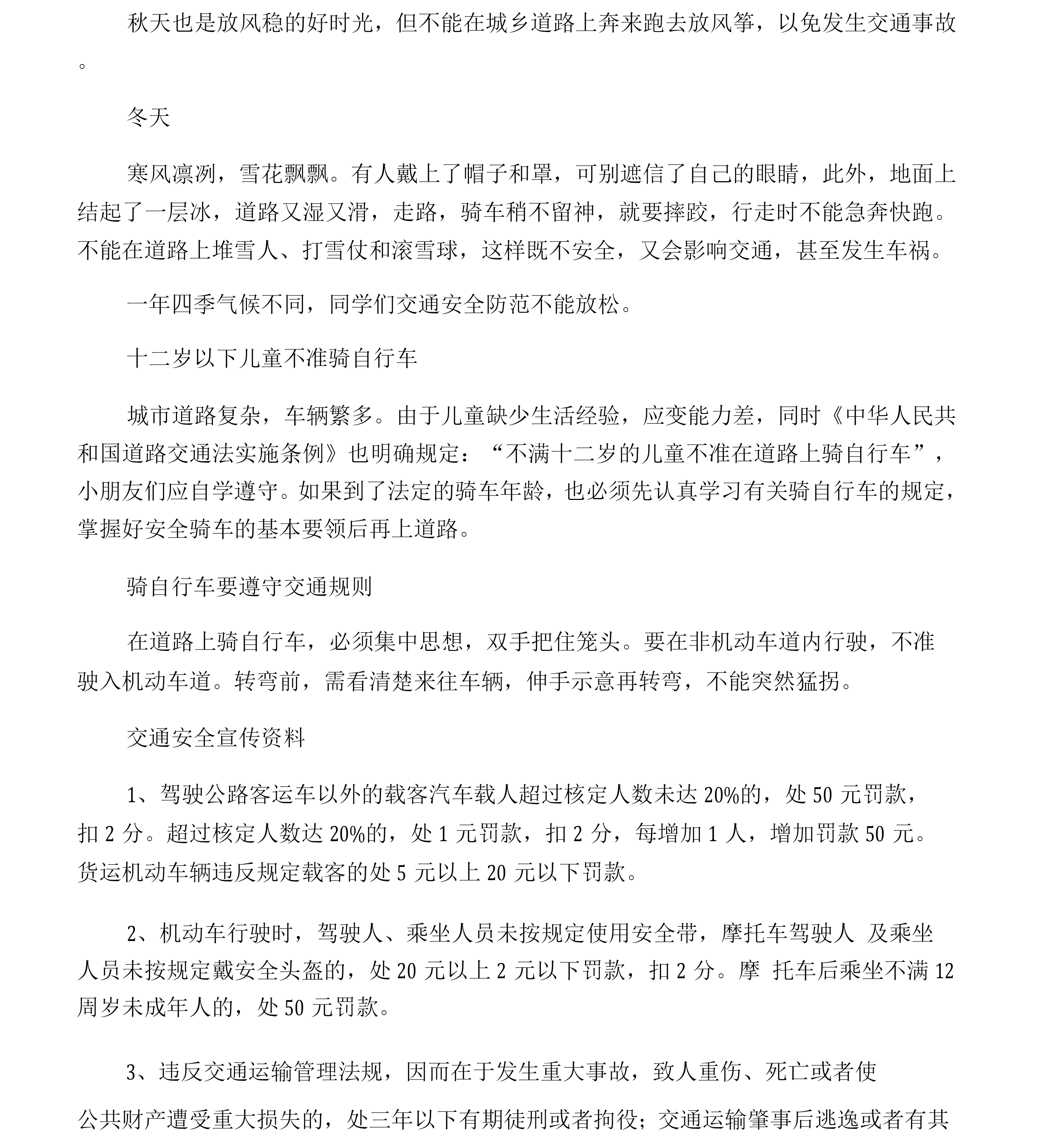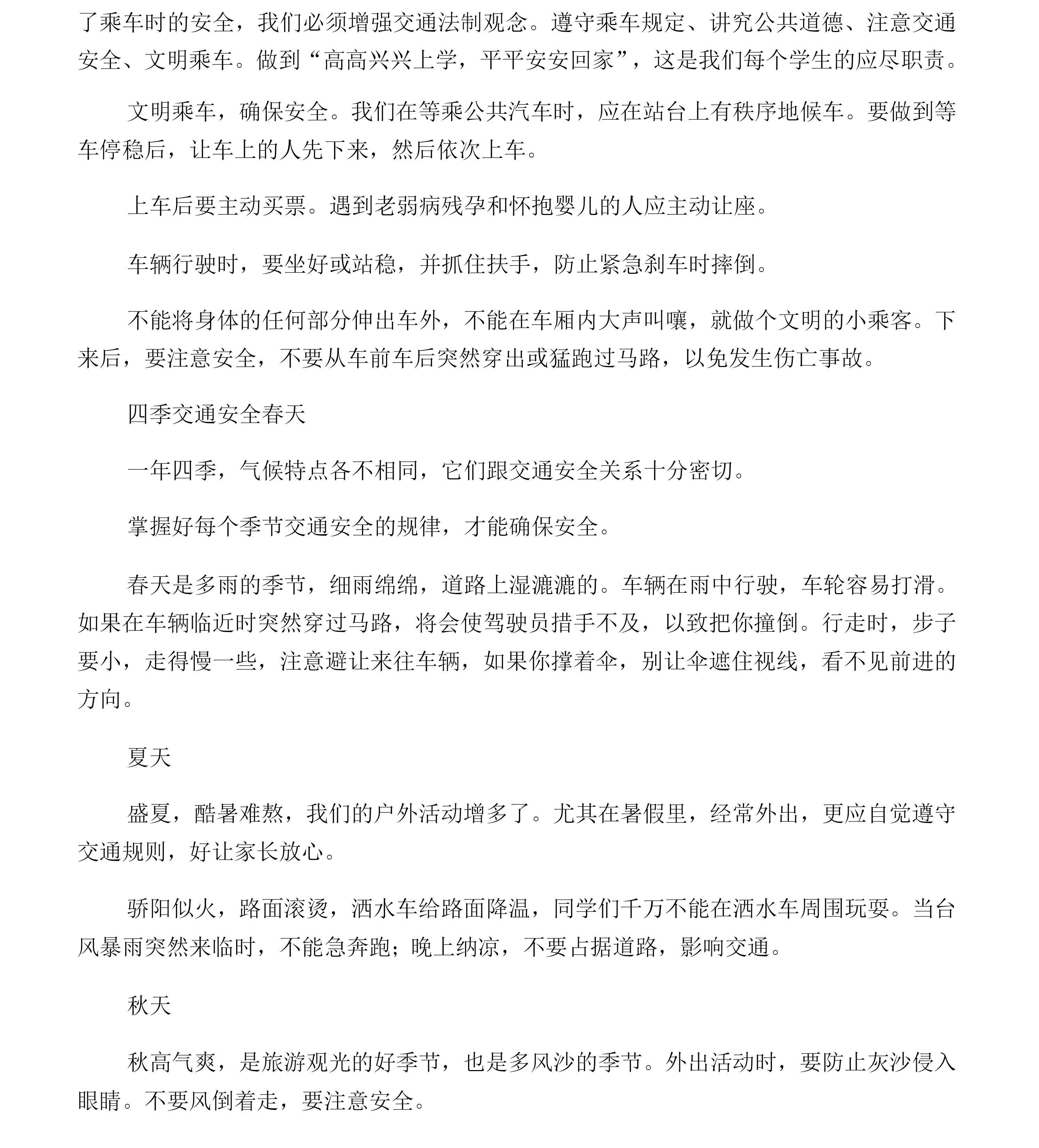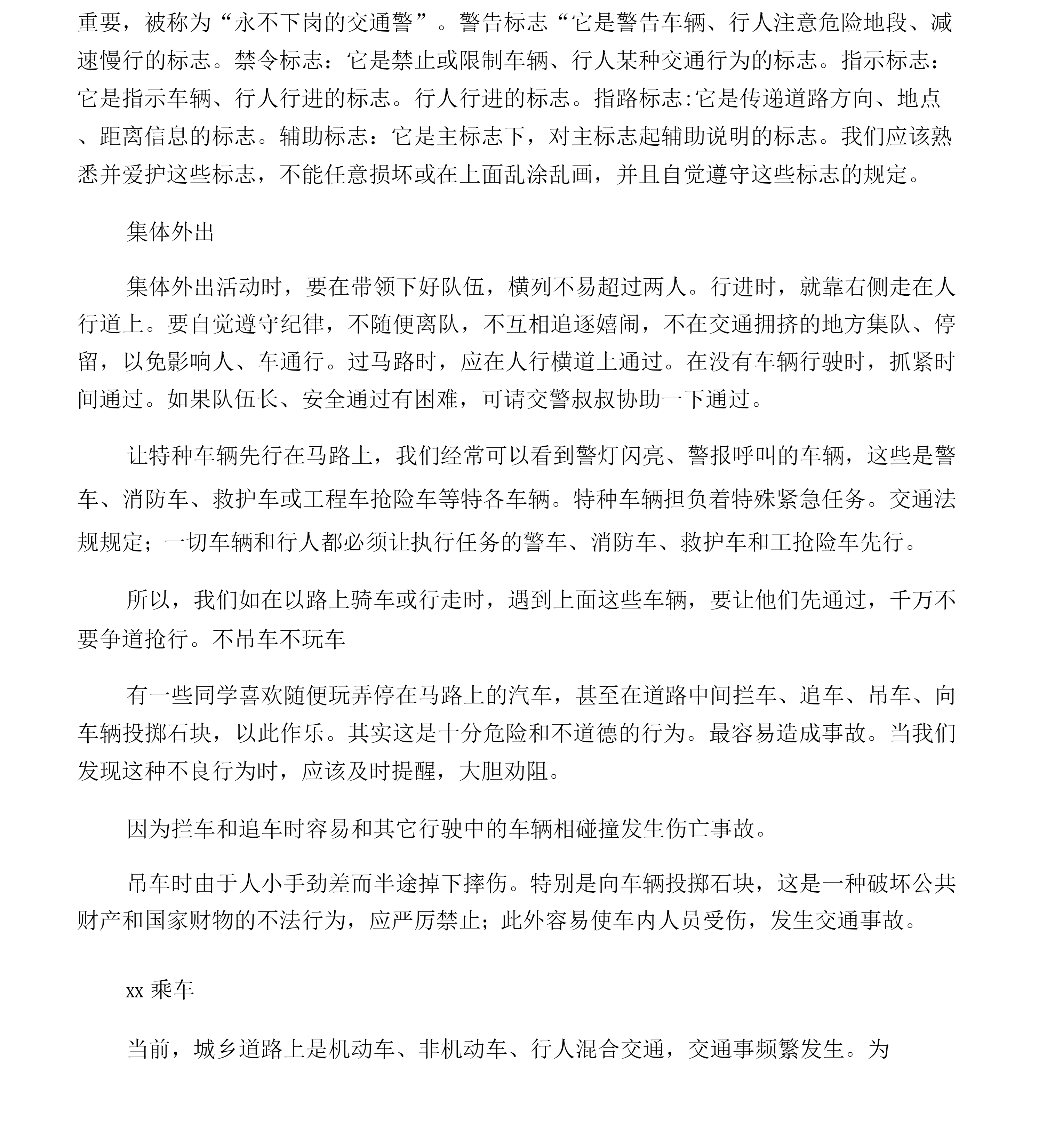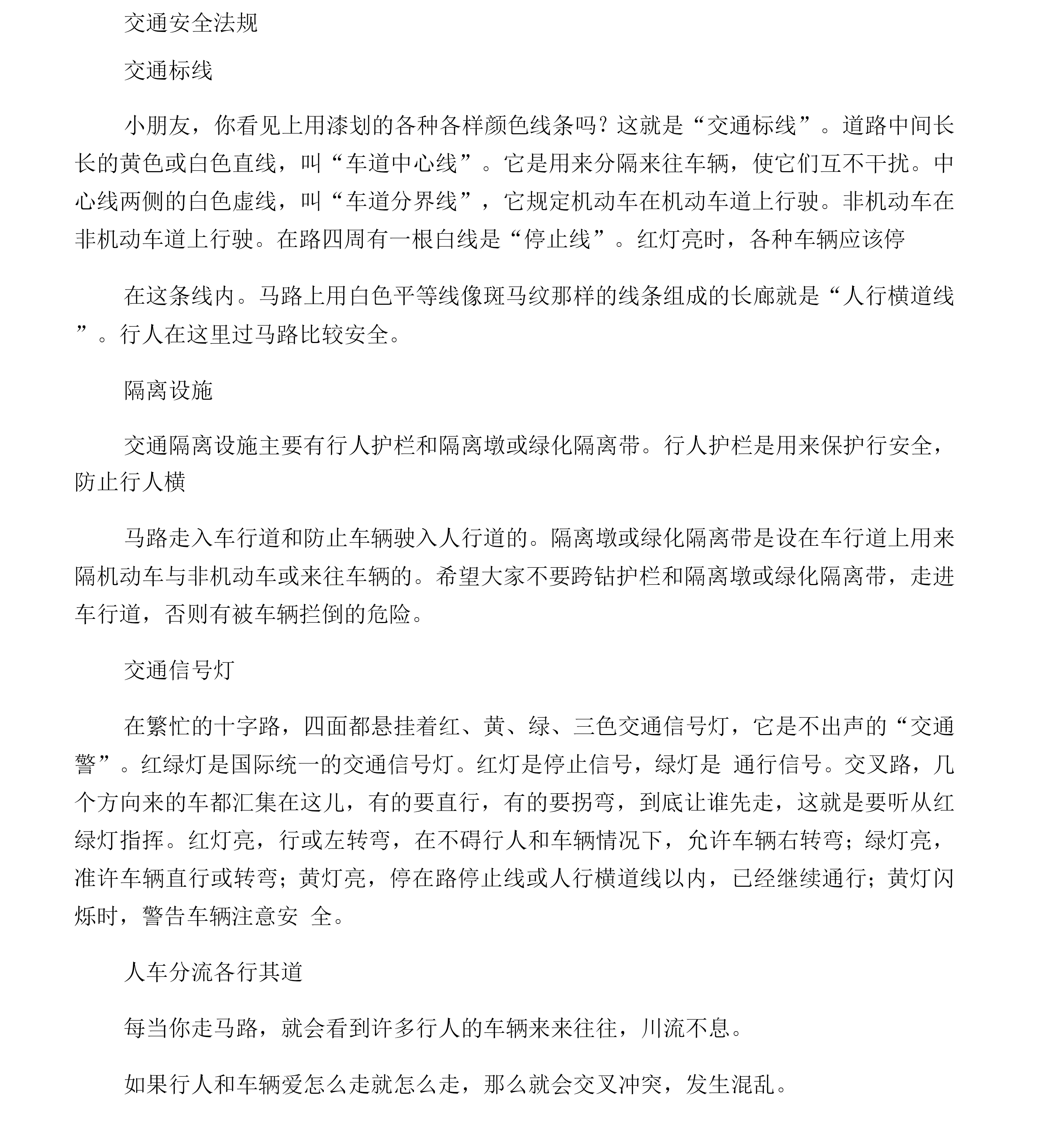 1、安全走路走路,谁不会呢?其实不然,如果我们不注意交通安全,走路就会闯祸。因此我们上学读书、放学回家、节假日外出时走在人来车往的交通繁忙的道路上,要遵守交通规则,增强自我保护意识。我们走路要走人行道上。在没有行道的地方,应靠道路右边行走。走路时,思想要集中,不要东张西望,不能一边走一边玩耍,不能一边走路一边看书,不能三五成群并行行走,不要乱过马路,更不要追赶车辆嬉戏打闹。更不要在马路上踢球、溜冰、放风筝、做游戏。一旦被来往车辆装倒,后果非常严重。2、汽车不是一刹车就停的有的同学认为乱过马路没有什么关系,反正驾驶员会刹车的。其实,汽车不是一刹就停的。由于惯性作用,刹车后车还会向前滑一段路,这就是力的惯性作用。就像人在奔跑中,突然停下来,还会不由自主地身前冲几步一样。何况还有可能驾驶员不注意,刹车不灵等。所以,乱穿马路是十分危险的,不少交通事故就是因为行人乱过马路造成的。血的教训应该引以为戒。3、不在车前车后急穿马路有人总是喜欢在汽车前、后急穿马路这是很危险的。驾驶员眼睛看不到的地方,被称为“视线死角”。要是有人在车前车后驾驶员眼睛看不到的“视线死角”内急穿马路,就会造成车祸。所以我们横过马路要注意左右来往车辆,先向左看,后向右看,当看清没有来车时才横过马路。在有“人行横到”和“人行天桥“上行走,这样才比较安全。4、xx乘车我们在等乘公共汽车时,应在站台上有次序地候车。要做到等车停稳后,让车上的人先下来,然后依次车。车辆行驶时,要坐好或站稳,并抓住扶手,防止紧急刹车时摔倒。不能将身体的任何部分伸出车外下来后,要注意安全,不要从车前车后突然穿出或猛跑过马路,以免发生伤亡事故。交通安全法规交通标线小朋友,你看见上用漆划的各种各样颜色线条吗?这就是“交通标线”。道路中间长长的黄色或白色直线,叫“车道中心线”。它是用来分隔来往车辆,使它们互不干扰。中心线两侧的白色虚线,叫“车道分界线”,它规定机动车在机动车道上行驶。非机动车在非机动车道上行驶。在路四周有一根白线是“停止线”。红灯亮时,各种车辆应该停在这条线内。马路上用白色平等线像斑马纹那样的线条组成的长廊就是“人行横道线”。行人在这里过马路比较安全。隔离设施交通隔离设施主要有行人护栏和隔离墩或绿化隔离带。行人护栏是用来保护行安全,防止行人横马路走入车行道和防止车辆驶入人行道的。隔离墩或绿化隔离带是设在车行道上用来隔机动车与非机动车或来往车辆的。希望大家不要跨钻护栏和隔离墩或绿化隔离带,走进车行道,否则有被车辆拦倒的危险。交通信号灯在繁忙的十字路,四面都悬挂着红、黄、绿、三色交通信号灯,它是不出声的“交通警”。红绿灯是国际统一的交通信号灯。红灯是停止信号,绿灯是通行信号。交叉路,几个方向来的车都汇集在这儿,有的要直行,有的要拐弯,到底让谁先走,这就是要听从红绿灯指挥。红灯亮,行或左转弯,在不碍行人和车辆情况下,允许车辆右转弯;绿灯亮,准许车辆直行或转弯;黄灯亮,停在路停止线或人行横道线以内,已经继续通行;黄灯闪烁时,警告车辆注意安全。人车分流各行其道每当你走马路,就会看到许多行人的车辆来来往往,川流不息。如果行人和车辆爱怎么走就怎么走,那么就会交叉冲突,发生混乱。交通道路上用“交通标线”划出车辆、行人应走的规则:机动车走“机动车道”。在道路上,我们可以看到各式各样的交通标志。它们用图案、符号和文字来表达特定的意思。告诉驾驶员和行人注意附近环境情况。这些标志对于安全车非常重要,被称为“永不下岗的交通警”。警告标志“它是警告车辆、行人注意危险地段、减速慢行的标志。禁令标志:它是禁止或限制车辆、行人某种交通行为的标志。指示标志:它是指示车辆、行人行进的标志。行人行进的标志。指路标志:它是传递道路方向、地点、距离信息的标志。辅助标志:它是主标志下,对主标志起辅助说明的标志。我们应该熟悉并爱护这些标志,不能任意损坏或在上面乱涂乱画,并且自觉遵守这些标志的规定。集体外出集体外出活动时,要在带领下好队伍,横列不易超过两人。行进时,就靠右侧走在人行道上。要自觉遵守纪律,不随便离队,不互相追逐嬉闹,不在交通拥挤的地方集队、停留,以免影响人、车通行。过马路时,应在人行横道上通过。在没有车辆行驶时,抓紧时间通过。如果队伍长、安全通过有困难,可请交警叔叔协助一下通过。让特种车辆先行在马路上,我们经常可以看到警灯闪亮、警报呼叫的车辆,这些是警车、消防车、救护车或工程车抢险车等特各车辆。特种车辆担负着特殊紧急任务。交通法规规定;一切车辆和行人都必须让执行任务的警车、消防车、救护车和工抢险车先行。所以,我们如在以路上骑车或行走时,遇到上面这些车辆,要让他们先通过,千万不要争道抢行。不吊车不玩车有一些同学喜欢随便玩弄停在马路上的汽车,甚至在道路中间拦车、追车、吊车、向