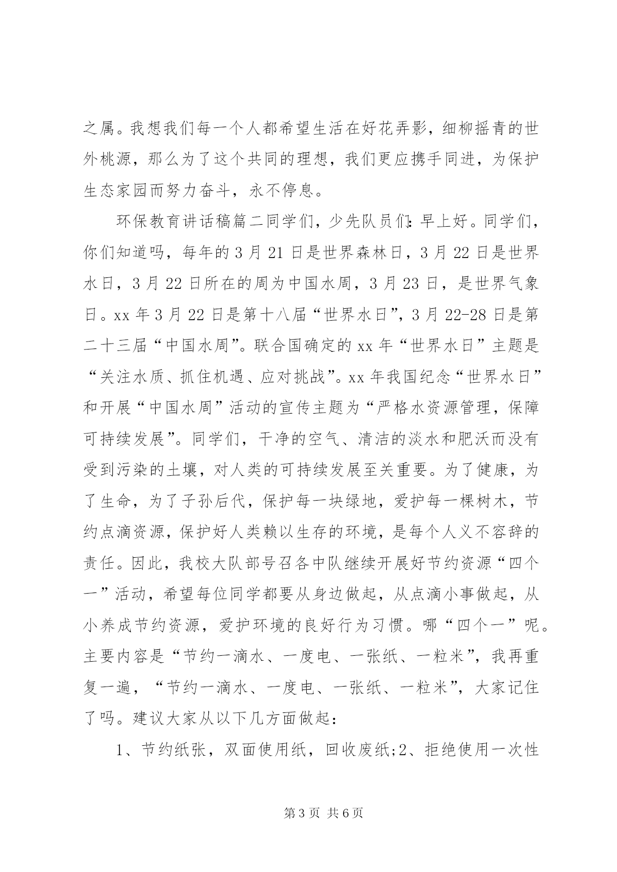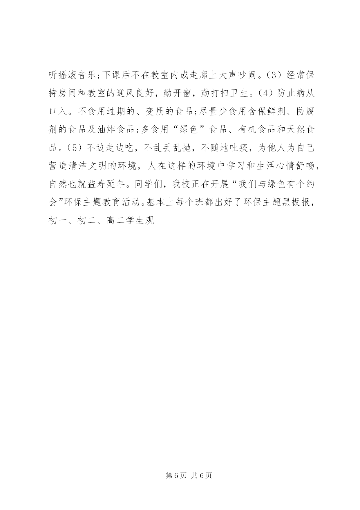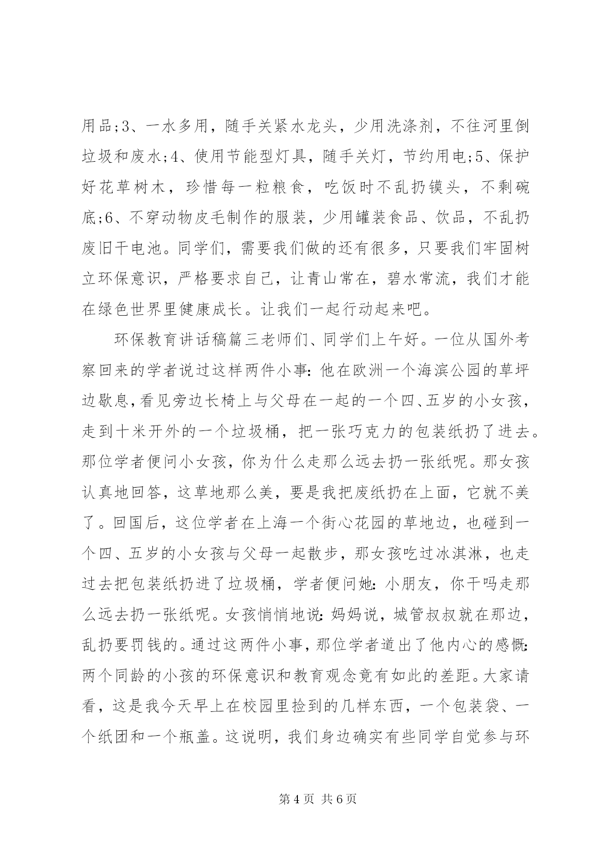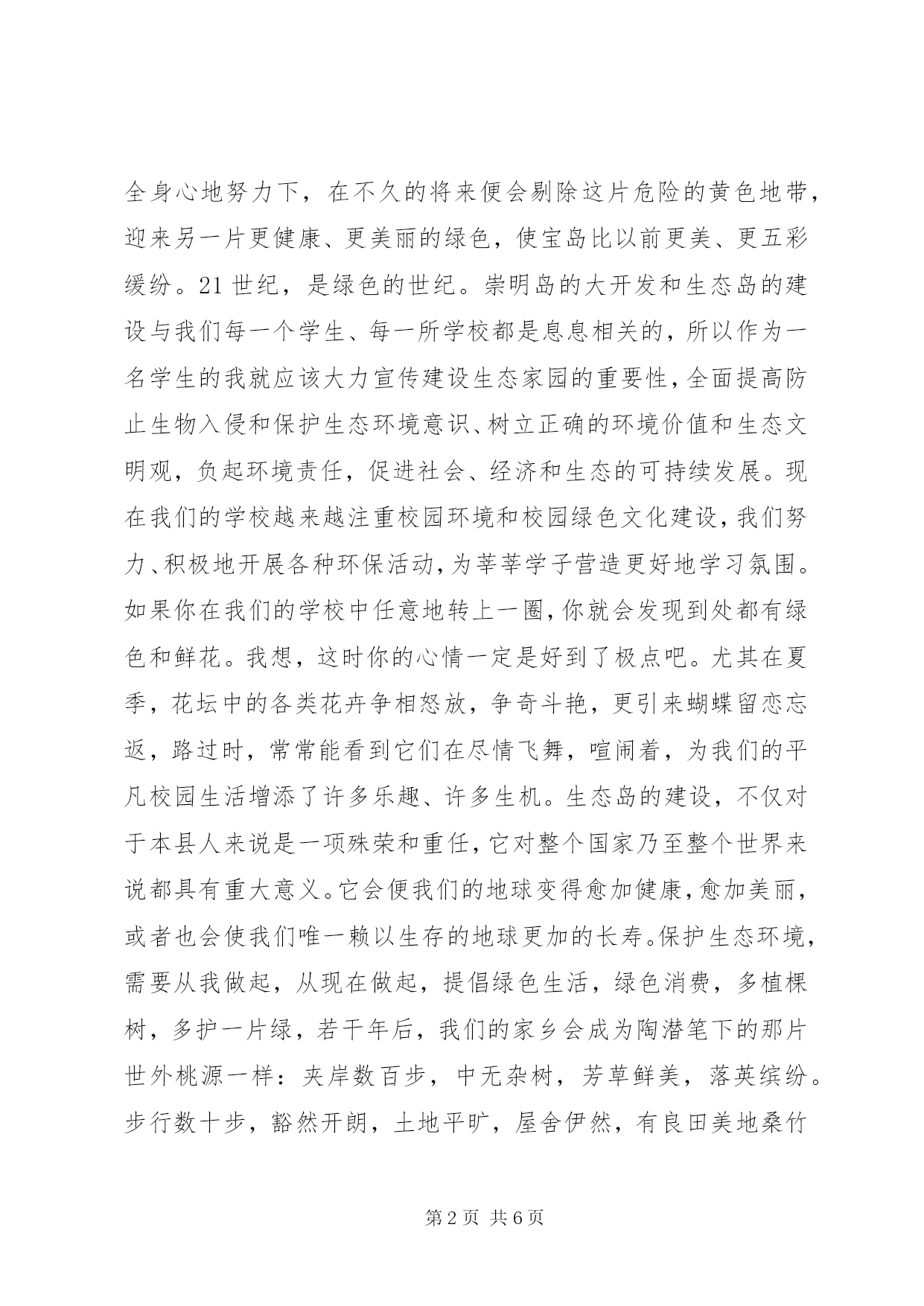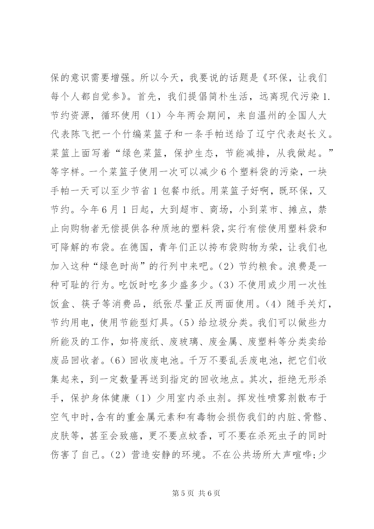 第PAGE\*Arabic\*MERGEFORMAT6页共NUMPAGES\*MERGEFORMAT6页环保教育讲话稿同学们:大家好。崇明岛,被亲切地称为上海的后花园,这座后花园地处北亚热带,气候温和湿润,日照充足,雨水充沛,四季分明。它每一八都是生机盎然,充满了欢声笑的。我爱它,我爱在蓝天白云下享受云融融、风淡淡、水盈盈的大自然心情。然而,忽然有一天,正当我们全身心投入它美丽的怀抱中时,它却被一种外来植物伤害着,毁坏着……曾经的中国饱经风霜,被许多国家肆意践踏、侵略,虽然这种时代早已一去不复返,可是却有着另一种同样强大的敌人在进行历史重演,那么如此热爱宝岛的我们却又如何忍心让它再次罹难。。这种具有极强生命力的植物,便是现在常见的加拿大一枝黄花。它最初是作为庭园花卉引入上海的,的确初看它们,是一片绚烂夺目的黄色,它使我们的双眸享受到一幅浑然天成的美景,让我们忘情地欣赏、赞扬它。然而殊不知,就在这美丽外表的掩藏下,它有着危险的“使命”——破坏、阻碍其他农作物、绿化草坪的生长,甚至是无情的扼杀它们。加拿大一枝黄花的出现,使栽种的绿化灌木成片死亡,使公共绿化地带的草坪遭到破坏,便农民辛苦耕种的农作物减产……它实在有着太多太多的不是,实在是像一个无形的杀手在肆无忌惮地疯狂游戏着,伤害着我们美丽的宝岛。因此,我们必须尽每一份力量来保护好我们的家园,彻底消除一枝黄花。相信,在我们每个人全身心地努力下,在不久的将来便会剔除这片危险的黄色地带,迎来另一片更健康、更美丽的绿色,使宝岛比以前更美、更五彩缓纷。21世纪,是绿色的世纪。崇明岛的大开发和生态岛的建设与我们每一个学生、每一所学校都是息息相关的,所以作为一名学生的我就应该大力宣传建设生态家园的重要性,全面提高防止生物入侵和保护生态环境意识、树立正确的环境价值和生态文明观,负起环境责任,促进社会、经济和生态的可持续发展。现在我们的学校越来越注重校园环境和校园绿色文化建设,我们努力、积极地开展各种环保活动,为莘莘学子营造更好地学习氛围。如果你在我们的学校中任意地转上一圈,你就会发现到处都有绿色和鲜花。我想,这时你的心情一定是好到了极点吧。尤其在夏季,花坛中的各类花卉争相怒放,争奇斗艳,更引来蝴蝶留恋忘返,路过时,常常能看到它们在尽情飞舞,喧闹着,为我们的平凡校园生活增添了许多乐趣、许多生机。生态岛的建设,不仅对于本县人来说是一项殊荣和重任,它对整个国家乃至整个世界来说都具有重大意义。它会便我们的地球变得愈加健康,愈加美丽,或者也会使我们唯一赖以生存的地球更加的长寿。保护生态环境,需要从我做起,从现在做起,提倡绿色生活,绿色消费,多植棵树,多护一片绿,若干年后,我们的家乡会成为陶潜笔下的那片世外桃源一样:夹岸数百步,中无杂树,芳草鲜美,落英缤纷。步行数十步,豁然开朗,土地平旷,屋舍伊然,有良田美地桑竹之属。我想我们每一个人都希望生活在好花弄影,细柳摇青的世外桃源,那么为了这个共同的理想,我们更应携手同进,为保护生态家园而努力奋斗,永不停息。环保教育讲话稿篇二同学们,少先队员们:早上好。同学们,你们知道吗,每年的3月21日是世界森林日,3月22日是世界水日,3月22日所在的周为中国水周,3月23日,是世界气象日。xx年3月22日是第十八届“世界水日”,3月22-28日是第二十三届“中国水周”。联合国确定的xx年“世界水日”主题是“关注水质、抓住机遇、应对挑战”。xx年我国纪念“世界水日”和开展“中国水周”活动的宣传主题为“严格水资源管理,保障可持续发展”。同学们,干净的空气、清洁的淡水和肥沃而没有受到污染的土壤,对人类的可持续发展至关重要。为了健康,为了生命,为了子孙后代,保护每一块绿地,爱护每一棵树木,节约点滴资源,保护好人类赖以生存的环境,是每个人义不容辞的责任。因此,我校大队部号召各中队继续开展好节约资源“四个一”活动,希望每位同学都要从身边做起,从点滴小事做起,从小养成节约资源,爱护环境的良好行为习惯。哪“四个一”呢。主要内容是“节约一滴水、一度电、一张纸、一粒米”,我再重复一遍,“节约一滴水、一度电、一张纸、一粒米”,大家记住了吗。建议大家从以下几方面做起:1、节约纸张,双面使用纸,回收废纸;2、拒绝使用一次性用品;3、一水多用,随手关紧水龙头,少用洗涤剂,不往河里倒垃圾和废水;4、使用节能型灯具,随手关灯,节约用电;5、保护好花草树木,珍惜每一粒粮食,吃饭时不乱扔镆头,不剩碗底;6、不穿动物皮毛制作的服装,少用罐装食品、饮品,不乱扔废旧干电池。同学们,需要我们做的还有很多,只要我们牢固树立环保意识,严格要求自己,让青山常在,碧水常流,我们才能在绿色世界里健康成长。让我们一起行动起来吧。环保教育讲话稿篇三老师们、同学们上午好。一位从国外考察回来的学者说过这样两件