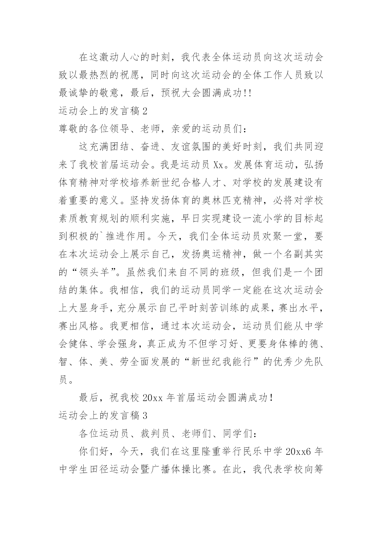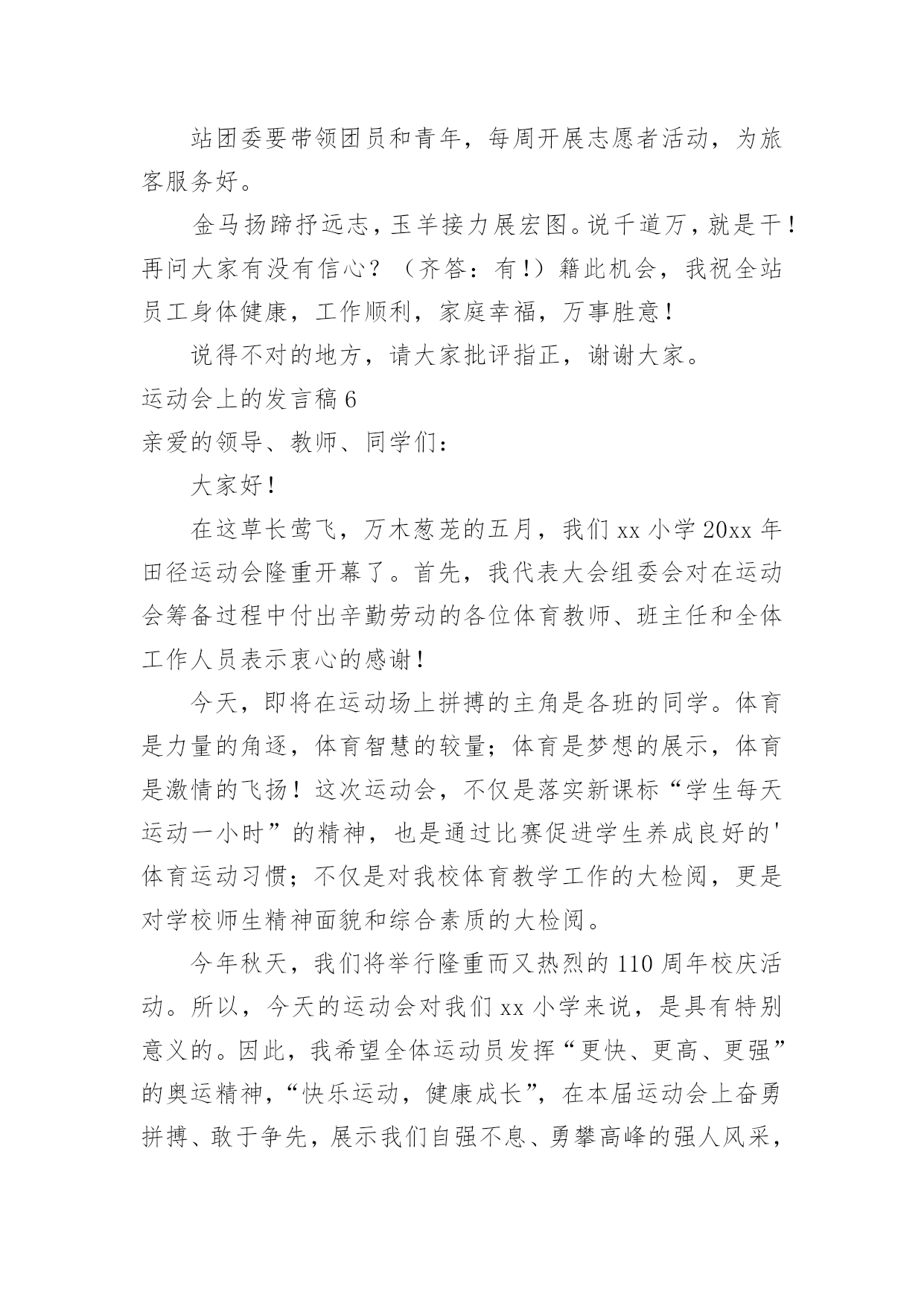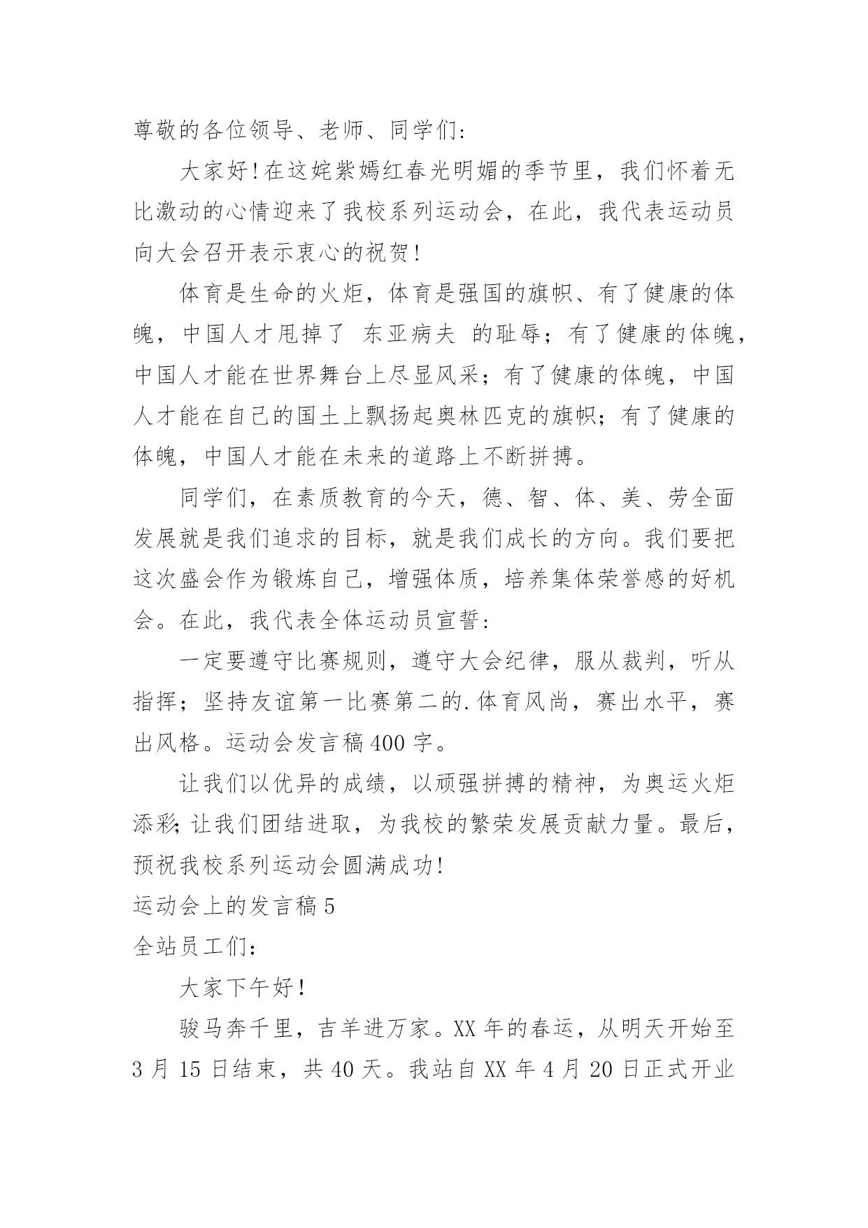 运动会上的发言稿运动会上的发言稿在不断进步的社会中,我们可以使用发言稿的机会越来越多,发言稿在写作上具有一定的格式要求。如何写一份恰当的发言稿呢?下面是小编帮大家整理的运动会上的发言稿,仅供参考,希望能够帮助到大家。运动会上的发言稿1各位敬爱的老师、亲爱的同学们:大家好!很荣幸今天能成为运动员代表在此发言,在今天的运动会上,我们要发扬团队协作,连续作战的作风,用我们不懈的努力,来增进集体的.凝聚力,培养高尚的集体主义精神!!为了运动会的顺利进行,我代表全体运动员向大家宣誓;我们全体运动员将严格遵守比赛规则,坚决服从裁判,发扬勇敢顽强拼搏的精神!!赛出风格,赛出水平,向CKT传达人类追求“更快.更高.更强”的精神!绚丽多姿的烟火,奔放动人的音乐,精彩绝伦的表演将在这里准别,只希望所有的人都是快乐的,请记住这次运动带来的一切,明天的太阳照常升起,我们将在这里离开,沉甸甸的行囊,四散而发,各奔前程,但不要伤感,一年后的我们还会相聚在这里,运动的圣火将永远照耀!在这激动人心的时刻,我代表全体运动员向这次运动会致以最热烈的祝愿,同时向这次运动会的全体工作人员致以最诚挚的敬意,最后,预祝大会圆满成功!!运动会上的发言稿2尊敬的各位领导、老师,亲爱的运动员们:这充满团结、奋进、友谊氛围的美好时刻,我们共同迎来了我校首届运动会。我是运动员Xx。发展体育运动,弘扬体育精神对学校培养新世纪合格人才、对学校的发展建设有着重要的意义。坚持发扬体育的奥林匹克精神,必将对学校素质教育规划的顺利实施,早日实现建设一流小学的目标起到积极的`推进作用。今天,我们全体运动员欢聚一堂,要在本次运动会上展示自己,发扬奥运精神,做一个名副其实的“领头羊”。虽然我们来自不同的班级,但我们是一个团结的集体。我相信,我们的运动员同学一定能在这次运动会上大显身手,充分展示自己平时刻苦训练的成果,赛出水平,赛出风格。我更相信,通过本次运动会,运动员们能从中学会健体、学会强身,真正成为不但学习好、更要身体棒的德、智、体、美、劳全面发展的“新世纪我能行”的优秀少先队员。最后,祝我校20xx年首届运动会圆满成功!运动会上的发言稿3各位运动员、裁判员、老师们、同学们:你们好,今天,我们在这里隆重举行民乐中学20xx6年中学生田径运动会暨广播体操比赛。在此,我代表学校向筹备这次运动会的全体工作人员表示衷心感谢,向参加这次运动会全体运动员、裁判员表示诚挚的慰问。近年来,我校沐浴着教育改革以及创建教育强市、强镇的春风,在创建教育强市和创建等级学校的过程中,各级政府不断加大对学校的投入,使学校的校容校貌和设施设备发生了很大变化,经过全校师生的共同努力,我校于20xx年4月晋升为广州市一级学校,教育教学工作都上了一个新台阶。当前,我镇创建教育强镇工作已到了冲刺阶段,在本月底,我镇将要接受省教育强镇的督导验收,我们要乘着这股东风,同心协力把我们的'各项工作做好,以最佳的状态,迎接教育强镇的评估。同学们,教育的宗旨就是以人为本,全面提高人的基本素质。举办运动会,是我校推行素质教育,加强集体主义教育,开展全民健身运动的重要举措,也是对平时群体活动的一次大检阅,一次大验收,我相信,我们的运动员同学一定能在这次运动会上大显身手,充分展示自己平时刻苦训练的成果,赛出风格,赛出水平。本次运动会共设广播体操以及田赛、径赛共15大项目的比赛,同时大会期间我们还开设精神文明奖的评选,希望各班认真组织,积极参与,充分展示我们中学生良好的精神风貌,把本次运动会办成隆重、热烈的体育盛会,争取精神文明和体育成绩双丰收。预祝本次运动会圆满成功!运动会上的发言稿4尊敬的各位领导、老师、同学们:大家好!在这姹紫嫣红春光明媚的季节里,我们怀着无比激动的心情迎来了我校系列运动会,在此,我代表运动员向大会召开表示衷心的祝贺!体育是生命的火炬,体育是强国的旗帜、有了健康的体魄,中国人才甩掉了东亚病夫的耻辱;有了健康的体魄,中国人才能在世界舞台上尽显风采;有了健康的体魄,中国人才能在自己的国土上飘扬起奥林匹克的旗帜;有了健康的体魄,中国人才能在未来的道路上不断拼搏。同学们,在素质教育的今天,德、智、体、美、劳全面发展就是我们追求的目标,就是我们成长的方向。我们要把这次盛会作为锻炼自己,增强体质,培养集体荣誉感的好机会。在此,我代表全体运动员宣誓:一定要遵守比赛规则,遵守大会纪律,服从裁判,听从指挥;坚持友谊第一比赛第二的.体育风尚,赛出水平,赛出风格。运动会发言稿400字。让我们以优异的成绩,以顽强拼搏的精神,为奥运火炬添彩;让我们团结进取,为我校的繁荣发展贡献力量。最后,预祝我校系列运动会圆满成功!运动会上的发言稿5全站员工们:大家下午好!骏马奔千里,吉羊进万家。XX年的春运,从明天开始至3月15日结束,共40天。我站自XX年4月2