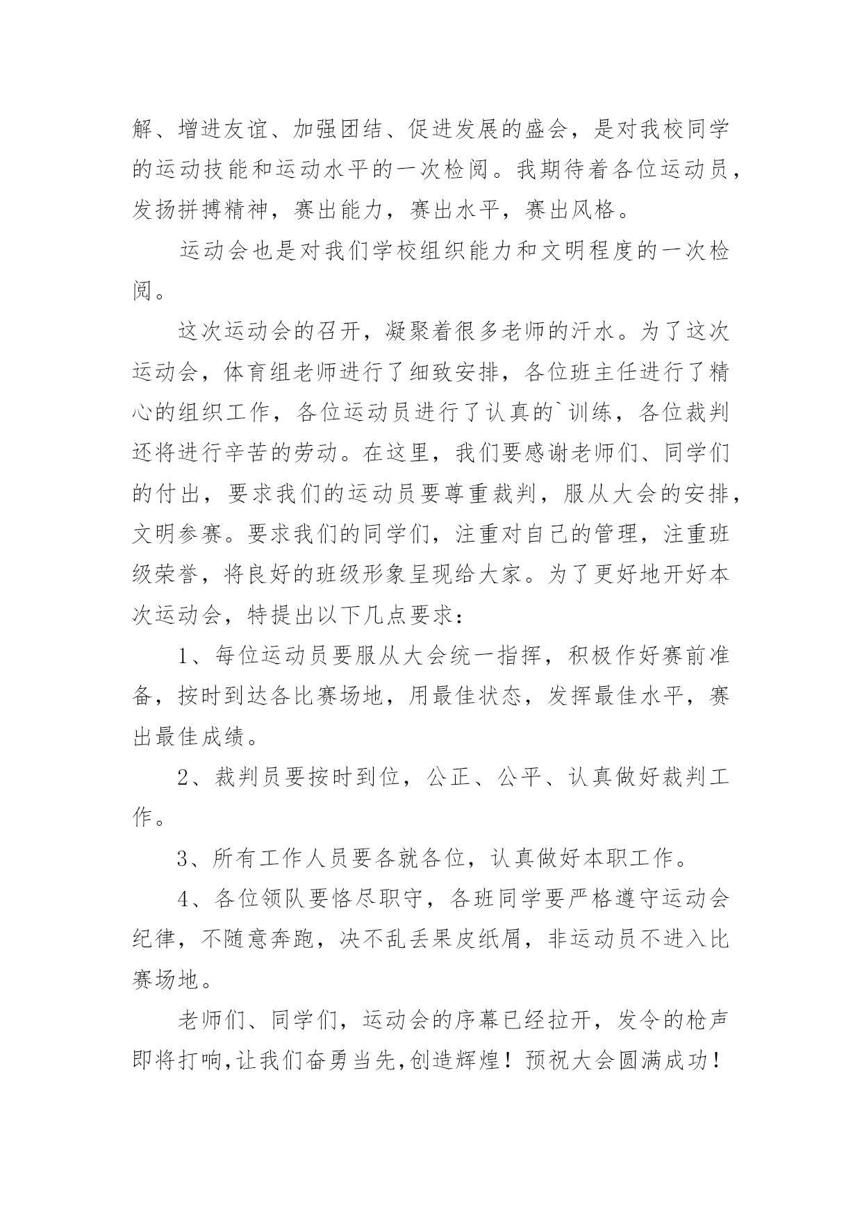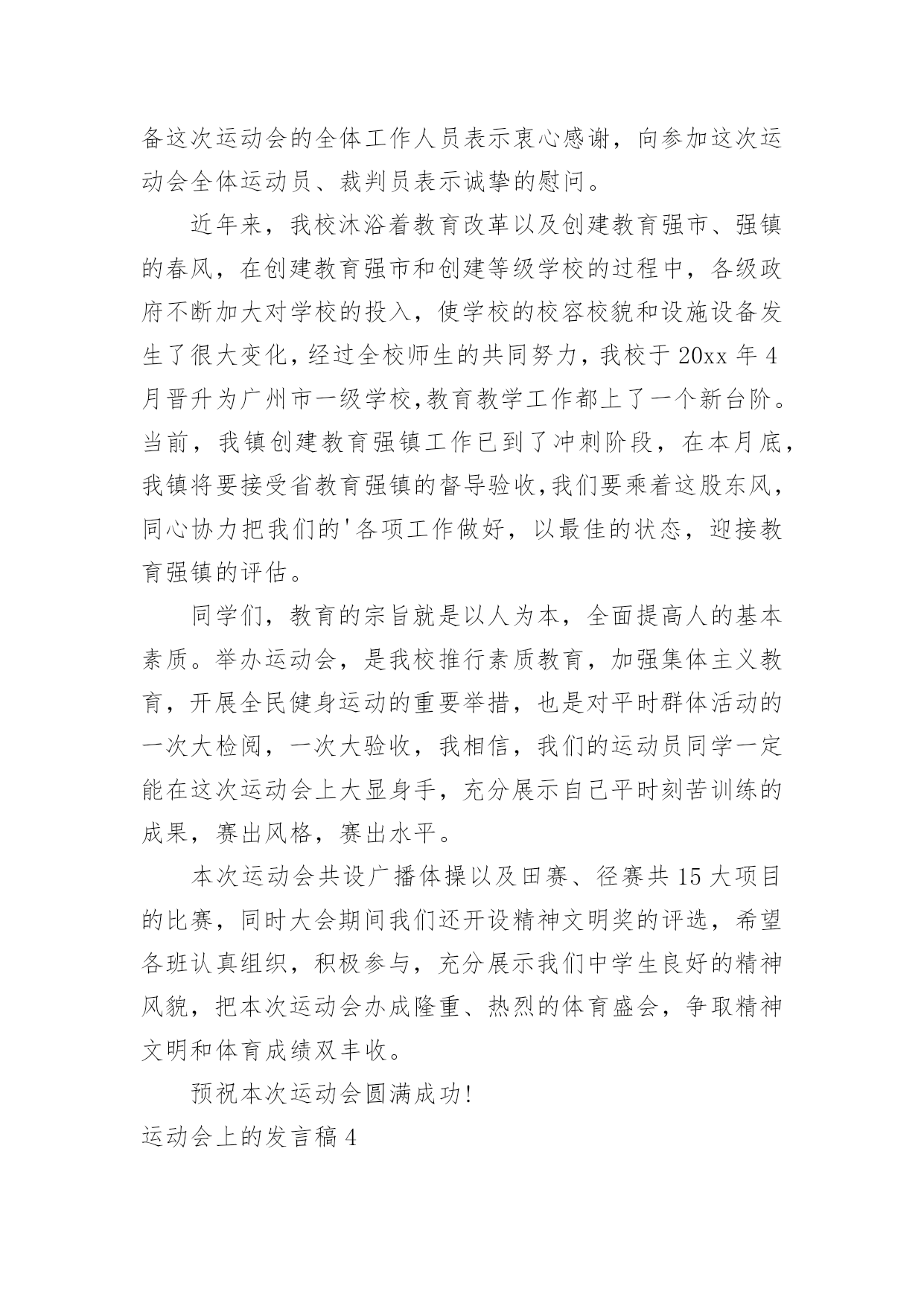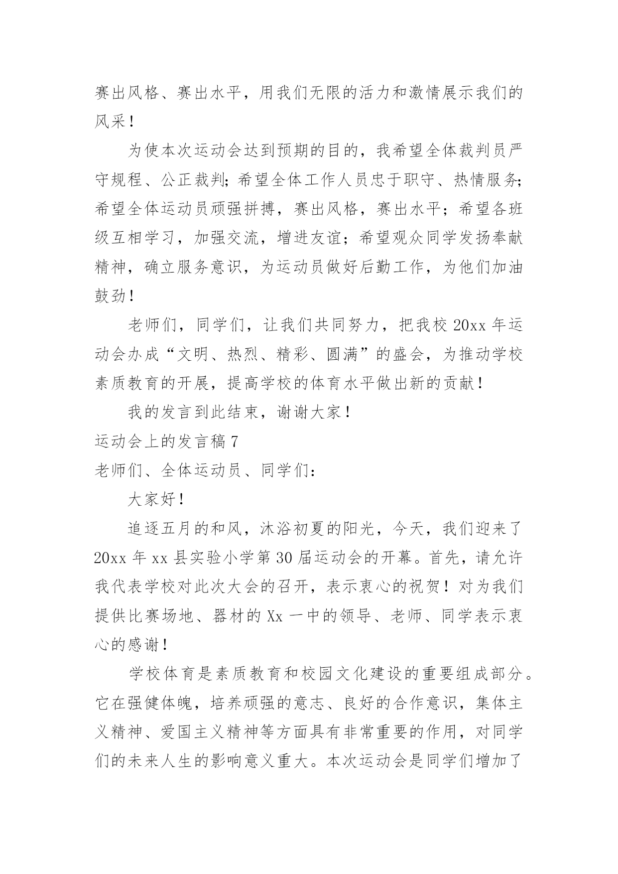 运动会上的发言稿运动会上的发言稿在不断进步的社会中,我们可以使用发言稿的机会越来越多,发言稿在写作上具有一定的格式要求。如何写一份恰当的发言稿呢?下面是小编帮大家整理的运动会上的发言稿,仅供参考,希望能够帮助到大家。运动会上的发言稿1各位敬爱的老师、亲爱的同学们:大家好!很荣幸今天能成为运动员代表在此发言,在今天的运动会上,我们要发扬团队协作,连续作战的作风,用我们不懈的努力,来增进集体的.凝聚力,培养高尚的集体主义精神!!为了运动会的顺利进行,我代表全体运动员向大家宣誓;我们全体运动员将严格遵守比赛规则,坚决服从裁判,发扬勇敢顽强拼搏的精神!!赛出风格,赛出水平,向CKT传达人类追求“更快.更高.更强”的精神!绚丽多姿的烟火,奔放动人的音乐,精彩绝伦的表演将在这里准别,只希望所有的人都是快乐的,请记住这次运动带来的一切,明天的太阳照常升起,我们将在这里离开,沉甸甸的行囊,四散而发,各奔前程,但不要伤感,一年后的我们还会相聚在这里,运动的圣火将永远照耀!在这激动人心的时刻,我代表全体运动员向这次运动会致以最热烈的祝愿,同时向这次运动会的全体工作人员致以最诚挚的敬意,最后,预祝大会圆满成功!!运动会上的发言稿2尊敬的各位领导、老师,亲爱的运动员们:这充满团结、奋进、友谊氛围的美好时刻,我们共同迎来了我校首届运动会。我是运动员Xx。发展体育运动,弘扬体育精神对学校培养新世纪合格人才、对学校的发展建设有着重要的意义。坚持发扬体育的奥林匹克精神,必将对学校素质教育规划的顺利实施,早日实现建设一流小学的目标起到积极的`推进作用。今天,我们全体运动员欢聚一堂,要在本次运动会上展示自己,发扬奥运精神,做一个名副其实的“领头羊”。虽然我们来自不同的班级,但我们是一个团结的集体。我相信,我们的运动员同学一定能在这次运动会上大显身手,充分展示自己平时刻苦训练的成果,赛出水平,赛出风格。我更相信,通过本次运动会,运动员们能从中学会健体、学会强身,真正成为不但学习好、更要身体棒的德、智、体、美、劳全面发展的“新世纪我能行”的优秀少先队员。最后,祝我校20xx年首届运动会圆满成功!运动会上的发言稿3各位运动员、裁判员、老师们、同学们:你们好,今天,我们在这里隆重举行民乐中学20xx6年中学生田径运动会暨广播体操比赛。在此,我代表学校向筹备这次运动会的全体工作人员表示衷心感谢,向参加这次运动会全体运动员、裁判员表示诚挚的慰问。近年来,我校沐浴着教育改革以及创建教育强市、强镇的春风,在创建教育强市和创建等级学校的过程中,各级政府不断加大对学校的投入,使学校的校容校貌和设施设备发生了很大变化,经过全校师生的共同努力,我校于20xx年4月晋升为广州市一级学校,教育教学工作都上了一个新台阶。当前,我镇创建教育强镇工作已到了冲刺阶段,在本月底,我镇将要接受省教育强镇的督导验收,我们要乘着这股东风,同心协力把我们的'各项工作做好,以最佳的状态,迎接教育强镇的评估。同学们,教育的宗旨就是以人为本,全面提高人的基本素质。举办运动会,是我校推行素质教育,加强集体主义教育,开展全民健身运动的重要举措,也是对平时群体活动的一次大检阅,一次大验收,我相信,我们的运动员同学一定能在这次运动会上大显身手,充分展示自己平时刻苦训练的成果,赛出风格,赛出水平。本次运动会共设广播体操以及田赛、径赛共15大项目的比赛,同时大会期间我们还开设精神文明奖的评选,希望各班认真组织,积极参与,充分展示我们中学生良好的精神风貌,把本次运动会办成隆重、热烈的体育盛会,争取精神文明和体育成绩双丰收。预祝本次运动会圆满成功!运动会上的发言稿4尊敬的各位领导、老师、同学们:大家好!在这姹紫嫣红春光明媚的季节里,我们怀着无比激动的心情迎来了我校系列运动会,在此,我代表运动员向大会召开表示衷心的祝贺!体育是生命的火炬,体育是强国的旗帜、有了健康的体魄,中国人才甩掉了东亚病夫的耻辱;有了健康的体魄,中国人才能在世界舞台上尽显风采;有了健康的体魄,中国人才能在自己的国土上飘扬起奥林匹克的旗帜;有了健康的体魄,中国人才能在未来的道路上不断拼搏。同学们,在素质教育的今天,德、智、体、美、劳全面发展就是我们追求的目标,就是我们成长的方向。我们要把这次盛会作为锻炼自己,增强体质,培养集体荣誉感的好机会。在此,我代表全体运动员宣誓:一定要遵守比赛规则,遵守大会纪律,服从裁判,听从指挥;坚持友谊第一比赛第二的.体育风尚,赛出水平,赛出风格。运动会发言稿400字。让我们以优异的成绩,以顽强拼搏的精神,为奥运火炬添彩;让我们团结进取,为我校的繁荣发展贡献力量。最后,预祝我校系列运动会圆满成功!运动会上的发言稿5全站员工们:大家下午好!骏马奔千里,吉羊进万家。XX年的春运,从明天开始至3月15日结束,共40天。我站自XX年4月2