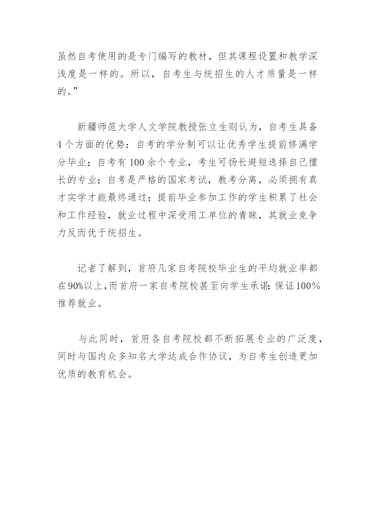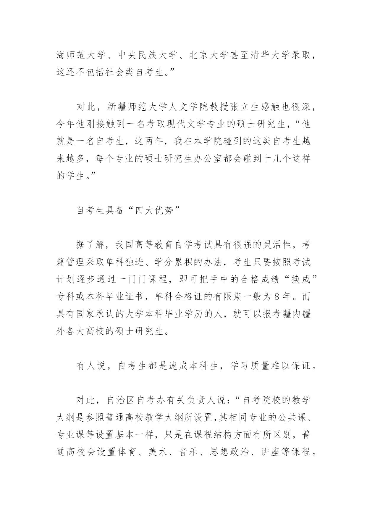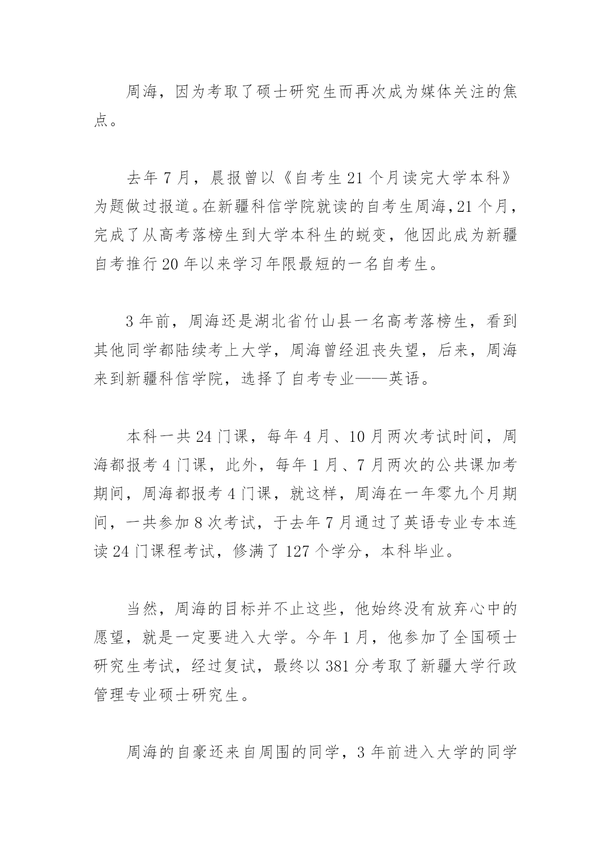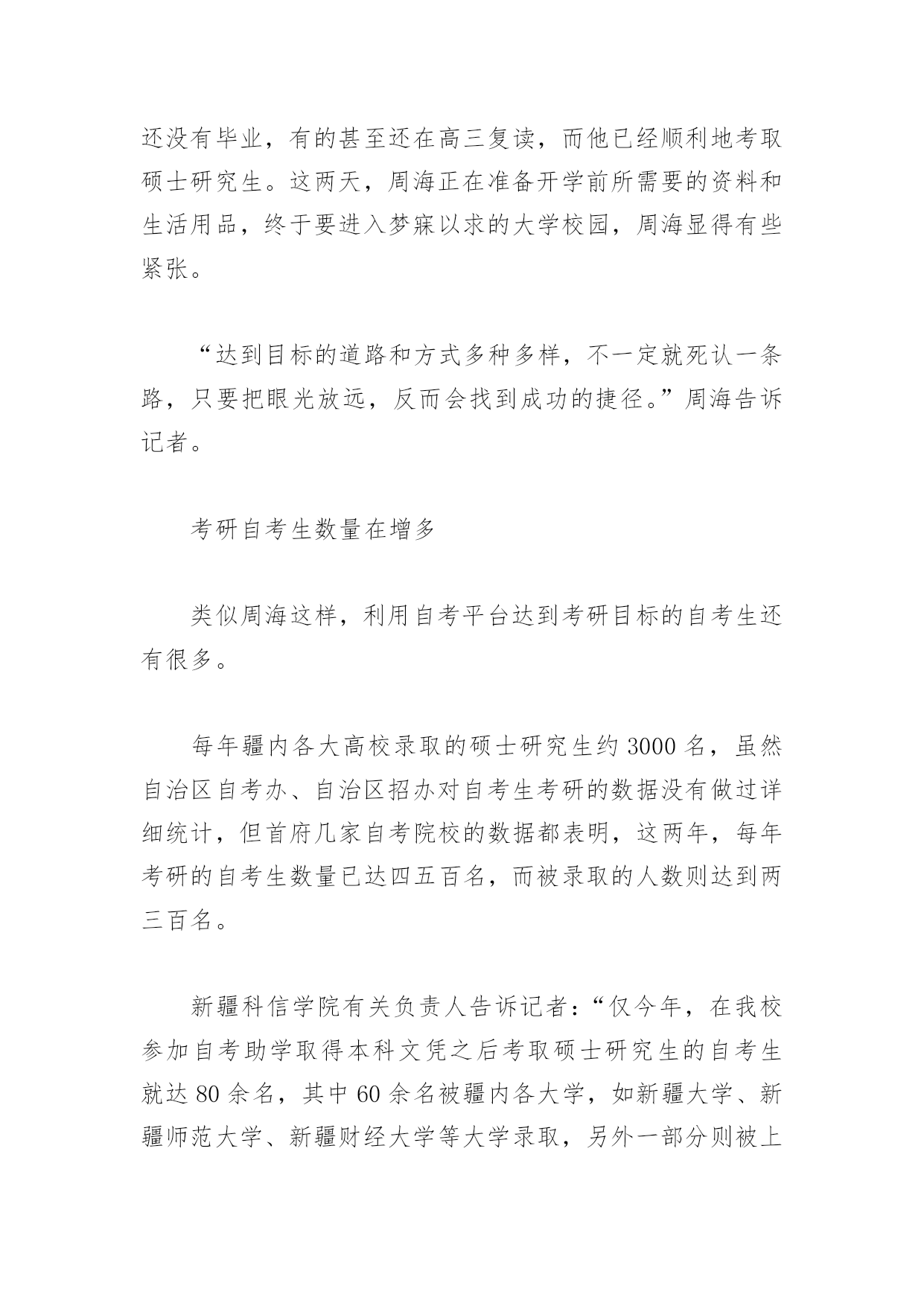 自考生成功考上研究生人数增多自考生成功考上研究生人数增多当收到新疆大学行政管理专业硕士研究生录取通知书时,23岁的周海激动得跳了起来。这份录取通知书对于这个高考落榜生来说,意味着他通过另一种途径——自考,达到了自己想考硕士研究生的愿望,而且前后只用了26个月(21个月拿到本科文凭,5个月备战考研)。周海并不是个例,记者从首府几家自考院校了解到,考取硕士研究生的自考生逐年在增加,今年就有至少四五百名自考生考研,仅新疆科信学院今年就有上百名取得本科文凭的自考生考取了硕士研究生。自治区自考办有关负责人说,很多学生认为,高考落榜无法上大学就失去了考硕士研究生、甚至博士研究生的机会,但事实证明,只要肯努力,通过另一种途径也可以达到自己的目标,自考生和统招生取得的都是国家承认的学历,具有国家承认的大学本科毕业学历的人就可以报考硕士研究生。高考落榜生考上研究生周海,因为考取了硕士研究生而再次成为媒体关注的焦点。去年7月,晨报曾以《自考生21个月读完大学本科》为题做过报道。在新疆科信学院就读的自考生周海,21个月,完成了从高考落榜生到大学本科生的蜕变,他因此成为新疆自考推行20年以来学习年限最短的一名自考生。3年前,周海还是湖北省竹山县一名高考落榜生,看到其他同学都陆续考上大学,周海曾经沮丧失望,后来,周海来到新疆科信学院,选择了自考专业——英语。本科一共24门课,每年4月、10月两次考试时间,周海都报考4门课,此外,每年1月、7月两次的公共课加考期间,周海都报考4门课,就这样,周海在一年零九个月期间,一共参加8次考试,于去年7月通过了英语专业专本连读24门课程考试,修满了127个学分,本科毕业。当然,周海的目标并不止这些,他始终没有放弃心中的愿望,就是一定要进入大学。今年1月,他参加了全国硕士研究生考试,经过复试,最终以381分考取了新疆大学行政管理专业硕士研究生。周海的自豪还来自周围的同学,3年前进入大学的同学还没有毕业,有的甚至还在高三复读,而他已经顺利地考取硕士研究生。这两天,周海正在准备开学前所需要的资料和生活用品,终于要进入梦寐以求的大学校园,周海显得有些紧张。“达到目标的道路和方式多种多样,不一定就死认一条路,只要把眼光放远,反而会找到成功的捷径。”周海告诉记者。考研自考生数量在增多类似周海这样,利用自考平台达到考研目标的自考生还有很多。每年疆内各大高校录取的硕士研究生约3000名,虽然自治区自考办、自治区招办对自考生考研的数据没有做过详细统计,但首府几家自考院校的数据都表明,这两年,每年考研的自考生数量已达四五百名,而被录取的人数则达到两三百名。新疆科信学院有关负责人告诉记者:“仅今年,在我校参加自考助学取得本科文凭之后考取硕士研究生的自考生就达80余名,其中60余名被疆内各大学,如新疆大学、新疆师范大学、新疆财经大学等大学录取,另外一部分则被上海师范大学、中央民族大学、北京大学甚至清华大学录取,这还不包括社会类自考生。”对此,新疆师范大学人文学院教授张立生感触也很深,今年他刚接触到一名考取现代文学专业的硕士研究生,“他就是一名自考生,这两年,我在本学院碰到的这类自考生越来越多,每个专业的硕士研究生办公室都会碰到十几个这样的学生。”自考生具备“四大优势”据了解,我国高等教育自学考试具有很强的灵活性,考籍管理采取单科独进、学分累积的办法,考生只要按照考试计划逐步通过一门门课程,即可把手中的合格成绩“换成”专科或本科毕业证书,单科合格证的有限期一般为8年。而具有国家承认的大学本科毕业学历的人,就可以报考疆内疆外各大高校的硕士研究生。有人说,自考生都是速成本科生,学习质量难以保证。对此,自治区自考办有关负责人说:“自考院校的教学大纲是参照普通高校教学大纲所设置,其相同专业的公共课、专业课等设置基本一样,只是在课程结构方面有所区别,普通高校会设置体育、美术、音乐、思想政治、讲座等课程。虽然自考使用的是专门编写的教材,但其课程设置和教学深浅度是一样的。所以,自考生与统招生的人才质量是一样的。”新疆师范大学人文学院教授张立生则认为,自考生具备4个方面的优势:自考的学分制可以让优秀学生提前修满学分毕业;自考有100余个专业,考生可扬长避短选择自己擅长的专业;自考是严格的国家考试,教考分离,必须拥有真才实学才能最终通过;提前毕业参加工作的学生积累了社会和工作经验,就业过程中深受用工单位的青睐,其就业竞争力反而优于统招生。记者了解到,首府几家自考院校毕业生的平均就业率都在90%以上,而首府一家自考院校甚至向学生承诺:保证100%推荐就业。与此同时,首府各自考院校都不断拓展专业的广泛度,同时与国内众多知名大学达成合作协议,为自考生创造更加优质的教育机会。