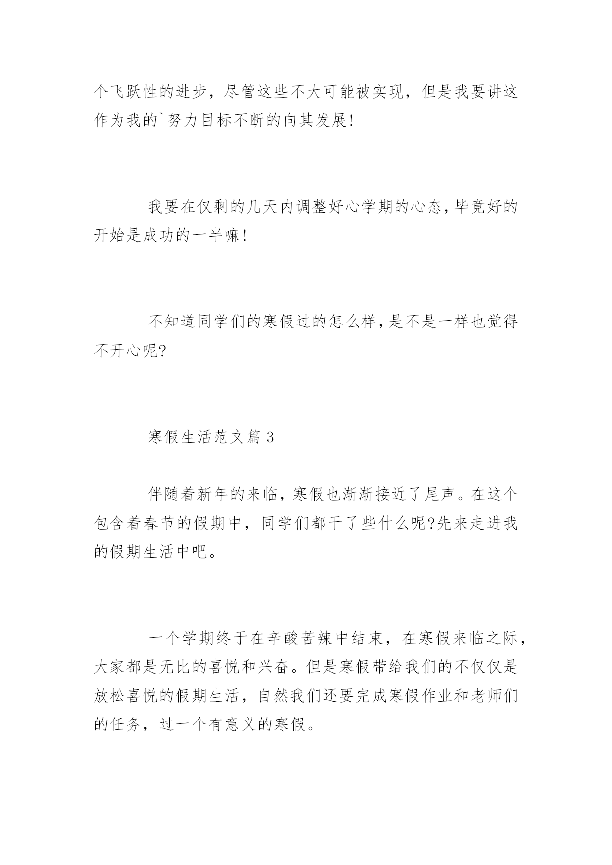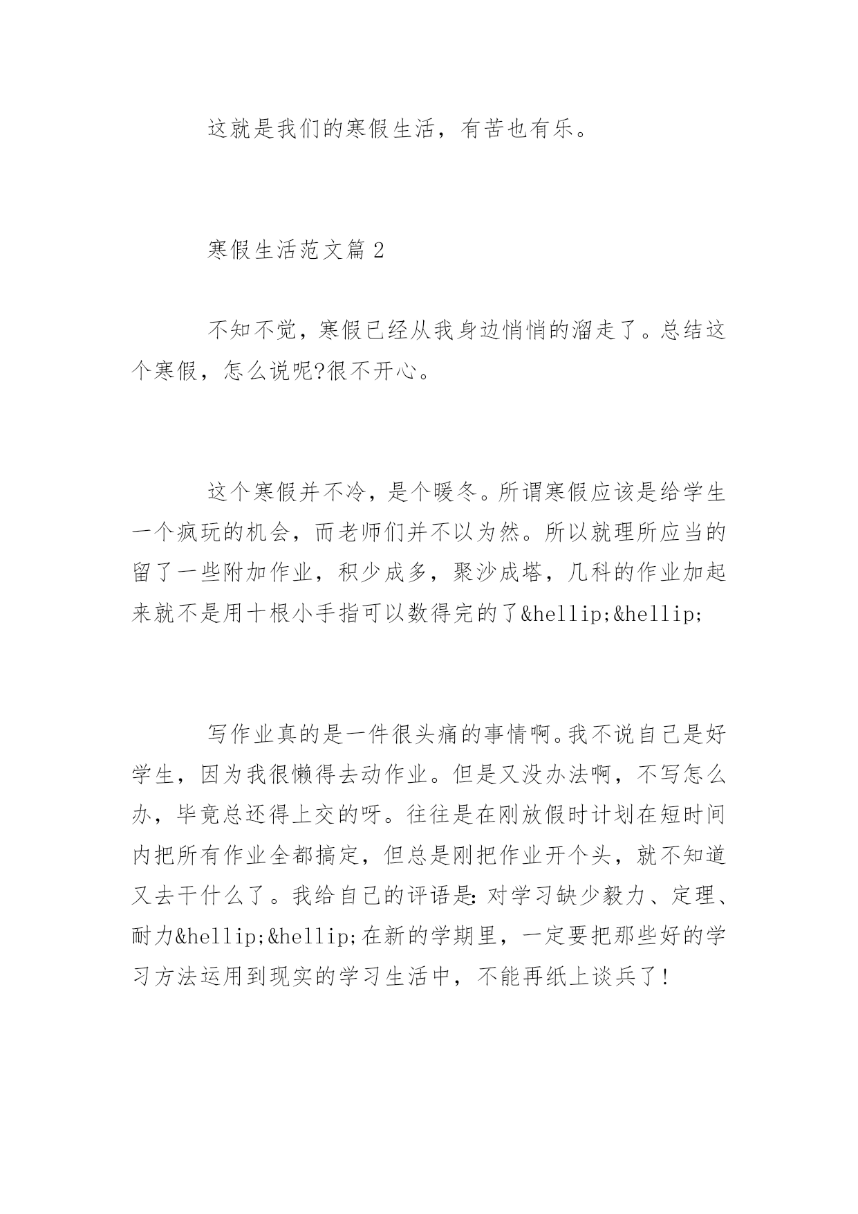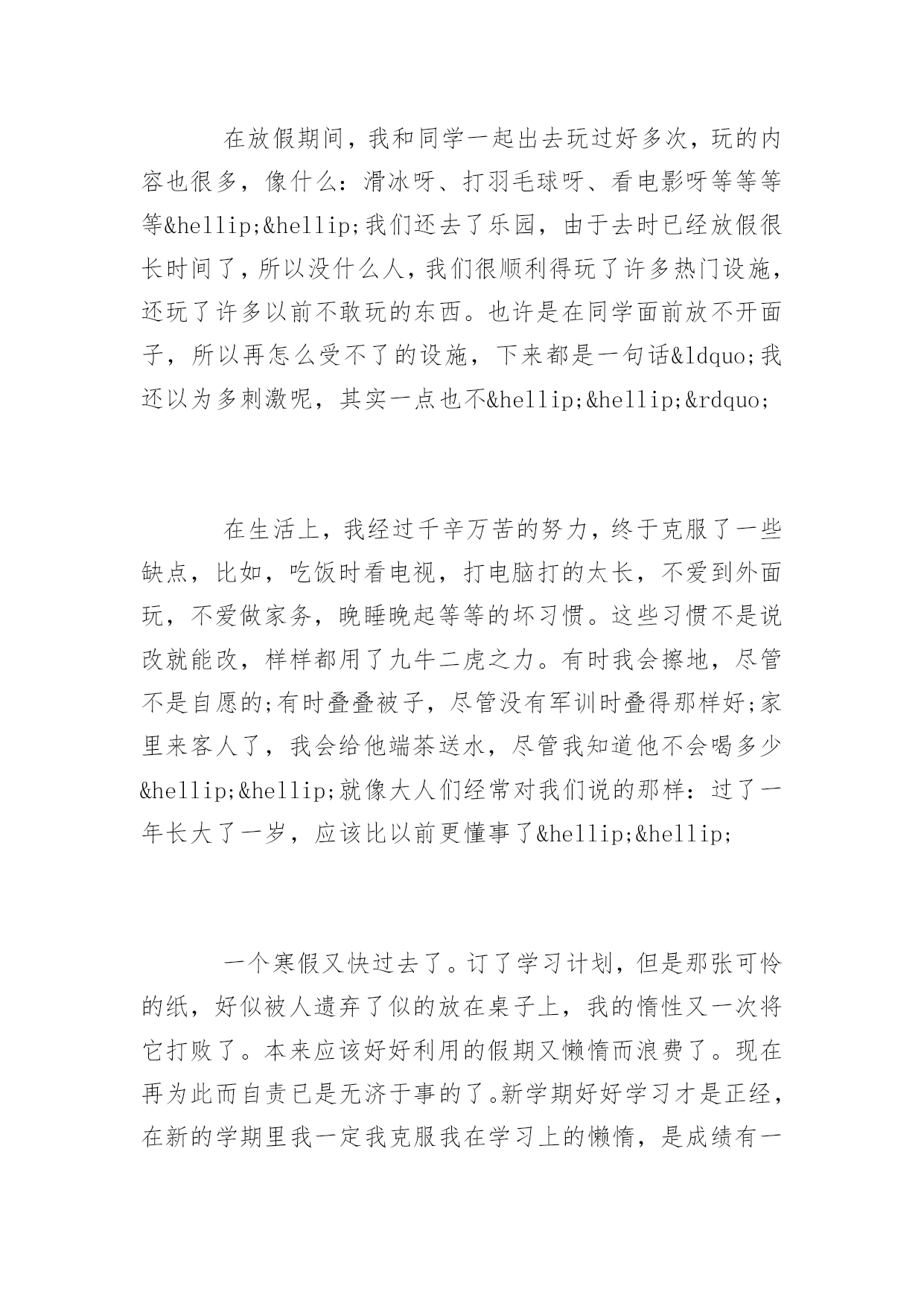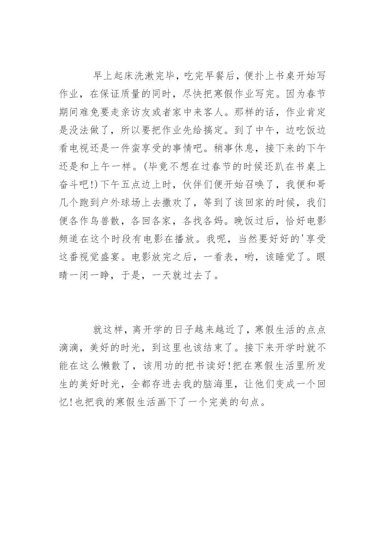 寒假生活作文寒假生活作文放寒假是每个学生最开心的了,那么寒假怎么长时间是怎么度过生活的呢?为此小编为大家精心推荐一些寒假生活范文优秀例文,希望对大家有帮助。寒假生活范文篇1一年一度的寒假即将结束,迎接我的又将是新的一个学期,在新学期即将来临之际,我决定写这篇文章以对我的寒假生活作一个简单的小结,以促进自己的进步。寒假是短暂的,但是它有许多值得我们留恋的地方。短暂的3个星期就有一个星期是在过新年而剩余的两个星期又要被复习、做作业、预习所充配,真正属于我们自己的时间真的是很少,因此如何合理地安排时间成了一个很重要的问题。这个寒假老师布置了不少的作业,不像暑假,虽然作业也不少,但作业总量也不过就是寒假的两倍,充其量是6个星期的作业,还有3个星期来供我们缓冲。而寒假的.时间则被整整占得一干二净,有时还要出去旅游,所以我想经过这个暑假应该很多人都懂得了如何安排时间。以前寒假天天睡懒觉,现在不行了,睡到7:30就差不多了,最晚也不能超过8:00,晚上也不能早早地就上床睡觉,要到9:30才行。其间14小时,非吃饭作业莫数也,然吃饭之时,则一手拿筷,一手翻书,桌上多长米饭,汤流大瀑,飞漱其间,悲惨情形,别样风景。故李白做诗:“飞流直下三千尺,疑是银河落九天。”所幸通过我们十几天的努力奋斗,换来了宝贵的2、3天,这可是不愿做(作业)奴隶的人民用血肉筑起的长城(保卫自己的时间)。在这最后的2、3天中,我们打了那么一会儿游戏,正如孙同志所说“短得你连游戏都没有打通关”,也正如张同志所说“顶着n座大山”。2、3天的时间还没登记我们用完,我们就又投入了预习中。这就是我们的寒假生活,有苦也有乐。寒假生活范文篇2不知不觉,寒假已经从我身边悄悄的溜走了。总结这个寒假,怎么说呢?很不开心。这个寒假并不冷,是个暖冬。所谓寒假应该是给学生一个疯玩的机会,而老师们并不以为然。所以就理所应当的留了一些附加作业,积少成多,聚沙成塔,几科的作业加起来就不是用十根小手指可以数得完的了……写作业真的是一件很头痛的事情啊。我不说自己是好学生,因为我很懒得去动作业。但是又没办法啊,不写怎么办,毕竟总还得上交的呀。往往是在刚放假时计划在短时间内把所有作业全都搞定,但总是刚把作业开个头,就不知道又去干什么了。我给自己的评语是:对学习缺少毅力、定理、耐力……在新的学期里,一定要把那些好的学习方法运用到现实的学习生活中,不能再纸上谈兵了!在放假期间,我和同学一起出去玩过好多次,玩的内容也很多,像什么:滑冰呀、打羽毛球呀、看电影呀等等等等……我们还去了乐园,由于去时已经放假很长时间了,所以没什么人,我们很顺利得玩了许多热门设施,还玩了许多以前不敢玩的东西。也许是在同学面前放不开面子,所以再怎么受不了的设施,下来都是一句话“我还以为多刺激呢,其实一点也不……”在生活上,我经过千辛万苦的努力,终于克服了一些缺点,比如,吃饭时看电视,打电脑打的太长,不爱到外面玩,不爱做家务,晚睡晚起等等的坏习惯。这些习惯不是说改就能改,样样都用了九牛二虎之力。有时我会擦地,尽管不是自愿的;有时叠叠被子,尽管没有军训时叠得那样好;家里来客人了,我会给他端茶送水,尽管我知道他不会喝多少……就像大人们经常对我们说的那样:过了一年长大了一岁,应该比以前更懂事了……一个寒假又快过去了。订了学习计划,但是那张可怜的纸,好似被人遗弃了似的放在桌子上,我的惰性又一次将它打败了。本来应该好好利用的假期又懒惰而浪费了。现在再为此而自责已是无济于事的了。新学期好好学习才是正经,在新的学期里我一定我克服我在学习上的懒惰,是成绩有一个飞跃性的进步,尽管这些不大可能被实现,但是我要讲这作为我的`努力目标不断的向其发展!我要在仅剩的几天内调整好心学期的心态,毕竟好的开始是成功的一半嘛!不知道同学们的寒假过的怎么样,是不是一样也觉得不开心呢?寒假生活范文篇3伴随着新年的来临,寒假也渐渐接近了尾声。在这个包含着春节的假期中,同学们都干了些什么呢?先来走进我的假期生活中吧。一个学期终于在辛酸苦辣中结束,在寒假来临之际,大家都是无比的喜悦和兴奋。但是寒假带给我们的不仅仅是放松喜悦的假期生活,自然我们还要完成寒假作业和老师们的任务,过一个有意义的寒假。早上起床洗漱完毕,吃完早餐后,便扑上书桌开始写作业,在保证质量的同时,尽快把寒假作业写完。因为春节期间难免要走亲访友或者家中来客人。那样的话,作业肯定是没法做了,所以要把作业先给搞定。到了中午,边吃