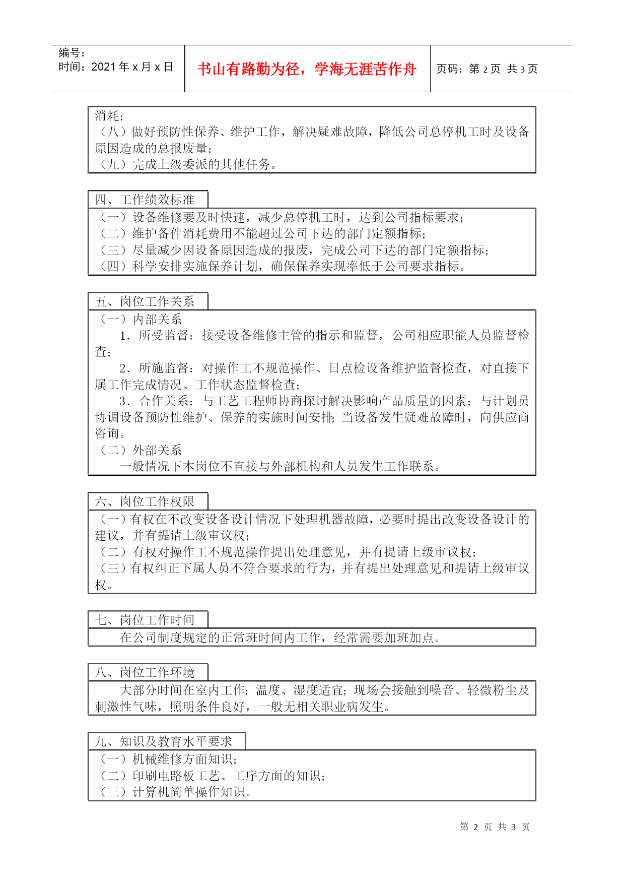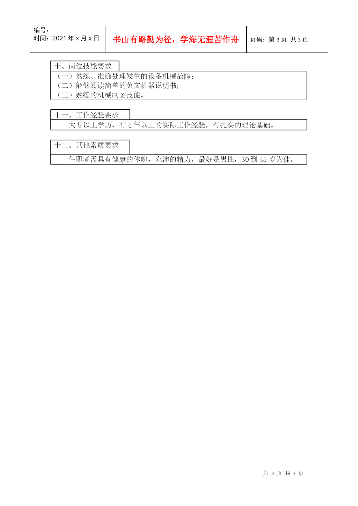 编号:时间:2021年x月x日书山有路勤为径,学海无涯苦作舟页码:第PAGE3页共NUMPAGES3页第PAGE\*MERGEFORMAT3页共NUMPAGES\*MERGEFORMAT3页××有限公司岗位工作说明书一、岗位标识信息岗位名称:机械维修专管隶属部门:制造部岗位编码:直接上级:设备主管工资等级:直接下级:维修全员可轮换岗位:行政维修分析日期:二、岗位工作概述全部设备维护工作的安排和实施及机械技术指导、设备机械维修工作,确保部门业务计划的完成。三、工作职责与任务(一)负责公司内设备日常故障维护工作安排、人员调动;(二)负责公司设备的机械维修工作及机械技术指导;(三)按设备保养手册和设备说明书制订保养计划建议,并按计划安排、实施保养工作,确保保养实现率及保养效果达标;(四)根据库存情况提交备件采购申购表,负责备件的验收与急购备件的提交,审核机械备件采购单的必要性、合理性;(五)指导操作工完成设备使用及简单保养工作;(六)做好日常设备的巡视检查工作,及时发现问题,处理隐患;(七)负责根据备件消耗情况提交降耗及国产化建议,并逐步降低设备维修备件消耗;(八)做好预防性保养、维护工作,解决疑难故障,降低公司总停机工时及设备原因造成的总报废量;(九)完成上级委派的其他任务。四、工作绩效标准(一)设备维修要及时快速,减少总停机工时,达到公司指标要求;(二)维护备件消耗费用不能超过公司下达的部门定额指标;(三)尽量减少因设备原因造成的报废,完成公司下达的部门定额指标;(四)科学安排实施保养计划,确保保养实现率低于公司要求指标。五、岗位工作关系(一)内部关系1.所受监督:接受设备维修主管的指示和监督,公司相应职能人员监督检查;2.所施监督:对操作工不规范操作、日点检设备维护监督检查,对直接下属工作完成情况、工作状态监督检查;3.合作关系:与工艺工程师协商探讨解决影响产品质量的因素;与计划员协调设备预防性维护、保养的实施时间安排;当设备发生疑难故障时,向供应商咨询。(二)外部关系一般情况下本岗位不直接与外部机构和人员发生工作联系。六、岗位工作权限(一)有权在不改变设备设计情况下处理机器故障,必要时提出改变设备设计的建议,并有提请上级审议权;(二)有权对操作工不规范操作提出处理意见,并有提请上级审议权;(三)有权纠正下属人员不符合要求的行为,并有提出处理意见和提请上级审议权。七、岗位工作时间在公司制度规定的正常班时间内工作,经常需要加班加点。八、岗位工作环境大部分时间在室内工作;温度、湿度适宜;现场会接触到噪音、轻微粉尘及刺激性气味,照明条件良好,一般无相关职业病发生。九、知识及教育水平要求(一)机械维修方面知识;(二)印刷电路板工艺、工序方面的知识;(三)计算机简单操作知识。十、岗位技能要求(一)熟练、准确处理发生的设备机械故障;(二)能够阅读简单的英文机器说明书;(三)熟练的机械制图技能。十一、工作经验要求大专以上学历,有4年以上的实际工作经验,有扎实的理论基础。十二、其他素质要求任职者需具有健康的体魄,充沛的精力。最好是男性,30到45岁为佳。