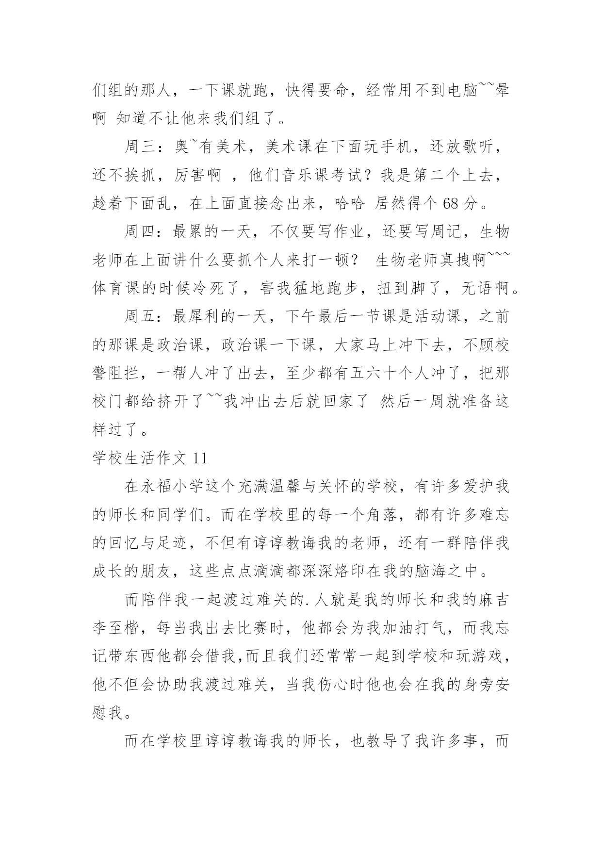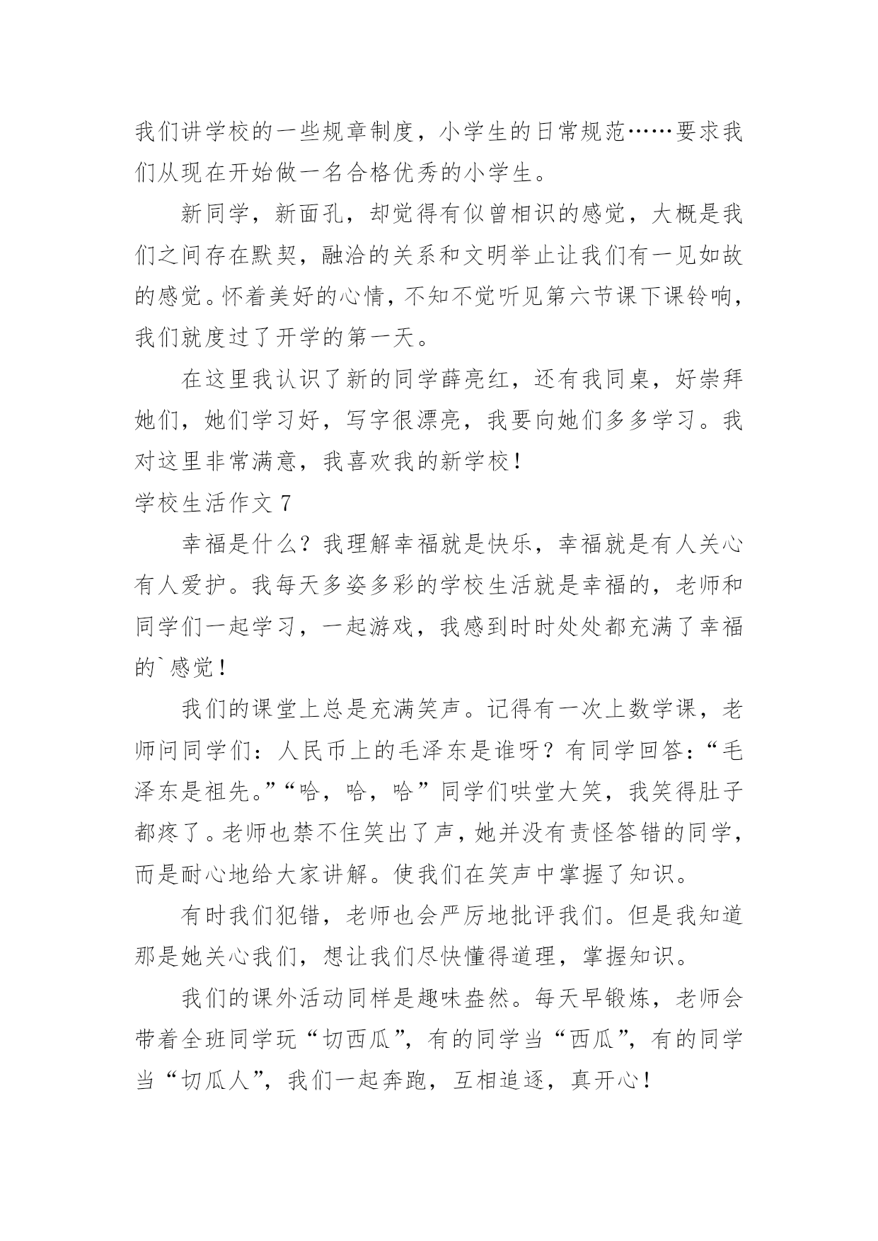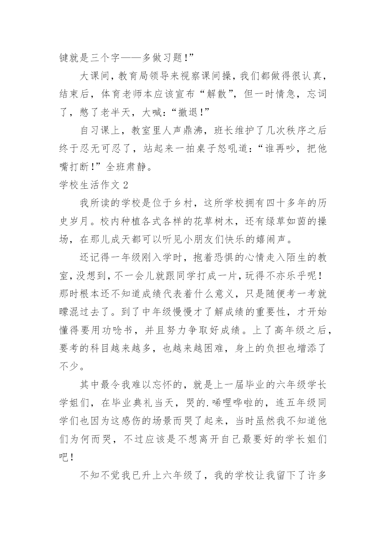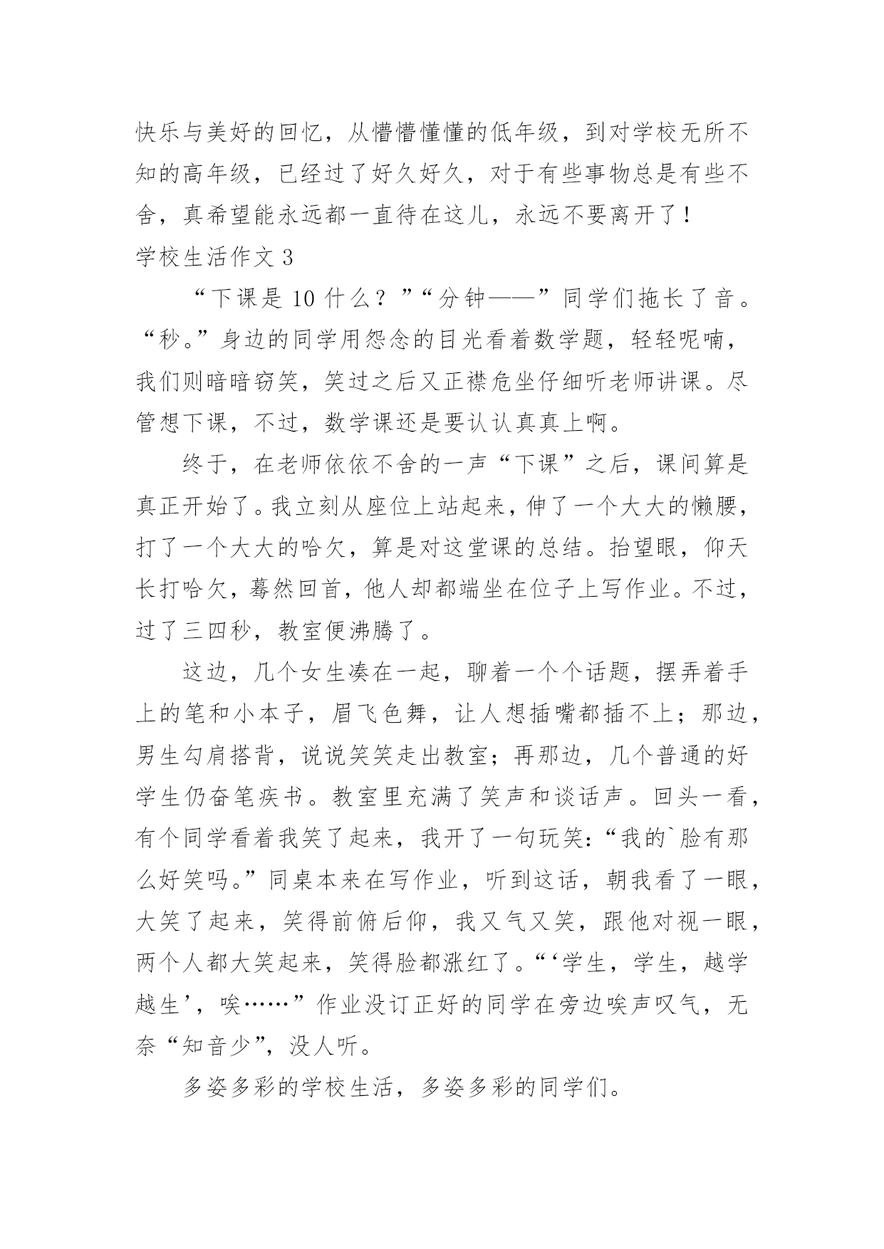 学校生活作文【推荐】学校生活作文无论在学习、工作或是生活中,大家都接触过作文吧,作文是人们把记忆中所存储的有关知识、经验和思想用书面形式表达出来的记叙方式。作文的注意事项有许多,你确定会写吗?以下是小编为大家整理的学校生活作文,欢迎阅读,希望大家能够喜欢。学校生活作文1今天是星期一,我来到学校感到特别亲切,毕竟两天没来上学了嘛,感到亲切也不足为奇。忽然感到好想念学校食堂里的饭。我发誓我中午一定要狂吃一顿。怎么还不下课?快下课吧!快下课吧!我要饿死了!!!!!!!!“铃铃铃···”终于下课了。狂奔去食堂。天啊!这么多人,(心情沮丧,哭了,嘻嘻……假的)忽然眼前一亮,啊!我最最喜欢吃的豆腐皮,太棒了,轮到我了,看到心仪已久的豆腐皮,我一激动队服务员说:“来一份土豆皮。”周围的'人惊呆了。下午第一节课上数学老师的课,有一个同学在下面闹,我们数学老师说:“你给我站墙上去!”高难度啊!数学老师转过身来,举起两根手指对我们说:“同学们,学好数学关键就是三个字——多做习题!”大课间,教育局领导来视察课间操,我们都做得很认真,结束后,体育老师本应该宣布“解散”,但一时情急,忘词了,憋了老半天,大喊:“撤退!”自习课上,教室里人声鼎沸,班长维护了几次秩序之后终于忍无可忍了,站起来一拍桌子怒吼道:“谁再吵,把他嘴打断!”全班肃静。学校生活作文2我所读的学校是位于乡村,这所学校拥有四十多年的历史岁月。校内种植各式各样的花草树木,还有绿草如茵的操场,在那儿成天都可以听见小朋友们快乐的嬉闹声。还记得一年级刚入学时,抱着恐惧的心情走入陌生的教室,没想到,不一会儿就跟同学打成一片,玩得不亦乐乎呢!那时根本还不知道成绩代表着什么意义,只是随便考一考就矇混过去了。到了中年级慢慢才了解成绩的重要性,才开始懂得要用功唸书,并且努力争取好成绩。上了高年级之后,要考的科目越来越多,也越来越困难,身上的负担也增添了不少。其中最令我难以忘怀的,就是上一届毕业的六年级学长学姐们,在毕业典礼当天,哭的.唏哩哗啦的,连五年级同学们也因为这感伤的场景而哭了起来,当时虽然我不知道他们为何而哭,不过应该是不想离开自己最要好的学长姐们吧!不知不觉我已升上六年级了,我的学校让我留下了许多快乐与美好的回忆,从懵懵懂懂的低年级,到对学校无所不知的高年级,已经过了好久好久,对于有些事物总是有些不舍,真希望能永远都一直待在这儿,永远不要离开了!学校生活作文3“下课是10什么?”“分钟——”同学们拖长了音。“秒。”身边的同学用怨念的目光看着数学题,轻轻呢喃,我们则暗暗窃笑,笑过之后又正襟危坐仔细听老师讲课。尽管想下课,不过,数学课还是要认认真真上啊。终于,在老师依依不舍的一声“下课”之后,课间算是真正开始了。我立刻从座位上站起来,伸了一个大大的懒腰,打了一个大大的哈欠,算是对这堂课的总结。抬望眼,仰天长打哈欠,蓦然回首,他人却都端坐在位子上写作业。不过,过了三四秒,教室便沸腾了。这边,几个女生凑在一起,聊着一个个话题,摆弄着手上的笔和小本子,眉飞色舞,让人想插嘴都插不上;那边,男生勾肩搭背,说说笑笑走出教室;再那边,几个普通的好学生仍奋笔疾书。教室里充满了笑声和谈话声。回头一看,有个同学看着我笑了起来,我开了一句玩笑:“我的`脸有那么好笑吗。”同桌本来在写作业,听到这话,朝我看了一眼,大笑了起来,笑得前俯后仰,我又气又笑,跟他对视一眼,两个人都大笑起来,笑得脸都涨红了。“‘学生,学生,越学越生’,唉……”作业没订正好的同学在旁边唉声叹气,无奈“知音少”,没人听。多姿多彩的学校生活,多姿多彩的同学们。学校生活作文4一般情况下,课后作业老师会在班中说一遍,但有时也会将作业发到家长群里,同学们便会惊奇地发现:怎么多了一项?不过发现了还好,倘若家长没留意……一次周末回来,L同学紧张地跑过来问我:“轩屹,那本《南方新课堂》也要做吗?你做了没?”我:“要做啊!我当然做了。”L同学更紧张了:“老师有说要做吗?”我向他解释了一通:“老师在家长群发的作业有这项。”L同学听罢,忙不迭地跑回去补作业了。过了一会,X同学跑过来问我:“轩屹,那本……”我:“要做,我做了。”X同学又问:“老师有说吗?我抄的作业没有这项啊!”我便又解释了一通。X同学一脸紧张地跑回去补作业了。又过了一会,Z同学快步走了过来。他还没来得及开口,我便说:“我懂,那本要做,我也没做!”……所以请各位家长还是留意一下家长群吧!学校生活作文5“当!当!当!”,每次一听到上课钟声,都让我觉得很期待,终于要上课了!不知道这节课要上些什么,每天的学习,都带着许多快乐,不过,我也希望上课有些比较新鲜的变化,这样应该会比较好玩。我希望每天的课程都有电脑课,这样就可以天天玩电脑,打电脑可以学到很多东西,透过网路可以知道很多事情,就可以比别人多知道一些知识,那就太