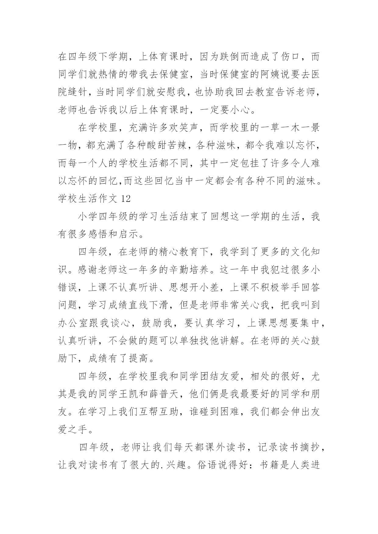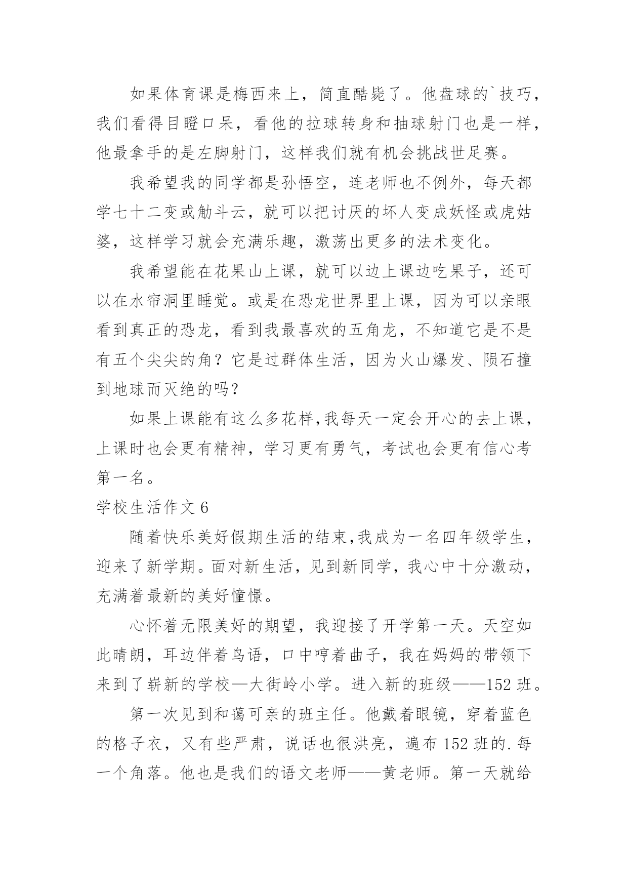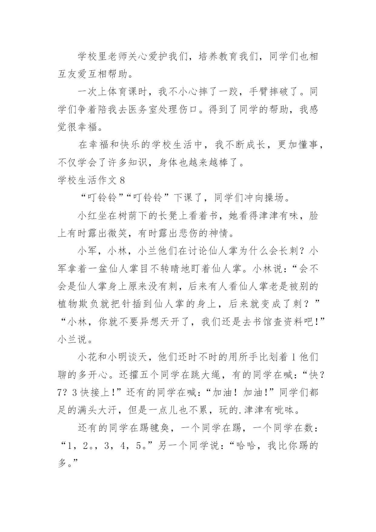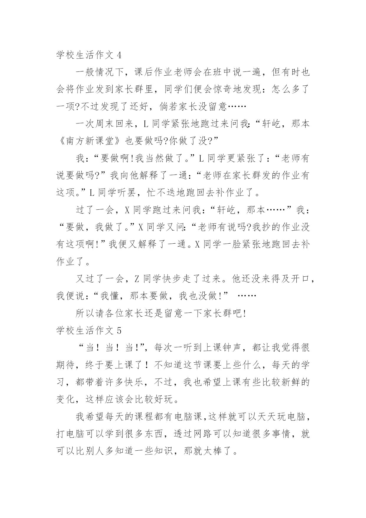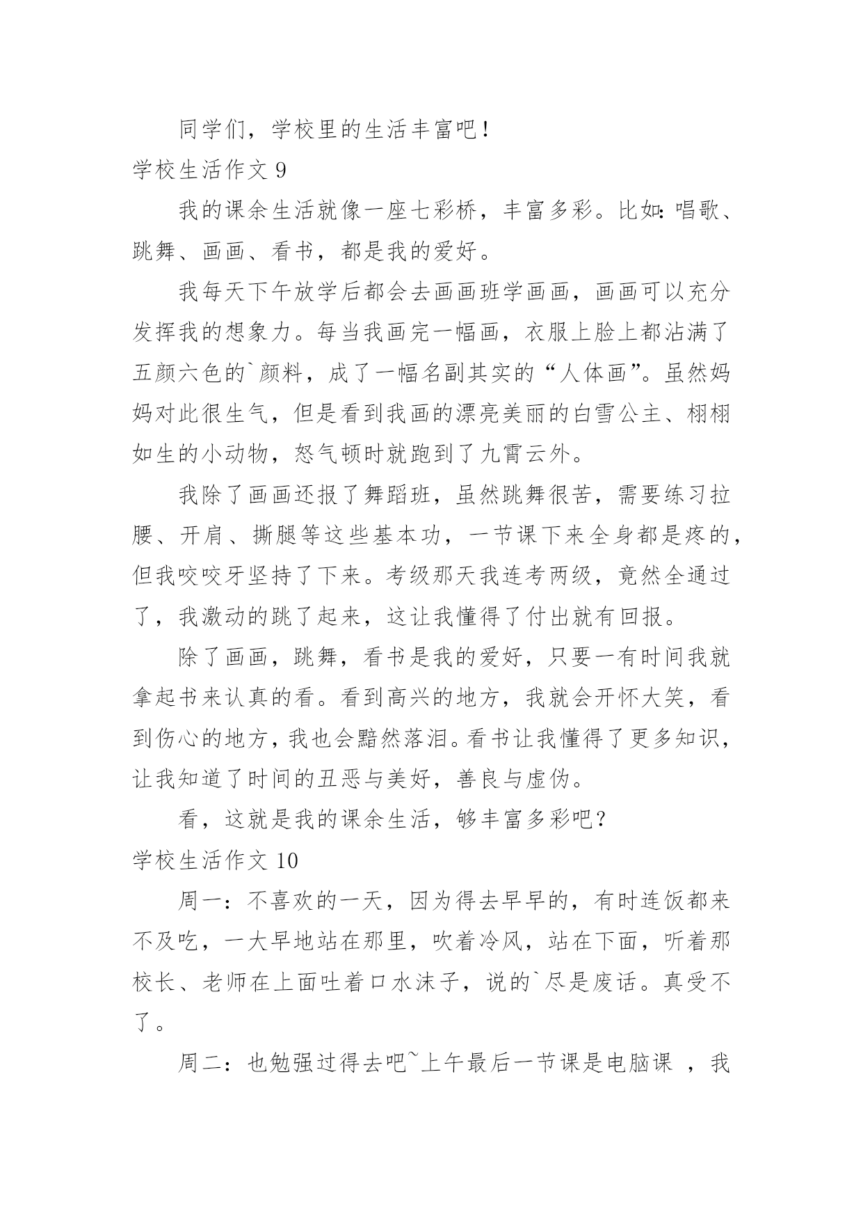 学校生活作文【推荐】学校生活作文无论在学习、工作或是生活中,大家都接触过作文吧,作文是人们把记忆中所存储的有关知识、经验和思想用书面形式表达出来的记叙方式。作文的注意事项有许多,你确定会写吗?以下是小编为大家整理的学校生活作文,欢迎阅读,希望大家能够喜欢。学校生活作文1今天是星期一,我来到学校感到特别亲切,毕竟两天没来上学了嘛,感到亲切也不足为奇。忽然感到好想念学校食堂里的饭。我发誓我中午一定要狂吃一顿。怎么还不下课?快下课吧!快下课吧!我要饿死了!!!!!!!!“铃铃铃···”终于下课了。狂奔去食堂。天啊!这么多人,(心情沮丧,哭了,嘻嘻……假的)忽然眼前一亮,啊!我最最喜欢吃的豆腐皮,太棒了,轮到我了,看到心仪已久的豆腐皮,我一激动队服务员说:“来一份土豆皮。”周围的'人惊呆了。下午第一节课上数学老师的课,有一个同学在下面闹,我们数学老师说:“你给我站墙上去!”高难度啊!数学老师转过身来,举起两根手指对我们说:“同学们,学好数学关键就是三个字——多做习题!”大课间,教育局领导来视察课间操,我们都做得很认真,结束后,体育老师本应该宣布“解散”,但一时情急,忘词了,憋了老半天,大喊:“撤退!”自习课上,教室里人声鼎沸,班长维护了几次秩序之后终于忍无可忍了,站起来一拍桌子怒吼道:“谁再吵,把他嘴打断!”全班肃静。学校生活作文2我所读的学校是位于乡村,这所学校拥有四十多年的历史岁月。校内种植各式各样的花草树木,还有绿草如茵的操场,在那儿成天都可以听见小朋友们快乐的嬉闹声。还记得一年级刚入学时,抱着恐惧的心情走入陌生的教室,没想到,不一会儿就跟同学打成一片,玩得不亦乐乎呢!那时根本还不知道成绩代表着什么意义,只是随便考一考就矇混过去了。到了中年级慢慢才了解成绩的重要性,才开始懂得要用功唸书,并且努力争取好成绩。上了高年级之后,要考的科目越来越多,也越来越困难,身上的负担也增添了不少。其中最令我难以忘怀的,就是上一届毕业的六年级学长学姐们,在毕业典礼当天,哭的.唏哩哗啦的,连五年级同学们也因为这感伤的场景而哭了起来,当时虽然我不知道他们为何而哭,不过应该是不想离开自己最要好的学长姐们吧!不知不觉我已升上六年级了,我的学校让我留下了许多快乐与美好的回忆,从懵懵懂懂的低年级,到对学校无所不知的高年级,已经过了好久好久,对于有些事物总是有些不舍,真希望能永远都一直待在这儿,永远不要离开了!学校生活作文3“下课是10什么?”“分钟——”同学们拖长了音。“秒。”身边的同学用怨念的目光看着数学题,轻轻呢喃,我们则暗暗窃笑,笑过之后又正襟危坐仔细听老师讲课。尽管想下课,不过,数学课还是要认认真真上啊。终于,在老师依依不舍的一声“下课”之后,课间算是真正开始了。我立刻从座位上站起来,伸了一个大大的懒腰,打了一个大大的哈欠,算是对这堂课的总结。抬望眼,仰天长打哈欠,蓦然回首,他人却都端坐在位子上写作业。不过,过了三四秒,教室便沸腾了。这边,几个女生凑在一起,聊着一个个话题,摆弄着手上的笔和小本子,眉飞色舞,让人想插嘴都插不上;那边,男生勾肩搭背,说说笑笑走出教室;再那边,几个普通的好学生仍奋笔疾书。教室里充满了笑声和谈话声。回头一看,有个同学看着我笑了起来,我开了一句玩笑:“我的`脸有那么好笑吗。”同桌本来在写作业,听到这话,朝我看了一眼,大笑了起来,笑得前俯后仰,我又气又笑,跟他对视一眼,两个人都大笑起来,笑得脸都涨红了。“‘学生,学生,越学越生’,唉……”作业没订正好的同学在旁边唉声叹气,无奈“知音少”,没人听。多姿多彩的学校生活,多姿多彩的同学们。学校生活作文4一般情况下,课后作业老师会在班中说一遍,但有时也会将作业发到家长群里,同学们便会惊奇地发现:怎么多了一项?不过发现了还好,倘若家长没留意……一次周末回来,L同学紧张地跑过来问我:“轩屹,那本《南方新课堂》也要做吗?你做了没?”我:“要做啊!我当然做了。”L同学更紧张了:“老师有说要做吗?”我向他解释了一通:“老师在家长群发的作业有这项。”L同学听罢,忙不迭地跑回去补作业了。过了一会,X同学跑过来问我:“轩屹,那本……”我:“要做,我做了。”X同学又问:“老师有说吗?我抄的作业没有这项啊!”我便又解释了一通。X同学一脸紧张地跑回去补作业了。又过了一会,Z同学快步走了过来。他还没来得及开口,我便说:“我懂,那本要做,我也没做!”……所以请各位家长还是留意一下家长群吧!学校生活作文5“当!当!当!”,每次一听到上课钟声,都让我觉得很期待,终于要上课了!不知道这节课要上些什么,每天的学习,都带着许多快乐,不过,我也希望上课有些比较新鲜的变化,这样应该会比较好玩。我希望每天的课程都有电脑课,这样就可以天天玩电脑,打电脑可以学到很多东西,透过网路可以知道很多事情,就可以比别人多知道一些知识,那就太