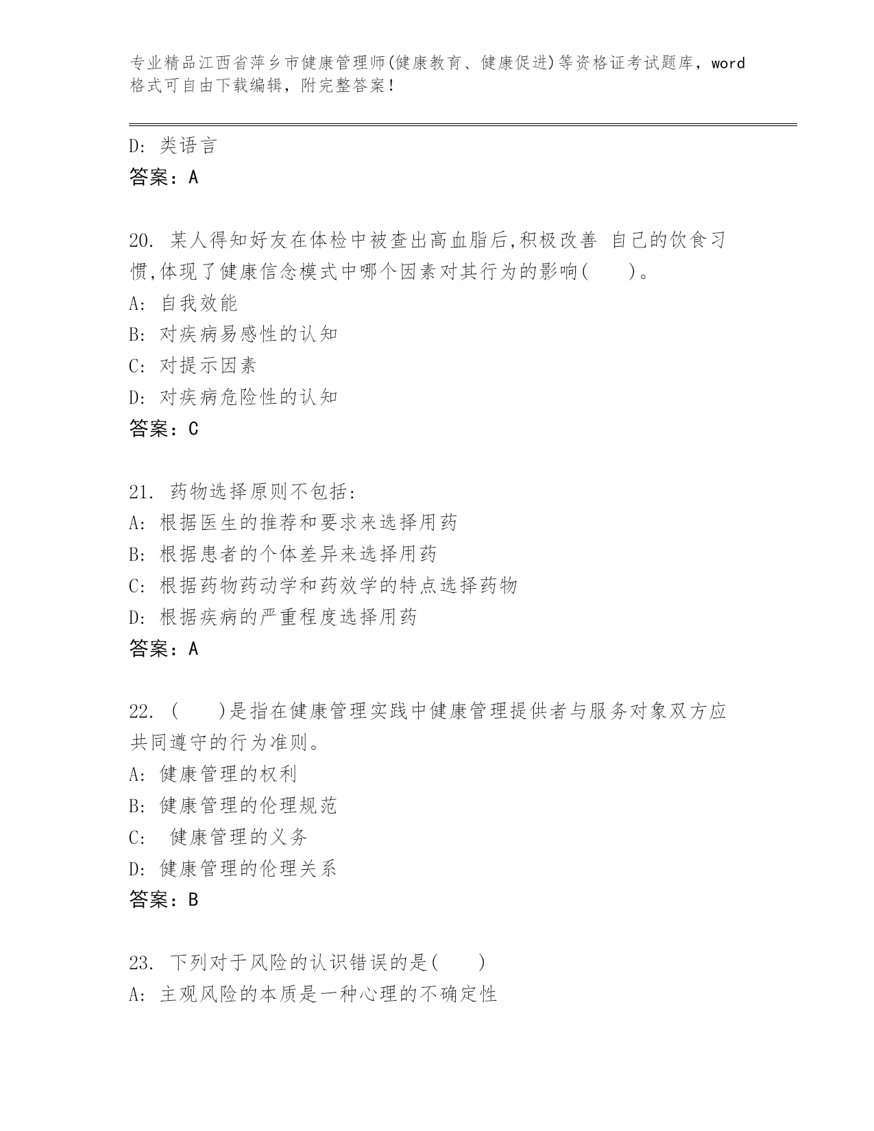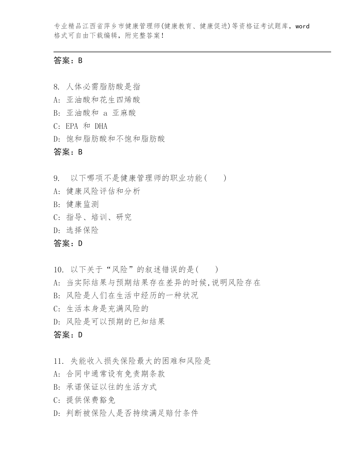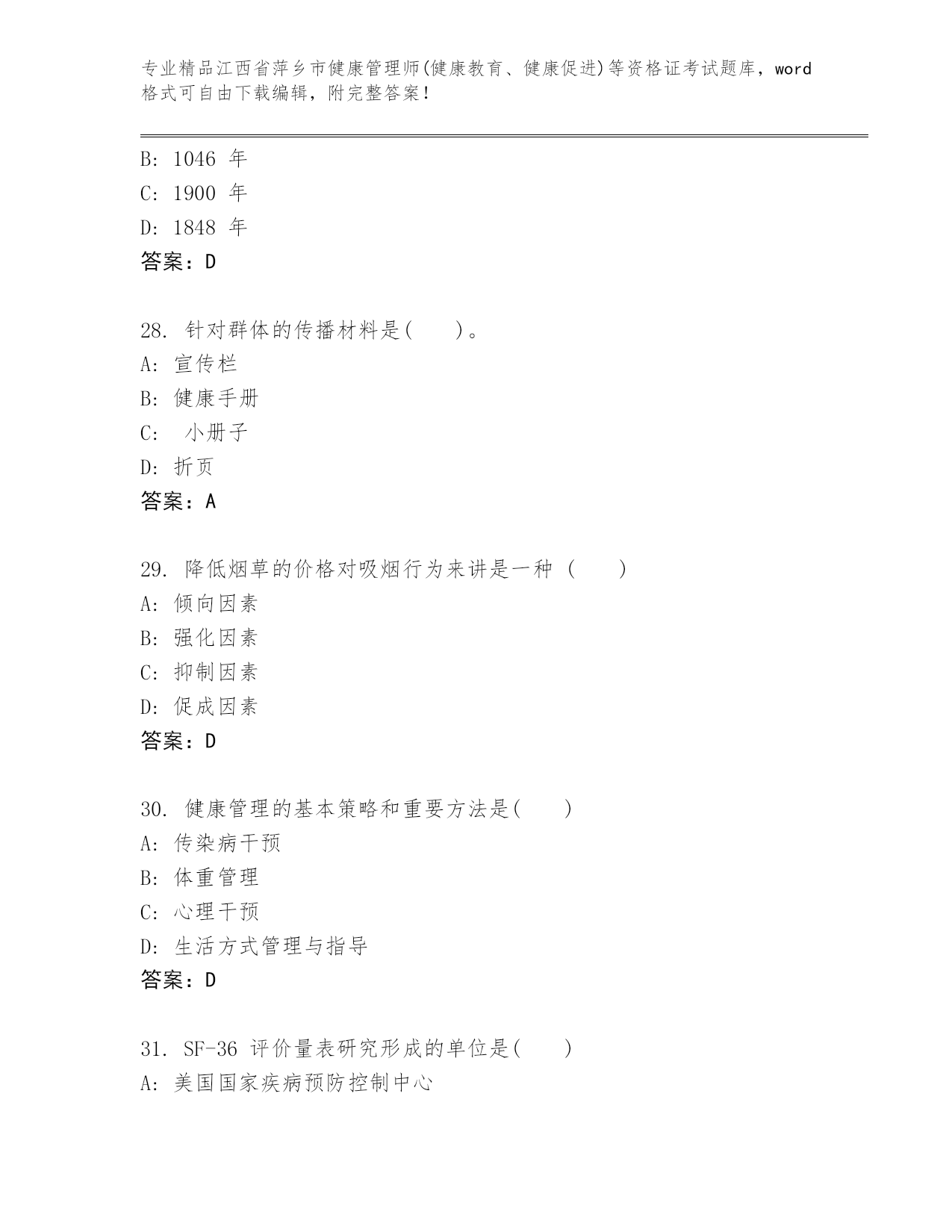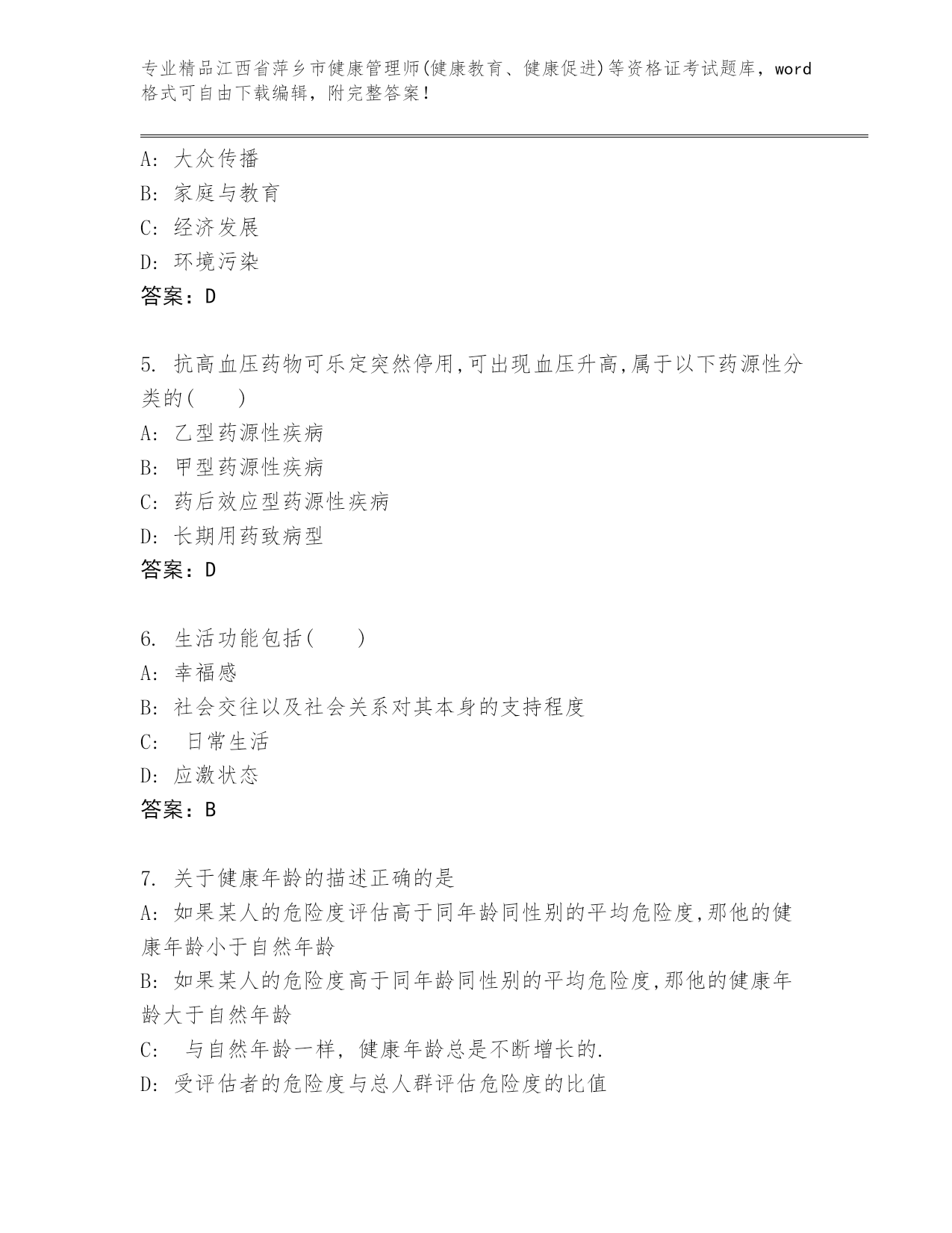 内部培训江西省萍乡市健康管理师(健康教育、健康促进)等资格证考试完整题库汇总