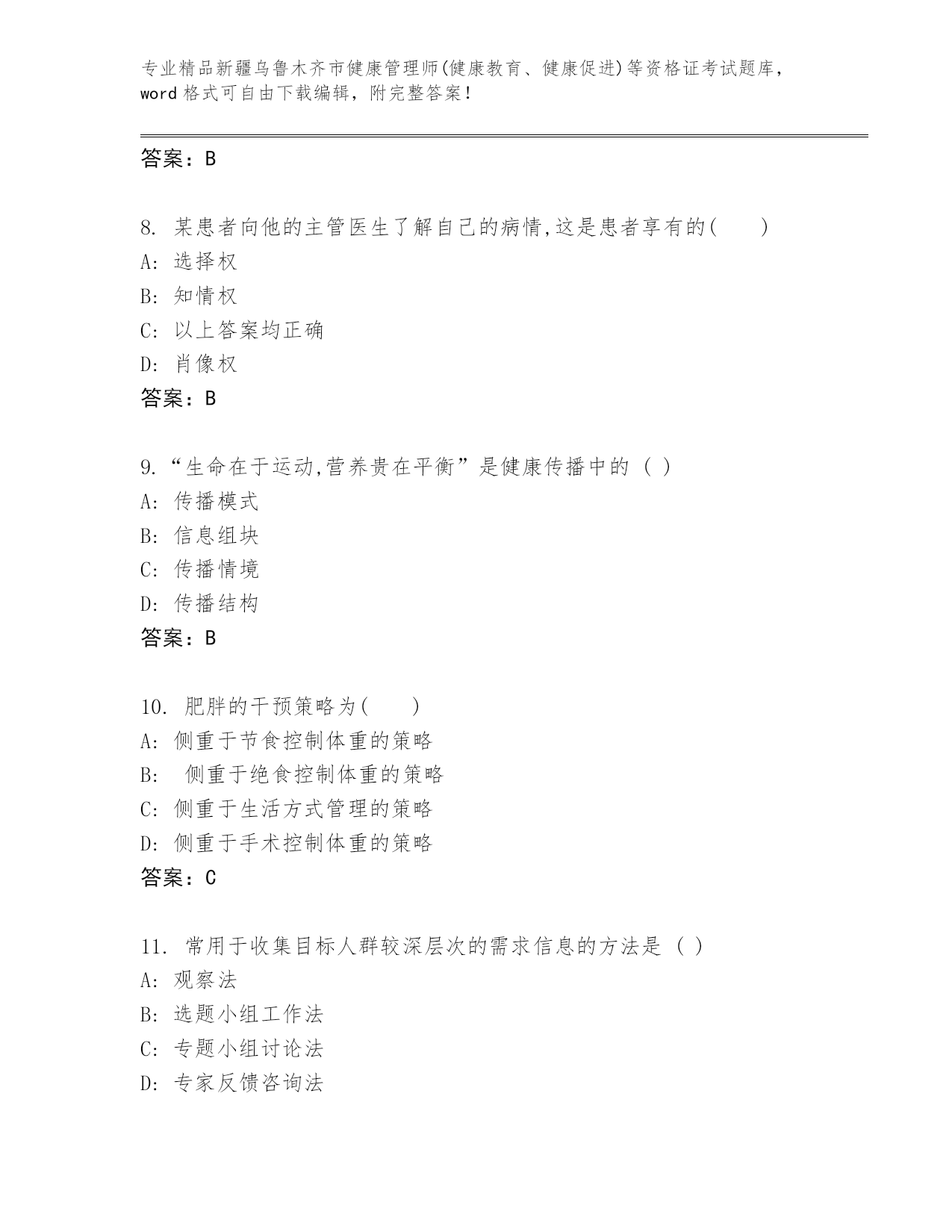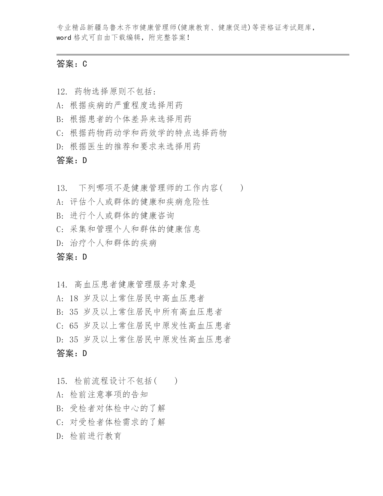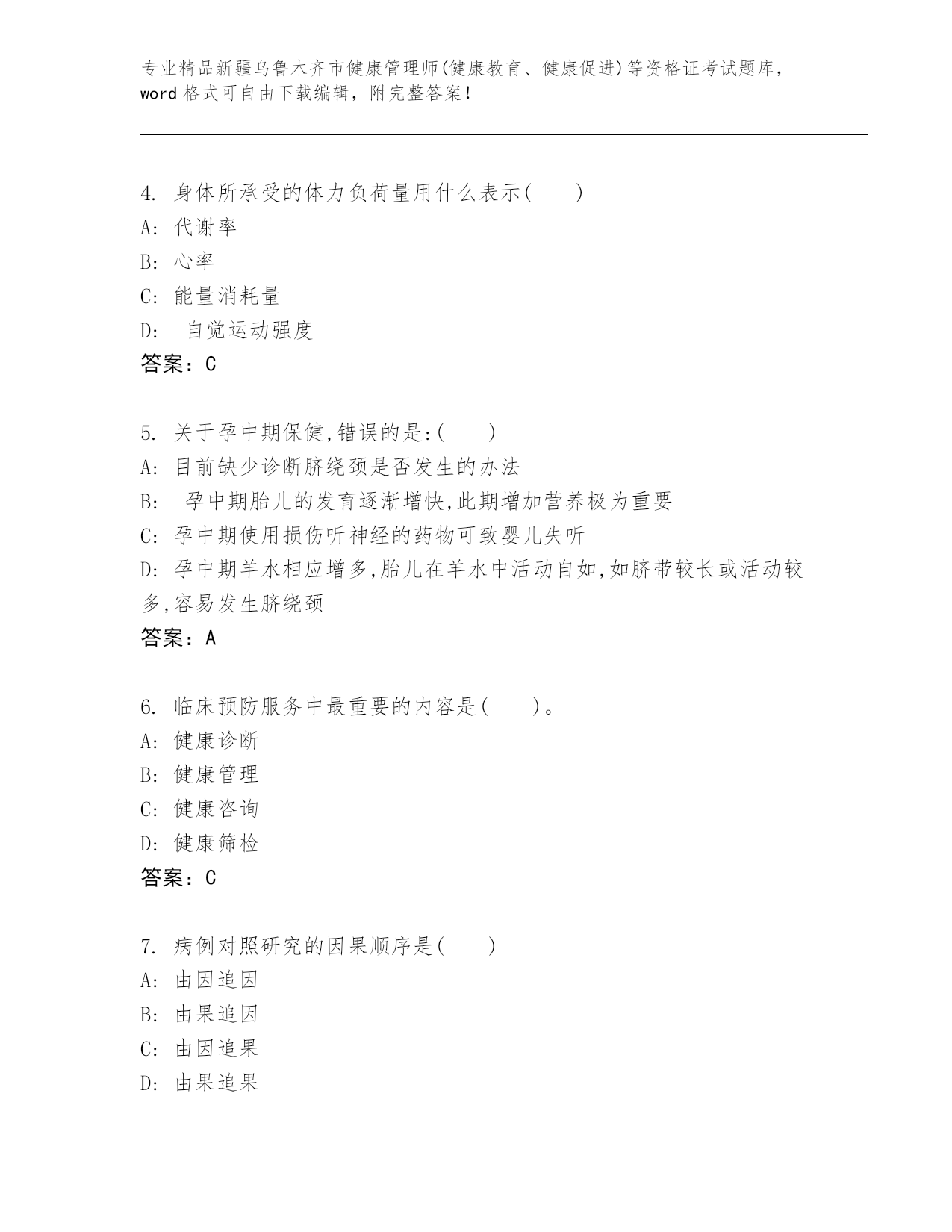 最新新疆乌鲁木齐市健康管理师(健康教育、健康促进)等资格证考试内部题库及答案【考点梳理】