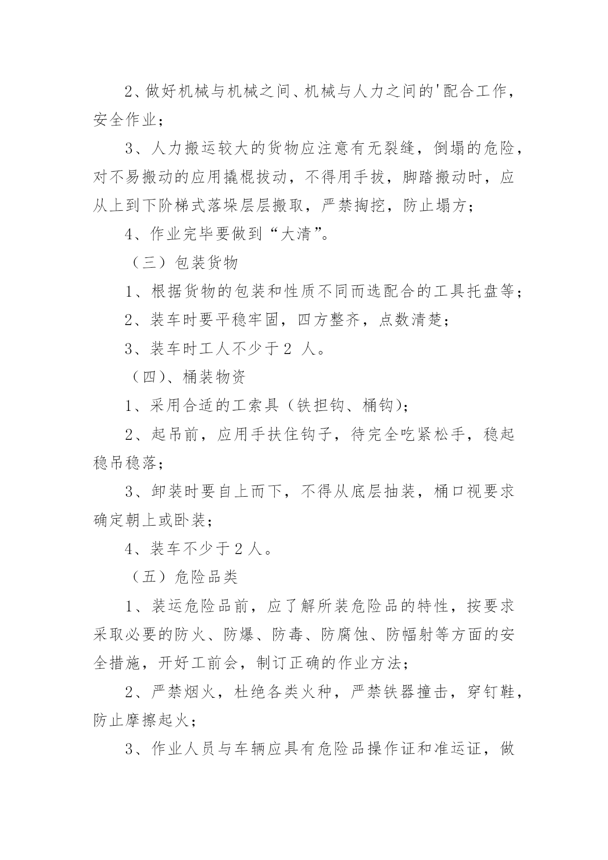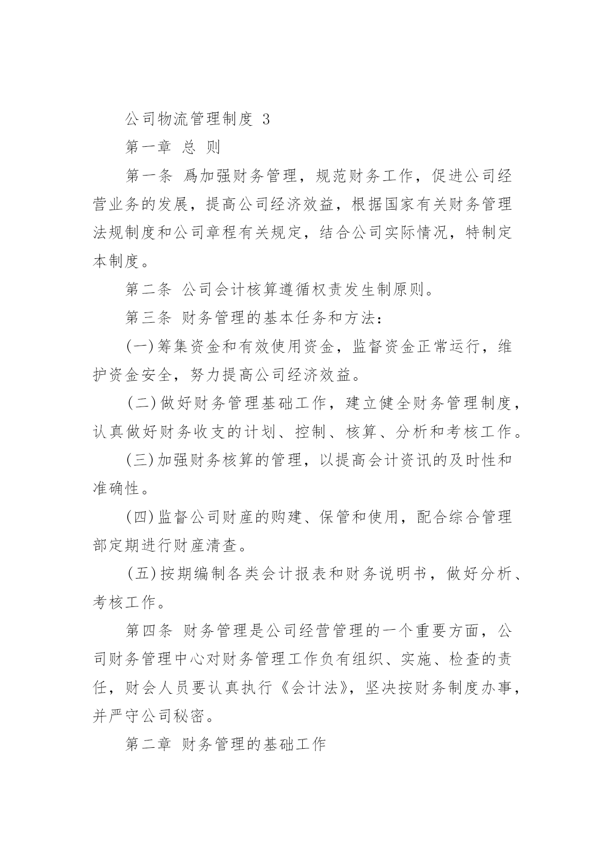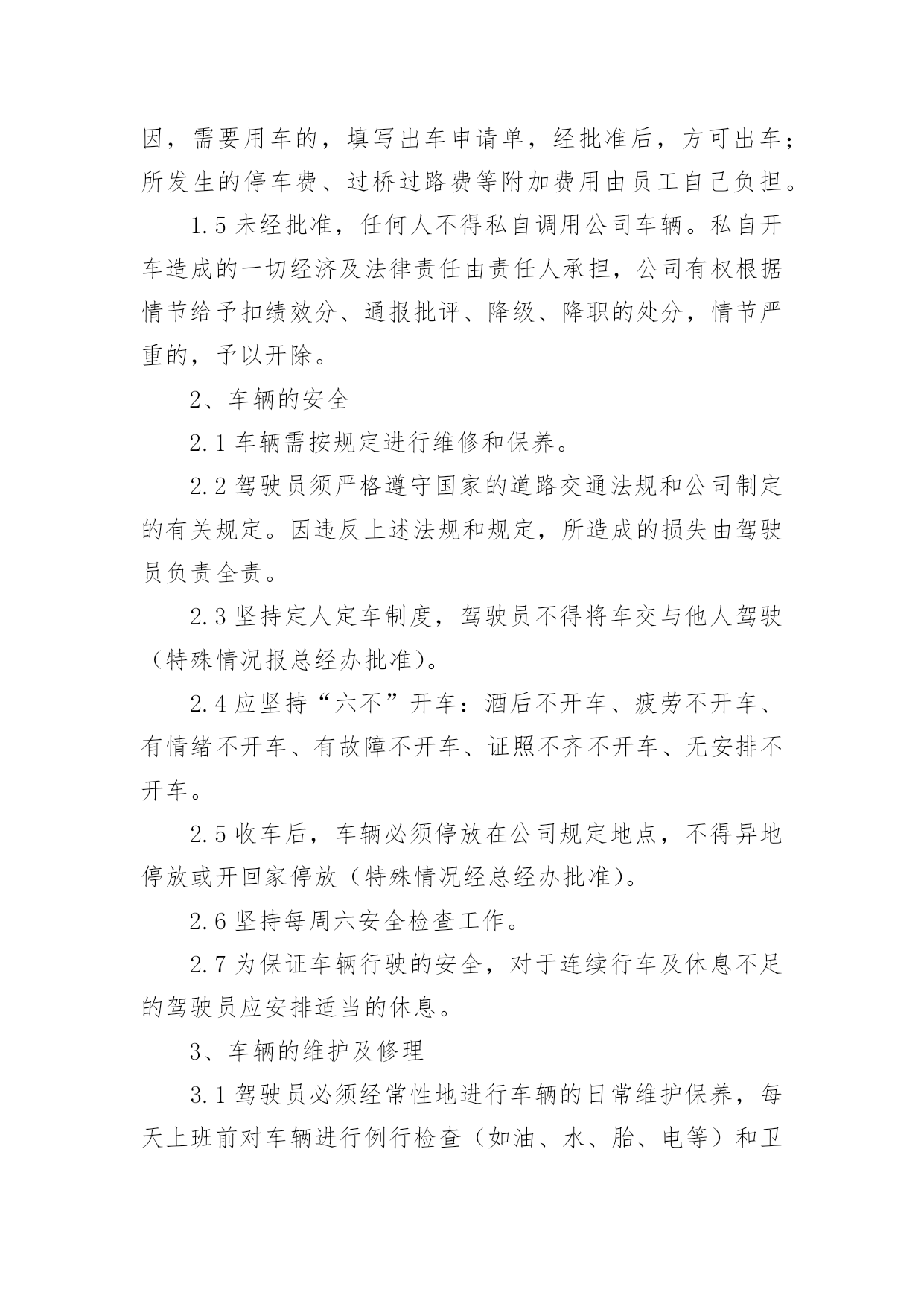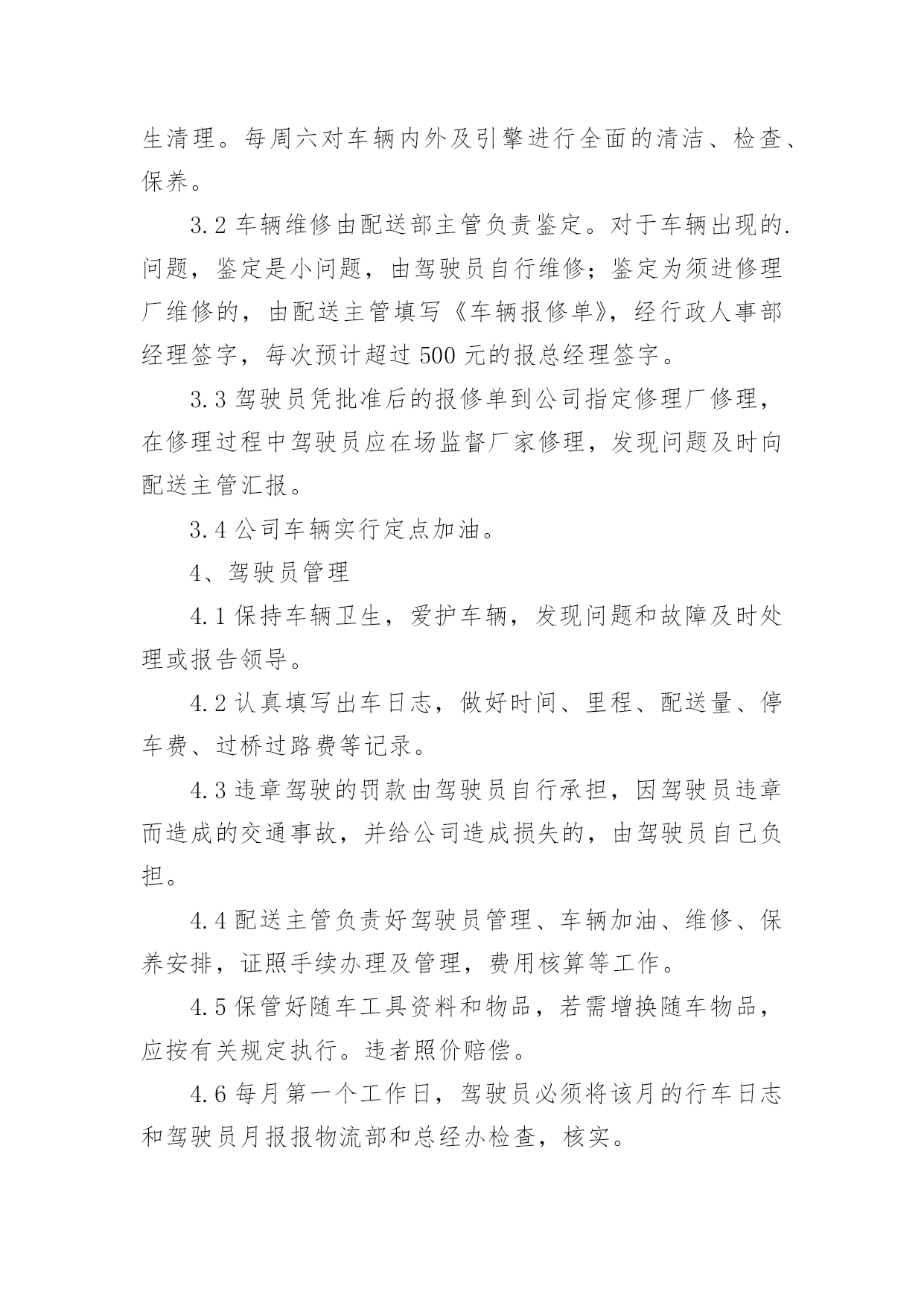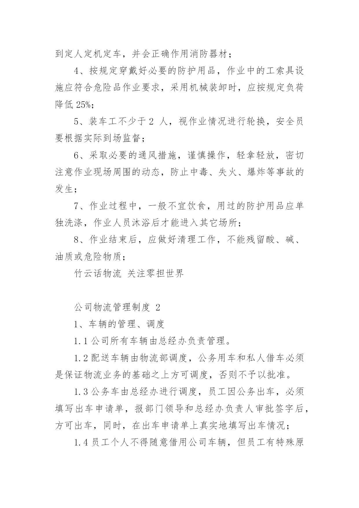 公司物流管理制度公司物流管理制度(通用17篇)现如今,我们每个人都可能会接触到制度,制度是要求大家共同遵守的办事规程或行动准则。我敢肯定,大部分人都对拟定制度很是头疼的,以下是小编收集整理的公司物流管理制度,希望对大家有所帮助。公司物流管理制度1(一)作业休息注意保护货物的安全:1、卸货开车门时,要慢慢试着打开车门,以防车门开启过快造成货物突然掉落伤人;2、叉车作业时,要有人协助指挥的同时,在旁进行装卸作业的人员要时刻注意躲避;3、装卸工堆码货垛较高时,要注意货垛的稳定性,如需再往其上加码货物则要有协助完成,以防货物掉下来或使货垛倾倒而伤人;4、装卸工当班期间休息时不要过于靠近码放较高的货垛或存放安全性差的货物旁边。5、登高作业时,更应谨慎操作,防止高空坠落和货物砸头。(二)散装货物1、根据物资的性能、形状、作业环境选择适用的工具和采用正确的装卸工艺;2、做好机械与机械之间、机械与人力之间的'配合工作,安全作业;3、人力搬运较大的货物应注意有无裂缝,倒塌的危险,对不易搬动的应用撬棍拔动,不得用手拔,脚踏搬动时,应从上到下阶梯式落垛层层搬取,严禁掏挖,防止塌方;4、作业完毕要做到“大清”。(三)包装货物1、根据货物的包装和性质不同而选配合的工具托盘等;2、装车时要平稳牢固,四方整齐,点数清楚;3、装车时工人不少于2人。(四)、桶装物资1、采用合适的工索具(铁担钩、桶钩);2、起吊前,应用手扶住钩子,待完全吃紧松手,稳起稳吊稳落;3、卸装时要自上而下,不得从底层抽装,桶口视要求确定朝上或卧装;4、装车不少于2人。(五)危险品类1、装运危险品前,应了解所装危险品的特性,按要求采取必要的防火、防爆、防毒、防腐蚀、防幅射等方面的安全措施,开好工前会,制订正确的作业方法;2、严禁烟火,杜绝各类火种,严禁铁器撞击,穿钉鞋,防止摩擦起火;3、作业人员与车辆应具有危险品操作证和准运证,做到定人定机定车,并会正确作用消防器材;4、按规定穿戴好必要的防护用品,作业中的工索具设施应符合危险品作业要求,采用机械装卸时,应按规定负荷降低25%;5、装车工不少于2人,视作业情况进行轮换,安全员要根据实际到场监督;6、采取必要的通风措施,谨慎操作,轻拿轻放,密切注意作业现场周围的动态,防止中毒、失火、爆炸等事故的发生;7、作业过程中,一般不宜饮食,用过的防护用品应单独洗涤,作业人员沐浴后才能进入其它场所;8、作业结束后,应做好清理工作,不能残留酸、碱、油质或危险物质;竹云话物流关注零担世界公司物流管理制度21、车辆的管理、调度1.1公司所有车辆由总经办负责管理。1.2配送车辆由物流部调度,公务用车和私人借车必须是保证物流业务的基础之上方可调度,否则不予以批准。1.3公务车由总经办进行调度,员工因公务出车,必须填写出车申请单,报部门领导和总经办负责人审批签字后,方可出车,同时,在出车申请单上真实地填写出车情况;1.4员工个人不得随意借用公司车辆,但员工有特殊原因,需要用车的,填写出车申请单,经批准后,方可出车;所发生的停车费、过桥过路费等附加费用由员工自己负担。1.5未经批准,任何人不得私自调用公司车辆。私自开车造成的一切经济及法律责任由责任人承担,公司有权根据情节给予扣绩效分、通报批评、降级、降职的处分,情节严重的,予以开除。2、车辆的安全2.1车辆需按规定进行维修和保养。2.2驾驶员须严格遵守国家的道路交通法规和公司制定的有关规定。因违反上述法规和规定,所造成的损失由驾驶员负责全责。2.3坚持定人定车制度,驾驶员不得将车交与他人驾驶(特殊情况报总经办批准)。2.4应坚持“六不”开车:酒后不开车、疲劳不开车、有情绪不开车、有故障不开车、证照不齐不开车、无安排不开车。2.5收车后,车辆必须停放在公司规定地点,不得异地停放或开回家停放(特殊情况经总经办批准)。2.6坚持每周六安全检查工作。2.7为保证车辆行驶的安全,对于连续行车及休息不足的驾驶员应安排适当的休息。3、车辆的维护及修理3.1驾驶员必须经常性地进行车辆的日常维护保养,每天上班前对车辆进行例行检查(如油、水、胎、电等)和卫生清理。每周六对车辆内外及引擎进行全面的清洁、检查、保养。3.2车辆维修由配送部主管负责鉴定。对于车辆出现的.问题,鉴定是小问题,由驾驶员自行维修;鉴定为须进修理厂维修的,由配送主管填写《车辆报修单》,经行政人事部经理签字,每次预计超过500元的报总经理签字。3.3驾驶员凭批准后的报修单到公司指定修理厂修理,在修理过程中驾驶员应在场监督厂家修理,发现问题及时向配送主管汇报。3.4公司车辆实行定点加油。4、驾驶员管理4.1保持车辆卫生,爱护车辆,发现问题和故障及时处理或报告领导。4.2认真填写出车日志,做好时间、里程、配送量、停车费、过桥过路费等记录。4.3违章驾驶的罚款由驾驶员自