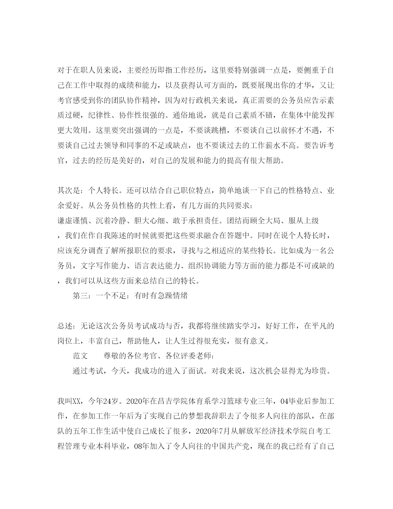 此资料由网络收集而来,如有侵权请告知上传者立即删除。资料共分享,我们负责传递知识。国考公务员面试自我介绍的思路2020年的国考,大家准备的如何呢?在这个公务员面试自我介绍方面有什么困惑?下面是小编收集整理的国考公务员面试自我介绍的思路,希望能帮到你。考生的自我介绍应该遵循实事求是原则,没有什么固定的模板,但我们可以从以下几个方面展开:总述:个人的基本情况,侧重于姓名、(有时要求回答时不能涉及姓名,用考号代替)年龄、学历专业、政治面貌。分述:首先个人的主要经历,这里的个人经历从时间段上来划分主要指两个方面:学习经历和工作经历。对于应届毕业生来说,主要的经历当然是指学习经历,学习经历包括在学校取得的成绩、奖学金情况,是否评委优秀干部、大学生,参加过哪些实践活动等等。对于考生来说,这部分的陈述应该有所侧重,重点谈自己最辉煌的一面。这里有一点需要强调的是,如果面试的考生在校期间的学生工作经历非常丰富,几乎遍及各个方面,那么请注意,切不可陈述时间过长,挑最有代表的部分来说就可以。陈述时间过长一方面显得累赘,另一方面有可能让面试考官觉得考生在炫耀,引起考官的不好印象,不利于在面试中获得高分。此外,如果有勤工俭学经历,考生一定要谈谈,很多人经常忽视这方面的内容。实际上,这种经历很能体现考生的一种精神、一种毅力,那就是考生在经济不宽裕的情况下,仍然可以依靠自己的努力完成学业。这种经历本身就是一个值得赞扬的经历,考生如能很好的体现自己这方面的经历,应该可以获得不少的印象分。对于在职人员来说,主要经历即指工作经历,这里要特别强调一点是,要侧重于自己在工作中取得的成绩和能力,以及获得认可方面的,既要展现出你的才华,又让考官感受到你的团队协作精神,因为对行政机关来说,真正需要的公务员应告示素质过硬,纪律性、协作性很强的。通俗地说,就是自己素质不错,在集体中能发挥更大效用。这里要突出强调的一点是,不要谈跳槽,不要谈自己以前怀才不遇,不要谈自己过去领导和同事的不足或缺点,也不要谈过去的工作薪水不高。要告诉考官,过去的经历是美好的,对自己的发展和能力的提高有很大帮助。其次是:个人特长。还可以结合自己职位特点,简单地谈一下自己的性格特点、业余爱好。从公务员性格的共性上看,有几方面的共同要求:谦虚谨慎、沉着冷静、胆大心细、敢于承担责任。团结而顾全大局、服从上级,我们在作自我陈述的时候就要把这些要求融合在答题中。同时在说个人特长时,应该充分调查了解所报职位的要求,寻找与之相适应的某些特长。比如成为一名公务员,文字写作能力、语言表达能力、组织协调能力等方面的能力都是不可或缺的,我们可以从这些方面来总结自己的特长。第三:一个不足:有时有急躁情绪总述:无论这次公务员考试成功与否,我都将继续踏实学习,好好工作,在平凡的岗位上,丰富自己,帮助他人,让人生过得很充实,很有意义。范文尊敬的各位考官、各位评委老师:通过考试,今天,我成功的进入了面试。对我来说,这次机会显得尤为珍贵。我叫XX,今年24岁。2020年在昌吉学院体育系学习篮球专业三年,04毕业后参加工作,在参加工作一年后为了实现自己的梦想我辞职去了令很多人向往的部队,在部队的五年工作生活中使自己成长了很多,2020年7月从解放军经济技术学院自考工程管理专业本科毕业,08年加入了令人向往的中国共产党,现在的我已经有了自己的新目标,新理想,我的理想就是成为一名对国家,对社会有作为的一名公务人员,我知道作为一名普通的年轻人想成为一名国家公务人员是要有所准备和付出的,我已经做好了一切准备,假如,我通过了面试,成为众多广电队伍中的成员,我将不断努力学习,努力工作,为新疆广电事业贡献出自己有限的力量。