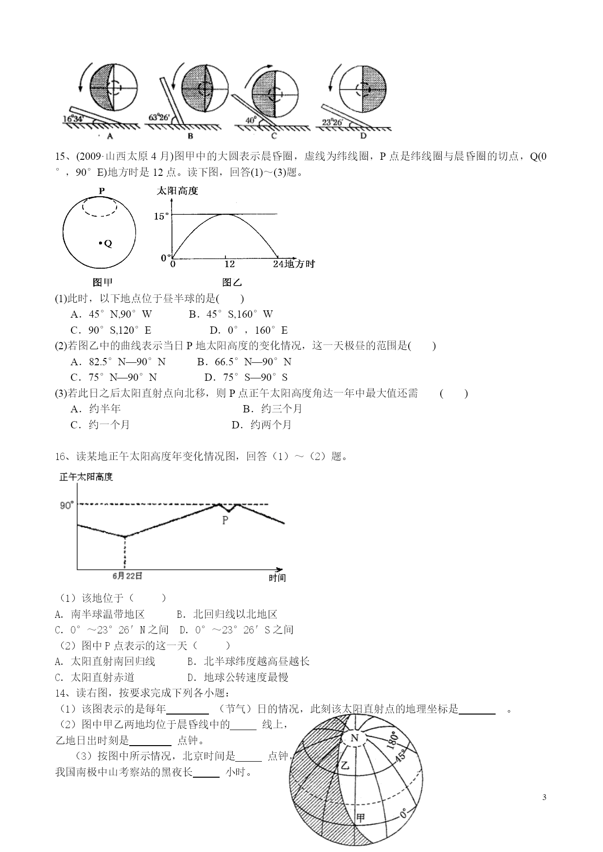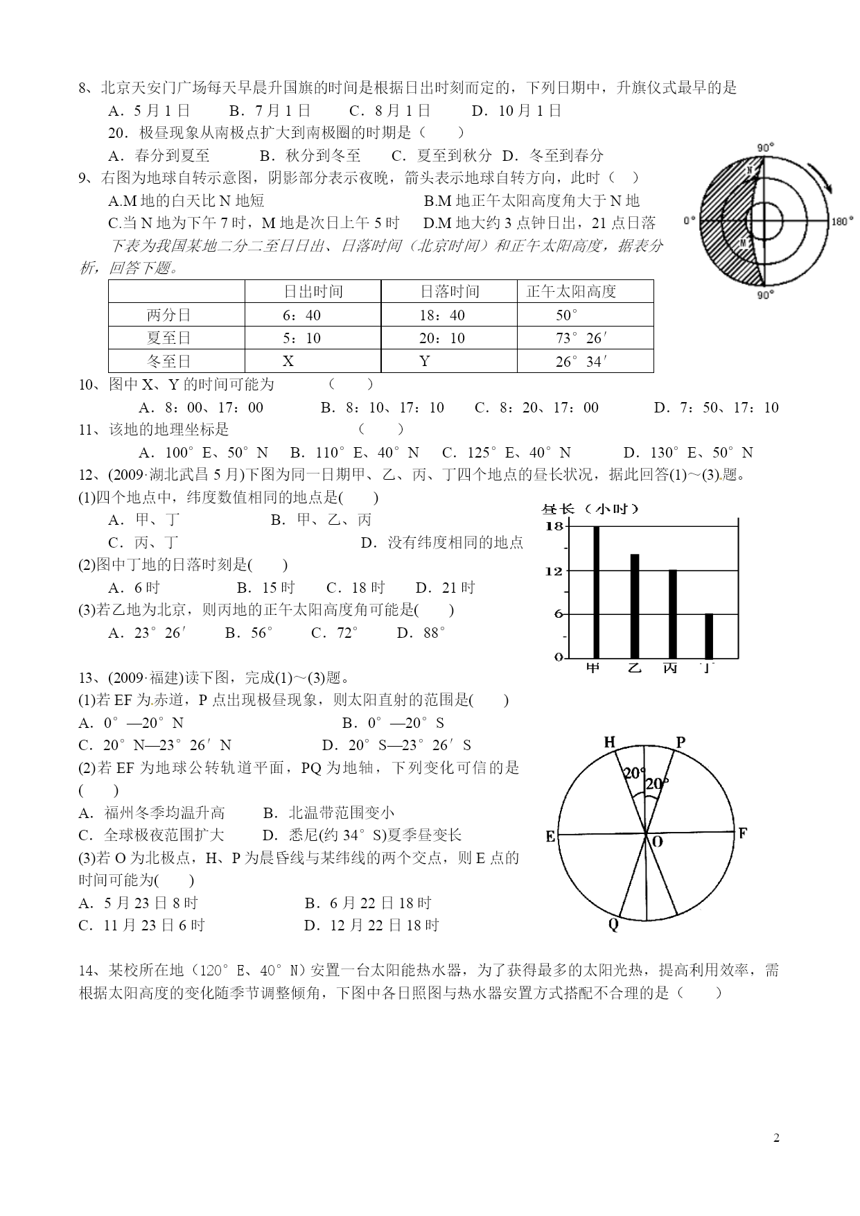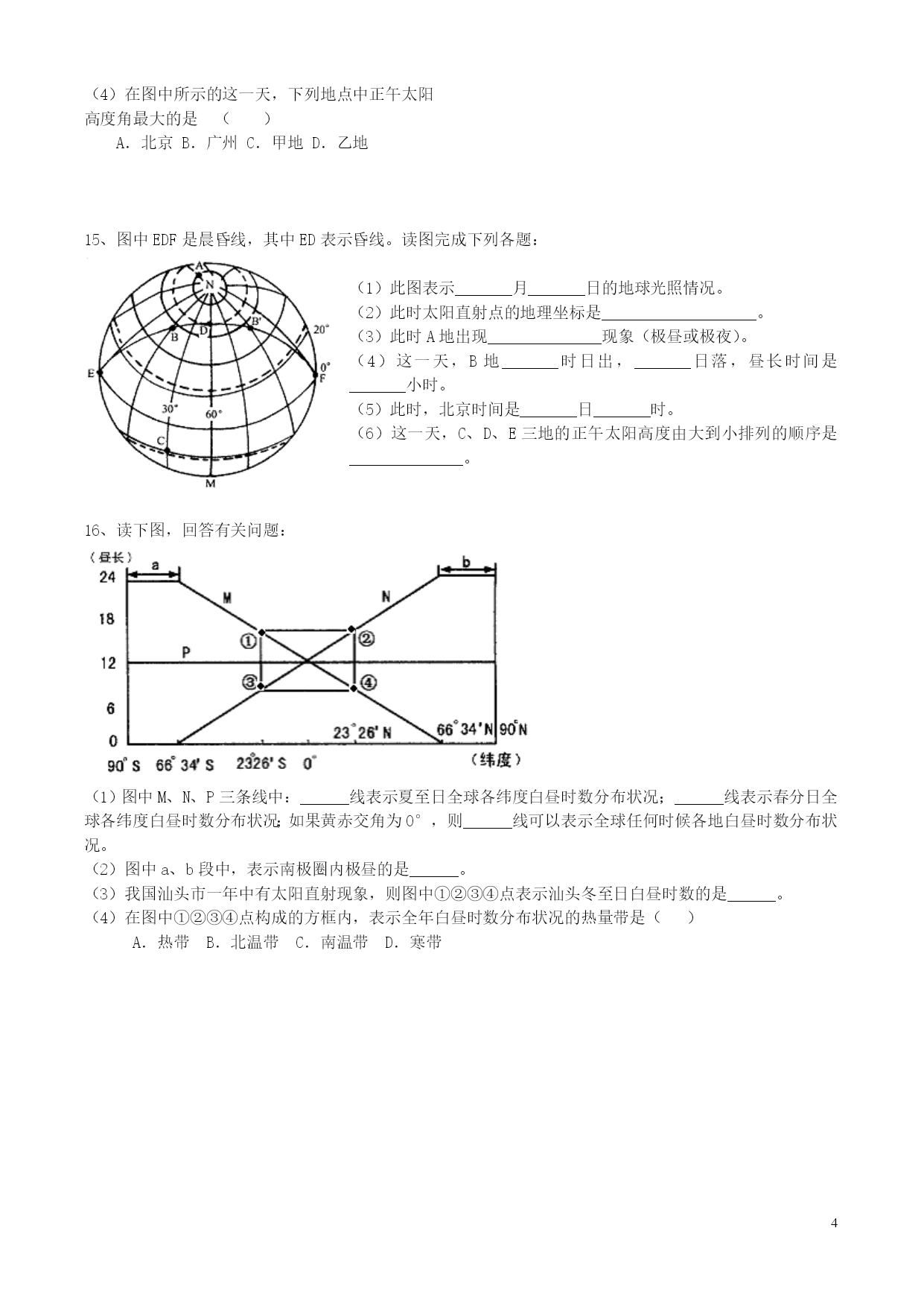 PAGEPAGE4地球的公转练习一、选择题1、关于地球公转的叙述,正确的是A.地球的公转轨道是正圆,公转一周360°所需的时间叫1恒星年B.地球公转速度在近日点比远日点小C.从地球北极上空向下看,地球自转和公转方向是一致的,都是逆时针D.地球在近日点时,黑龙江省正值夏季2、下列四幅表示地球绕日公转的示意图,正确的是A①③B②③C①④D②④读地球公转的“二分二至”图,回答4-5题:3、图中字母C所代表的节气名称是A.春分B.秋分C.冬至D.夏至4、有关国庆节前后太阳直射点和地球公转速度的叙述正确的是:A.地球公转到AB之间,速度减慢B.地球公转到BC之间,太阳直射点在北半球C.地球公转到CD之间,速度逐渐加快D.地球公转到DA之间,太阳直射点在南半球5、10月1日这一天,太阳直射点:A.在北半球,并向北移动B.在北半球,并向南移动C.在南半球,并向南移动D.在南半球,并向北移动6、关于晨昏线的叙述,正确的是A.晨昏圈平面与赤道平面之间的夹角最大为66°34′B.晨昏线上太阳高度为90°C.晨昏线是昼半球与夜半球的分界线D.在日照图上(侧视图),晨昏圈平面与地表太阳光线垂直,但不通过地心7、读太阳直射点在地表的年运动轨迹图,回答(1)~(2)题。(1)秋分日(9月23日)太阳直射点的位置是A.aB.bC.cD.d(2)当太阳直射点自a向b移动的过程中,下列现象不可信的是A.悉尼昼长夜短,且夜渐长B.全球气压带风带向北移动C.我国冬季风活动频繁D.我国北方河流进入汛期8、北京天安门广场每天早晨升国旗的时间是根据日出时刻而定的,下列日期中,升旗仪式最早的是A.5月1日B.7月1日C.8月1日D.10月1日20.极昼现象从南极点扩大到南极圈的时期是()A.春分到夏至B.秋分到冬至C.夏至到秋分D.冬至到春分9、右图为地球自转示意图,阴影部分表示夜晚,箭头表示地球自转方向,此时()A.M地的白天比N地短B.M地正午太阳高度角大于N地C.当N地为下午7时,M地是次日上午5时D.M地大约3点钟日出,21点日落下表为我国某地二分二至日日出、日落时间(北京时间)和正午太阳高度,据表分析,回答下题。日出时间日落时间正午太阳高度两分日6:4018:4050°夏至日5:1020:1073°26′冬至日XY26°34′10、图中X、Y的时间可能为()A.8:00、17:00B.8:10、17:10C.8:20、17:00D.7:50、17:1011、该地的地理坐标是()A.100°E、50°NB.110°E、40°NC.125°E、40°ND.130°E、50°N12、(2009·湖北武昌5月)下图为同一日期甲、乙、丙、丁四个地点的昼长状况,据此回答(1)~(3)题。(1)四个地点中,纬度数值相同的地点是()A.甲、丁B.甲、乙、丙C.丙、丁D.没有纬度相同的地点(2)图中丁地的日落时刻是()A.6时B.15时C.18时D.21时(3)若乙地为北京,则丙地的正午太阳高度角可能是()A.23°26′B.56°C.72°D.88°13、(2009·福建)读下图,完成(1)~(3)题。(1)若EF为赤道,P点出现极昼现象,则太阳直射的范围是()A.0°—20°NB.0°—20°SC.20°N—23°26′ND.20°S—23°26′S(2)若EF为地球公转轨道平面,PQ为地轴,下列变化可信的是()A.福州冬季均温升高B.北温带范围变小C.全球极夜范围扩大D.悉尼(约34°S)夏季昼变长(3)若O为北极点,H、P为晨昏线与某纬线的两个交点,则E点的时间可能为()A.5月23日8时B.6月22日18时C.11月23日6时D.12月22日18时14、某校所在地(120°E、40°N)安置一台太阳能热水器,为了获得最多的太阳光热,提高利用效率,需根据太阳高度的变化随季节调整倾角,下图中各日照图与热水器安置方式搭配不合理的是()15、(2009·山西太原4月)图甲中的大圆表示晨昏圈,虚线为纬线圈,P点是纬线圈与晨昏圈的切点,Q(0°,90°E)地方时是12点。读下图,回答(1)~(3)题。(1)此时,以下地点位于昼半球的是()A.45°N,90°WB.45°S,160°WC.90°S,120°ED.0°,160°E(2)若图乙中的曲线表示当日P地太阳高度的变化情况,这一天极昼的范围是()A.82.5°N—90°NB.66.5°N—90°NC.75°N—90°ND.75°S—90°S(3)若此日之后太阳直射点向北移,