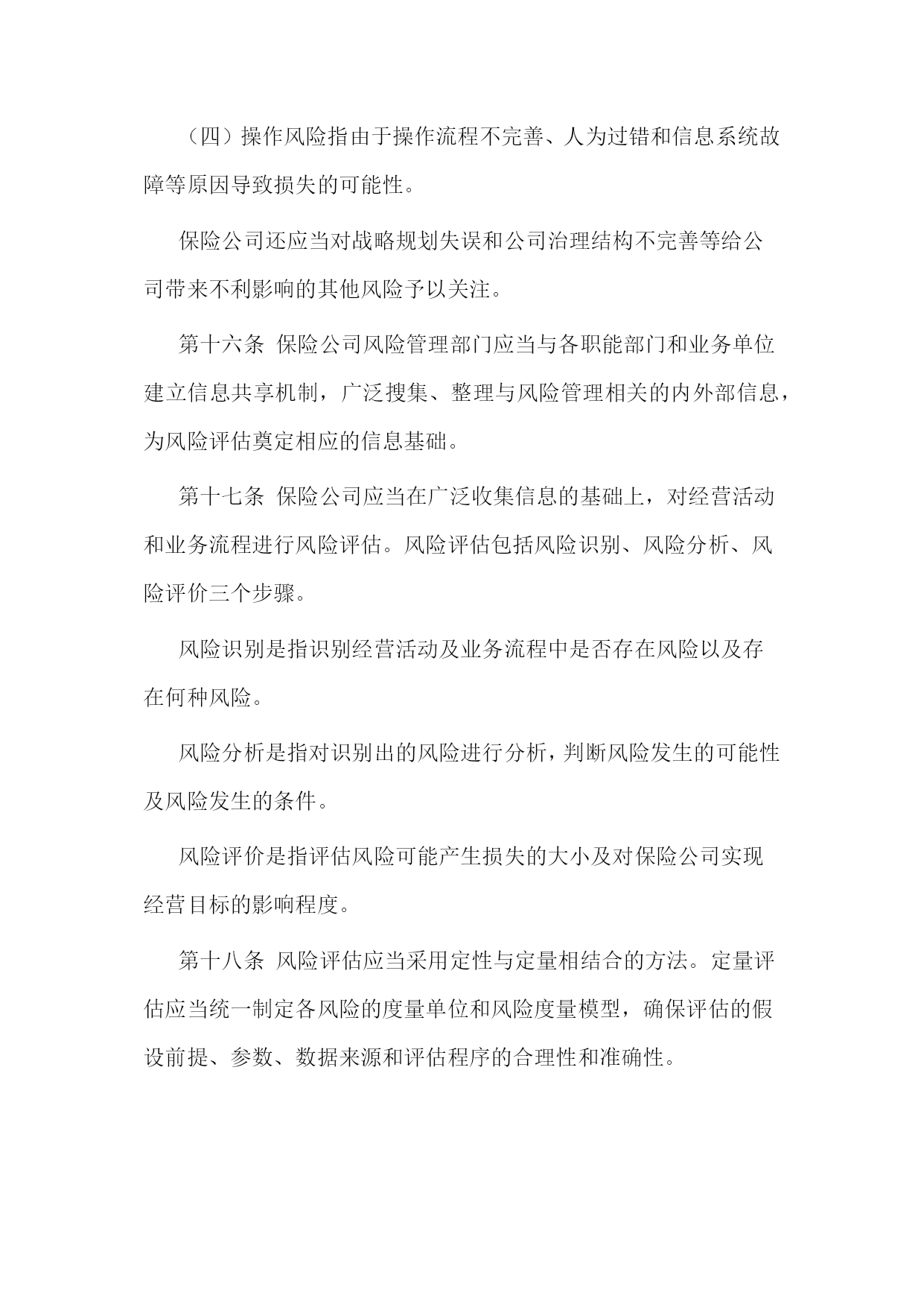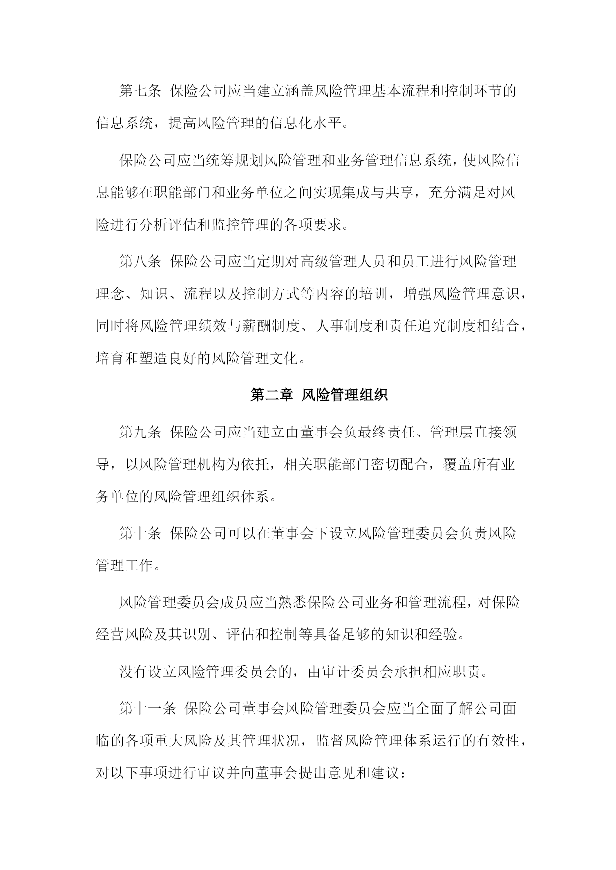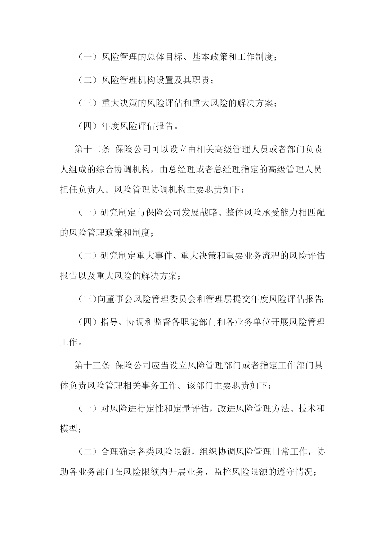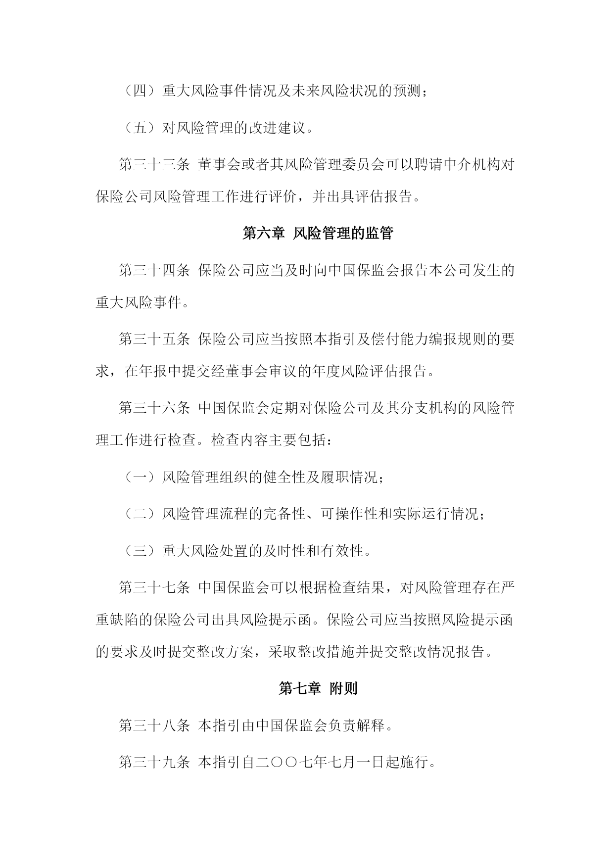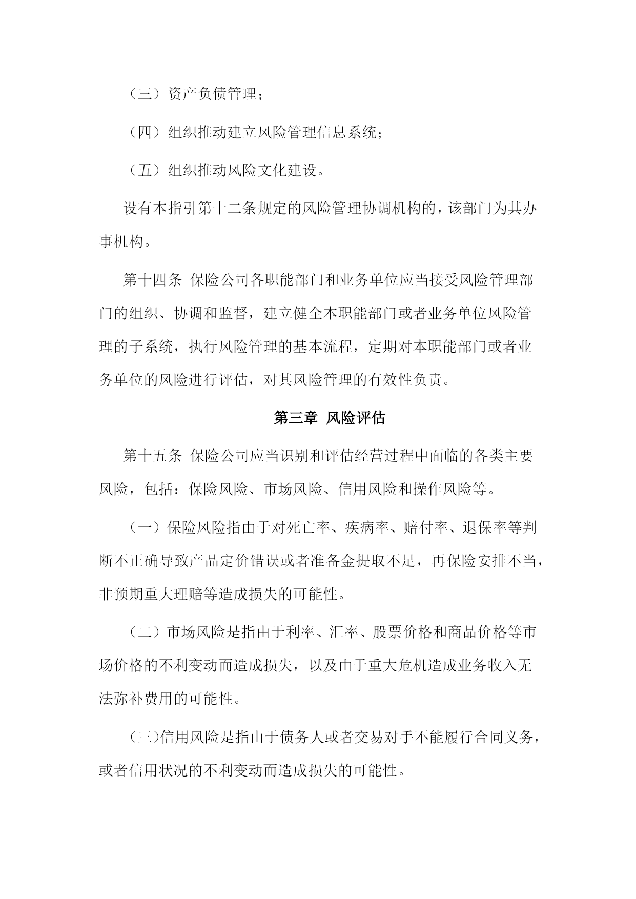 关于印发《保险公司风险管理指引(试行)》的通知保监发〔2007〕23号各保险公司、保险资产管理公司,各保监局:为强化保险公司风险管理,加强保险监管,提高风险防范能力,保监会制定了《保险公司风险管理指引(试行)》。现印发给你们,请各公司结合自身实际,认真贯彻落实。特此通知二○○七年四月六日保险公司风险管理指引(试行)第一章总则第一条为指导保险公司加强风险管理,保障保险公司稳健经营,根据《关于规范保险公司治理结构的指导意见(试行)》及其他相关法律法规,制定本指引。第二条本指引适用于在中国境内依法设立的保险公司和保险资产管理公司。保险集团(控股)公司已经按照本指引规定建立覆盖全集团的风险管理体系的,经中国保监会批准,其保险子公司可以不适用本指引。第三条本指引所称风险,是指对实现保险经营目标可能产生负面影响的不确定性因素。第四条本指引所称风险管理,是指保险公司围绕经营目标,对保险经营中的风险进行识别、评估和控制的基本流程以及相关的组织架构、制度和措施。第五条保险公司应当明确风险管理目标,建立健全风险管理体系,规范风险管理流程,采用先进的风险管理方法和手段,努力实现适当风险水平下的效益最大化。第六条保险公司风险管理应当遵循以下原则:(一)全面管理与重点监控相统一的原则。保险公司应当建立覆盖所有业务流程和操作环节,能够对风险进行持续监控、定期评估和准确预警的全面风险管理体系,同时要根据公司实际有针对性地实施重点风险监控,及时发现、防范和化解对公司经营有重要影响的风险。(二)独立集中与分工协作相统一的原则。保险公司应当建立全面评估和集中管理风险的机制,保证风险管理的独立性和客观性,同时要强化业务单位的风险管理主体职责,在保证风险管理职能部门与业务单位分工明确、密切协作的基础上,使业务发展与风险管理平行推进,实现对风险的过程控制。(三)充分有效与成本控制相统一的原则。保险公司应当建立与自身经营目标、业务规模、资本实力、管理能力和风险状况相适应的风险管理体系,同时要合理权衡风险管理成本与效益的关系,合理配置风险管理资源,实现适当成本下的有效风险管理。第七条保险公司应当建立涵盖风险管理基本流程和控制环节的信息系统,提高风险管理的信息化水平。保险公司应当统筹规划风险管理和业务管理信息系统,使风险信息能够在职能部门和业务单位之间实现集成与共享,充分满足对风险进行分析评估和监控管理的各项要求。第八条保险公司应当定期对高级管理人员和员工进行风险管理理念、知识、流程以及控制方式等内容的培训,增强风险管理意识,同时将风险管理绩效与薪酬制度、人事制度和责任追究制度相结合,培育和塑造良好的风险管理文化。第二章风险管理组织第九条保险公司应当建立由董事会负最终责任、管理层直接领导,以风险管理机构为依托,相关职能部门密切配合,覆盖所有业务单位的风险管理组织体系。第十条保险公司可以在董事会下设立风险管理委员会负责风险管理工作。风险管理委员会成员应当熟悉保险公司业务和管理流程,对保险经营风险及其识别、评估和控制等具备足够的知识和经验。没有设立风险管理委员会的,由审计委员会承担相应职责。第十一条保险公司董事会风险管理委员会应当全面了解公司面临的各项重大风险及其管理状况,监督风险管理体系运行的有效性,对以下事项进行审议并向董事会提出意见和建议:(一)风险管理的总体目标、基本政策和工作制度;(二)风险管理机构设置及其职责;(三)重大决策的风险评估和重大风险的解决方案;(四)年度风险评估报告。第十二条保险公司可以设立由相关高级管理人员或者部门负责人组成的综合协调机构,由总经理或者总经理指定的高级管理人员担任负责人。风险管理协调机构主要职责如下:(一)研究制定与保险公司发展战略、整体风险承受能力相匹配的风险管理政策和制度;(二)研究制定重大事件、重大决策和重要业务流程的风险评估报告以及重大风险的解决方案;(三)向董事会风险管理委员会和管理层提交年度风险评估报告;(四)指导、协调和监督各职能部门和各业务单位开展风险管理工作。第十三条保险公司应当设立风险管理部门或者指定工作部门具体负责风险管理相关事务工作。该部门主要职责如下:(一)对风险进行定性和定量评估,改进风险管理方法、技术和模型;(二)合理确定各类风险限额,组织协调风险管理日常工作,协助各业务部门在风险限额内开展业务,监控风险限额的遵守情况;(三)资产负债管理;(四)组织推动建立风险管理信息系统;(五)组织推动风险文化建设。设有本指引第十二条规定的风险管理协调机构的,该部门为其办事机构。第十四条保险公司各职能部门和业务单位应当接受风险管理部门的组织、协调和监督,建立健全本职能部门或者业务单位风险管理的子系统,执行风险管理的基本流程,定期对本职能