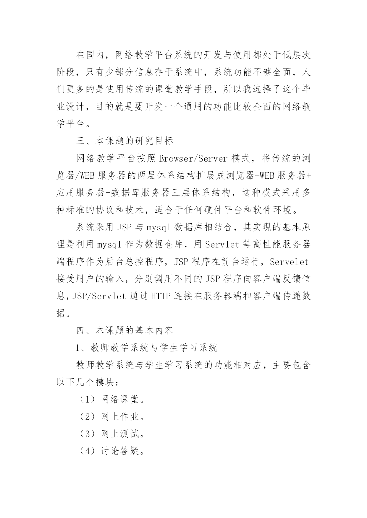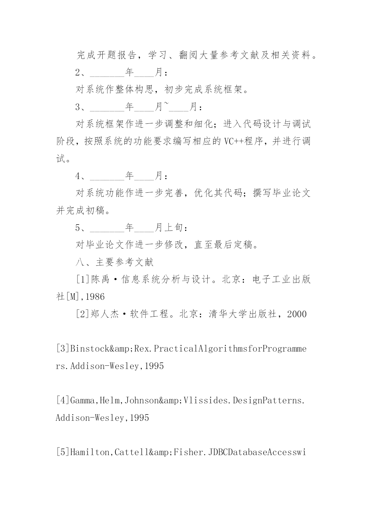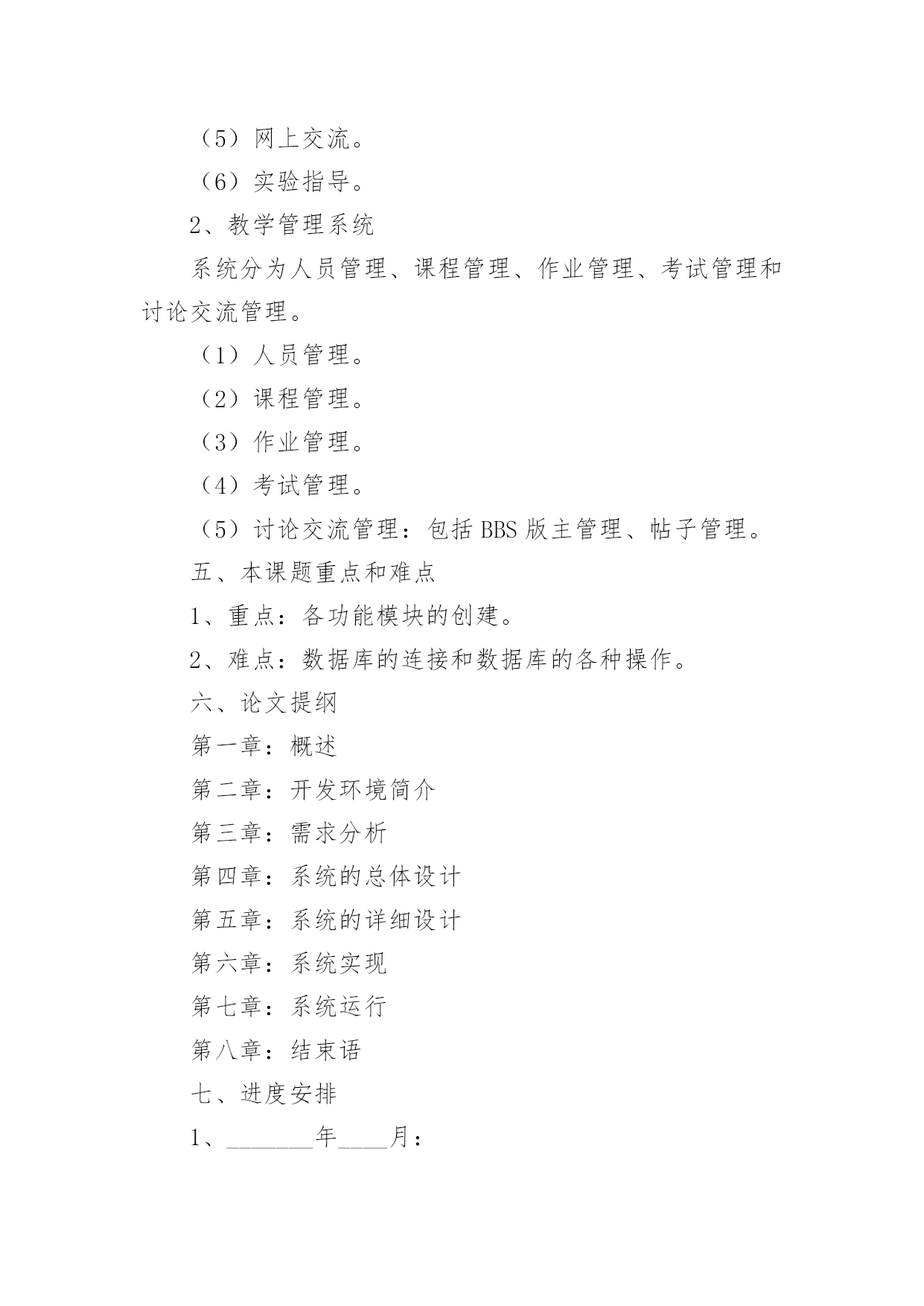 计算机专业毕业论文的开题报告计算机专业毕业论文的开题报告导语:开题报告是拉启毕业论文写作的大幕,开题报告的质量高低直接决定论文的质量。那么计算机专业的开题报告怎么写呢?其写作内容和固定格式有哪些呢?接下来小编整理了计算机专业毕业论文的开题报告,文章希望大家喜欢!论文题目:计算机技术在网络教学中的应用研究一、本课题的来源及研究意义随着计算机技术的飞速发展,信息网络已成为社会发展的重要保证。如何以网络为纽带快速、高效、方便地实现知识传递,以现代化手段促进教学改革,将传统的课堂教学转变为课堂+电脑+网络课堂+internet等多种学习方式,是教育工作者应当为之努力的方向。基于JSP技术的网络教学平台是依托校园网的'优势设计和开发的,通过此平台,学生可以不受时间、空间、地域的限制,实现网上浏览教学内容、完成作业,参加测试等功能,教师也可借助此平台,发布公告信息,发布试题,实现课件上传下载,组织讨论答疑等功能。二、国内外发展状况在国外,网络教学平台系统已经走上正轨,能高效、方便地实现知识传递,具有很强的可靠性,但是功能稍显不足。在国内,网络教学平台系统的开发与使用都处于低层次阶段,只有少部分信息存于系统中,系统功能不够全面,人们更多的是使用传统的课堂教学手段,所以我选择了这个毕业设计,目的就是要开发一个通用的功能比较全面的网络教学平台。三、本课题的研究目标网络教学平台按照Browser/Server模式,将传统的浏览器/WEB服务器的两层体系结构扩展成浏览器-WEB服务器+应用服务器-数据库服务器三层体系结构,这种模式采用多种标准的协议和技术,适合于任何硬件平台和软件环境。系统采用JSP与mysql数据库相结合,其实现的基本原理是利用mysql作为数据仓库,用Servlet等高性能服务器端程序作为后台总控程序,JSP程序在前台运行,Servelet接受用户的输入,分别调用不同的JSP程序向客户端反馈信息,JSP/Servlet通过HTTP连接在服务器端和客户端传递数据。四、本课题的基本内容1、教师教学系统与学生学习系统教师教学系统与学生学习系统的功能相对应,主要包含以下几个模块:(1)网络课堂。(2)网上作业。(3)网上测试。(4)讨论答疑。(5)网上交流。(6)实验指导。2、教学管理系统系统分为人员管理、课程管理、作业管理、考试管理和讨论交流管理。(1)人员管理。(2)课程管理。(3)作业管理。(4)考试管理。(5)讨论交流管理:包括BBS版主管理、帖子管理。五、本课题重点和难点1、重点:各功能模块的创建。2、难点:数据库的连接和数据库的各种操作。六、论文提纲第一章:概述第二章:开发环境简介第三章:需求分析第四章:系统的总体设计第五章:系统的详细设计第六章:系统实现第七章:系统运行第八章:结束语七、进度安排1、_______年____月:完成开题报告,学习、翻阅大量参考文献及相关资料。2、_______年____月:对系统作整体构思,初步完成系统框架。3、_______年____月~____月:对系统框架作进一步调整和细化;进入代码设计与调试阶段,按照系统的功能要求编写相应的VC++程序,并进行调试。4、_______年____月:对系统功能作进一步完善,优化其代码;撰写毕业论文并完成初稿。5、_______年____月上旬:对毕业论文作进一步修改,直至最后定稿。八、主要参考文献[1]陈禹·信息系统分析与设计。北京:电子工业出版社[M],1986[2]郑人杰·软件工程。北京:清华大学出版社,2000[3]Binstock&Rex.PracticalAlgorithmsforProgrammers.Addison-Wesley,1995[4]Gamma,Helm,Johnson&Vlissides.DesignPatterns.Addison-Wesley,1995[5]Hamilton,Cattell&Fisher.JDBCDatabaseAccesswithJava.Addison-Wesley,1997[6]Cornel&Horstmann.CoreJava.Prentice-Hall,1997[7]BruceEckel.ThinkinginJava,3rded.PearsonEducation,2003[8]PatrickChan&RosannaLee.TheJavaClassLibraries:AnAnnotatedReference.北Addison-Wesley,1997