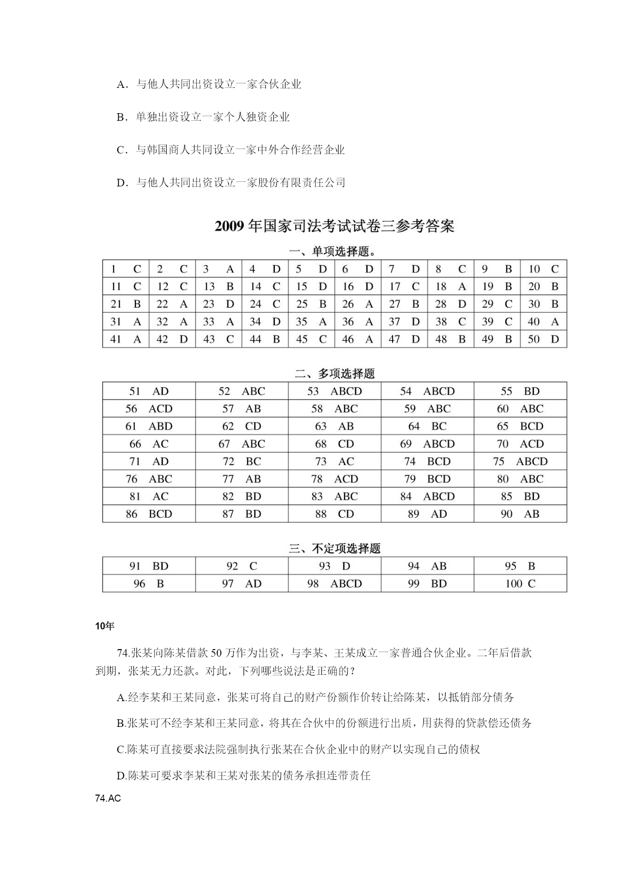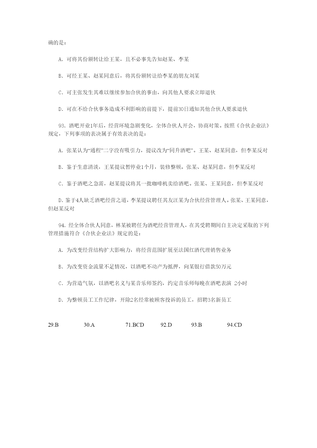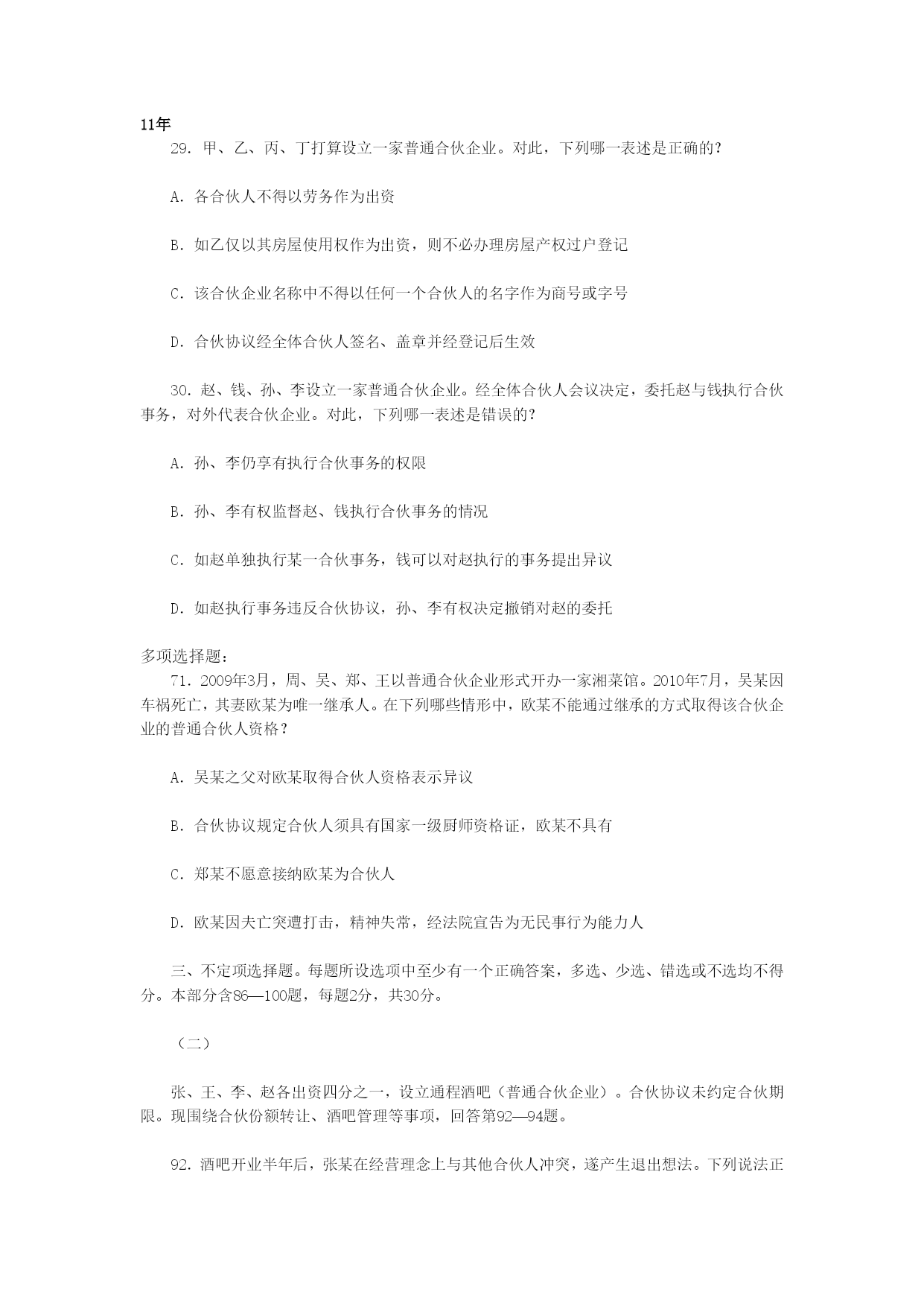 09年27.甲是某有限合伙企业的有限合伙人,持有该企业15%的份额。在合伙协议无特别约定的情况下,甲在合伙期间未经其他合伙人同意实施了下列行为,其中哪一项违反《合伙企业法》规定?A.将自购的机器设备出租给合伙企业使用B.以合伙企业的名义购买汽车一辆归合伙企业使用C.以自己在合伙企业中的财产份额向银行提供质押担保D.提前一个月通知其他合伙人将其部分合伙份额转让给合伙人以外的人28.普通合伙企业合伙人李某因车祸遇难,生前遗嘱指定16岁的儿子李明为其全部财产继承人。下列哪一表述是错误的?A.李明有权继承其父在合伙企业中的财产份额B.如其他合伙人均同意,李明可以取得有限合伙人资格C.如合伙协议约定合伙人必须是完全行为能力人,则李明不能成为合伙人D.应当待李明成年后由其本人作出其是否愿意成为合伙人的意思表示多项选择题:74.甲乙丙三人拟共同设立一个有限合伙企业,下列哪些表述是错误的?A.该有限合伙企业至少应当有一个普通合伙人B.经合伙协议约定,有限合伙人可以货币、实物、劳务、知识产权或其他财产作价出资C.经合伙协议约定,有限合伙人可以执行部分合伙事务D.如有限合伙人转为普通合伙人,则对其作为有限合伙人期间企业的债务不承担连带责任张某有200万元资金,打算在烟台投资设立一家注册资本为300万元左右的餐饮企业。关于如何设立与管理企业,请回答94-96题。94.张某可以选择的企业类型有:A.与他人共同出资设立一家合伙企业B.单独出资设立一家个人独资企业C.与韩国商人共同设立一家中外合作经营企业D.与他人共同出资设立一家股份有限责任公司10年74.张某向陈某借款50万作为出资,与李某、王某成立一家普通合伙企业。二年后借款到期,张某无力还款。对此,下列哪些说法是正确的?A.经李某和王某同意,张某可将自己的财产份额作价转让给陈某,以抵销部分债务B.张某可不经李某和王某同意,将其在合伙中的份额进行出质,用获得的贷款偿还债务C.陈某可直接要求法院强制执行张某在合伙企业中的财产以实现自己的债权D.陈某可要求李某和王某对张某的债务承担连带责任74.AC11年29.甲、乙、丙、丁打算设立一家普通合伙企业。对此,下列哪一表述是正确的?A.各合伙人不得以劳务作为出资B.如乙仅以其房屋使用权作为出资,则不必办理房屋产权过户登记C.该合伙企业名称中不得以任何一个合伙人的名字作为商号或字号D.合伙协议经全体合伙人签名、盖章并经登记后生效30.赵、钱、孙、李设立一家普通合伙企业。经全体合伙人会议决定,委托赵与钱执行合伙事务,对外代表合伙企业。对此,下列哪一表述是错误的?A.孙、李仍享有执行合伙事务的权限B.孙、李有权监督赵、钱执行合伙事务的情况C.如赵单独执行某一合伙事务,钱可以对赵执行的事务提出异议D.如赵执行事务违反合伙协议,孙、李有权决定撤销对赵的委托多项选择题:71.2009年3月,周、吴、郑、王以普通合伙企业形式开办一家湘菜馆。2010年7月,吴某因车祸死亡,其妻欧某为唯一继承人。在下列哪些情形中,欧某不能通过继承的方式取得该合伙企业的普通合伙人资格?A.吴某之父对欧某取得合伙人资格表示异议B.合伙协议规定合伙人须具有国家一级厨师资格证,欧某不具有C.郑某不愿意接纳欧某为合伙人D.欧某因夫亡突遭打击,精神失常,经法院宣告为无民事行为能力人三、不定项选择题。每题所设选项中至少有一个正确答案,多选、少选、错选或不选均不得分。本部分含86—100题,每题2分,共30分。(二)张、王、李、赵各出资四分之一,设立通程酒吧(普通合伙企业)。合伙协议未约定合伙期限。现围绕合伙份额转让、酒吧管理等事项,回答第92—94题。92.酒吧开业半年后,张某在经营理念上与其他合伙人冲突,遂产生退出想法。下列说法正确的是:A.可将其份额转让给王某,且不必事先告知赵某、李某B.可经王某、赵某同意后,将其份额转让给李某的朋友刘某C.可主张发生其难以继续参加合伙的事由,向其他人要求立即退伙D.可在不给合伙事务造成不利影响的前提下,提前30日通知其他合伙人要求退伙93.酒吧开业1年后,经营环境急剧变化,全体合伙人开会,协商对策。按照《合伙企业法》规定,下列事项的表决属于有效表决的是:A.张某认为“通程”二字没有吸引力,提议改为“同升酒吧”。王某、赵某同意,但李某反对B.鉴于生意清淡,王某提议暂停业1个月,装修整顿。张某、赵某同意,但李某反对C.鉴于酒吧之急需,赵某提议将其一批咖啡机卖给酒吧。张某、王某同意,但李某反对D.鉴于4人缺乏酒吧经营之道,李某提议聘任其友汪某为合伙经营管