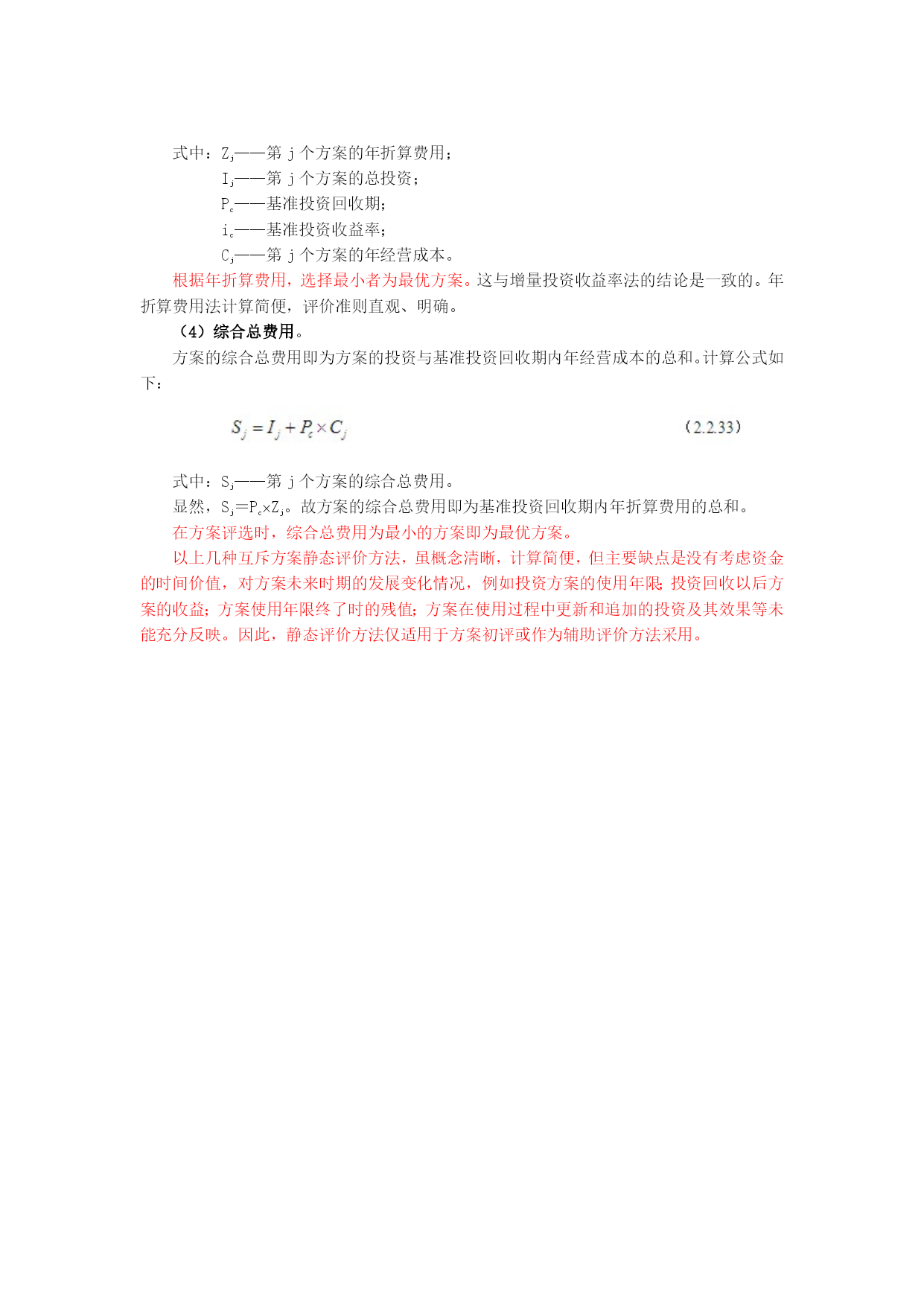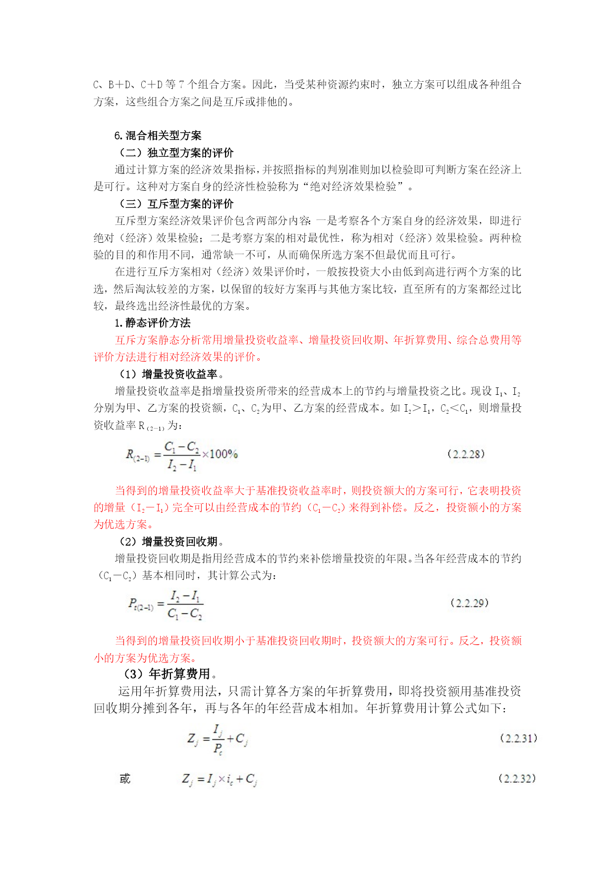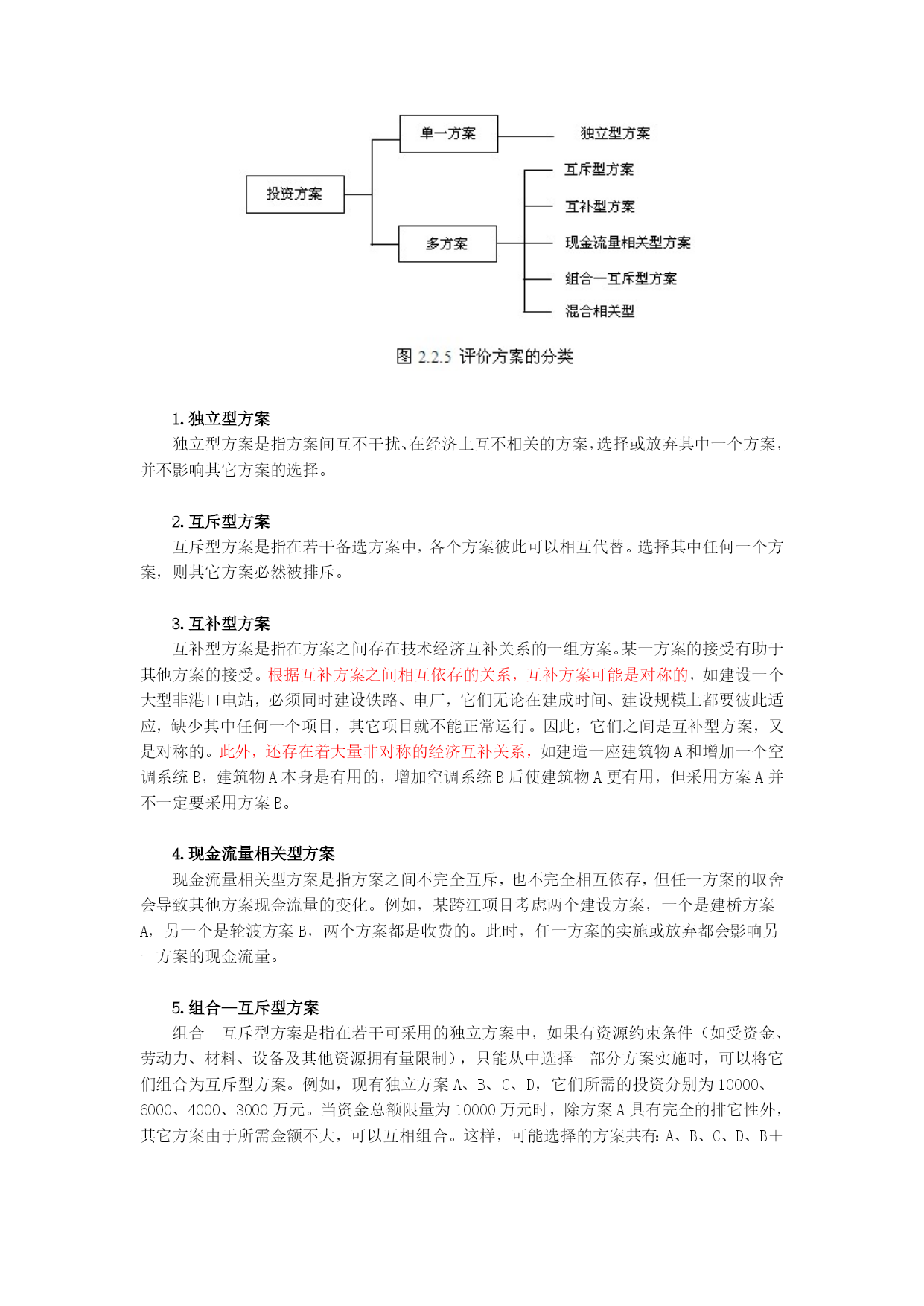 7.净现值率净现值率(NPVR)是在NPV的基础上发展起来的,可作为NPV的一种补充。净现值率是项目净现值与项目全部投资现值之比,其经济含义是单位投资现值所能带来的净现值,是一个考察项目单位投资盈利能力的指标。由于净现值不直接考虑项目投资额的大小,故为考虑投资的利用效率,常用净现值率作为净现值的辅助评价指标。(1)计算公式。净现值率(NPVR)计算公式如下:式中:Ip——投资现值;It——第t年投资额;m——建设期年数。(2)评价准则。对于独立方案评价,若NPVR≥0,方案才能接受。对于多方案比选,凡NPVR<0的方案先行淘汰,在余下方案中,应与投资额、净现值结合起来选择方案。则该项目的净现值率和动态投资回收期分别是()。A.2.45%和4.53年B.83.88%和5.17年C.170.45%和4.53年D.197.35和5.17年二、经济效果评价方法(一)评价方案的类型所谓方案类型,是指一组备选方案之间所具有的相互关系。这种关系一般分为单一方案(又称独立型方案)和多方案两类。而多方案又分为互斥型、互补型、现金流量相关型、组合—互斥型和混合相关型5种,如图2.2.5所示。1.独立型方案独立型方案是指方案间互不干扰、在经济上互不相关的方案,选择或放弃其中一个方案,并不影响其它方案的选择。2.互斥型方案互斥型方案是指在若干备选方案中,各个方案彼此可以相互代替。选择其中任何一个方案,则其它方案必然被排斥。3.互补型方案互补型方案是指在方案之间存在技术经济互补关系的一组方案。某一方案的接受有助于其他方案的接受。根据互补方案之间相互依存的关系,互补方案可能是对称的,如建设一个大型非港口电站,必须同时建设铁路、电厂,它们无论在建成时间、建设规模上都要彼此适应,缺少其中任何一个项目,其它项目就不能正常运行。因此,它们之间是互补型方案,又是对称的。此外,还存在着大量非对称的经济互补关系,如建造一座建筑物A和增加一个空调系统B,建筑物A本身是有用的,增加空调系统B后使建筑物A更有用,但采用方案A并不一定要采用方案B。4.现金流量相关型方案现金流量相关型方案是指方案之间不完全互斥,也不完全相互依存,但任一方案的取舍会导致其他方案现金流量的变化。例如,某跨江项目考虑两个建设方案,一个是建桥方案A,另一个是轮渡方案B,两个方案都是收费的。此时,任一方案的实施或放弃都会影响另一方案的现金流量。5.组合—互斥型方案组合—互斥型方案是指在若干可采用的独立方案中,如果有资源约束条件(如受资金、劳动力、材料、设备及其他资源拥有量限制),只能从中选择一部分方案实施时,可以将它们组合为互斥型方案。例如,现有独立方案A、B、C、D,它们所需的投资分别为10000、6000、4000、3000万元。当资金总额限量为10000万元时,除方案A具有完全的排它性外,其它方案由于所需金额不大,可以互相组合。这样,可能选择的方案共有:A、B、C、D、B+C、B+D、C+D等7个组合方案。因此,当受某种资源约束时,独立方案可以组成各种组合方案,这些组合方案之间是互斥或排他的。6.混合相关型方案(二)独立型方案的评价通过计算方案的经济效果指标,并按照指标的判别准则加以检验即可判断方案在经济上是可行。这种对方案自身的经济性检验称为“绝对经济效果检验”。(三)互斥型方案的评价互斥型方案经济效果评价包含两部分内容:一是考察各个方案自身的经济效果,即进行绝对(经济)效果检验;二是考察方案的相对最优性,称为相对(经济)效果检验。两种检验的目的和作用不同,通常缺一不可,从而确保所选方案不但最优而且可行。在进行互斥方案相对(经济)效果评价时,一般按投资大小由低到高进行两个方案的比选,然后淘汰较差的方案,以保留的较好方案再与其他方案比较,直至所有的方案都经过比较,最终选出经济性最优的方案。1.静态评价方法互斥方案静态分析常用增量投资收益率、增量投资回收期、年折算费用、综合总费用等评价方法进行相对经济效果的评价。(1)增量投资收益率。增量投资收益率是指增量投资所带来的经营成本上的节约与增量投资之比。现设I1、I2分别为甲、乙方案的投资额,C1、C2为甲、乙方案的经营成本。如I2>I1,C2<C1,则增量投资收益率R(2-1)为:当得到的增量投资收益率大于基准投资收益率时,则投资额大的方案可行,它表明投资的增量(I2-I1)完全可以由经营成本的节约(C1-C2)来得到补偿。反之,投资额小的方案为优选方案。(2)增量投资回收期。增量投资回收期是指用经营成本的节约来补偿增量投资的年限。当各年经营成本的节约(C1-C2)基本相同时,其计算公式为:当得到的增量投资回收期小于基准投资回收期时,投资额大的方案可行。反