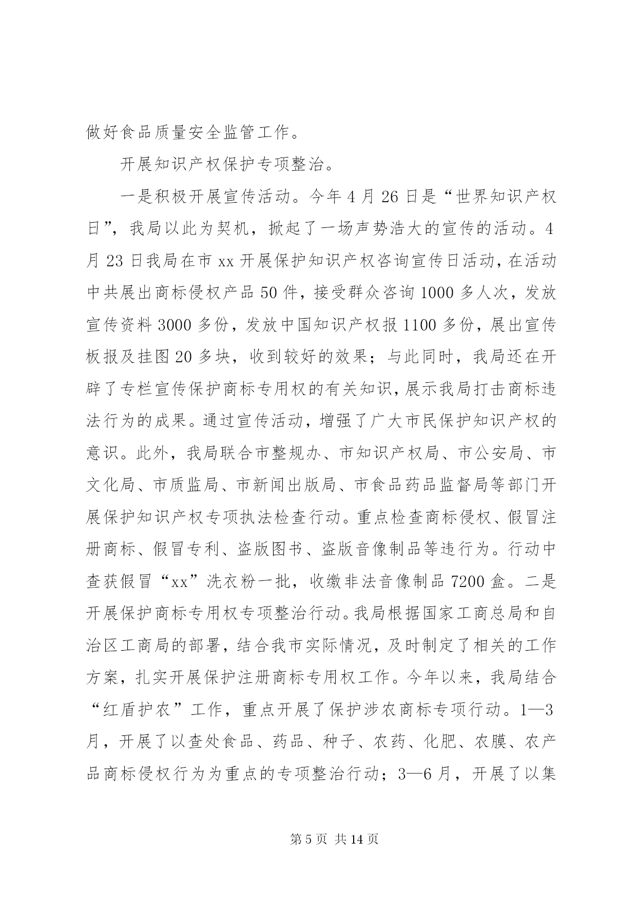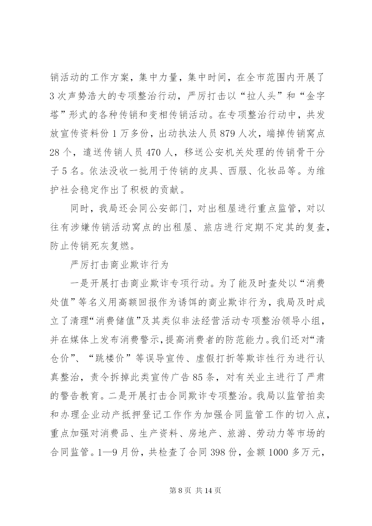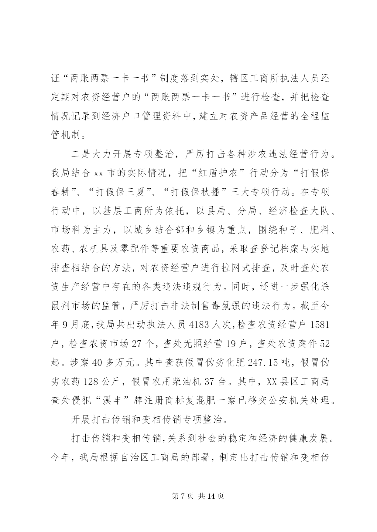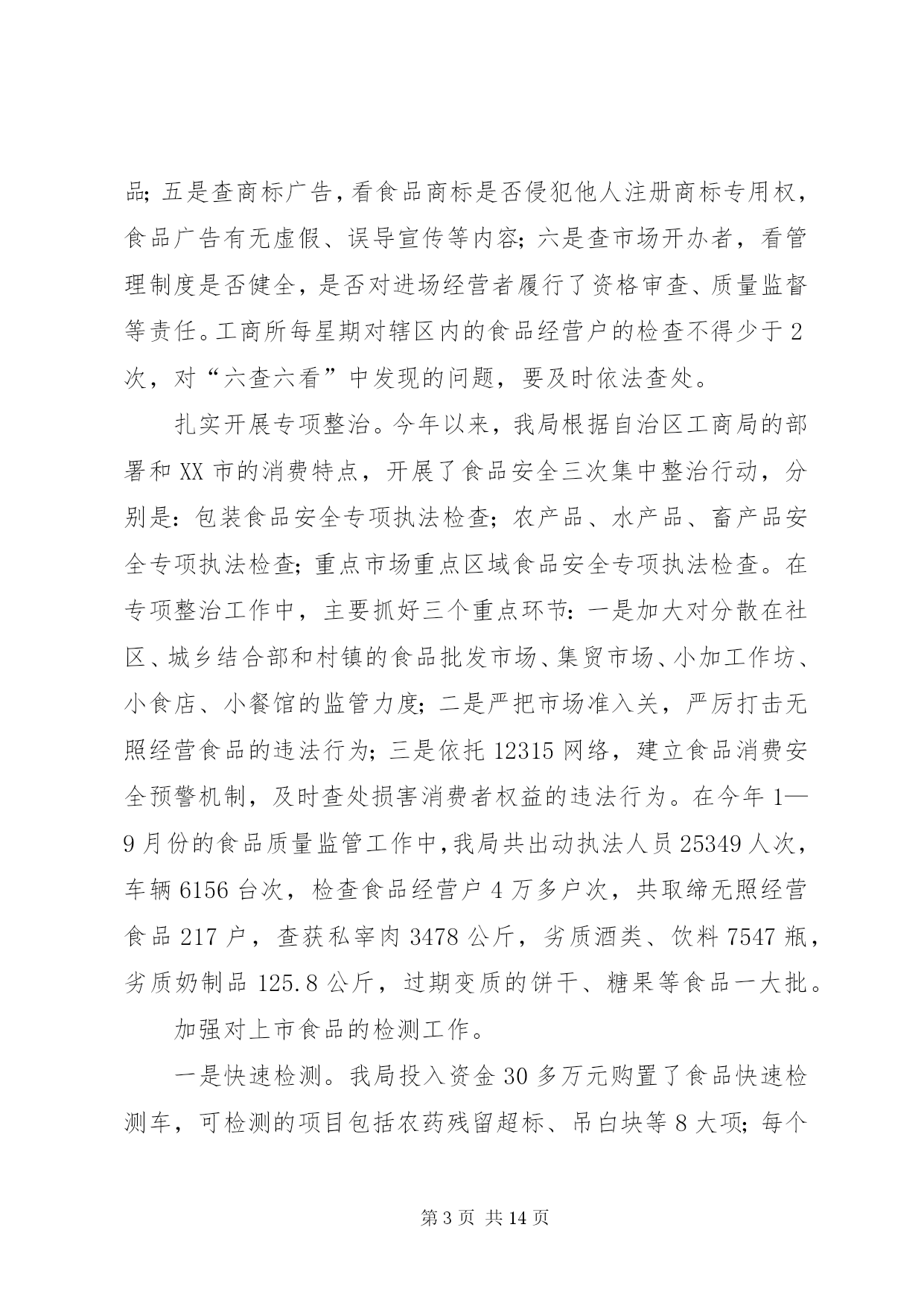 第PAGE\*Arabic\*MERGEFORMAT14页共NUMPAGES\*MERGEFORMAT14页市工商局20XX年整规总结2006年,我局坚持以“三个代表”重要思想为指导,按照党中央关于继续整顿和规范市场经济秩序的总体部署,突出整治重点,加大执法力度,整顿和规范市场经济秩序工作取得可喜的成绩。现将我局2006年1—9月份的整规工作总结汇报如下。一、2006年1—9月份整规工作的基本情况今年以来,我局按照国家工商总局和自治区工商局的部署,按照“全面展开、突出重点、标本兼治、重在治本”的工作方针,不断强化市场监管执法力度,大力开展了红盾护农、食品安全、打击传销和变相传销等9大类专项整治,全面推行了流通领域商品质量监管“关口前移”工作。1—9月份,我局共出动执法人员4万多人次,检查经营户5万户次,查处各类经济违法违章案件1698起,案值834.4万元,罚没款233.5万元,移送司法机关案件4起,处理消费者申诉举报2445起,为消费者挽回经济损失97.79万元。深入开展食品安全专项整治我局把食品安全工作作为整顿和规范市场经济秩序的重中之重,在食品安全监管方面做了大量的工作。1.推进“关口前移”,建立健全食品安全准入制度。近年来,我局把流通领域食品质量监管工作作为整顿和规范市场经济秩序的重中之重。2005年,经过试点取得经验后,我局在全市食品行业全面推行流通领域商品质量监管“关口前移”工作,我们通过督促食品经营户建立了进货检查验收制度、购销台帐制度、销售食品质量承诺制度、流通环节食品退市制度等有关制度,把住食品进入市场的关口,构筑食品安全的防线。对不能提供有效营业执照、卫生许可证、商标注册、产品检验报告以及购货票等相关证件的商品,全面要拒绝进货、进场。同时,为了使食品质量监管工作制度化、规范化,今年,结合我市食品市场监管的实际,我局制定了、、、、等五项制度,要求各分局、工商所严格按照有关制度的要求,规范日常的食品安全监督管理工作。目前,我市各类食品批发市场、商场、超市、食品经营户建立了食品进货检查验收制度,购销台帐制度、食品质量承诺制度、食品退市制度等自律制度的达到85%以上,各类食品经营户企业亮照经营率达100%,工商所实施经营户口管理和巡查责任制达100%。食品监管初步建立了流通环节食品安全行政执法、企业自律、社会监督“三位一体”的监管机制。2.加大执法力度,严厉打击食品违法行为。加强日常的巡查,认真开展“六查六看”。一是查经营资格,看证照是否齐全,是否属超范围经营;二是查进货票证,看来源是否合法、票证是否齐全,进货是否履行了检查验收职责;三是查经销食品,看有无质量、卫生检验检疫合格等证明;四是查包装标识,看标识是否虚假,是否属“三无”、仿冒或过期失效食品;五是查商标广告,看食品商标是否侵犯他人注册商标专用权,食品广告有无虚假、误导宣传等内容;六是查市场开办者,看管理制度是否健全,是否对进场经营者履行了资格审查、质量监督等责任。工商所每星期对辖区内的食品经营户的检查不得少于2次,对“六查六看”中发现的问题,要及时依法查处。扎实开展专项整治。今年以来,我局根据自治区工商局的部署和XX市的消费特点,开展了食品安全三次集中整治行动,分别是:包装食品安全专项执法检查;农产品、水产品、畜产品安全专项执法检查;重点市场重点区域食品安全专项执法检查。在专项整治工作中,主要抓好三个重点环节:一是加大对分散在社区、城乡结合部和村镇的食品批发市场、集贸市场、小加工作坊、小食店、小餐馆的监管力度;二是严把市场准入关,严厉打击无照经营食品的违法行为;三是依托12315网络,建立食品消费安全预警机制,及时查处损害消费者权益的违法行为。在今年1—9月份的食品质量监管工作中,我局共出动执法人员25349人次,车辆6156台次,检查食品经营户4万多户次,共取缔无照经营食品217户,查获私宰肉3478公斤,劣质酒类、饮料7547瓶,劣质奶制品125.8公斤,过期变质的饼干、糖果等食品一大批。加强对上市食品的检测工作。一是快速检测。我局投入资金30多万元购置了食品快速检测车,可检测的项目包括农药残留超标、吊白块等8大项;每个分局还配备了食品快速检测箱,定期不定期地对我市的上市食品进行快速检测。到9月份止,我局共出动工商食品快速检测车120多车次,检测蔬菜农药残留、豆制品吊白块等项目268批次500多个品种,检出农药残留超标蔬菜173.5公斤、含吊白块豆制品195.8公斤,甲醛超标水产品32.6公斤。二是定期检测。根据流通领域商品质量存在的问题、人民群众集中反映的商品质量投诉情况以及消费的季节性特点,每月制定食品检测计划。如今年7月份是检测饮料类,主要检验项目包括菌落总数、大肠菌群、蛋白质等。通过有重点、步骤地开展商品质量抽查,并及