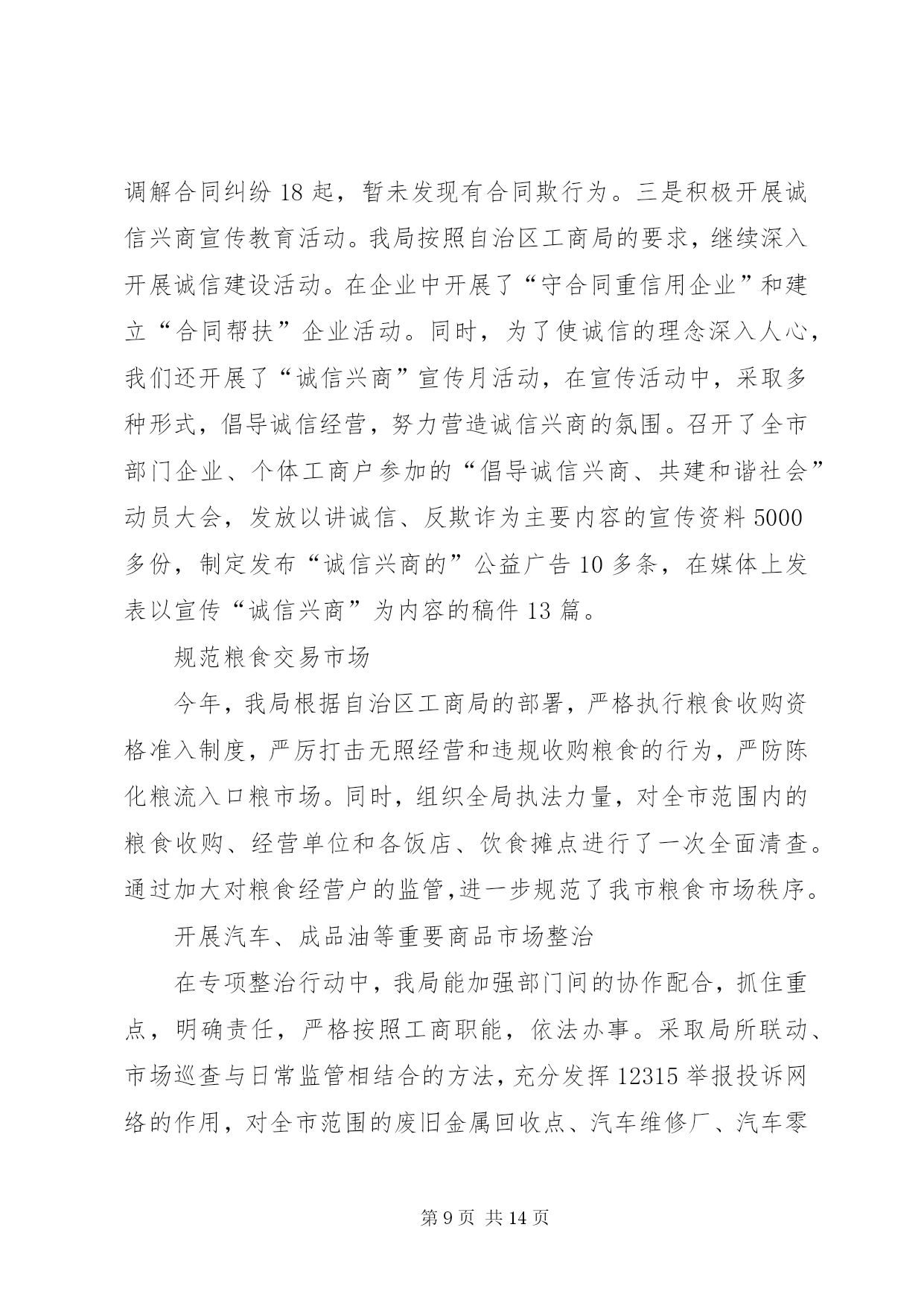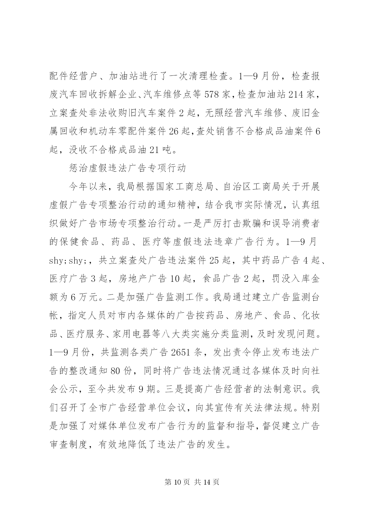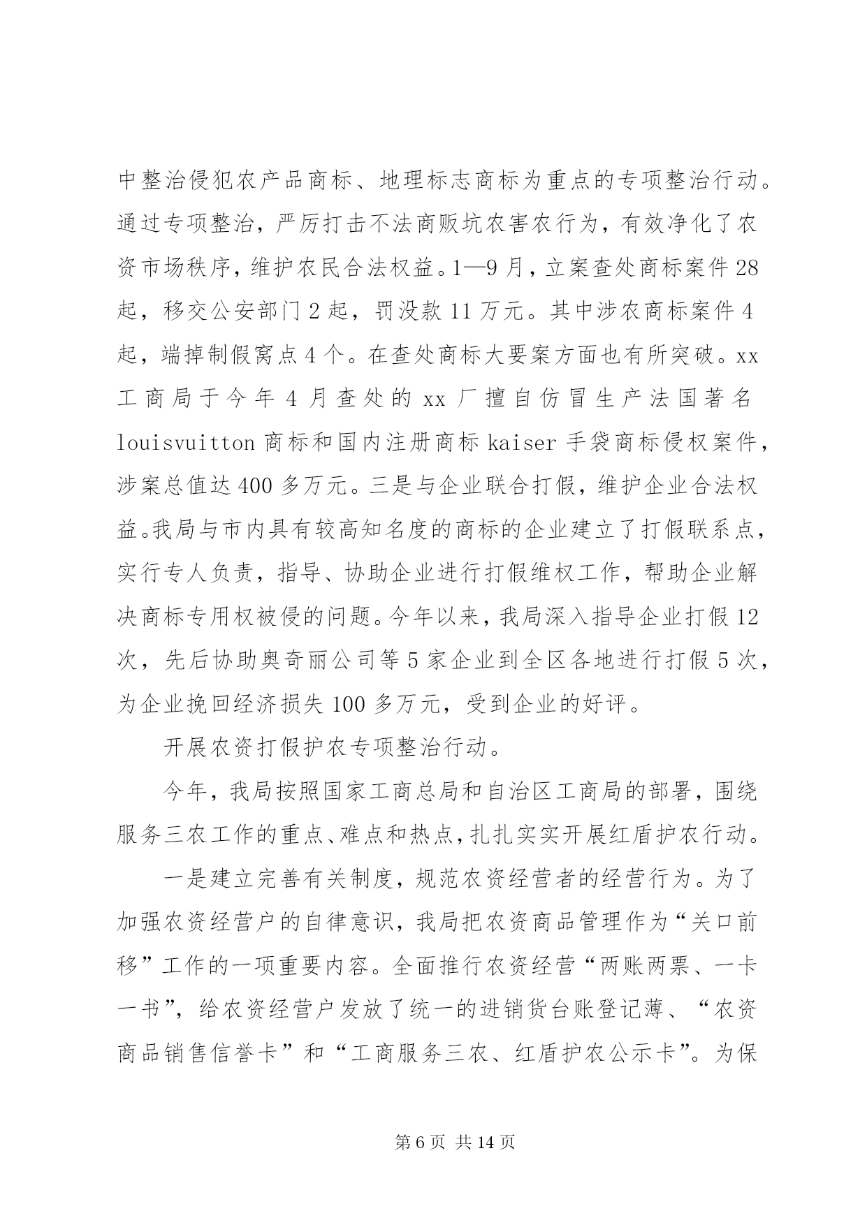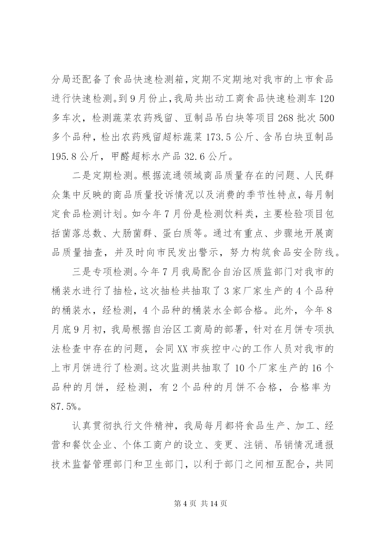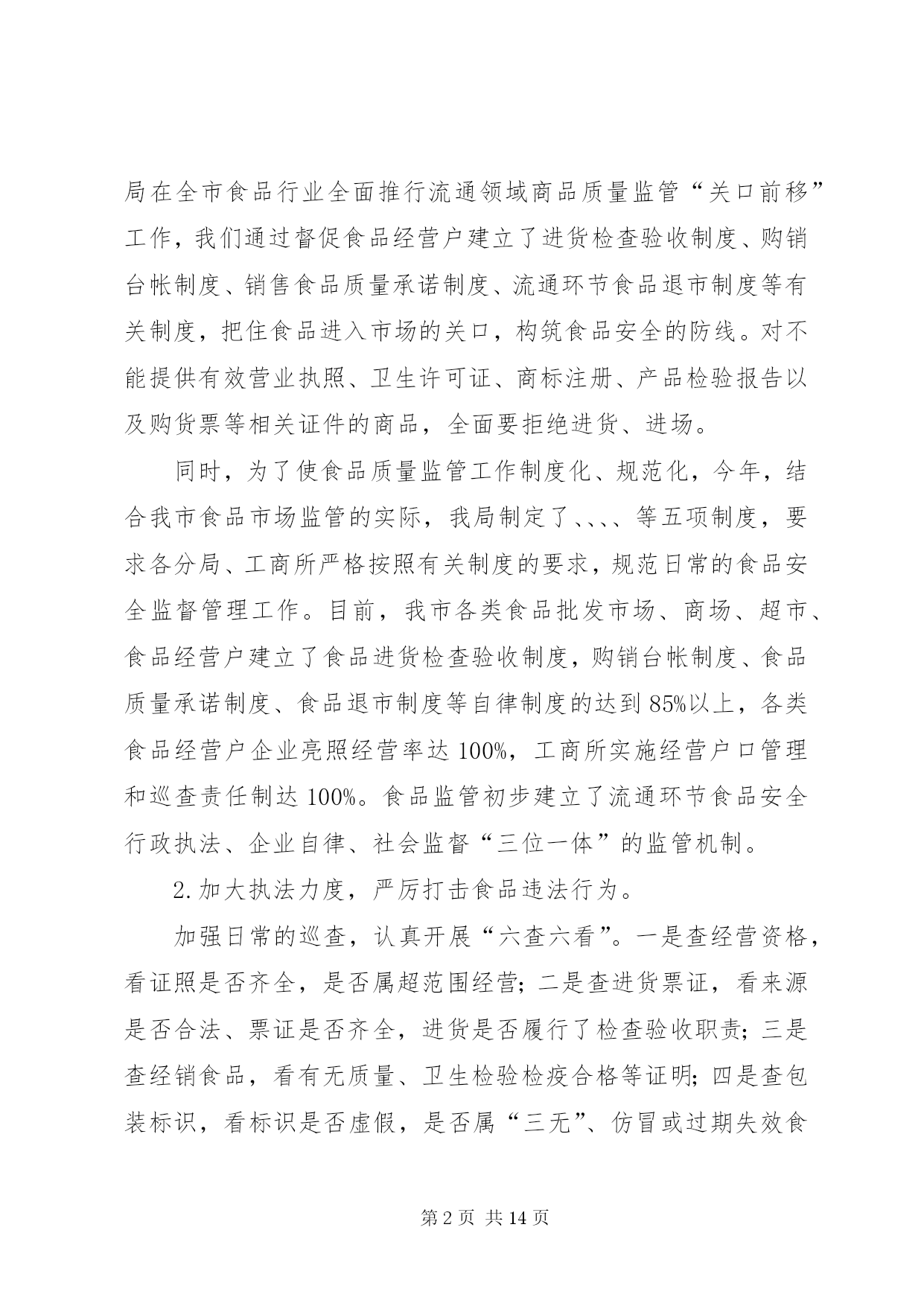 第PAGE\*Arabic\*MERGEFORMAT14页共NUMPAGES\*MERGEFORMAT14页市工商局20XX年整规总结2006年,我局坚持以“三个代表”重要思想为指导,按照党中央关于继续整顿和规范市场经济秩序的总体部署,突出整治重点,加大执法力度,整顿和规范市场经济秩序工作取得可喜的成绩。现将我局2006年1—9月份的整规工作总结汇报如下。一、2006年1—9月份整规工作的基本情况今年以来,我局按照国家工商总局和自治区工商局的部署,按照“全面展开、突出重点、标本兼治、重在治本”的工作方针,不断强化市场监管执法力度,大力开展了红盾护农、食品安全、打击传销和变相传销等9大类专项整治,全面推行了流通领域商品质量监管“关口前移”工作。1—9月份,我局共出动执法人员4万多人次,检查经营户5万户次,查处各类经济违法违章案件1698起,案值834.4万元,罚没款233.5万元,移送司法机关案件4起,处理消费者申诉举报2445起,为消费者挽回经济损失97.79万元。深入开展食品安全专项整治我局把食品安全工作作为整顿和规范市场经济秩序的重中之重,在食品安全监管方面做了大量的工作。1.推进“关口前移”,建立健全食品安全准入制度。近年来,我局把流通领域食品质量监管工作作为整顿和规范市场经济秩序的重中之重。2005年,经过试点取得经验后,我局在全市食品行业全面推行流通领域商品质量监管“关口前移”工作,我们通过督促食品经营户建立了进货检查验收制度、购销台帐制度、销售食品质量承诺制度、流通环节食品退市制度等有关制度,把住食品进入市场的关口,构筑食品安全的防线。对不能提供有效营业执照、卫生许可证、商标注册、产品检验报告以及购货票等相关证件的商品,全面要拒绝进货、进场。同时,为了使食品质量监管工作制度化、规范化,今年,结合我市食品市场监管的实际,我局制定了、、、、等五项制度,要求各分局、工商所严格按照有关制度的要求,规范日常的食品安全监督管理工作。目前,我市各类食品批发市场、商场、超市、食品经营户建立了食品进货检查验收制度,购销台帐制度、食品质量承诺制度、食品退市制度等自律制度的达到85%以上,各类食品经营户企业亮照经营率达100%,工商所实施经营户口管理和巡查责任制达100%。食品监管初步建立了流通环节食品安全行政执法、企业自律、社会监督“三位一体”的监管机制。2.加大执法力度,严厉打击食品违法行为。加强日常的巡查,认真开展“六查六看”。一是查经营资格,看证照是否齐全,是否属超范围经营;二是查进货票证,看来源是否合法、票证是否齐全,进货是否履行了检查验收职责;三是查经销食品,看有无质量、卫生检验检疫合格等证明;四是查包装标识,看标识是否虚假,是否属“三无”、仿冒或过期失效食品;五是查商标广告,看食品商标是否侵犯他人注册商标专用权,食品广告有无虚假、误导宣传等内容;六是查市场开办者,看管理制度是否健全,是否对进场经营者履行了资格审查、质量监督等责任。工商所每星期对辖区内的食品经营户的检查不得少于2次,对“六查六看”中发现的问题,要及时依法查处。扎实开展专项整治。今年以来,我局根据自治区工商局的部署和XX市的消费特点,开展了食品安全三次集中整治行动,分别是:包装食品安全专项执法检查;农产品、水产品、畜产品安全专项执法检查;重点市场重点区域食品安全专项执法检查。在专项整治工作中,主要抓好三个重点环节:一是加大对分散在社区、城乡结合部和村镇的食品批发市场、集贸市场、小加工作坊、小食店、小餐馆的监管力度;二是严把市场准入关,严厉打击无照经营食品的违法行为;三是依托12315网络,建立食品消费安全预警机制,及时查处损害消费者权益的违法行为。在今年1—9月份的食品质量监管工作中,我局共出动执法人员25349人次,车辆6156台次,检查食品经营户4万多户次,共取缔无照经营食品217户,查获私宰肉3478公斤,劣质酒类、饮料7547瓶,劣质奶制品125.8公斤,过期变质的饼干、糖果等食品一大批。加强对上市食品的检测工作。一是快速检测。我局投入资金30多万元购置了食品快速检测车,可检测的项目包括农药残留超标、吊白块等8大项;每个分局还配备了食品快速检测箱,定期不定期地对我市的上市食品进行快速检测。到9月份止,我局共出动工商食品快速检测车120多车次,检测蔬菜农药残留、豆制品吊白块等项目268批次500多个品种,检出农药残留超标蔬菜173.5公斤、含吊白块豆制品195.8公斤,甲醛超标水产品32.6公斤。二是定期检测。根据流通领域商品质量存在的问题、人民群众集中反映的商品质量投诉情况以及消费的季节性特点,每月制定食品检测计划。如今年7月份是检测饮料类,主要检验项目包括菌落总数、大肠菌群、蛋白质等。通过有重点、步骤地开展商品质量抽查,并及